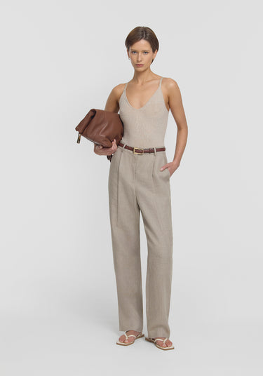Your go-to trouser this season, the Hilton Trouser is crafted in a refined natural oatmeal linen. Designed to sit at the true waist, it boasts a tapered barrel leg with subtle front tuck detailing. Complete with front pockets, belt loops, and back welt pockets. Style it with the Rumba Bodysuit or this season’s oatmeal-hued pieces for a chic, effortless take on tonal set dressing.