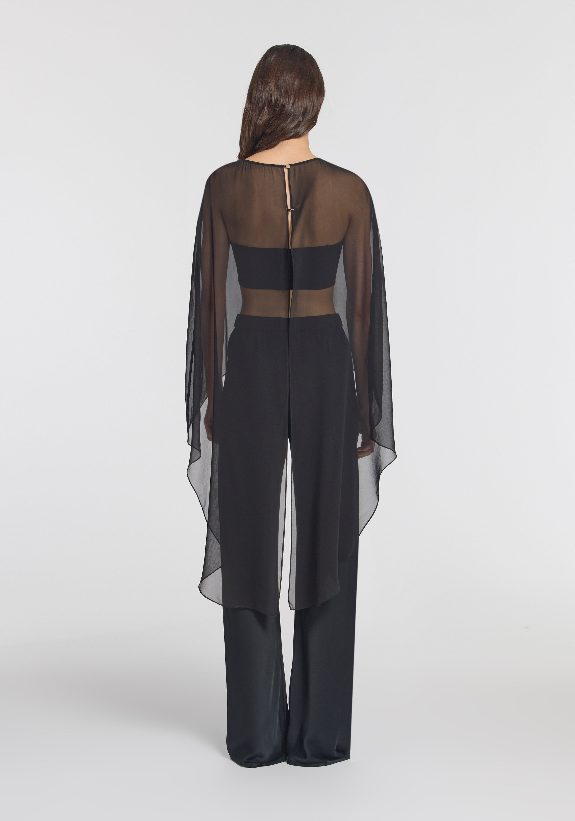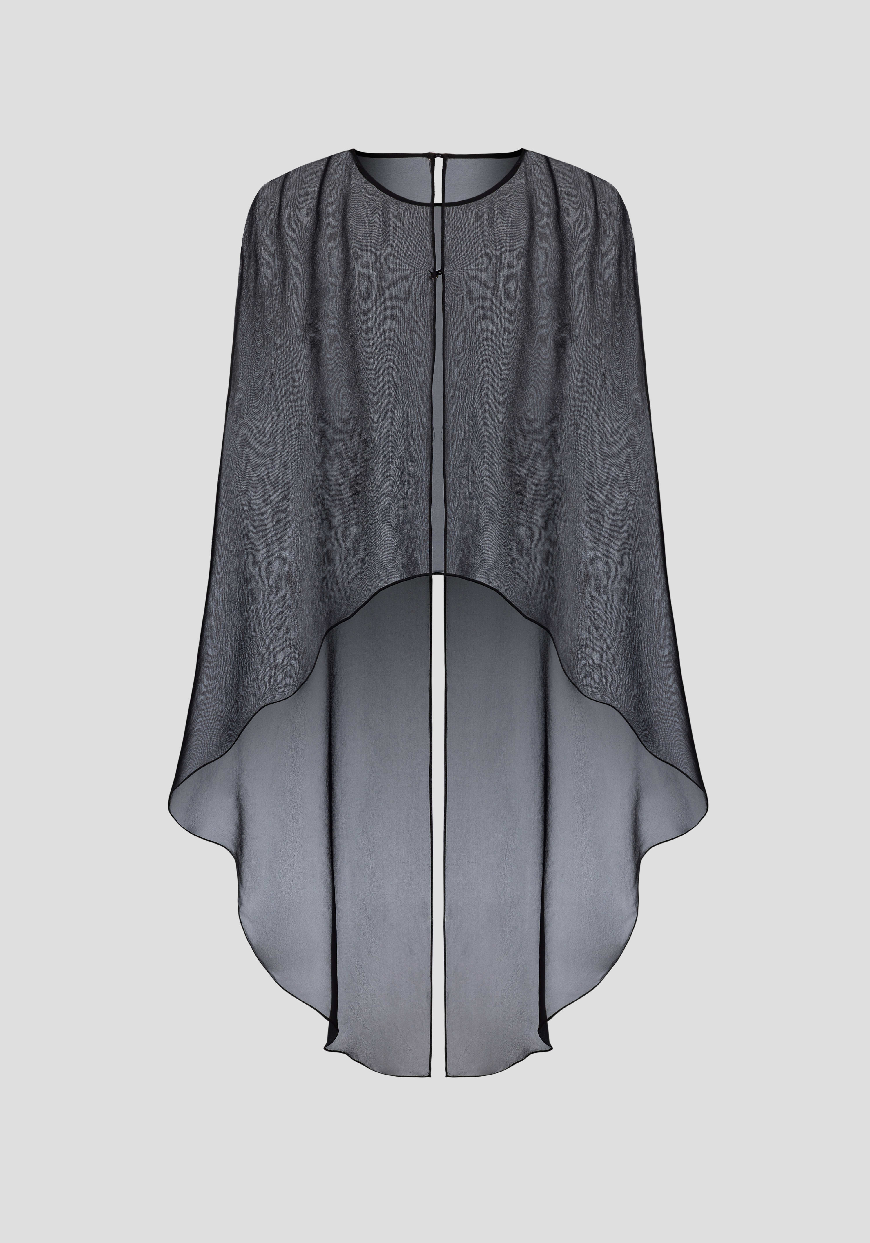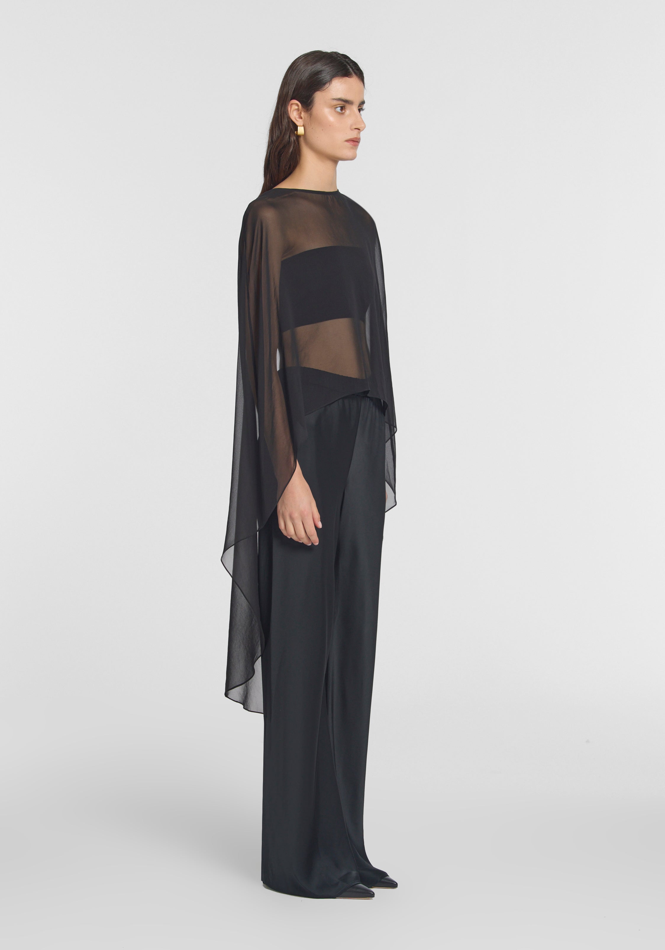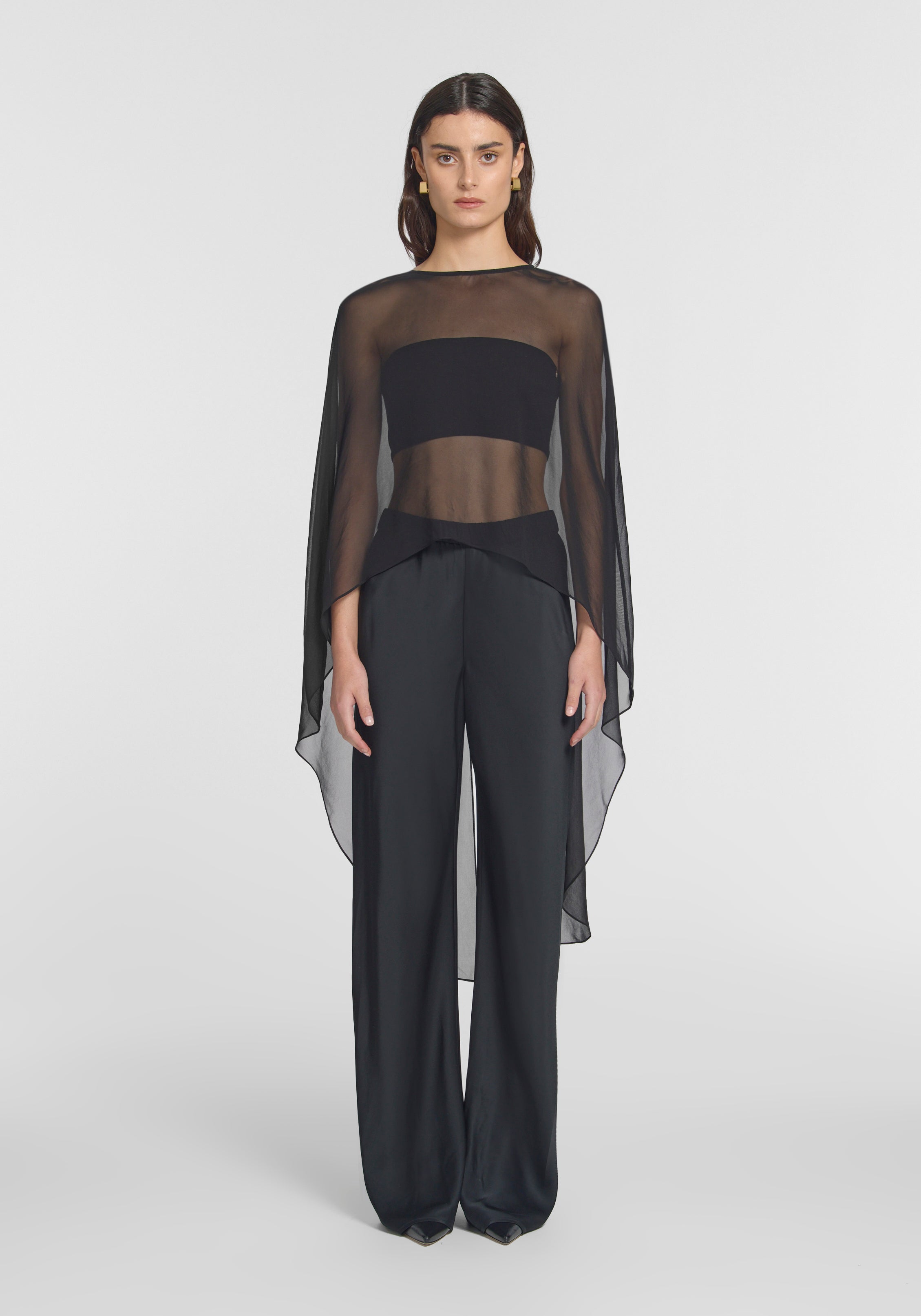 Exude ethereal femininity in the Holliday Cape Top, crafted from black silk georgette. Falling longer at the back with a soft waterfall drape, it captures the essence of fluidity in luxurious sheer detailing. Pair with V&W Foundation undergarments for effortless wear.
