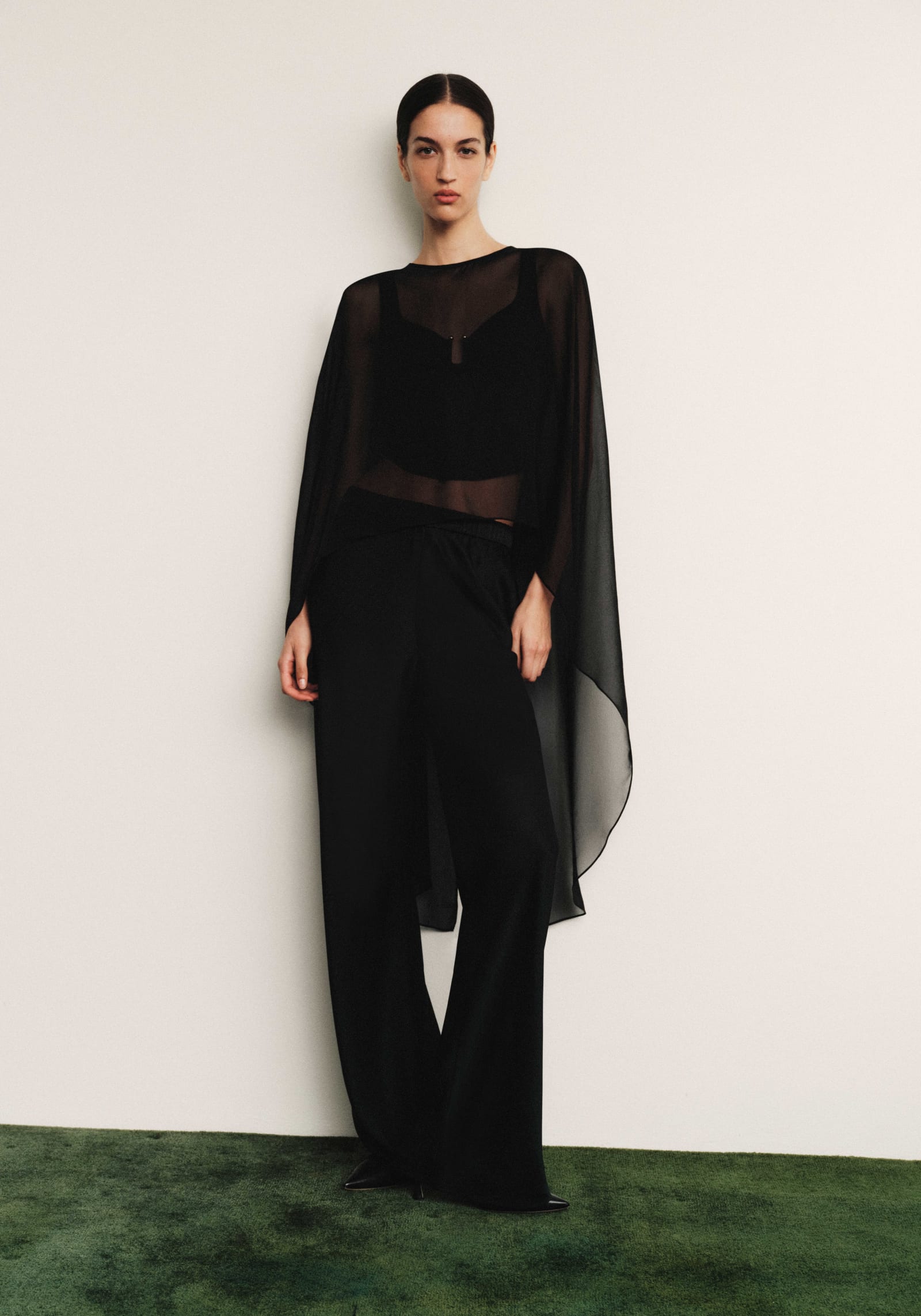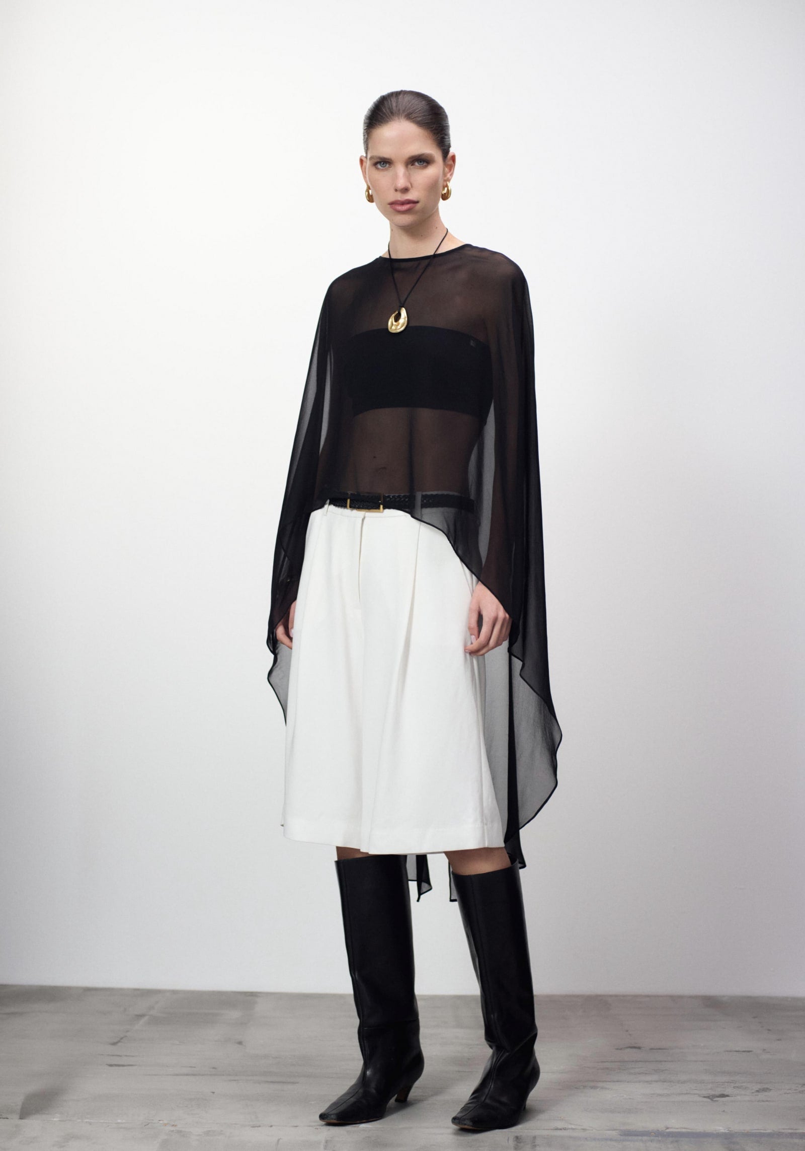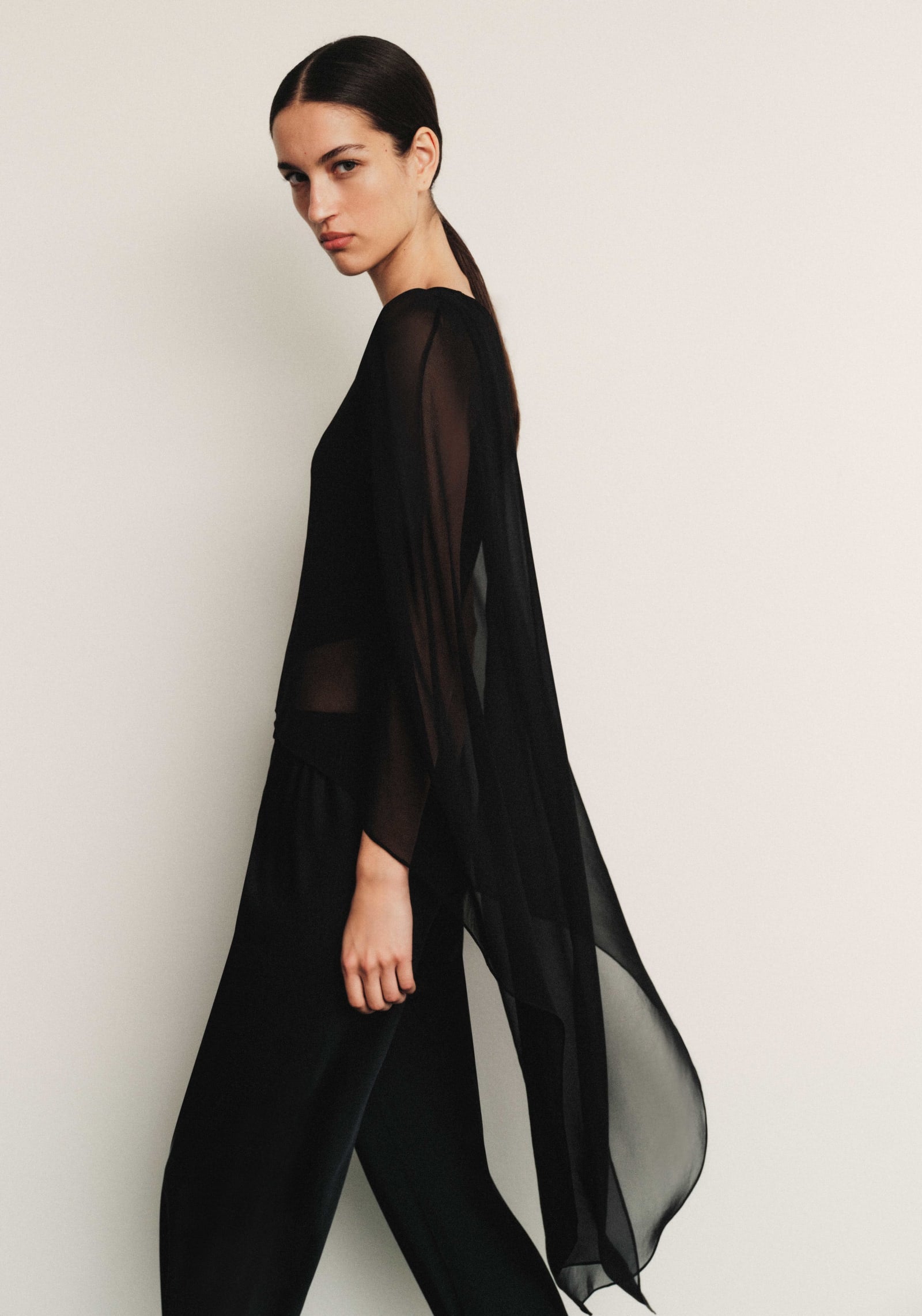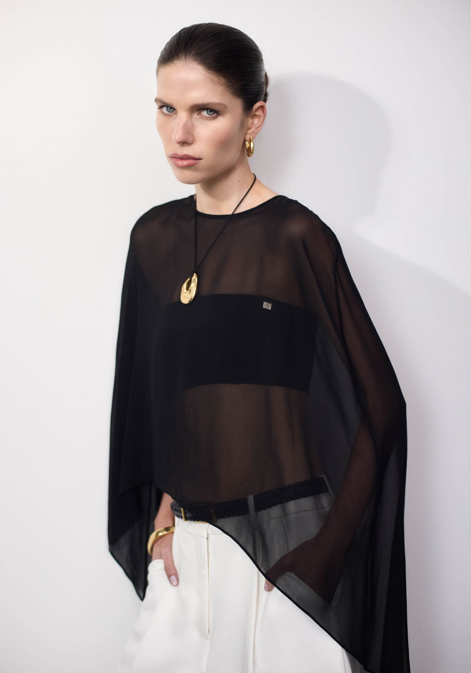 Exude ethereal femininity in the Holliday Cape Top, crafted from black silk georgette. Falling longer at the back with a soft waterfall drape, it captures the essence of fluidity in luxurious sheer detailing. Pair with V&W Foundation undergarments for effortless wear.