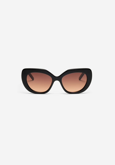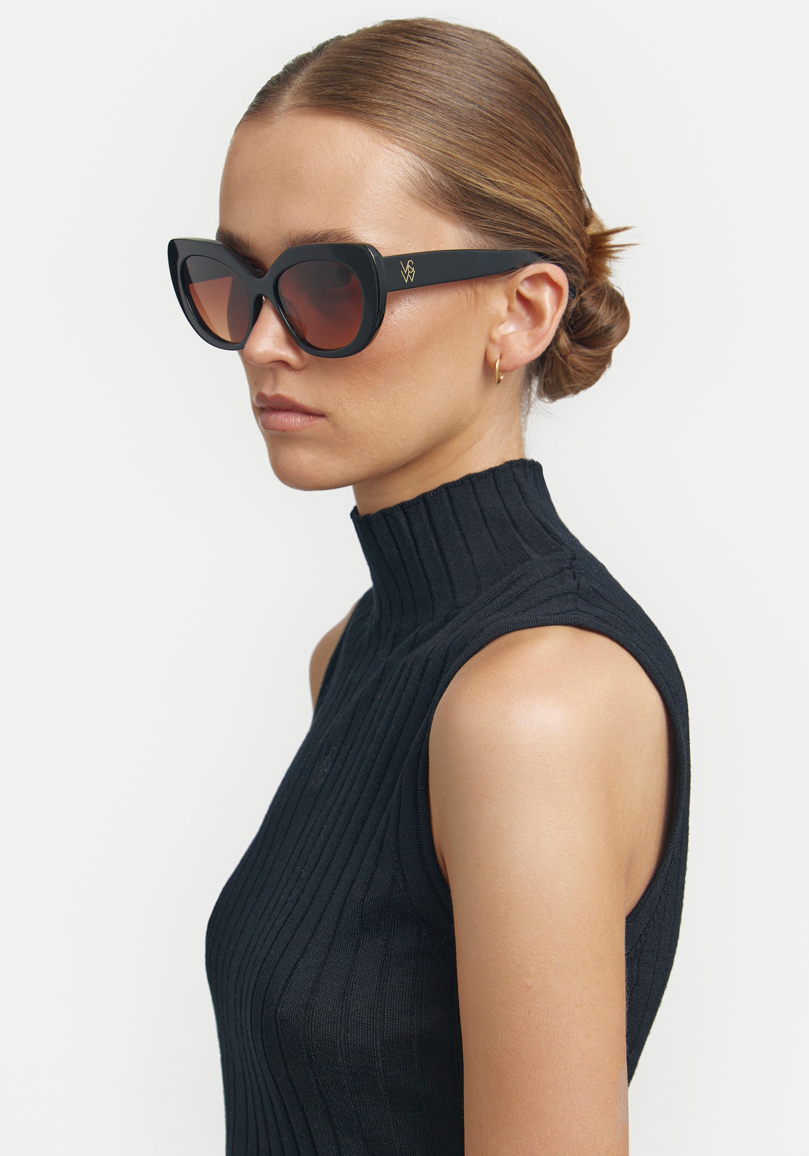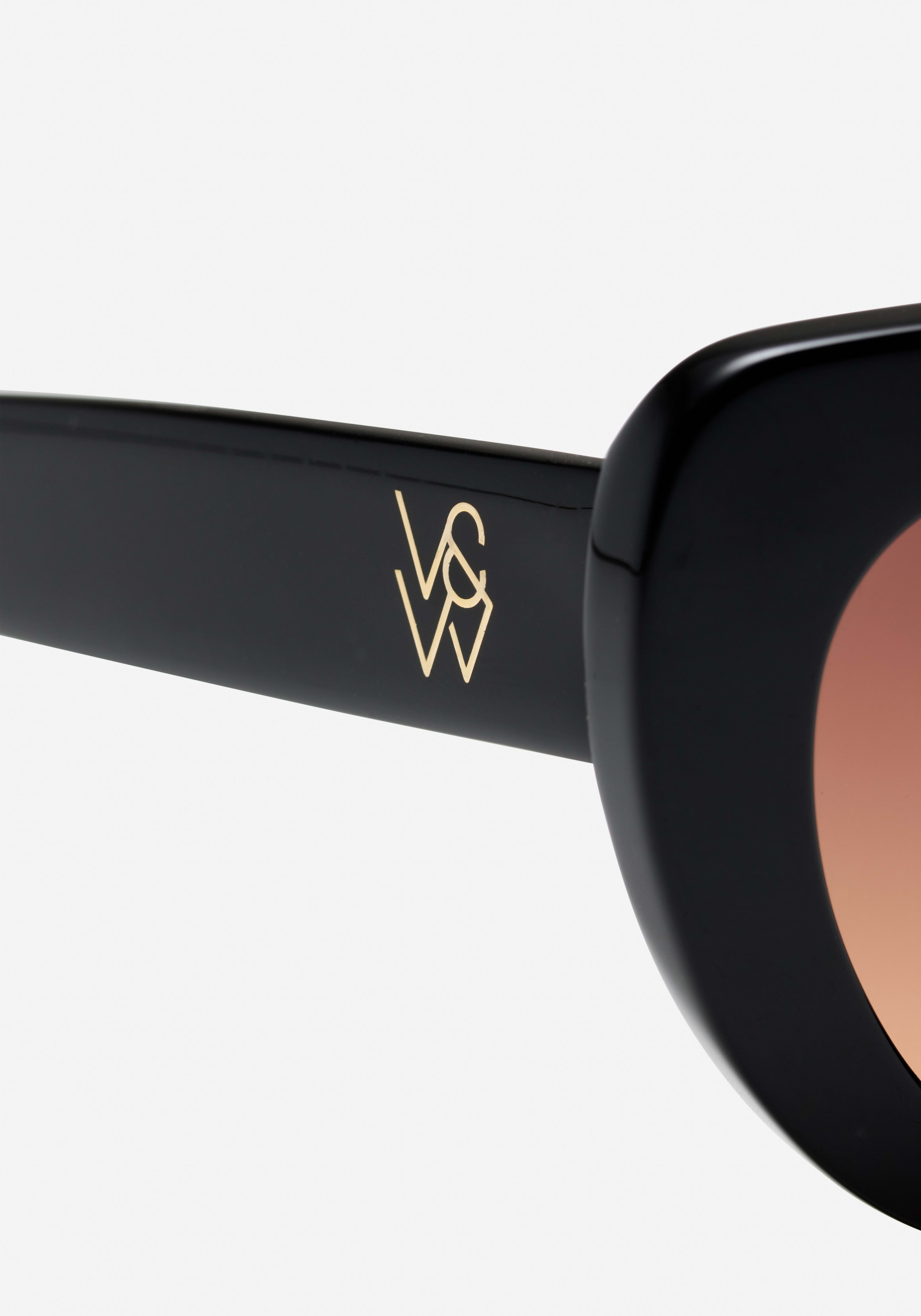 Introducing the Hollywood Sunglasses, classic oversized statement eyewear exuding timeless glamour. Crafted with a black frame and dark brown premium nylon lenses, these sunglasses feature wide arms adorned with gold V&W insignia on both temples. Made with Italian acetate, they offer Category 3 UV protection and full coverage.
