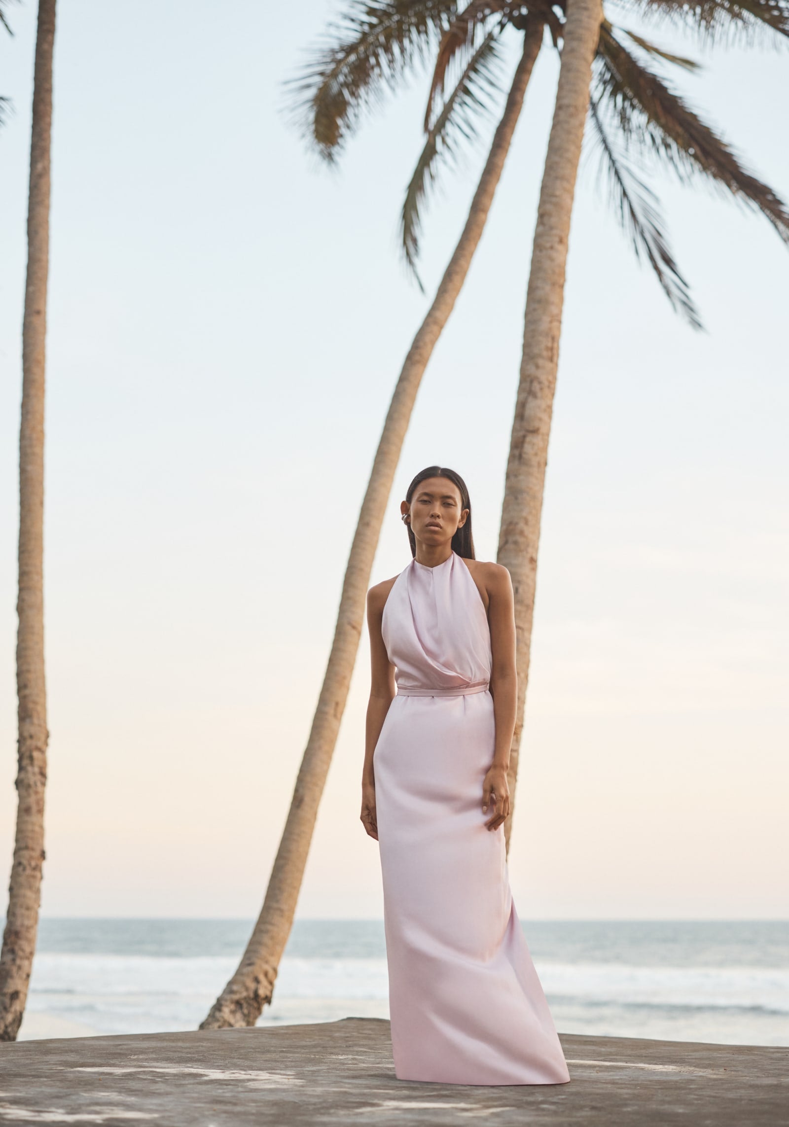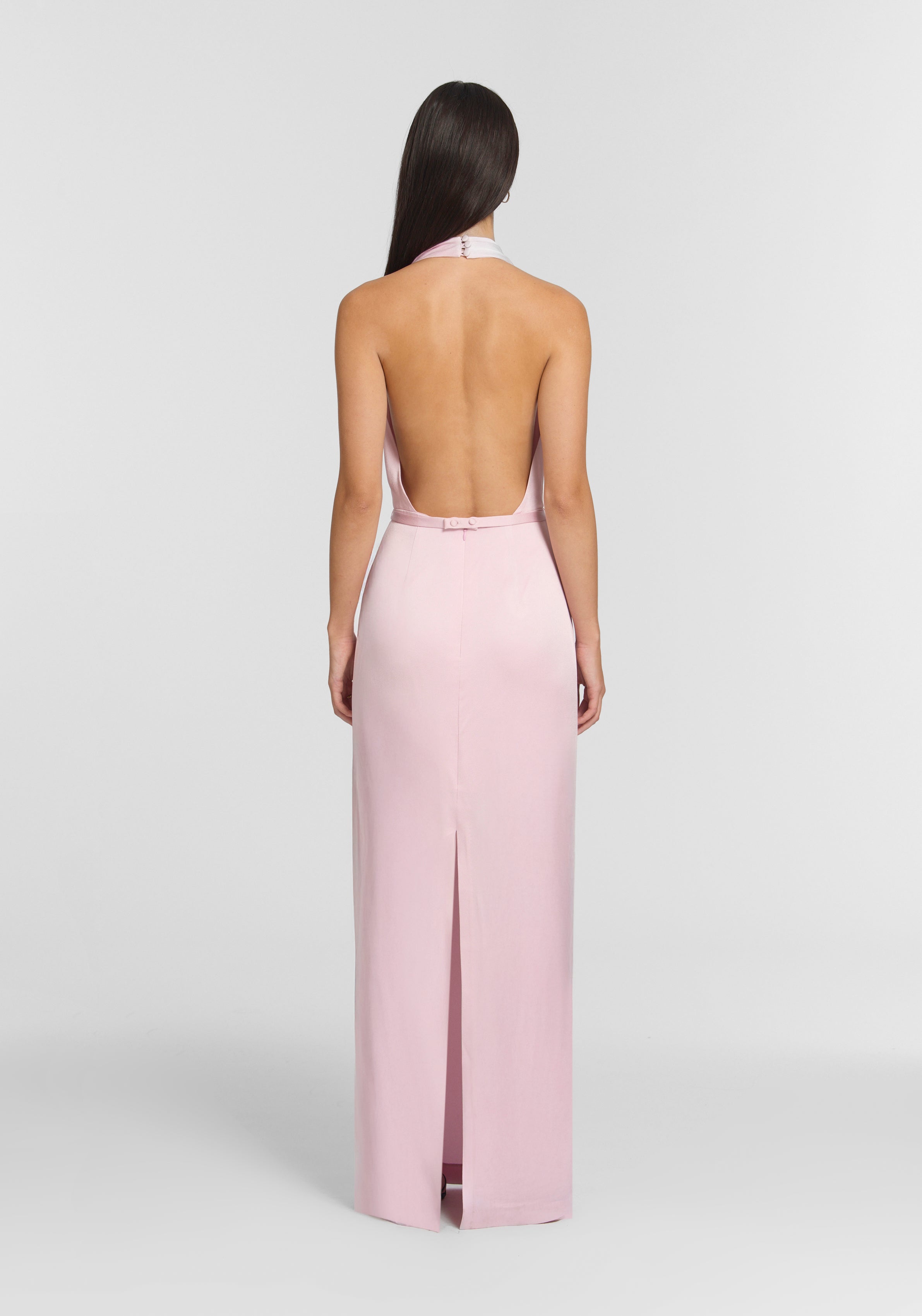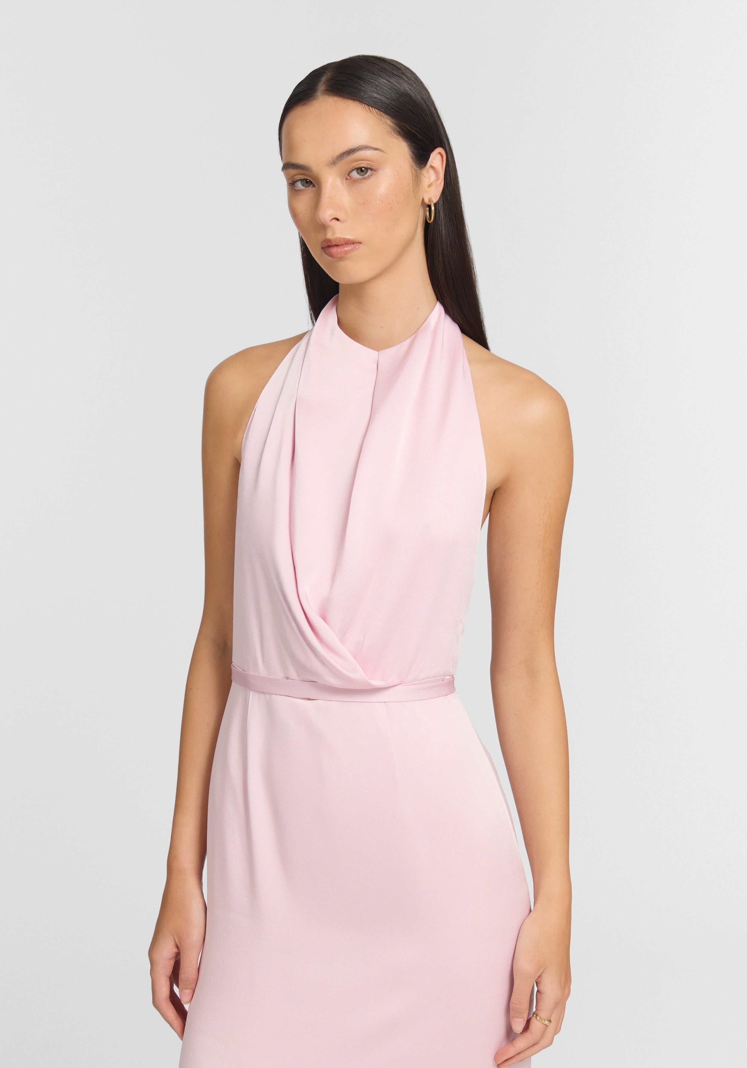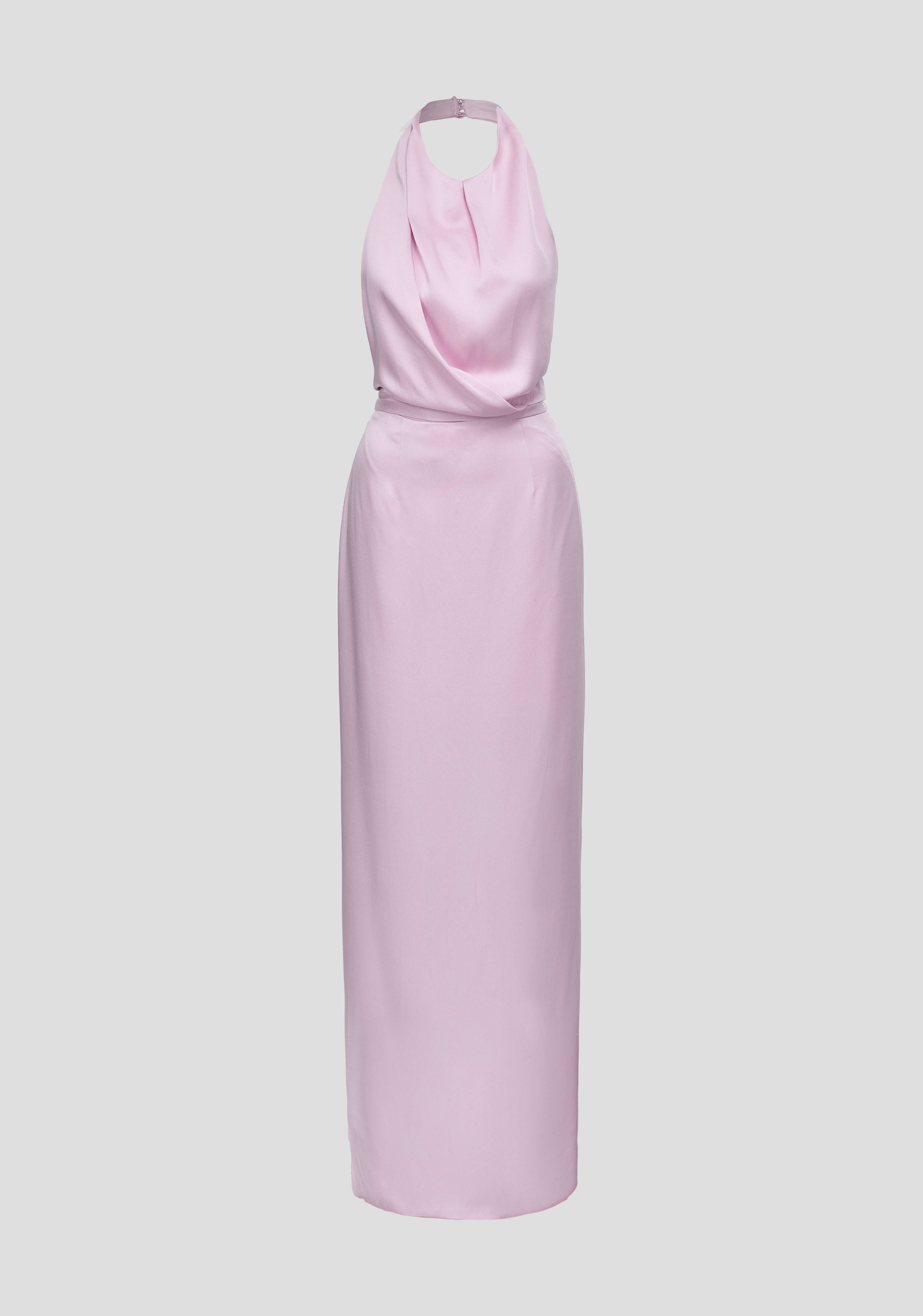The Insatiable Dress, crafted in rosewater pink from luxurious satin-back crepe, celebrates elegant occasion wear. Its floor-length form features architectural draping cascading from a halter neckline, with a waist seam detail and back split. A removable belt allows the waist to be cinched for a defined, commanding shape or worn loose for uninterrupted fluidity.