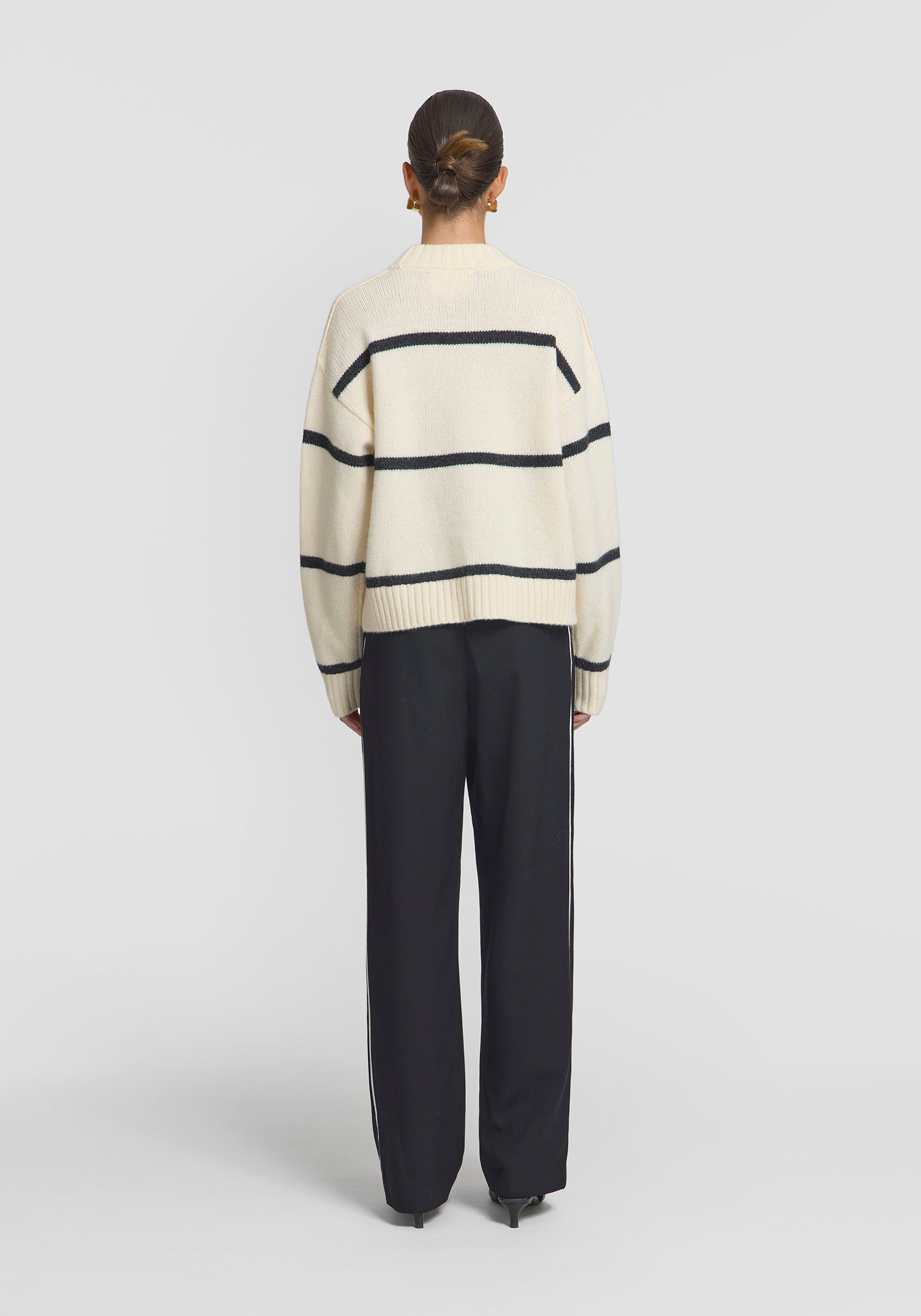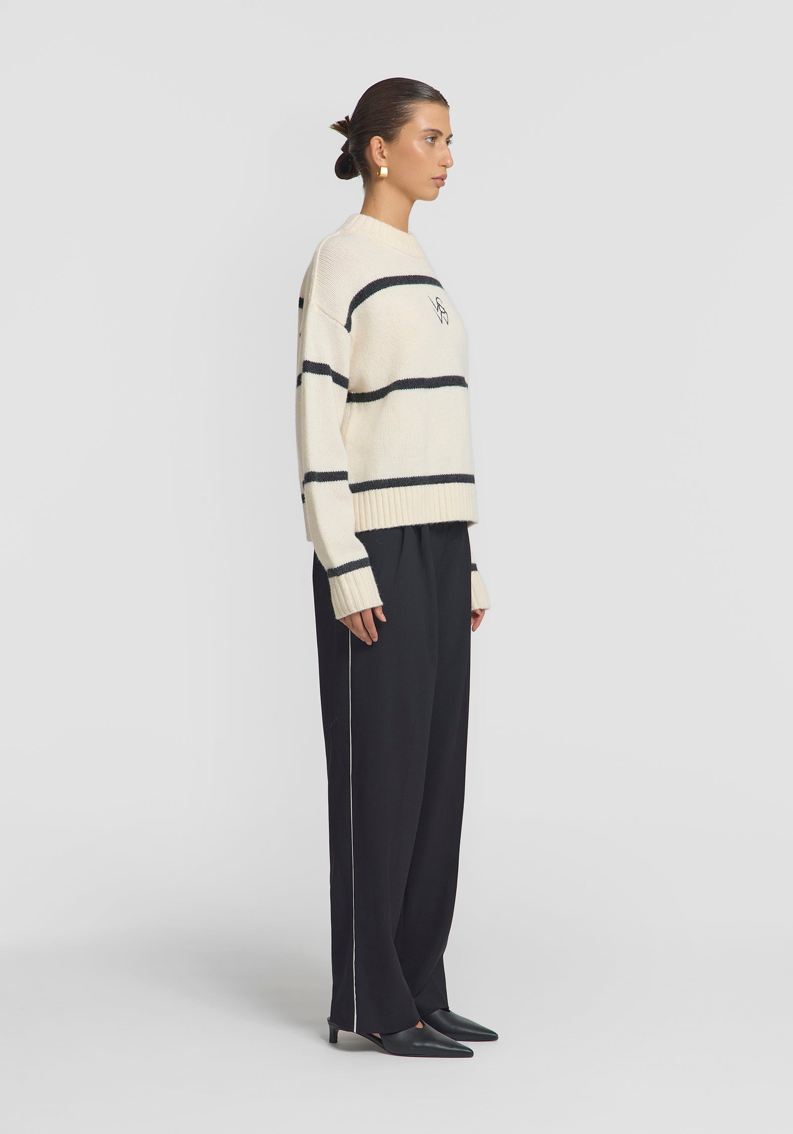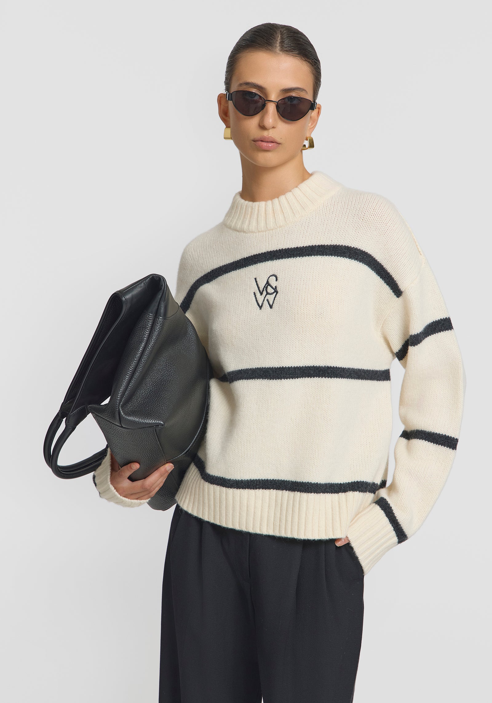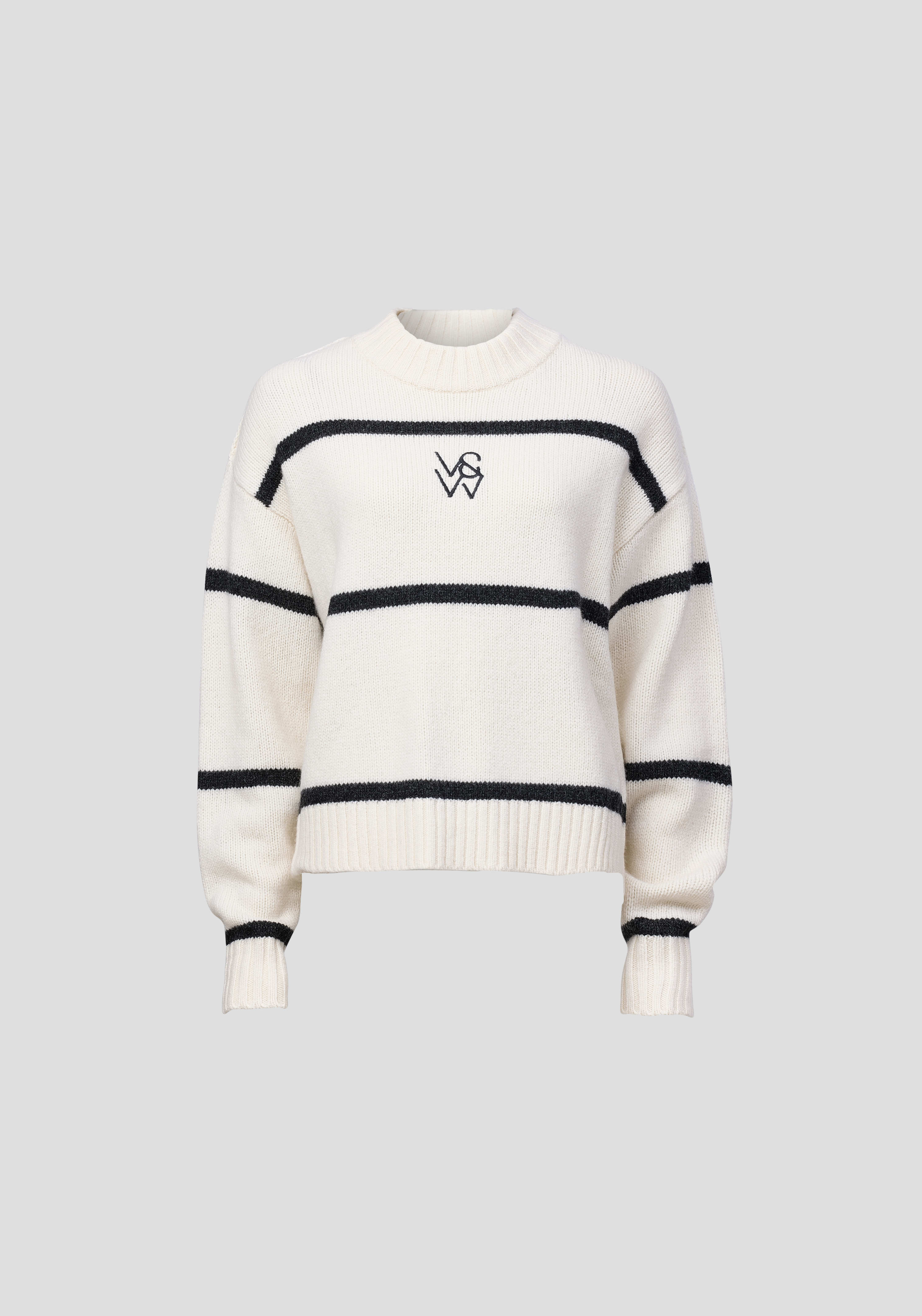 A fresh take on a familiar silhouette, the Invictus Knit in ivory merino wool is this season's go-to for cosy knitwear. Boasting a relaxed, boxy shape and shallow turtleneck, it’s accented with contrast charcoal stripes and the V&W logo for a signature touch. Perfect for layering, this knit is an essential addition to your knitwear refresh.