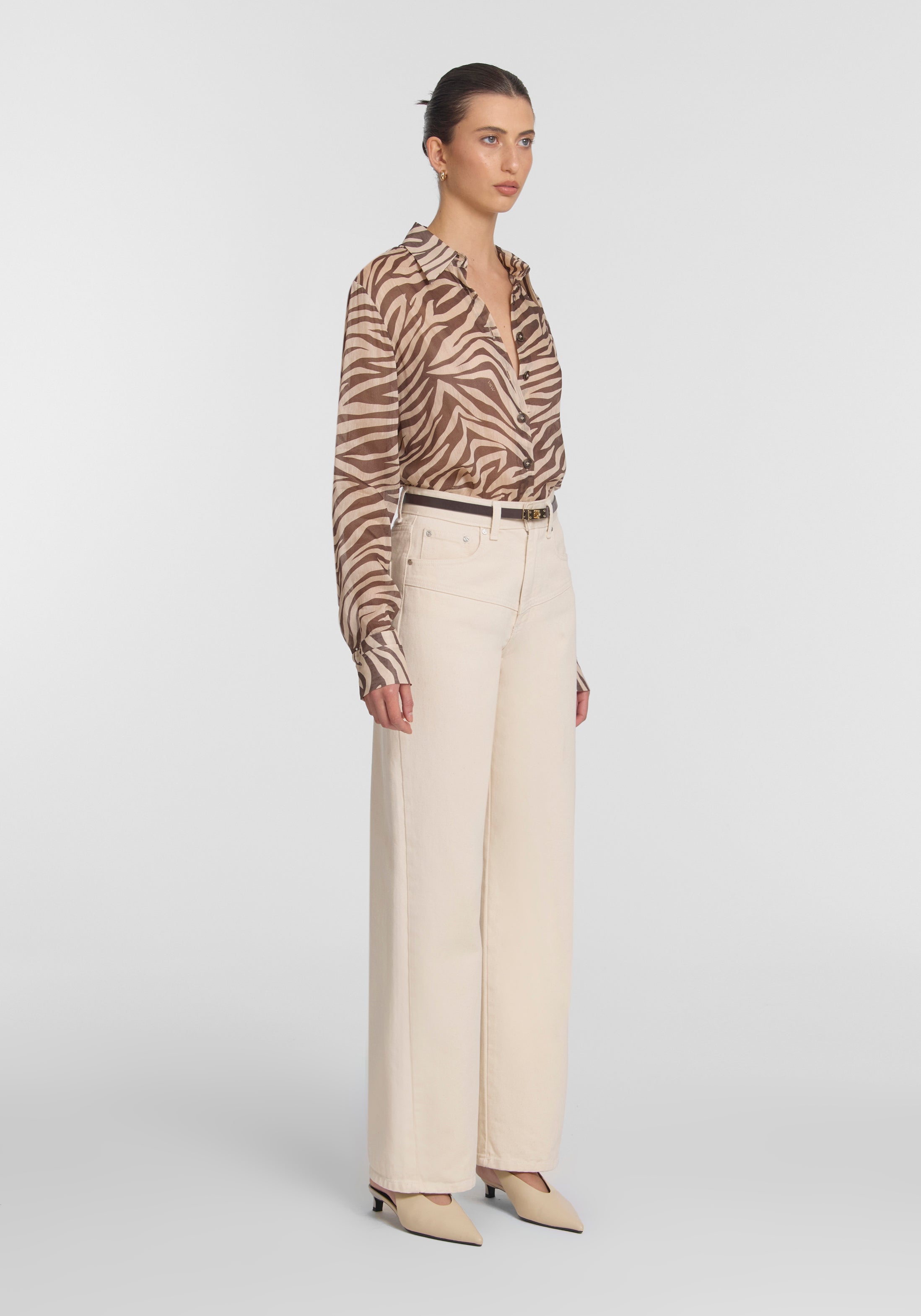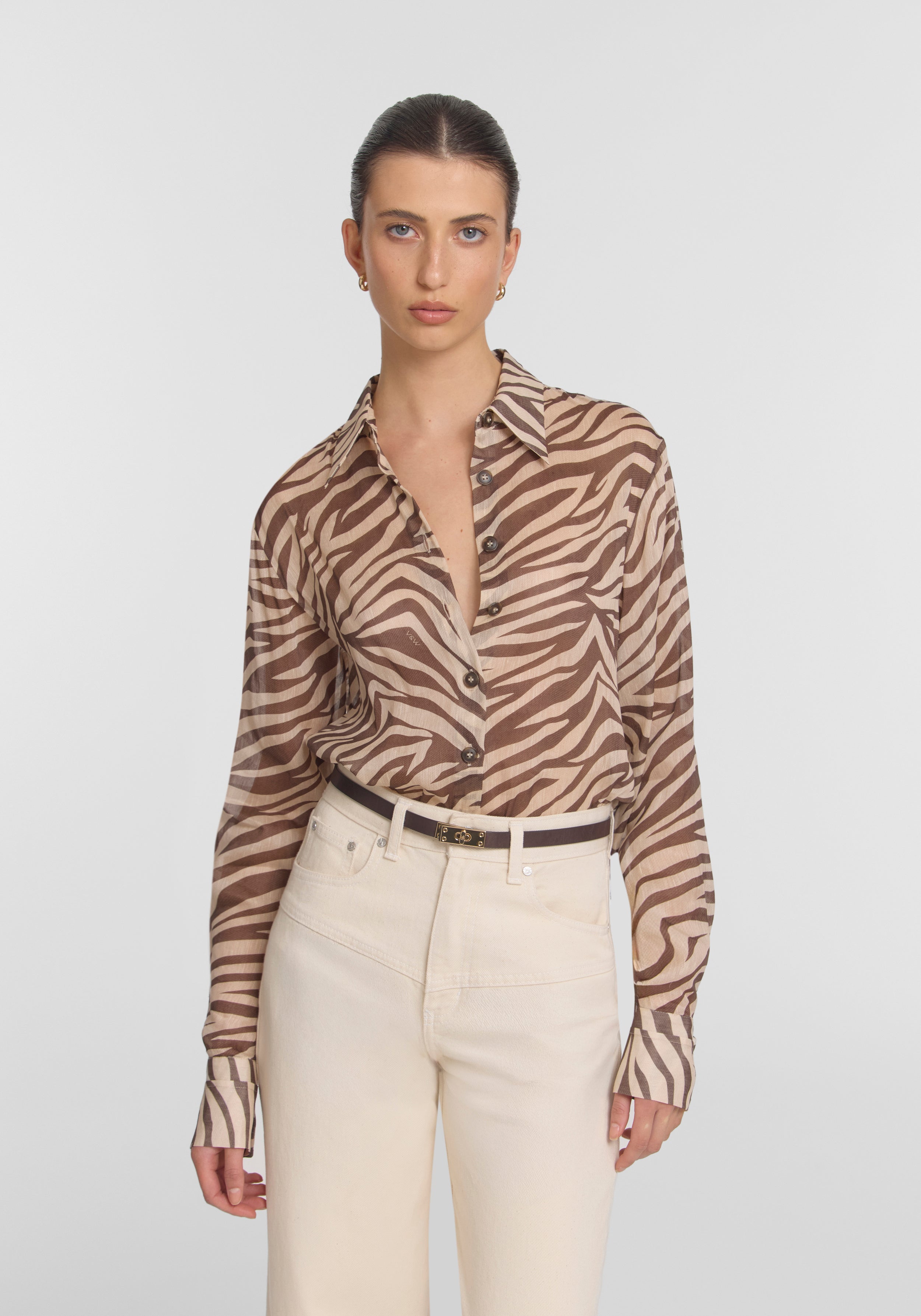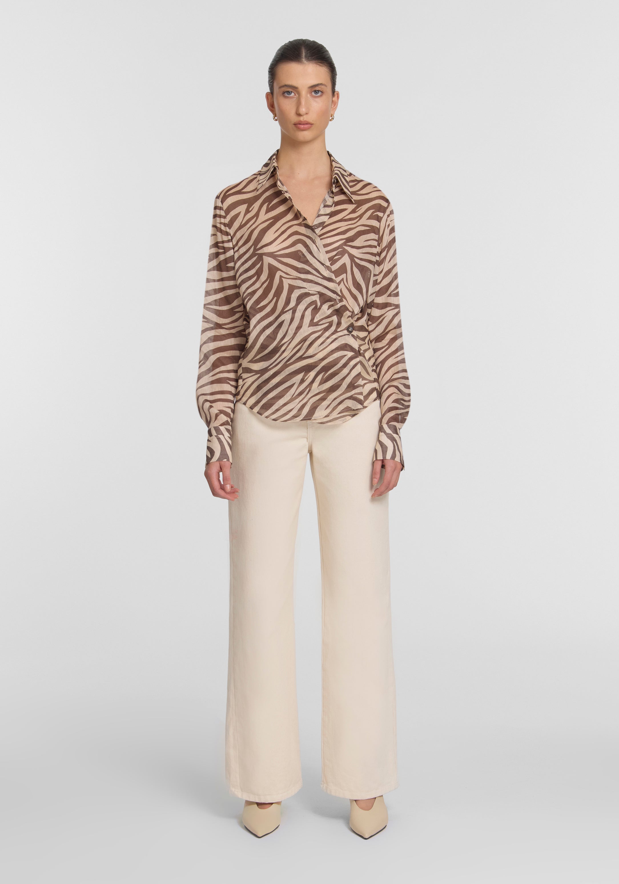 The Irresistible Shirt, crafted from a luxurious linen-silk blend in zebra print, makes a soft statement, showcasing the delicate interplay between print and sheer textile. With traditional shirt detailing, it features an optional modern wrap detail secured with a side seam button. Pair with the Aurelia Skirt for an event ready set or style back with the Kravitz Jean for effortless everyday dressing.