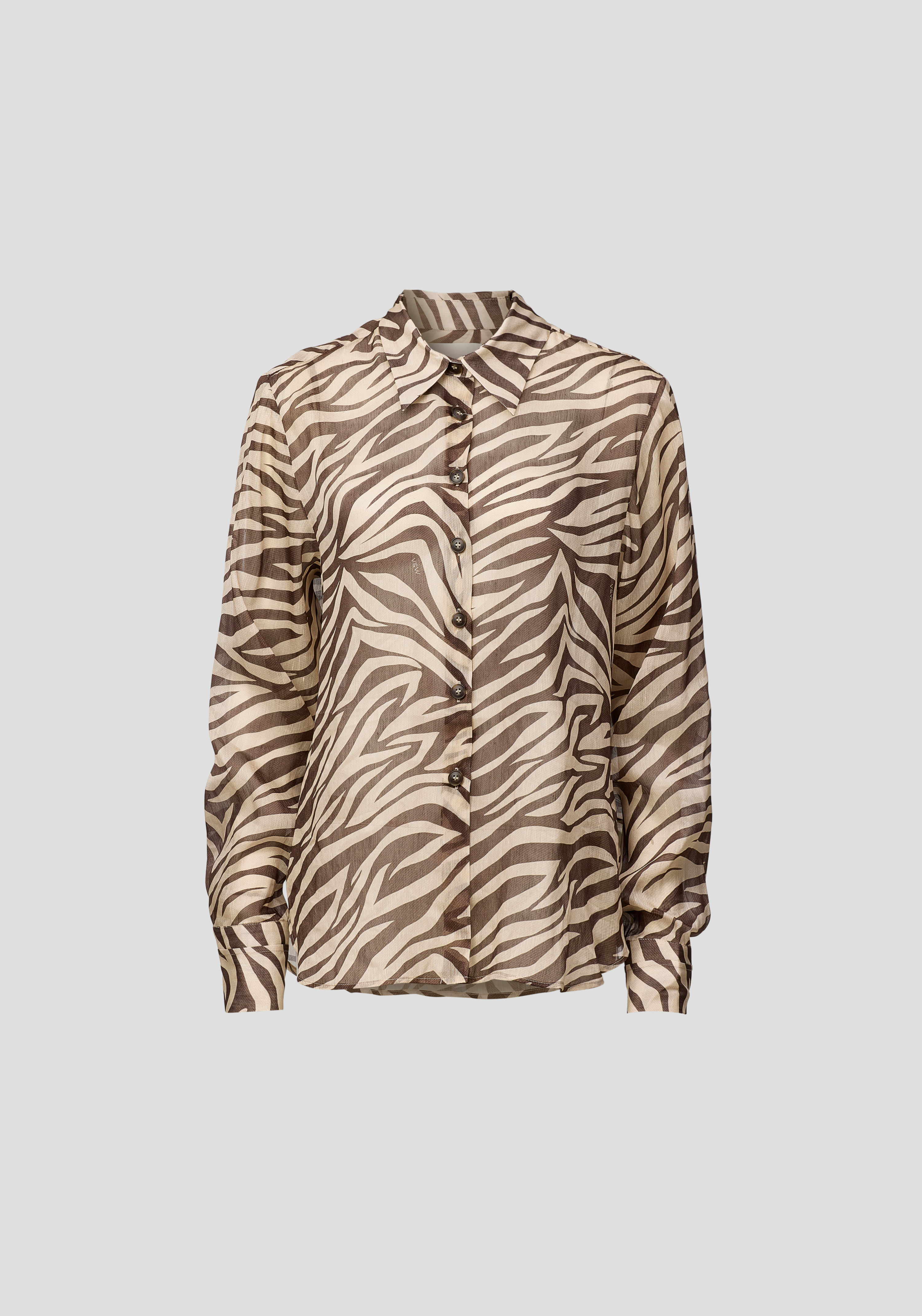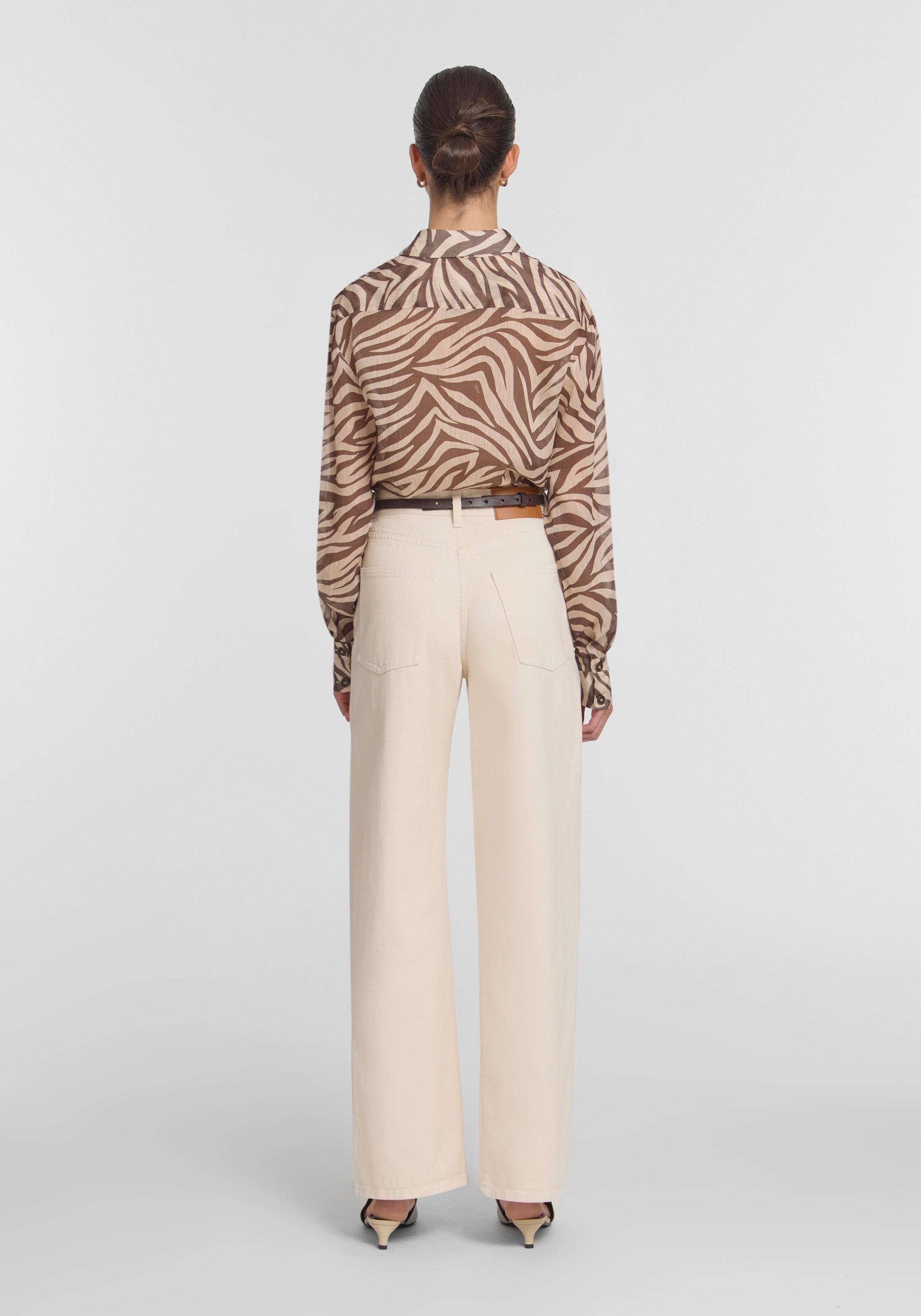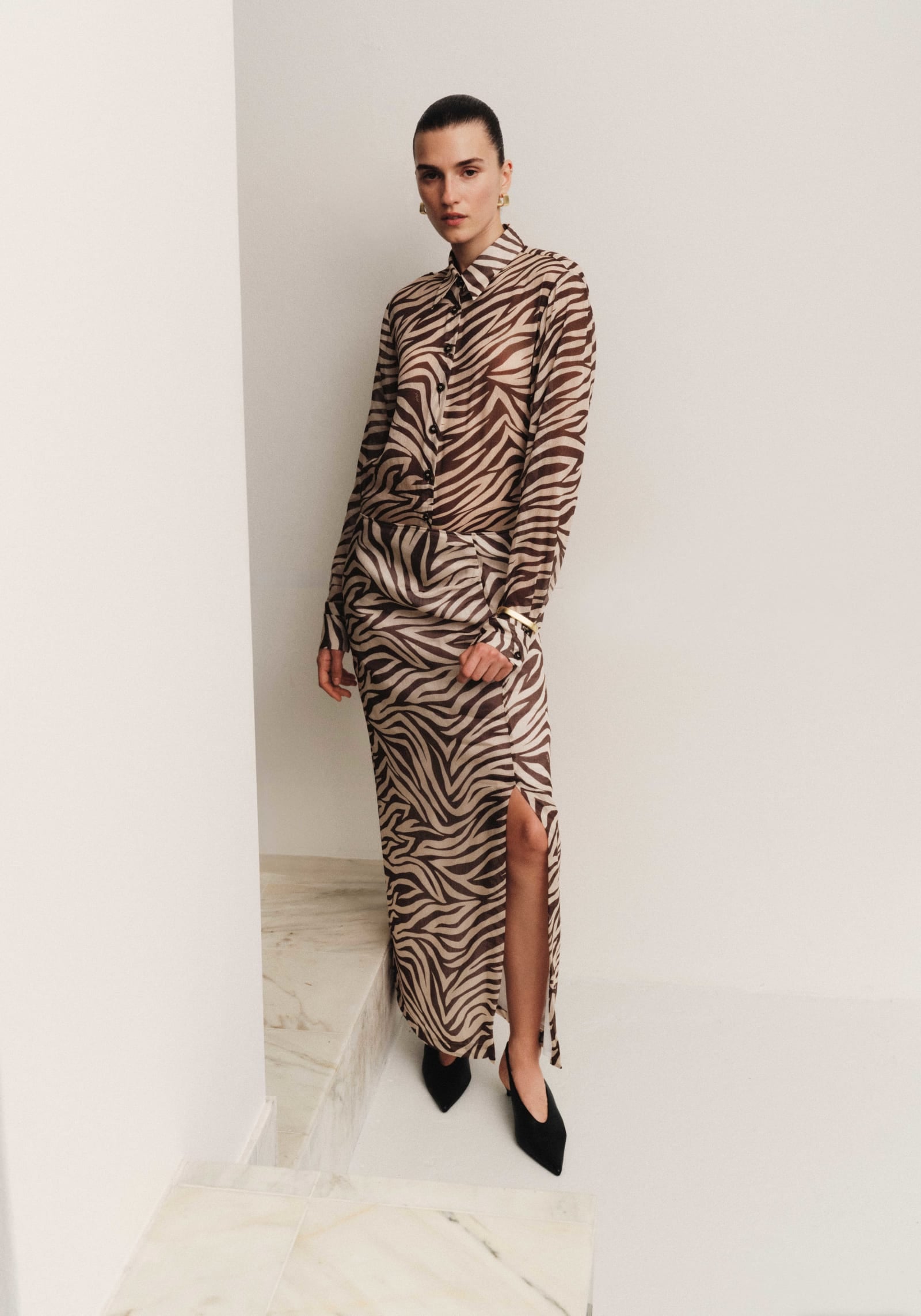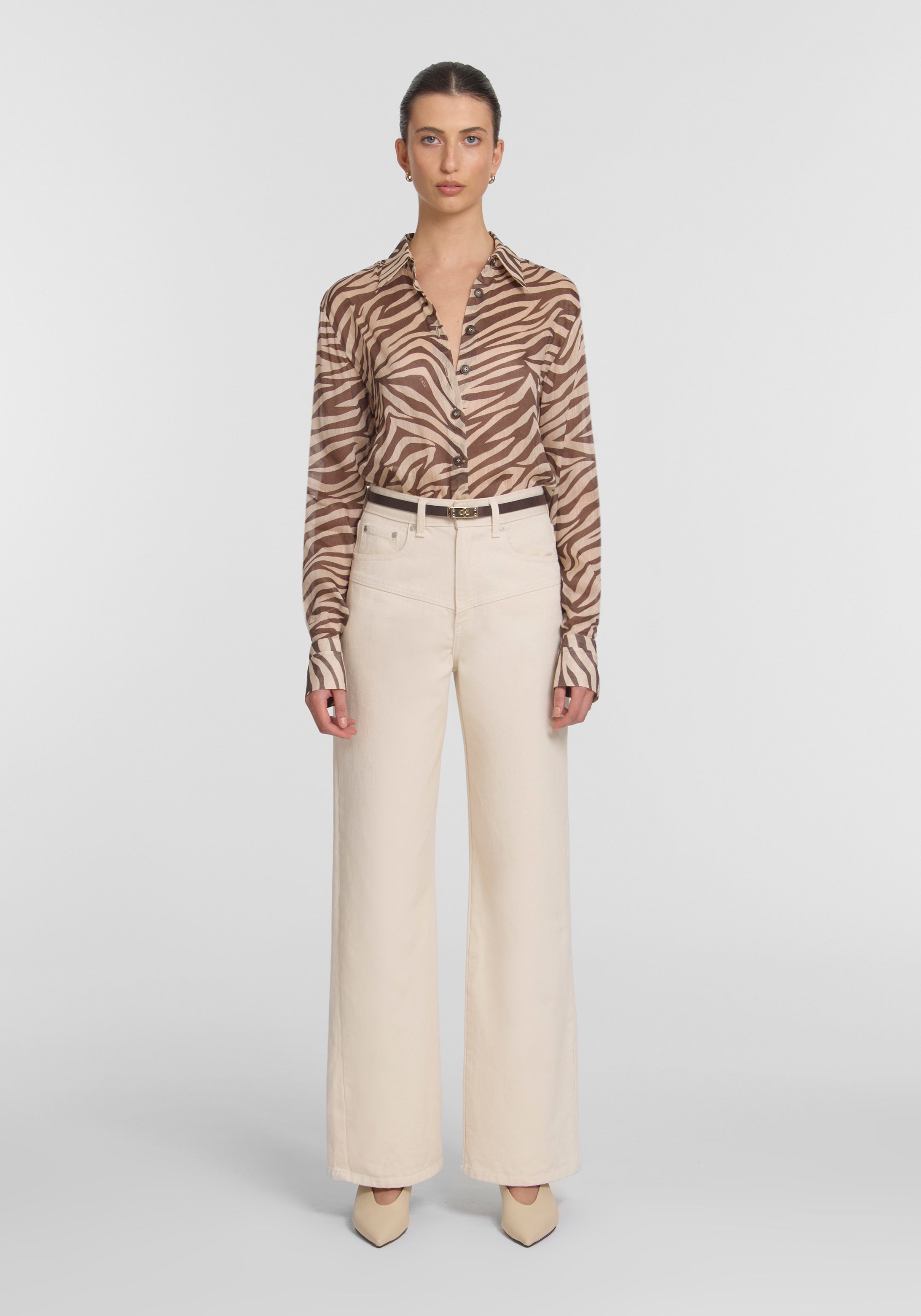 The Irresistible Shirt, crafted from a luxurious linen-silk blend in zebra print, makes a soft statement, showcasing the delicate interplay between print and sheer textile. With traditional shirt detailing, it features an optional modern wrap detail secured with a side seam button. Pair with the Aurelia Skirt for an event ready set or style back with the Kravitz Jean for effortless everyday dressing.