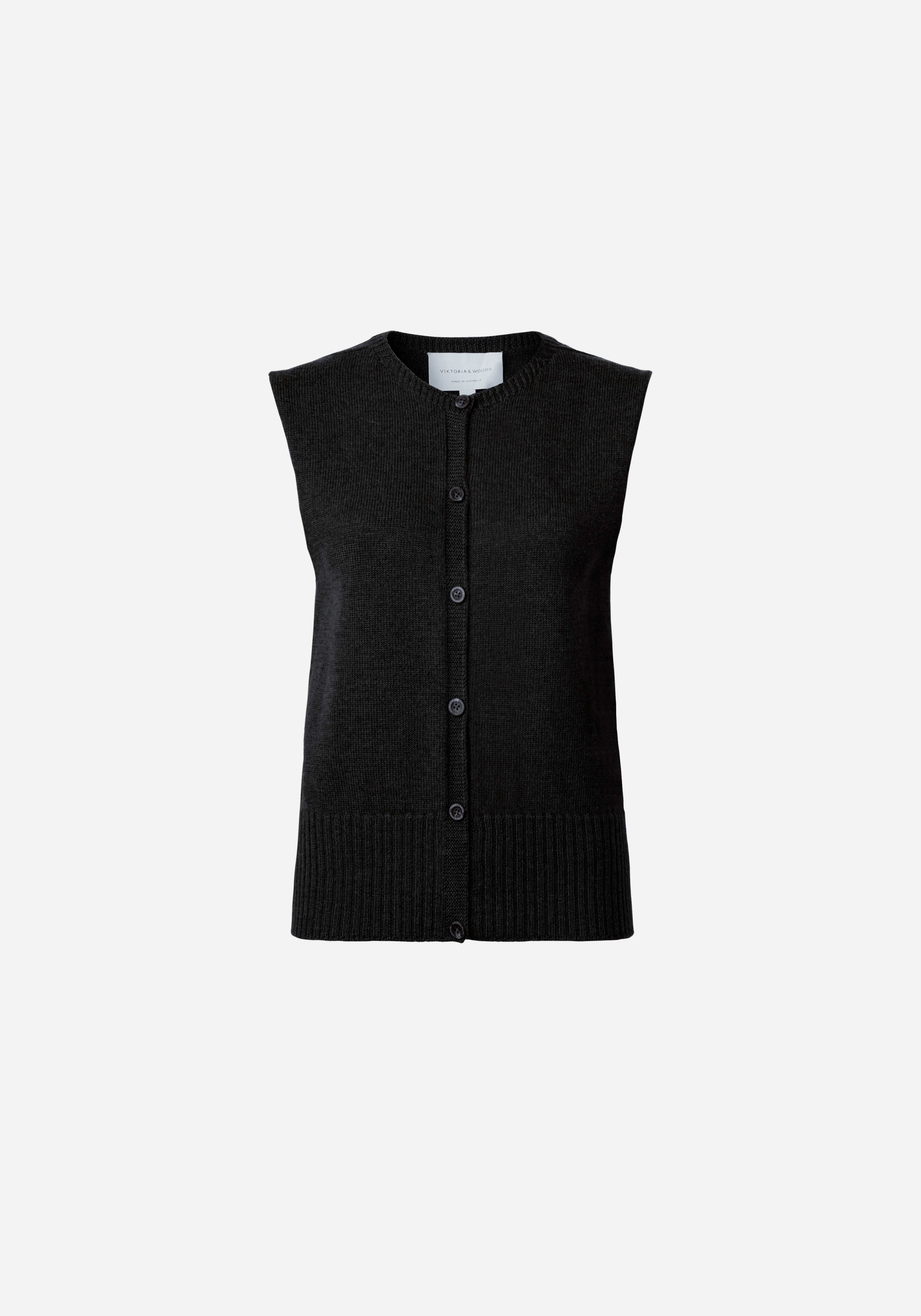 Pay homage to V&W signatures with the Julian Vest, crafted from luxurious black merino wool. Designed with a relaxed fit and extended shoulders, it showcases refined ribbing details and logo buttons. This versatile layering essential offers effortless style, perfect for unfussy everyday styling.