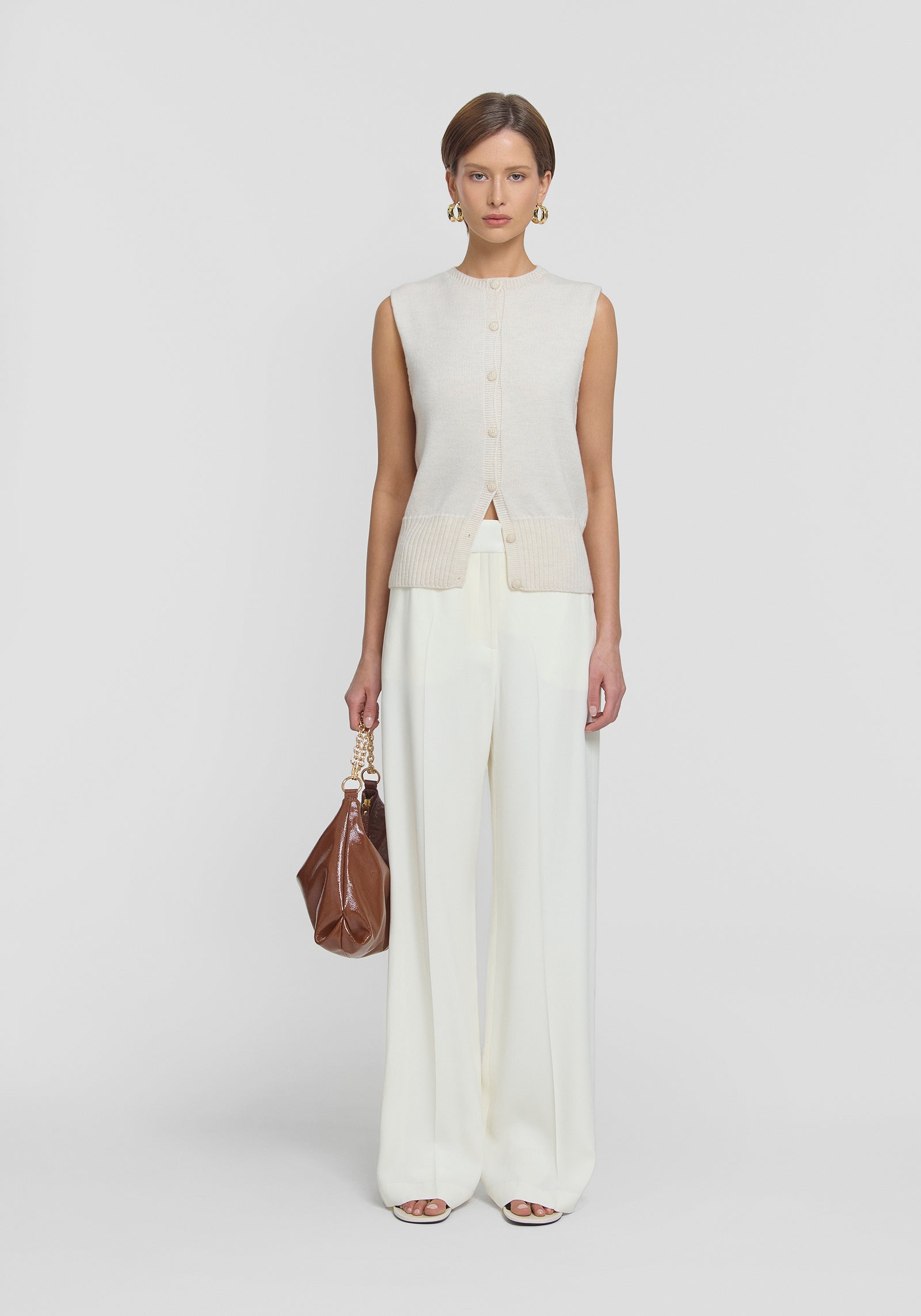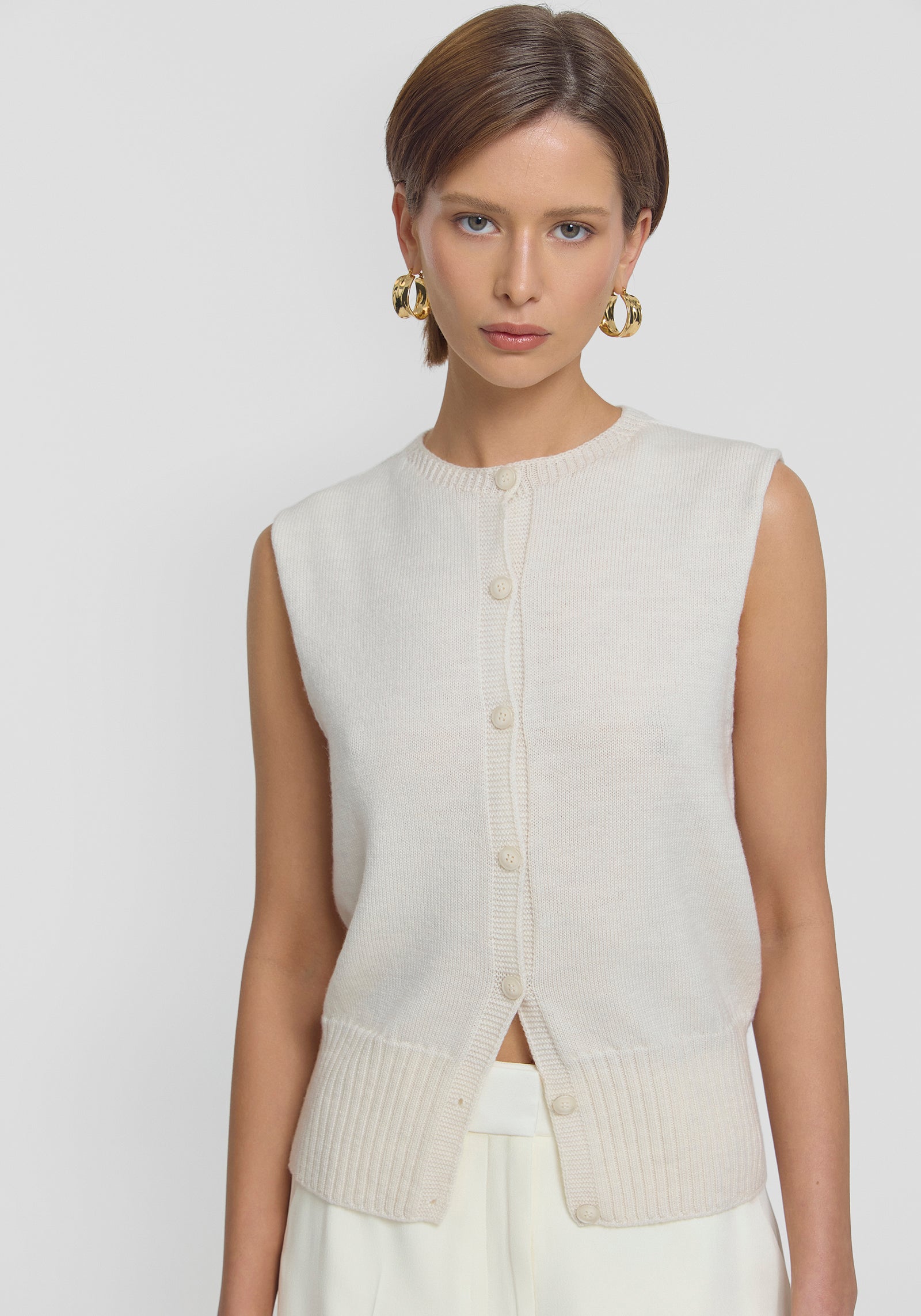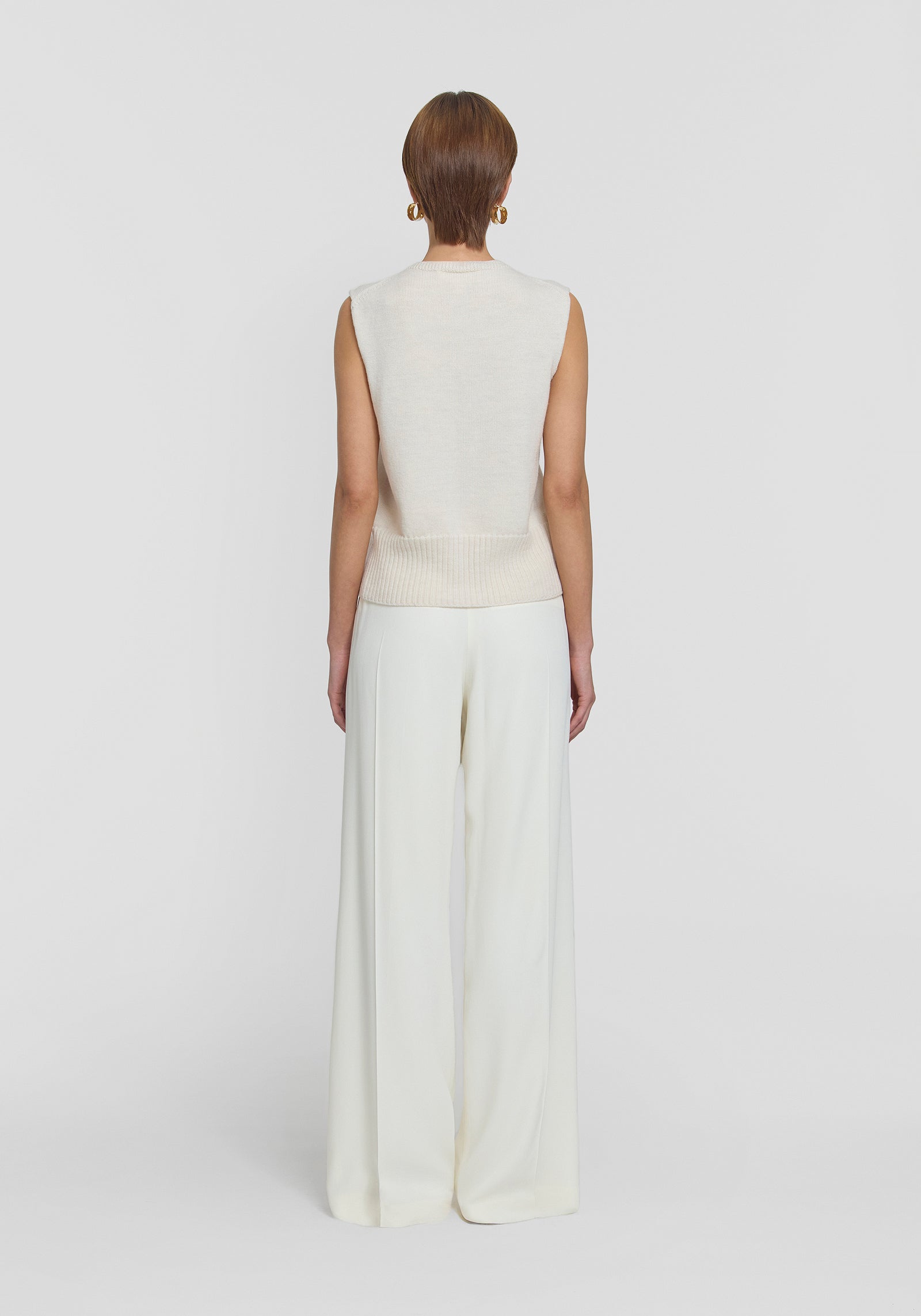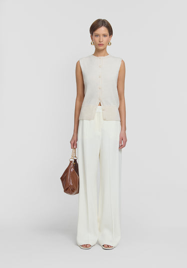 Pay homage to V&W signatures with the Julian Vest, crafted from luxurious ivory merino wool. Designed with a relaxed fit and extended shoulders, it showcases refined ribbing details and logo buttons. This versatile layering essential offers effortless style, perfect for unfussy everyday styling.