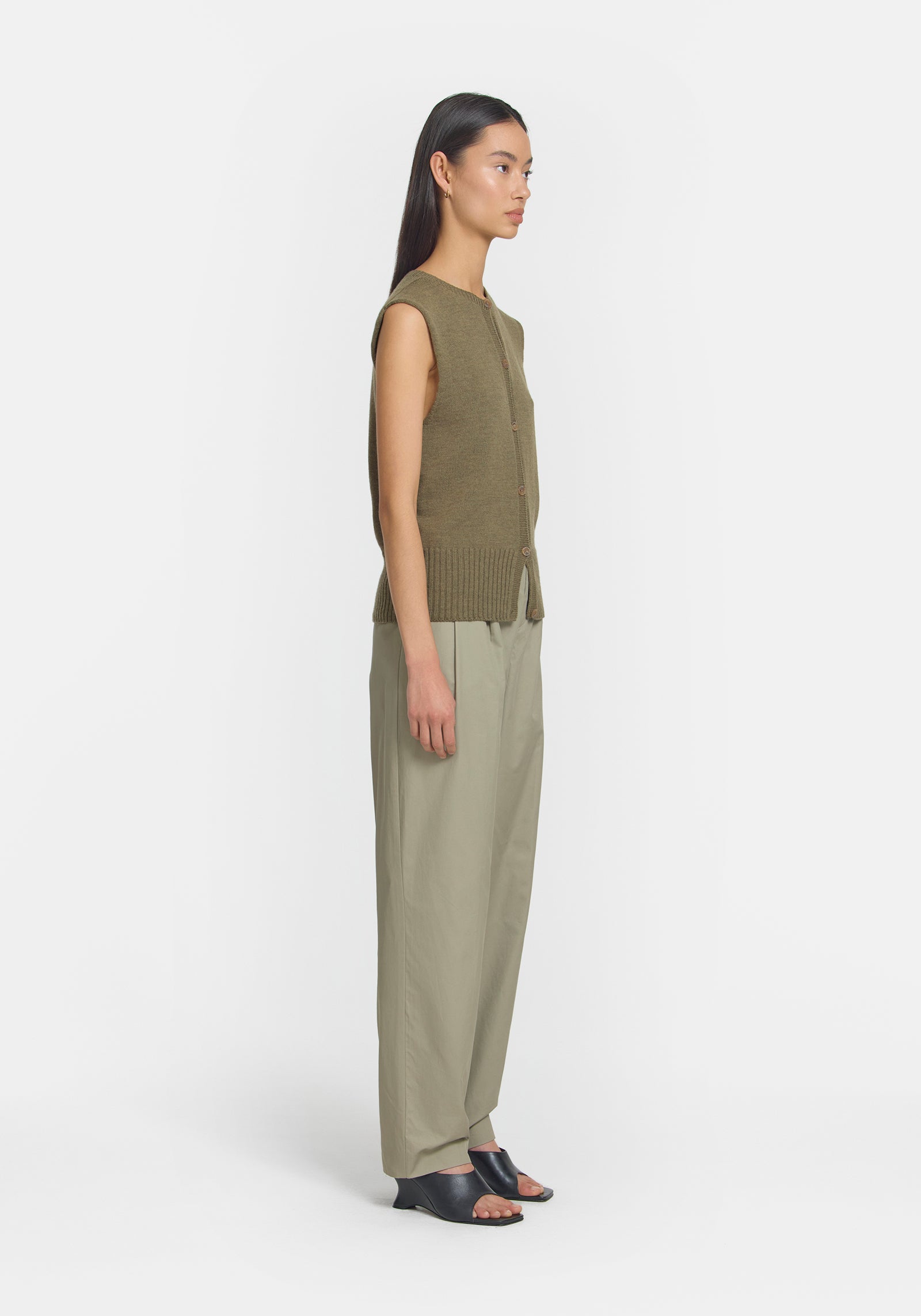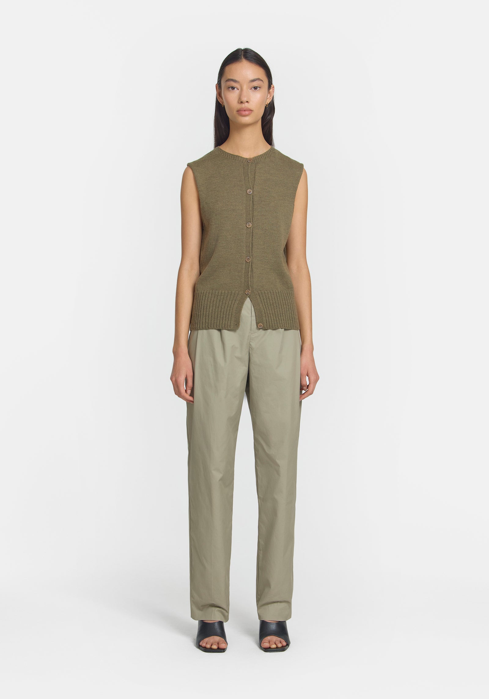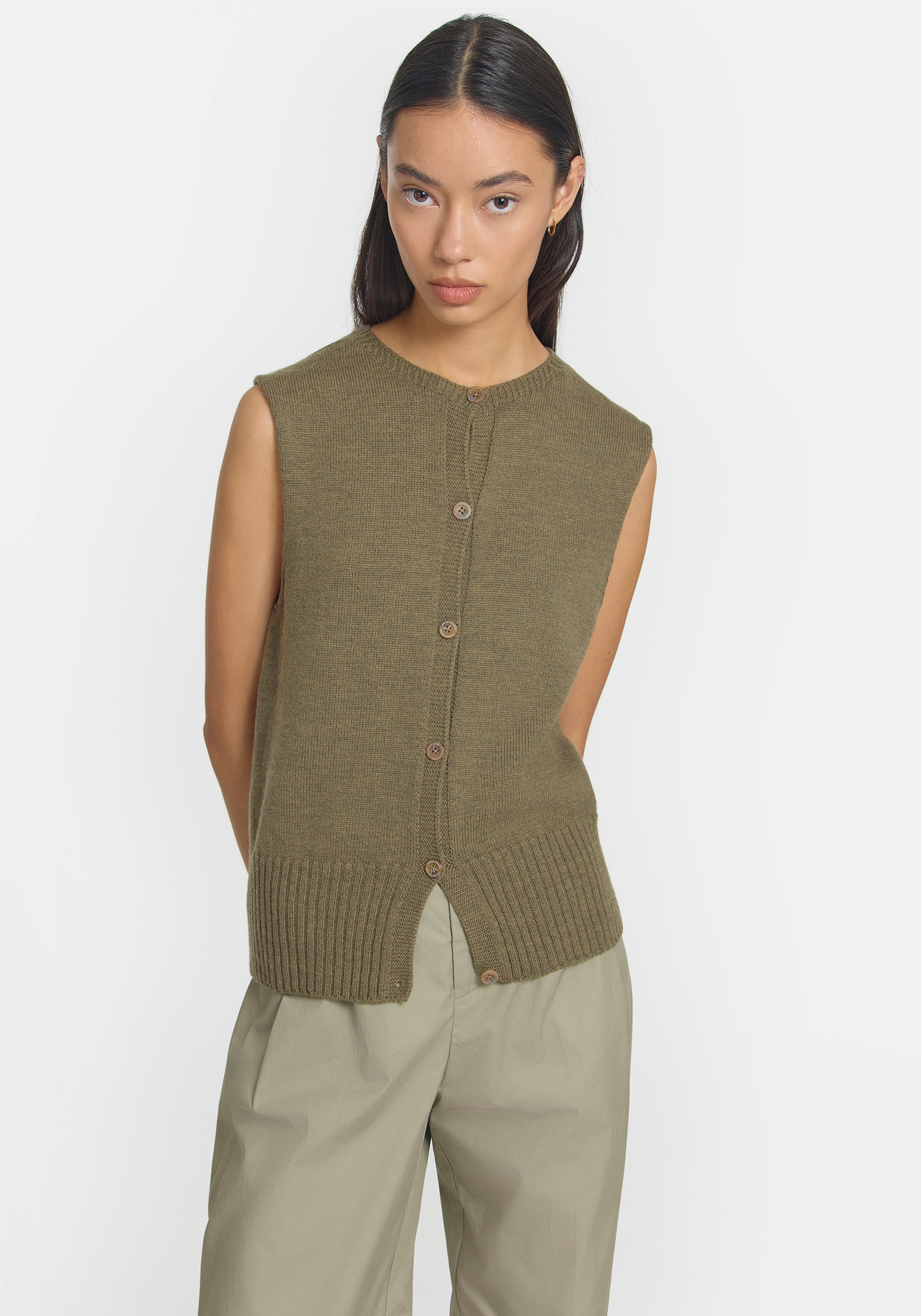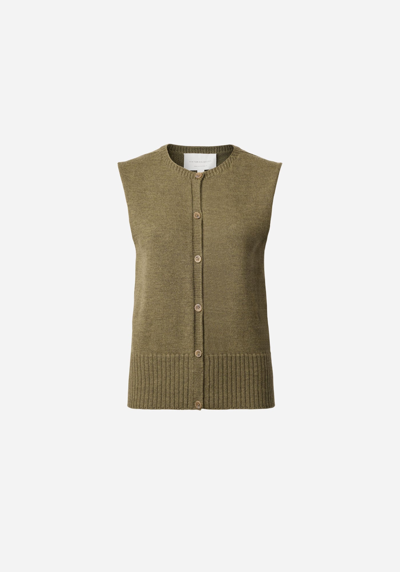 Pay homage to V&W signatures with the Julian Vest, crafted from luxurious khaki merino wool. Designed with a relaxed fit and extended shoulders, it showcases refined ribbing details and logo buttons. This versatile layering essential offers effortless style, perfect for unfussy everyday styling.
