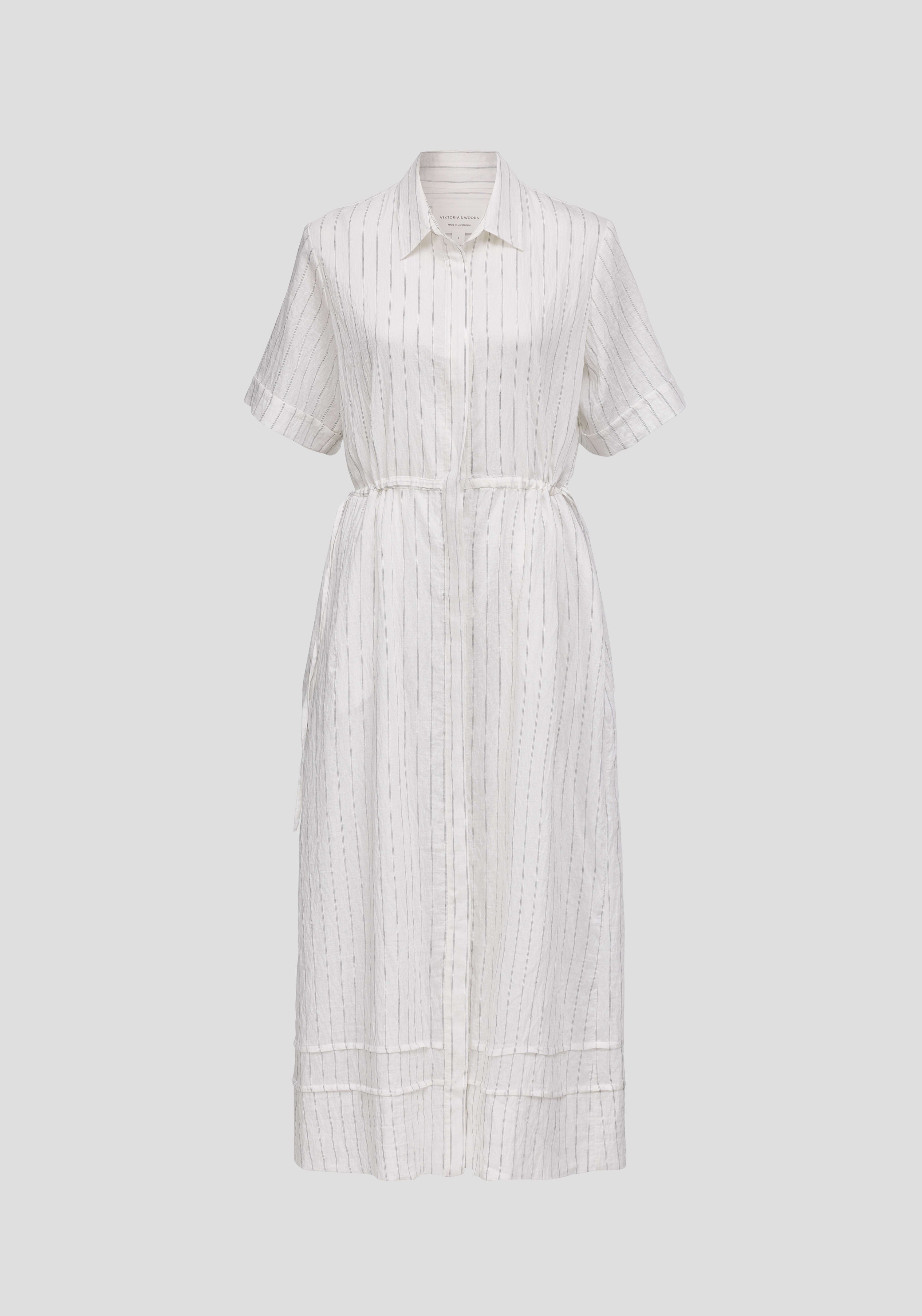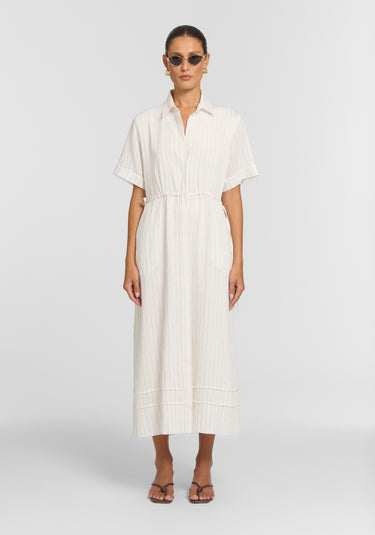The Laneway Stripe Dress, an effortless maxi shirt dress in a lightweight, flowing neutral-stripe, creates a timeless expression of elegance. Showcasing relaxed shoulders, short set-in sleeves, a drawcord at the waist, and delicate side ties, it effortlessly fuses comfort with understated structure.