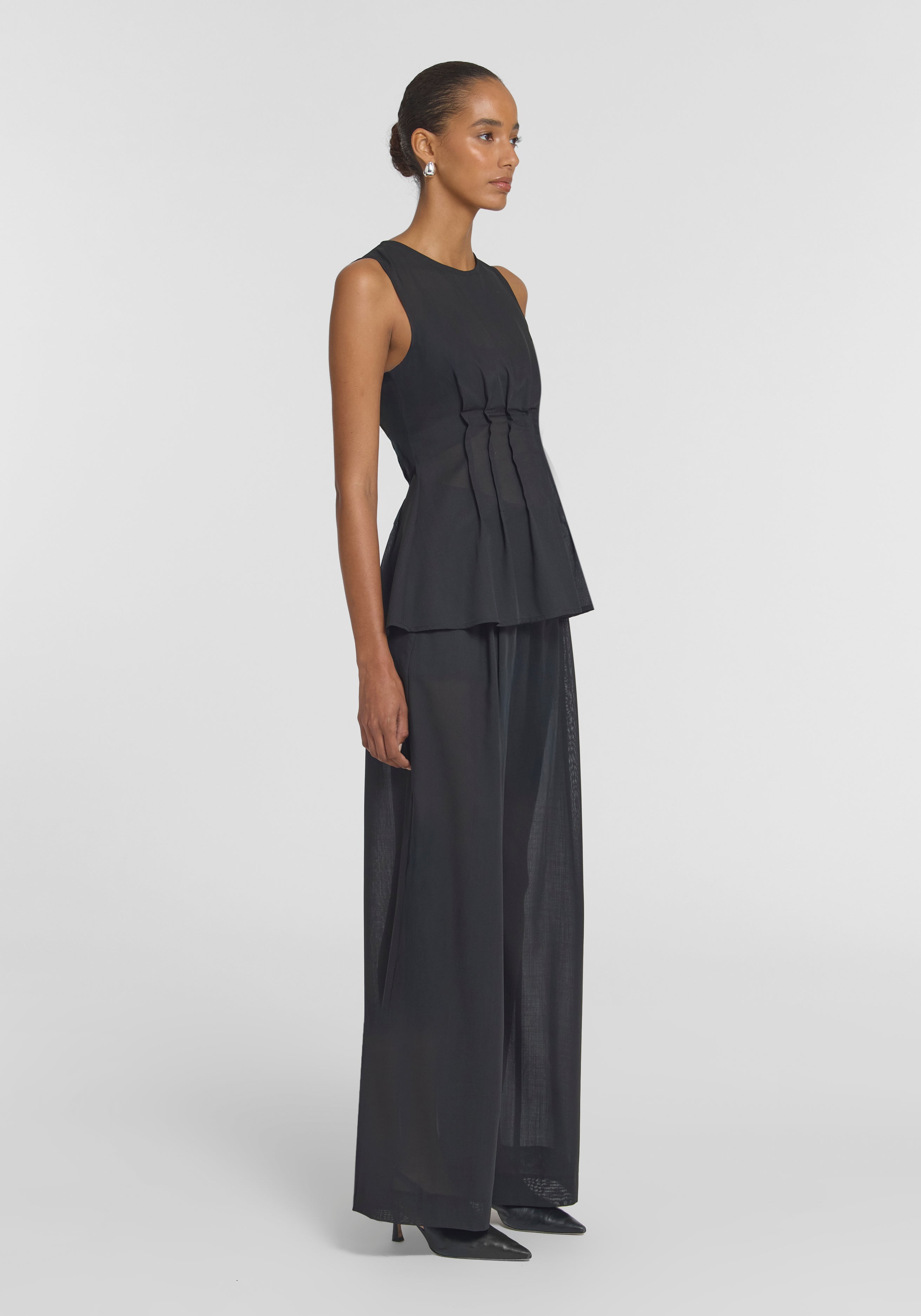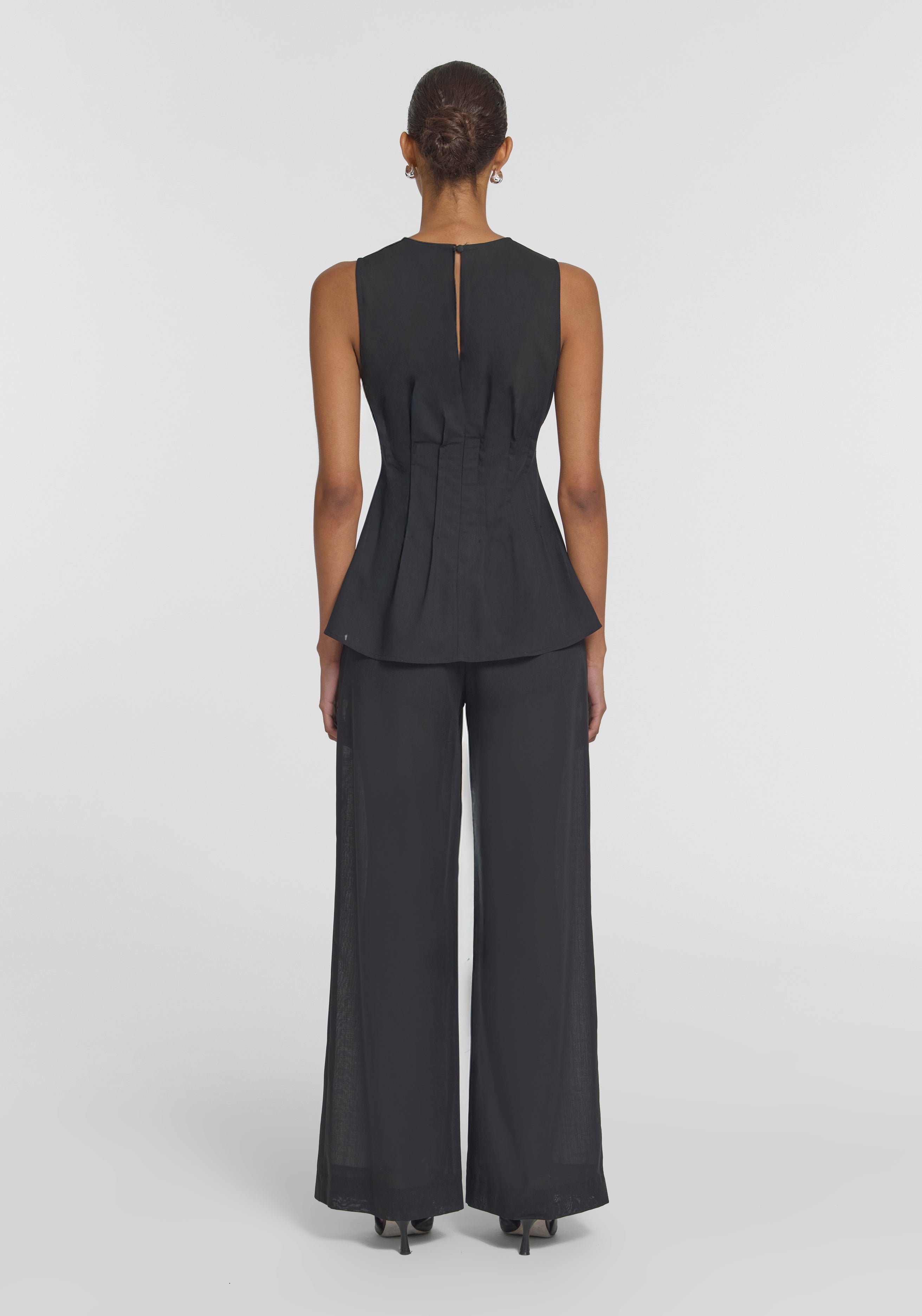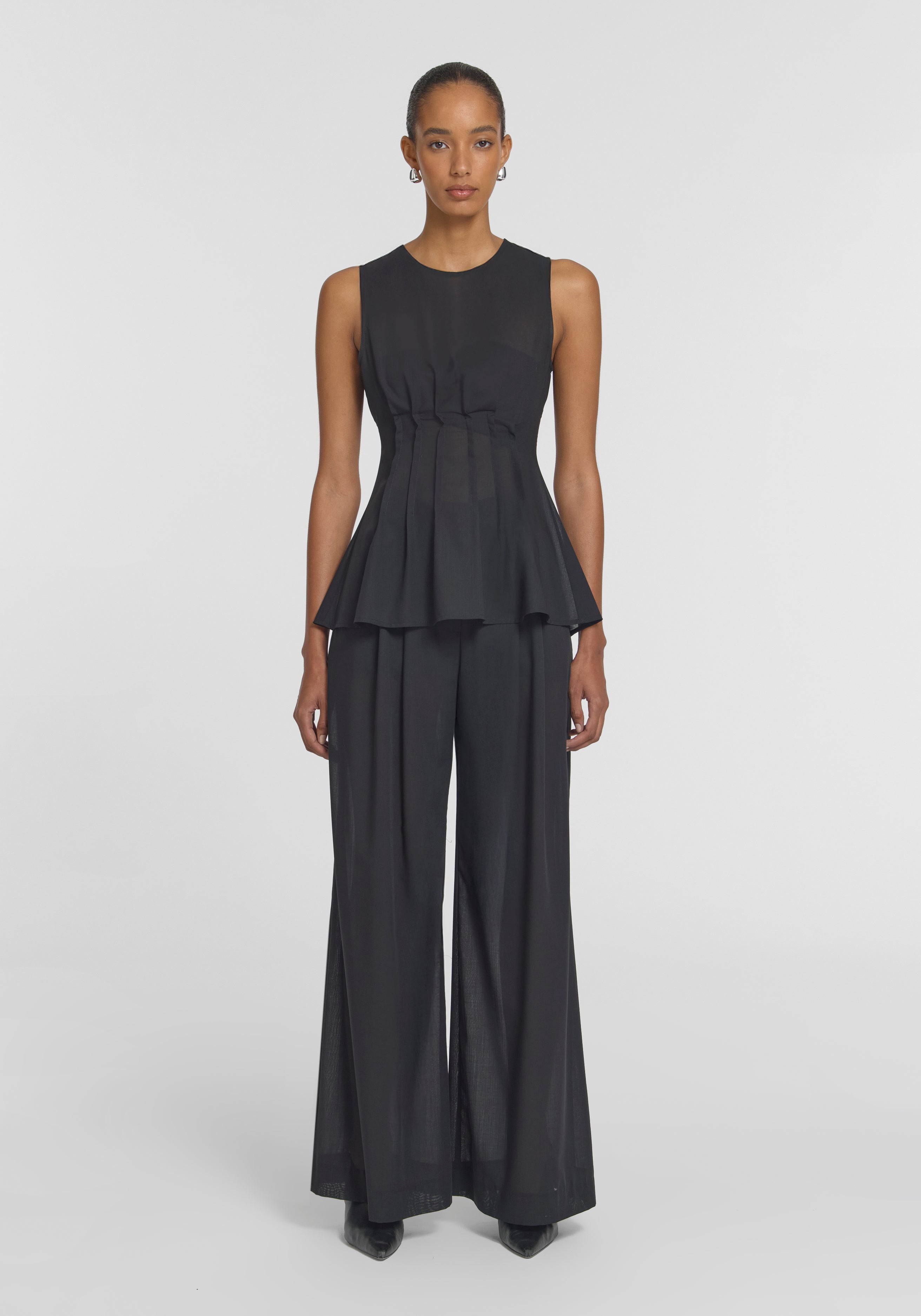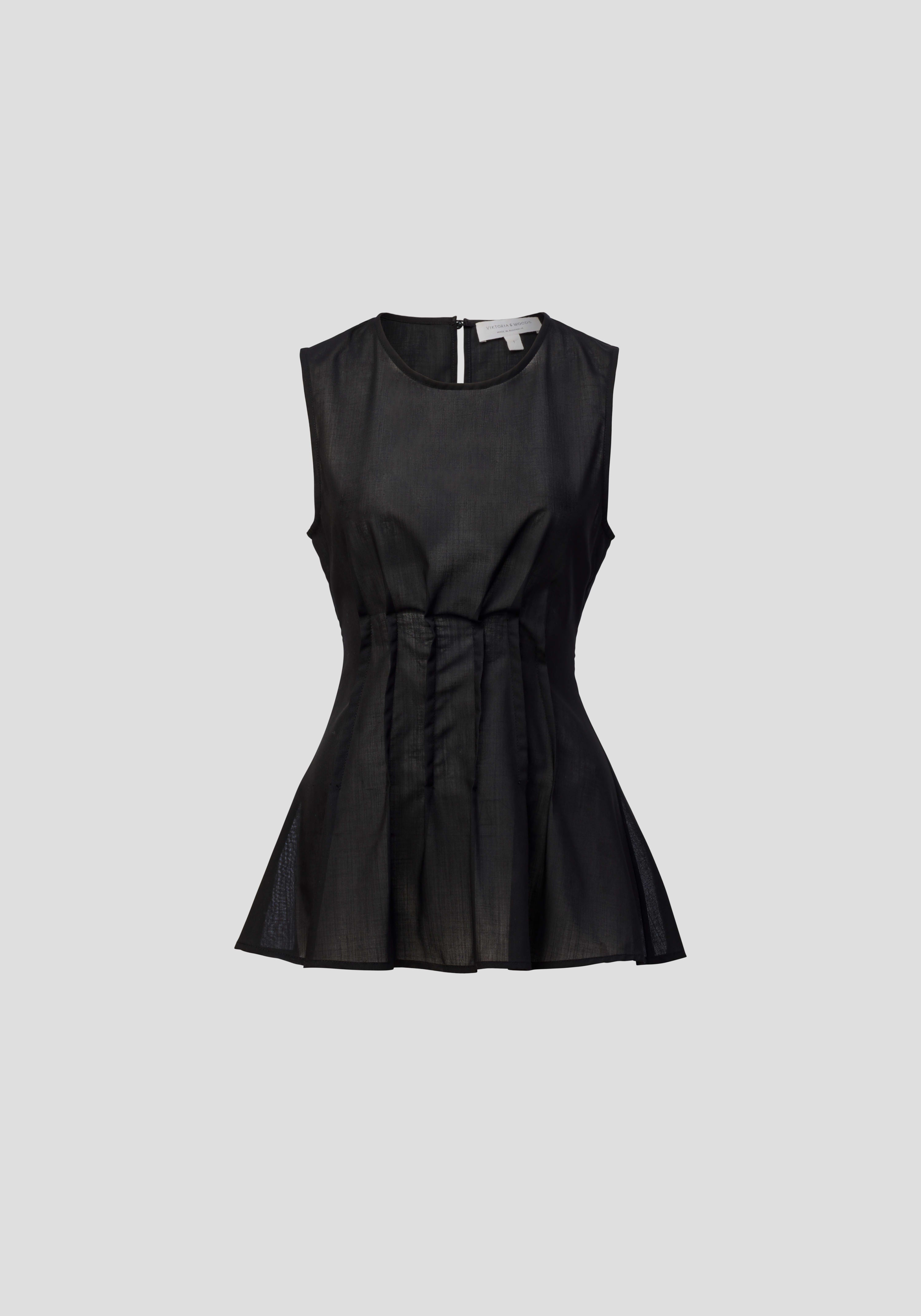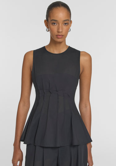 Carry the light of summer into the professional setting with the Laureate Top, crafted in a lightweight black wool blend. Featuring a scooped neckline with pin-tuck detailing that shapes the waist into a subtle peplum, it layers effortlessly as temperatures shift. Pair with the Singleton Pant for clean, minimalist outfitting that's instinctual.