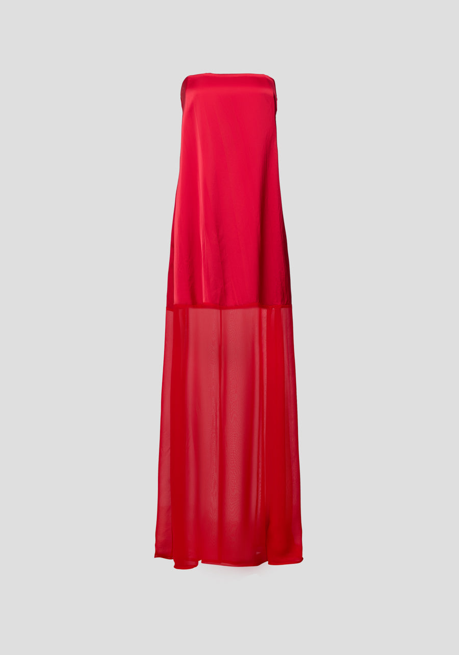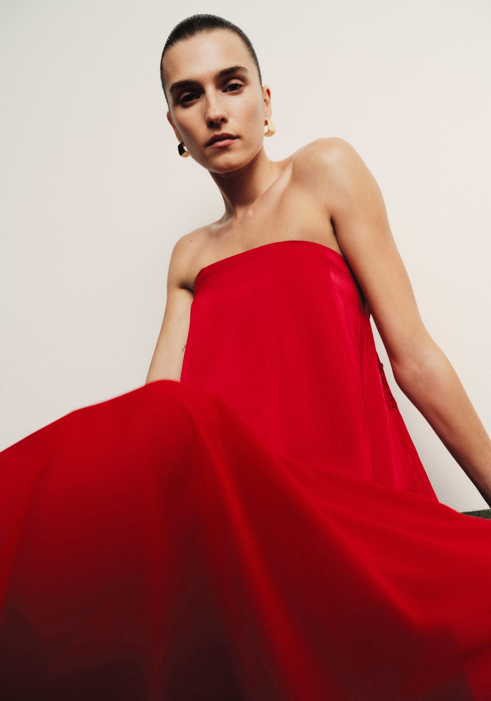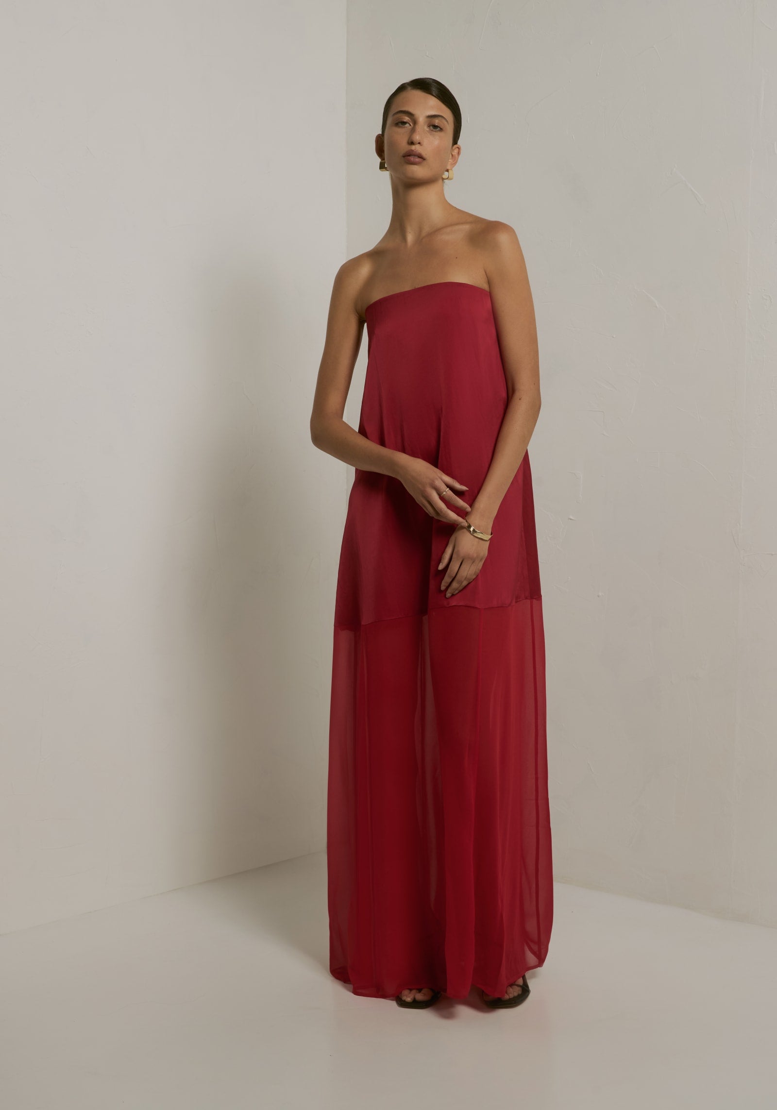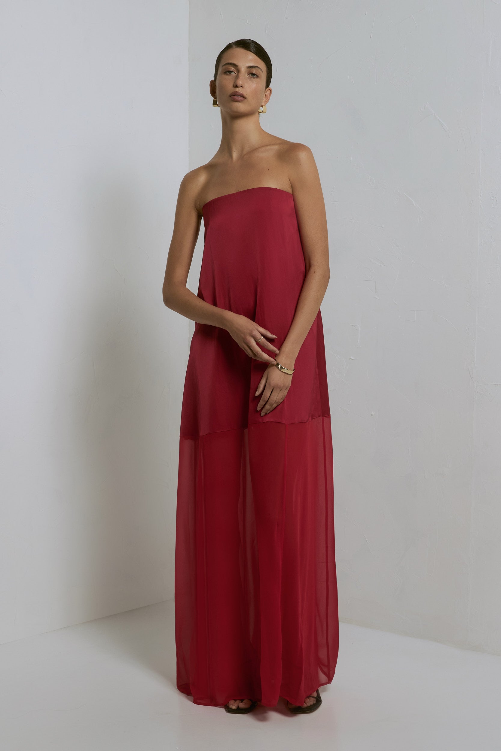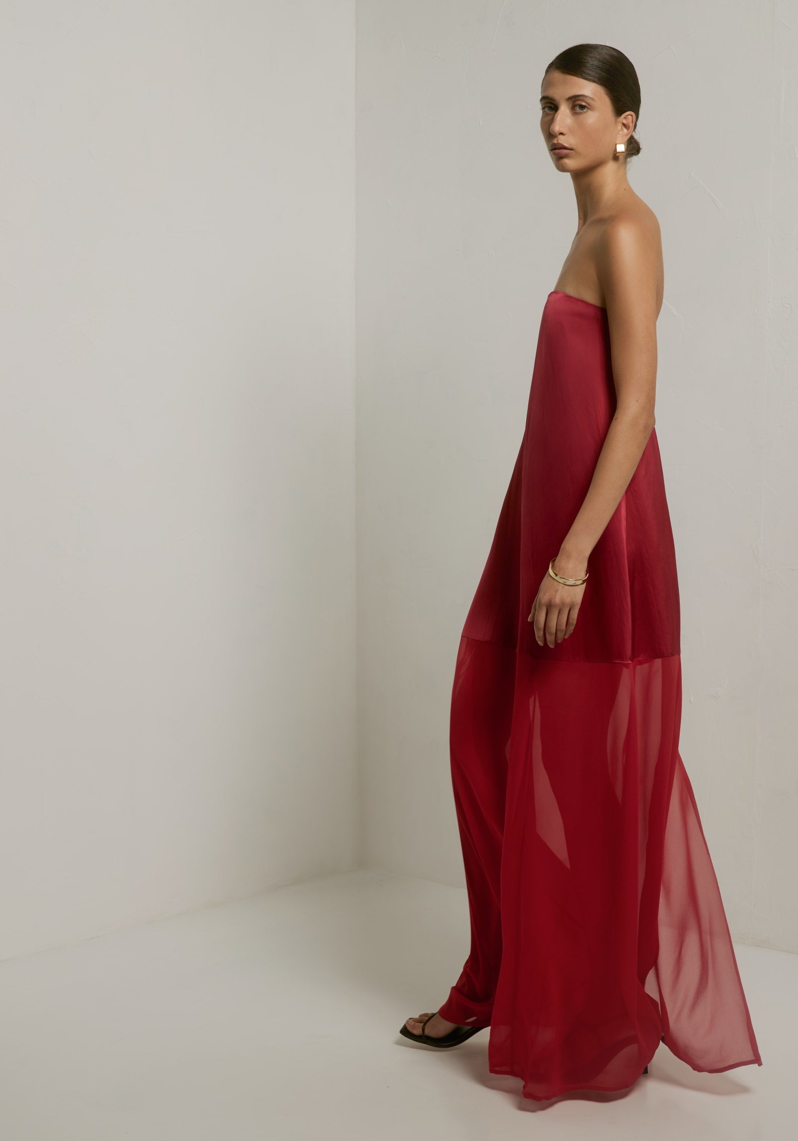 Exude effortless confidence in the Loveday Dress, a statement for elevated occasions. Crafted in our signature cupro blend spliced with lightweight silk georgette, the fiery red hue flows with ease. Featuring a structured internal powermesh bustier with boning, it drapes into a soft A-line silhouette with fullness through the sheer skirt and a subtle back split. Style with the Cleo Headscarf for a complete look at your next event.