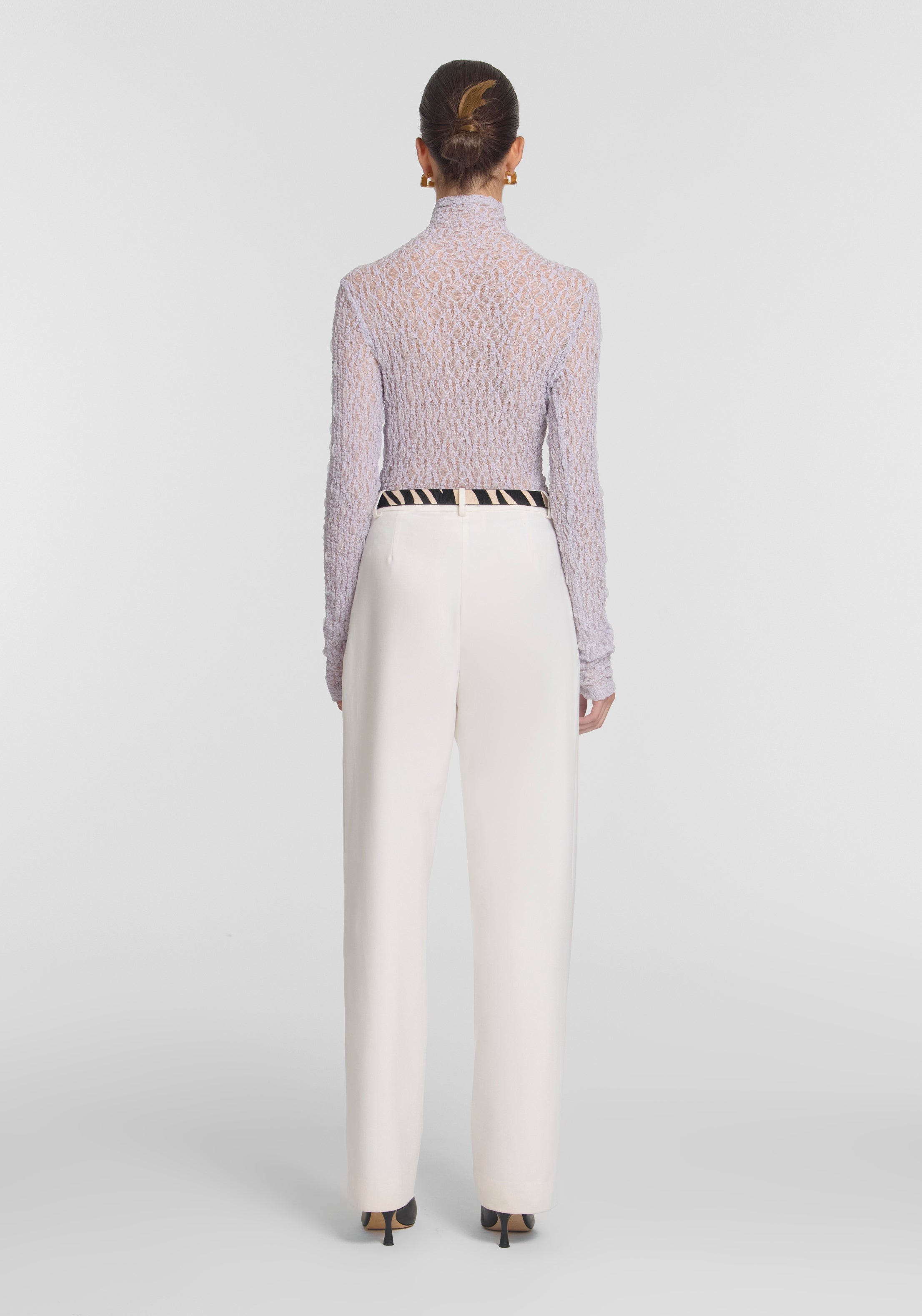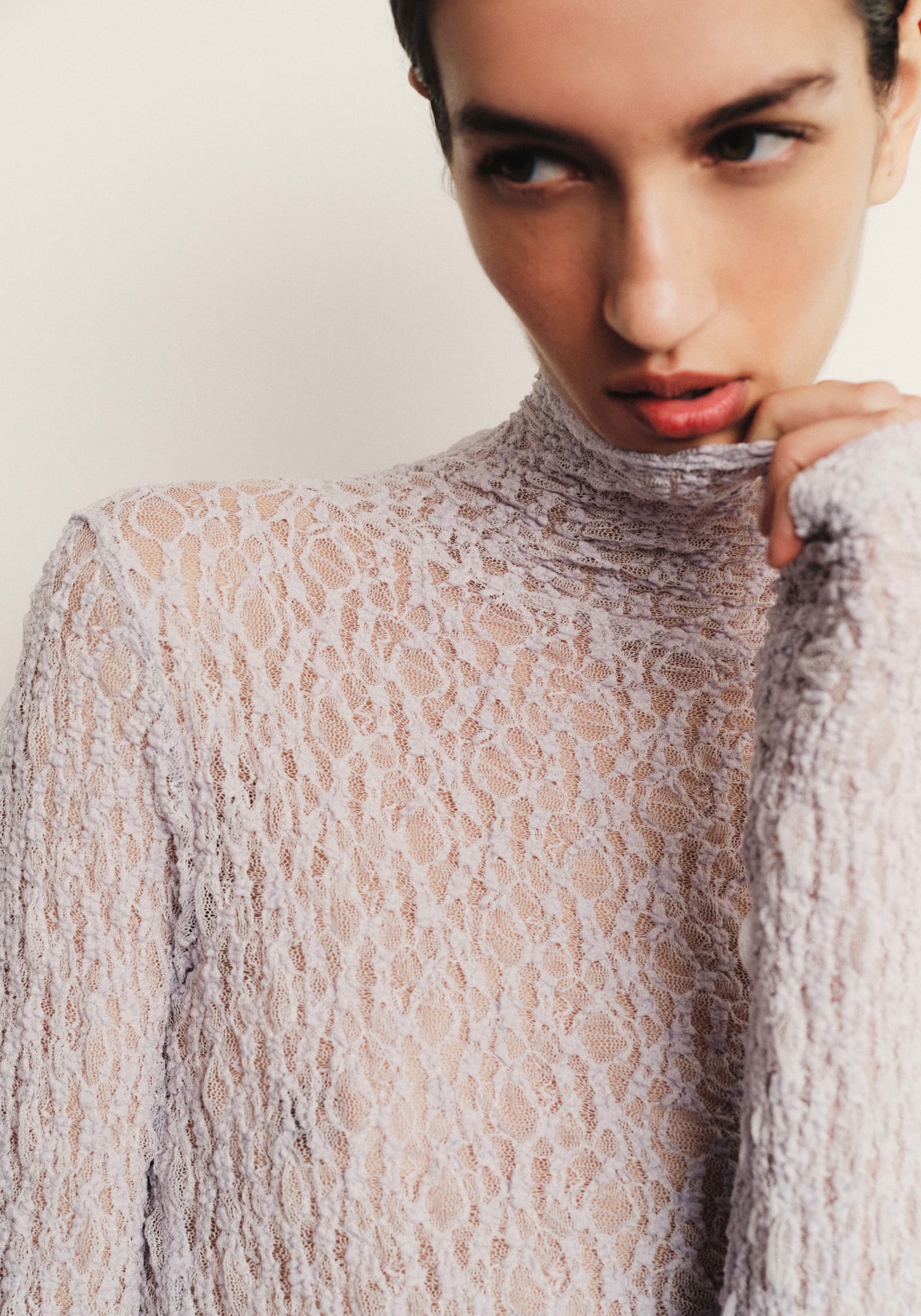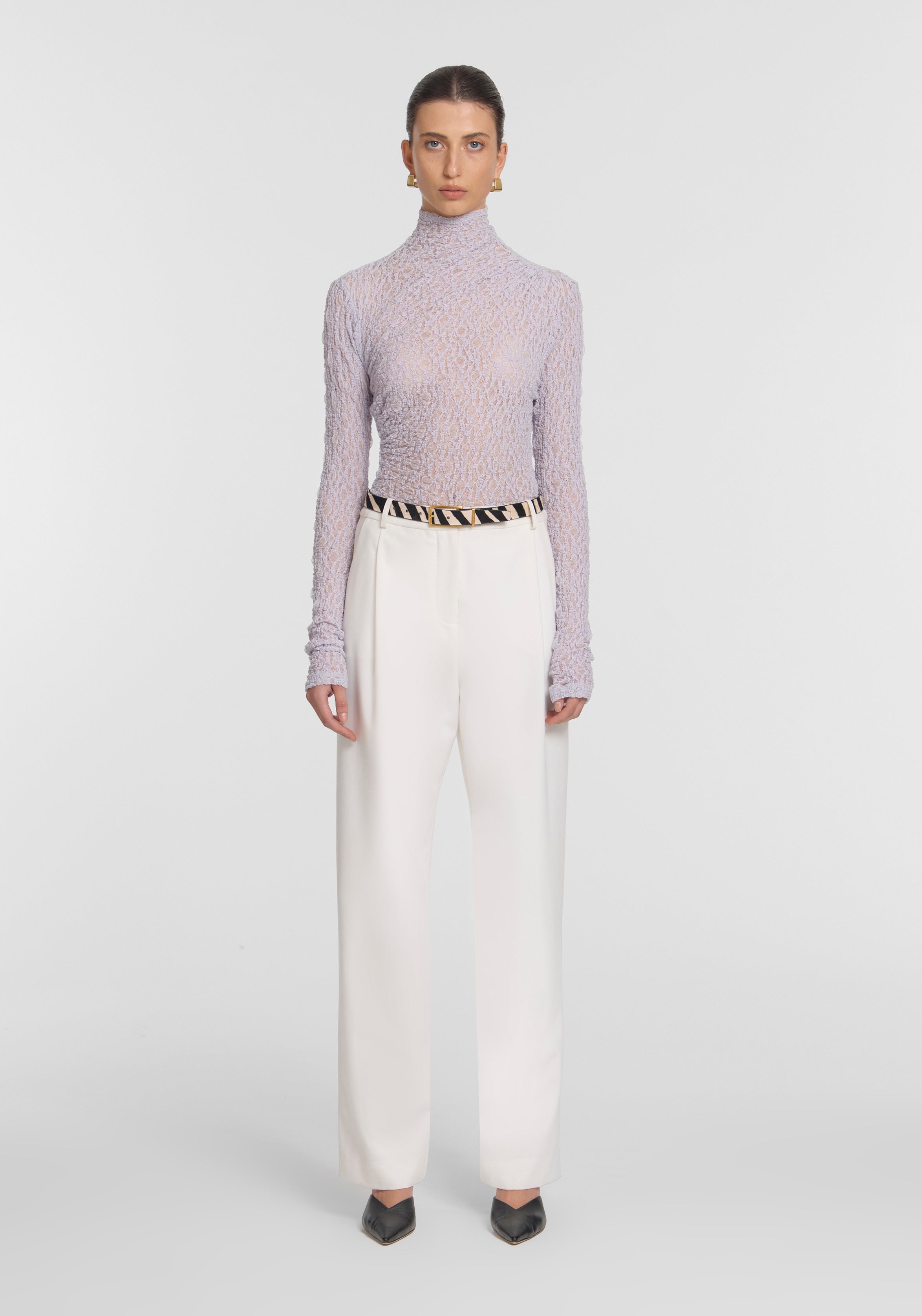 The Luna Skivvy reimagines our best selling Moonlight Skivvy, crafted from a soft stretch fabric with a modern lace finish in a muted lilac hue. Showcasing an exaggerated turtleneck, fitted silhouette, and asymmetrical ruching. Pair effortlessly with denim or layer under the Concert Shirt in the matching hue for a chic, dimensional look.