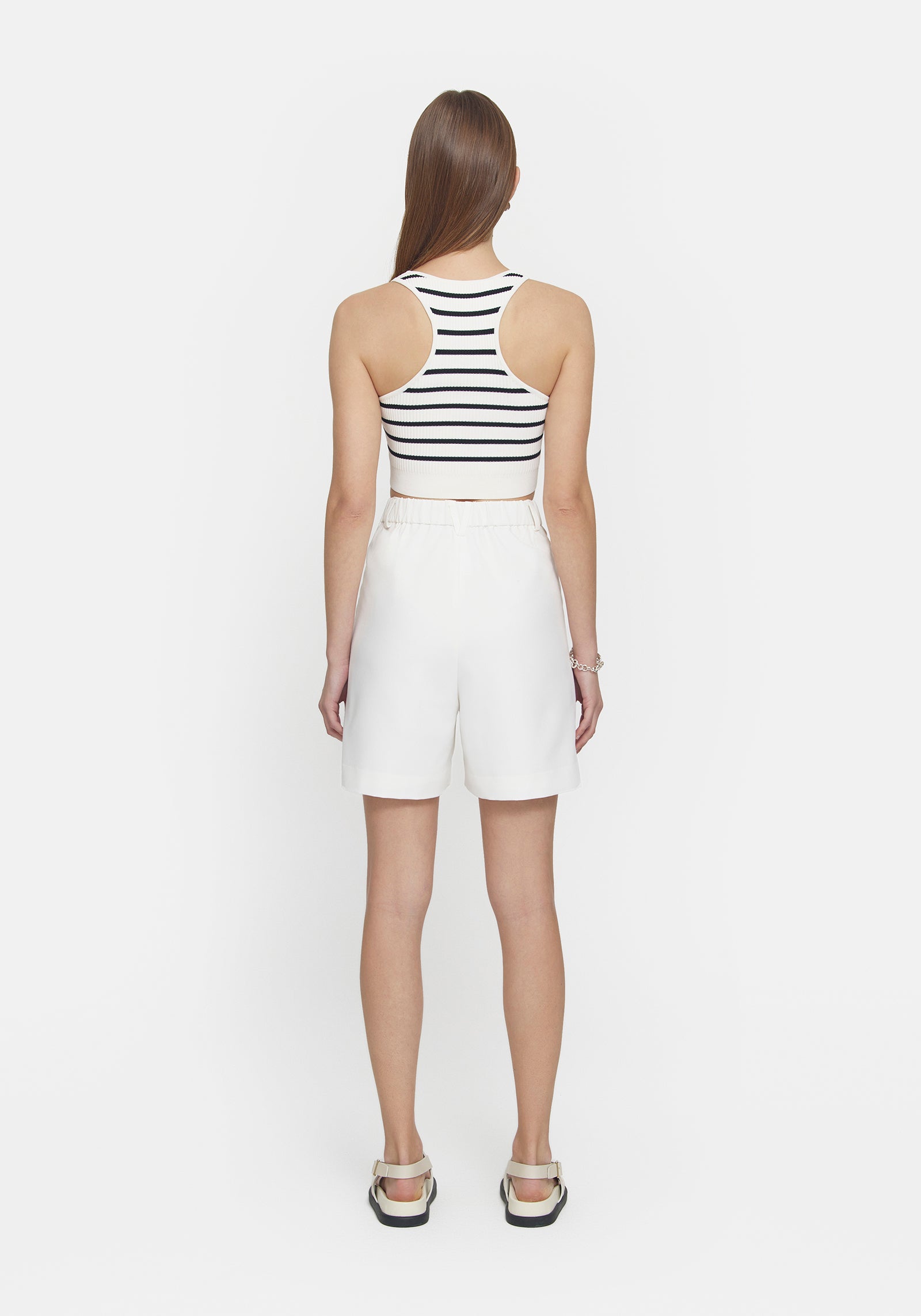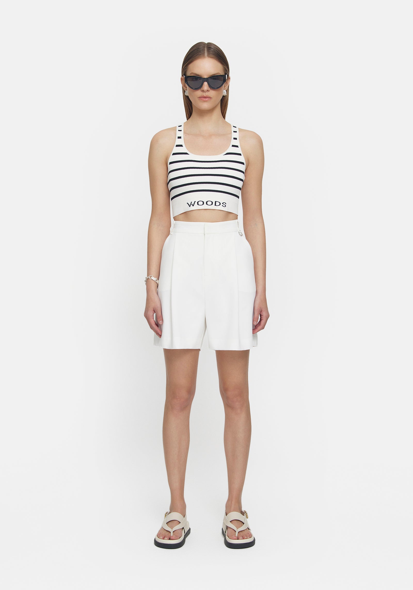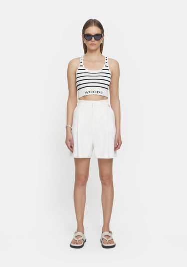 Explore the Lyra Crop, a fresh silhouette blending style and ease. Featuring a black contrast stripe, WOODS jacquard logo, and tubular knit finish, this knitted crop adds refined flair. Elevate your summer style by pairing the Lyra Crop with V&W denim or the Unisex Granger Short in Ivory, introducing versatility to your wardrobe, a modern essential for any occasion.
