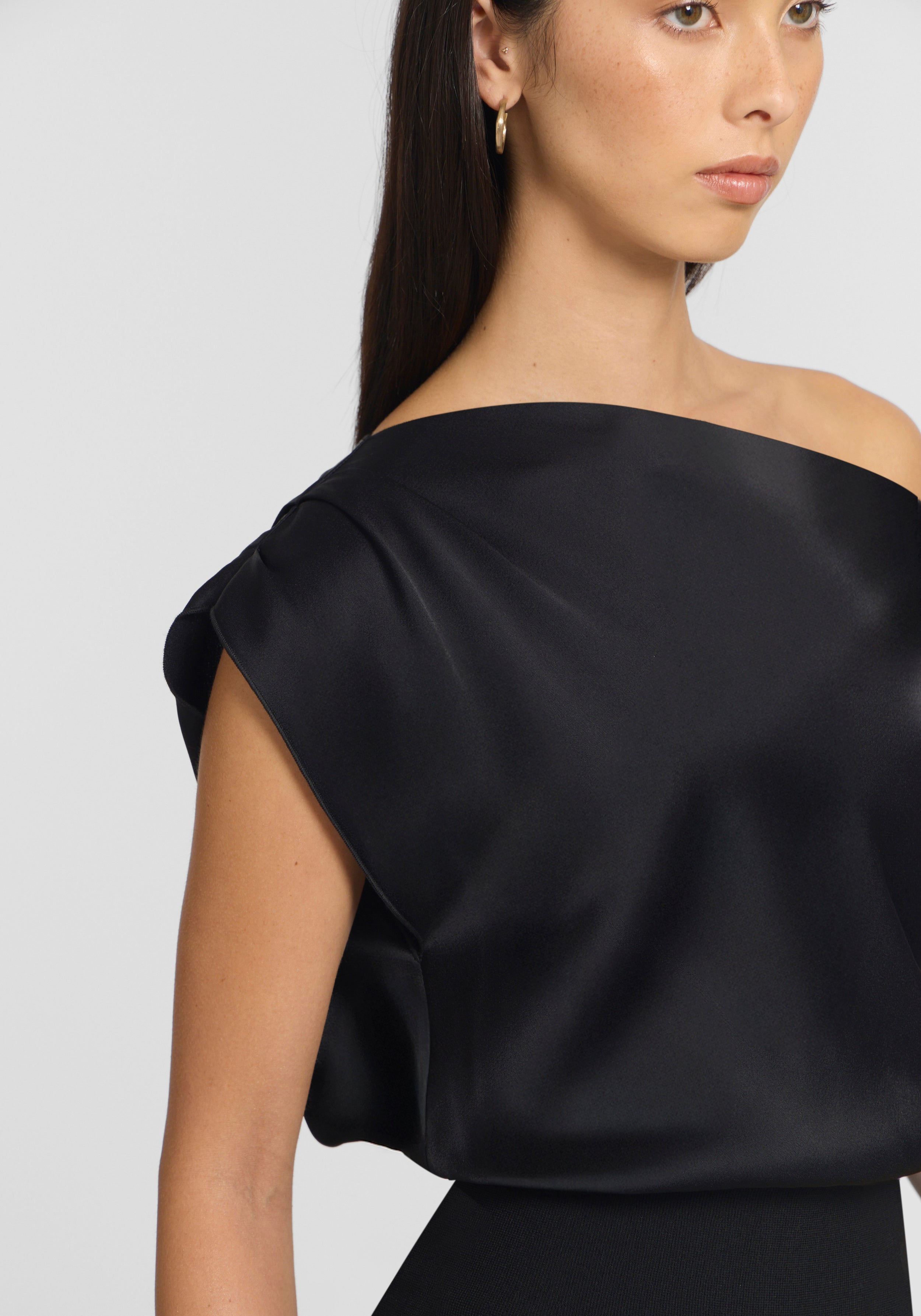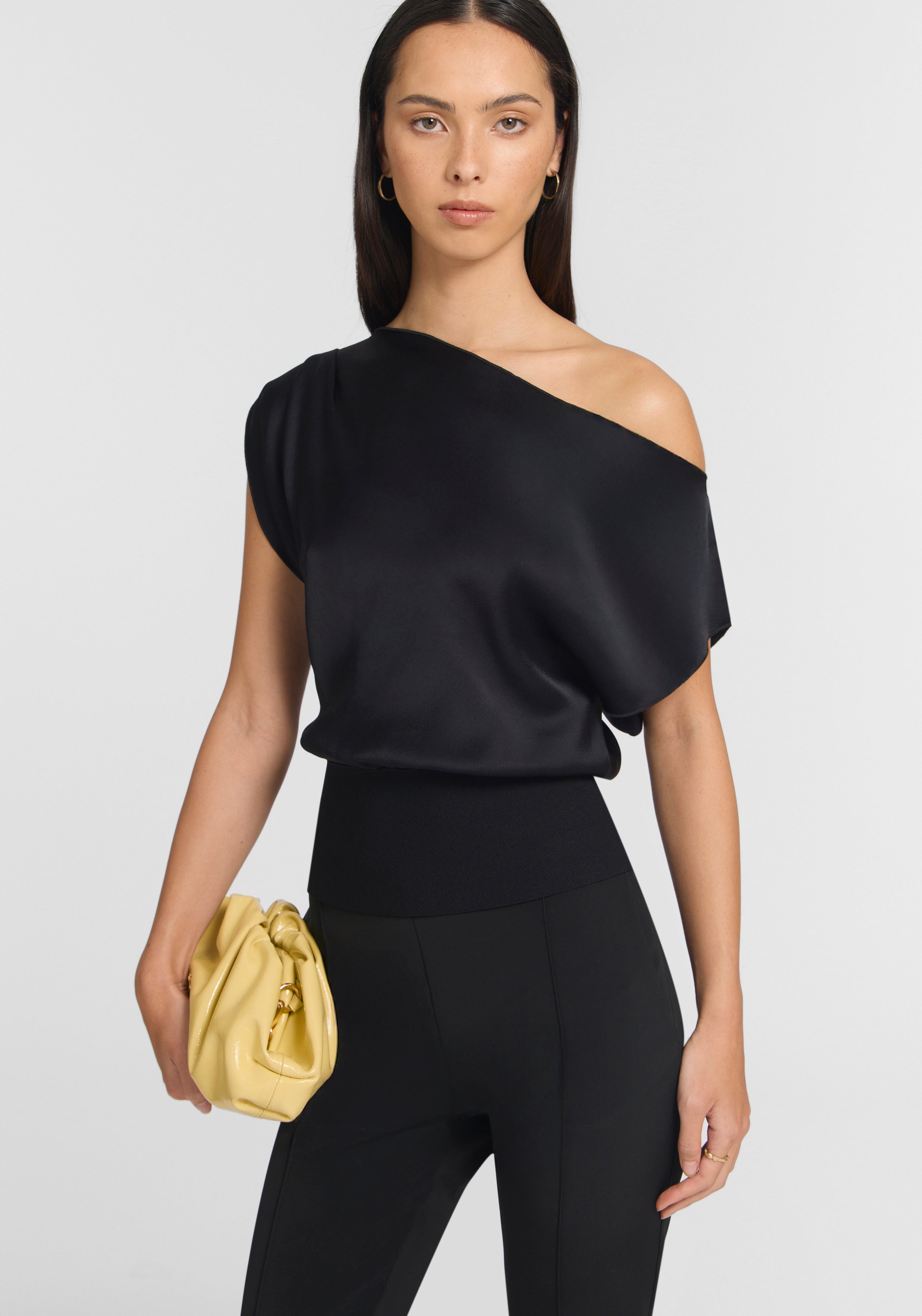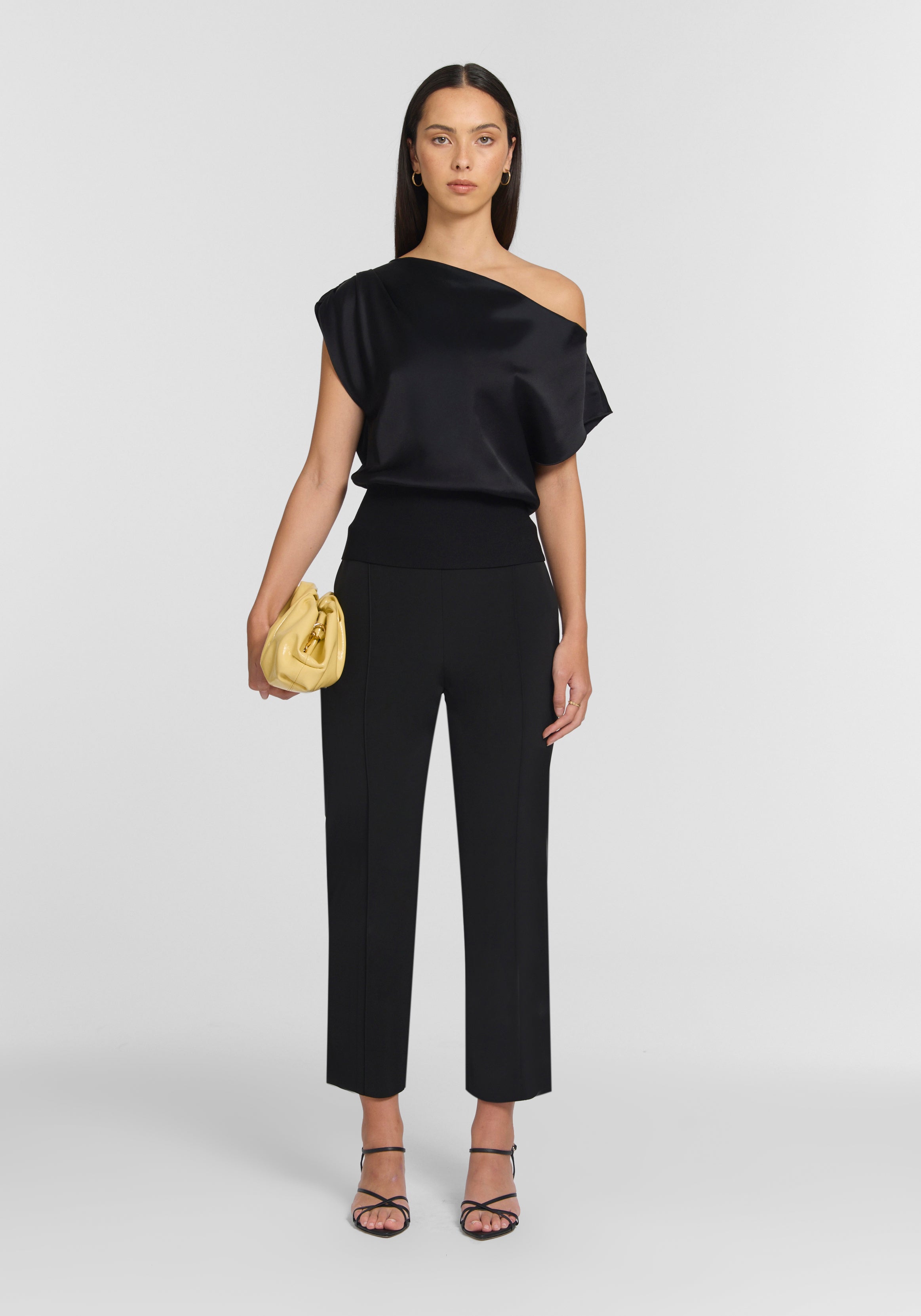 Embrace effortless femininity with the Mabel Top, crafted in classic black. Designed with a soft boatneck neckline, extended shoulders, and subtle tucks for natural drape, it’s finished with a knitted hem panel for a softly sculpted silhouette. Pair with the Javier Skirt for a complete look, perfect for the eventing season.