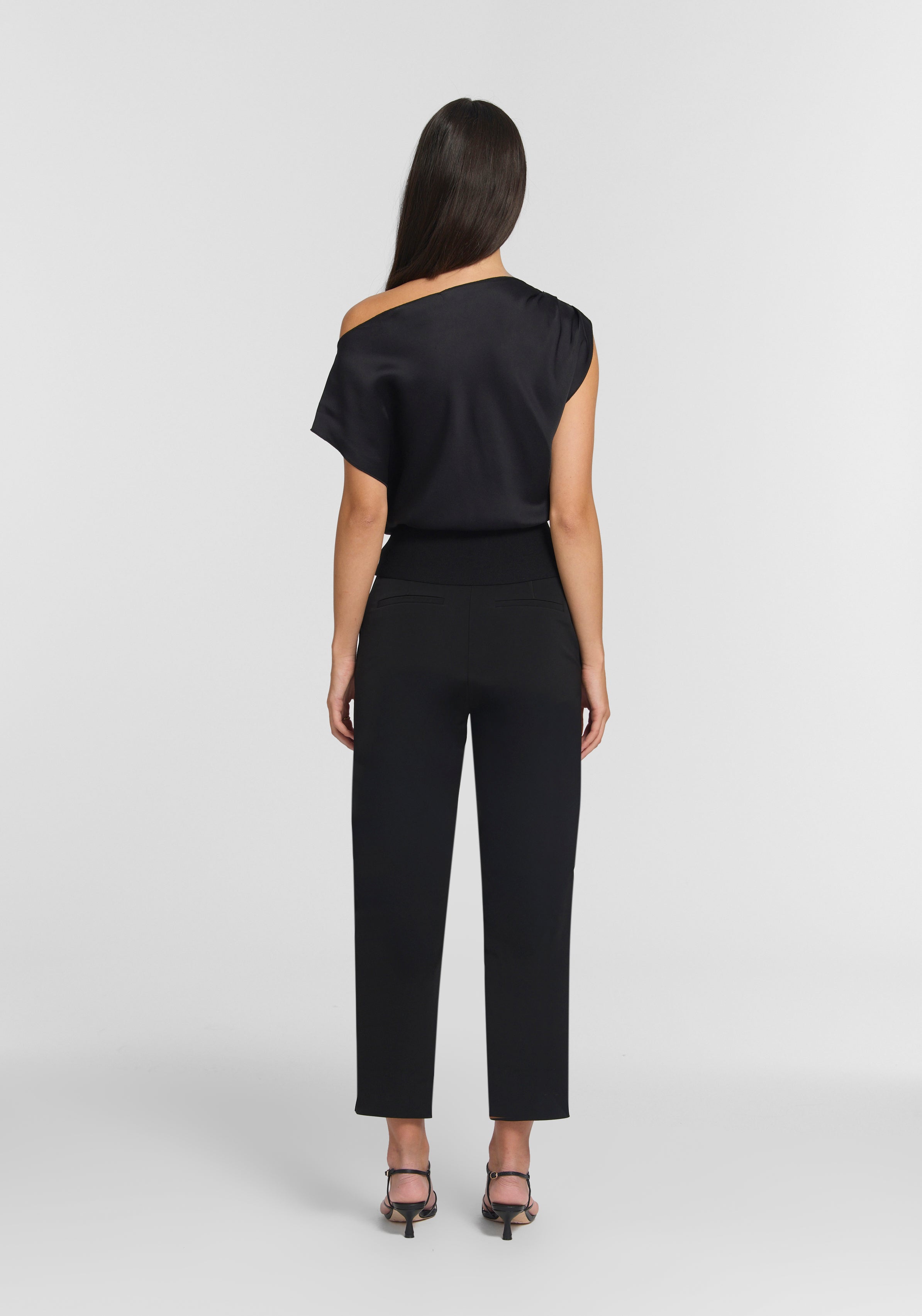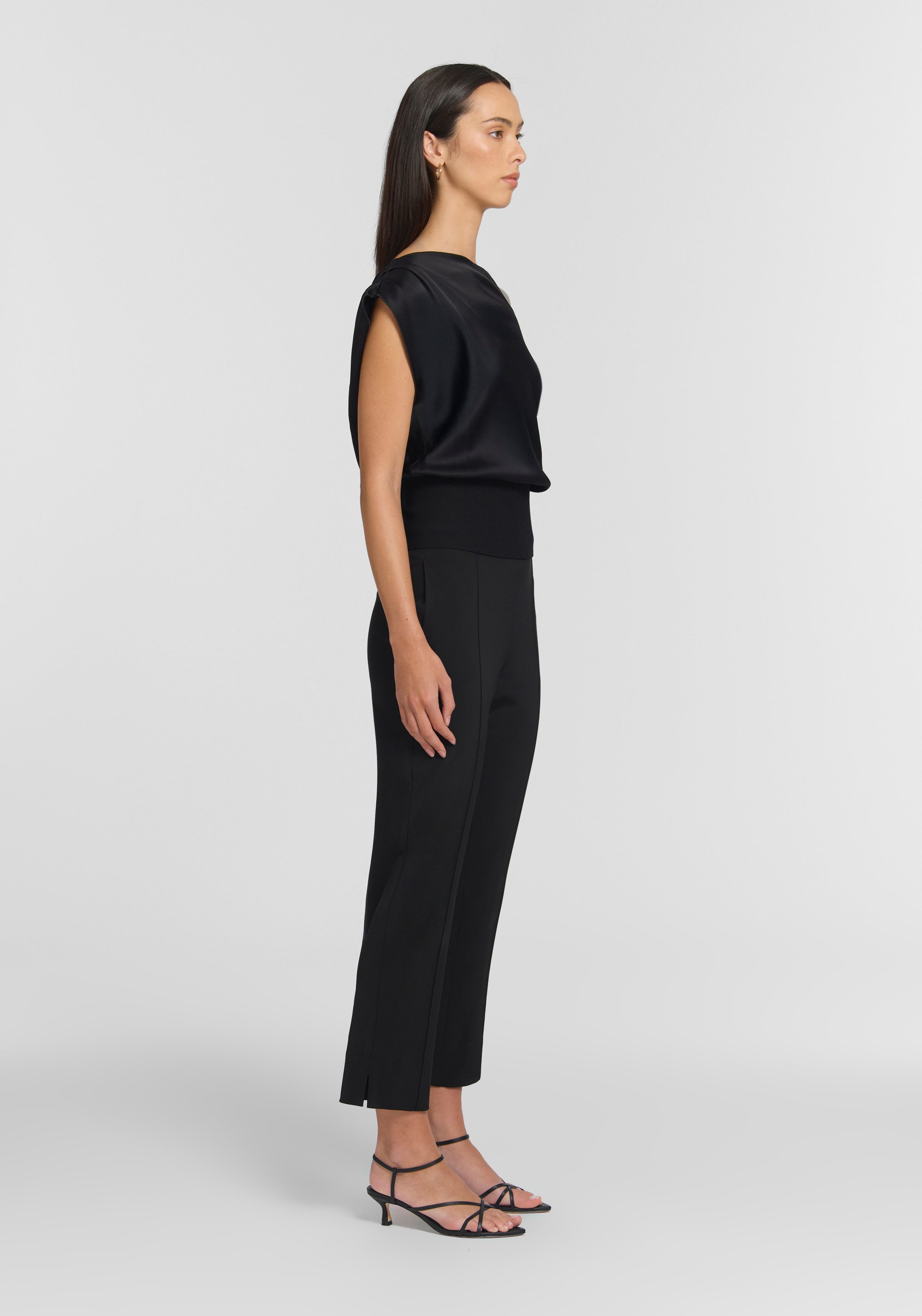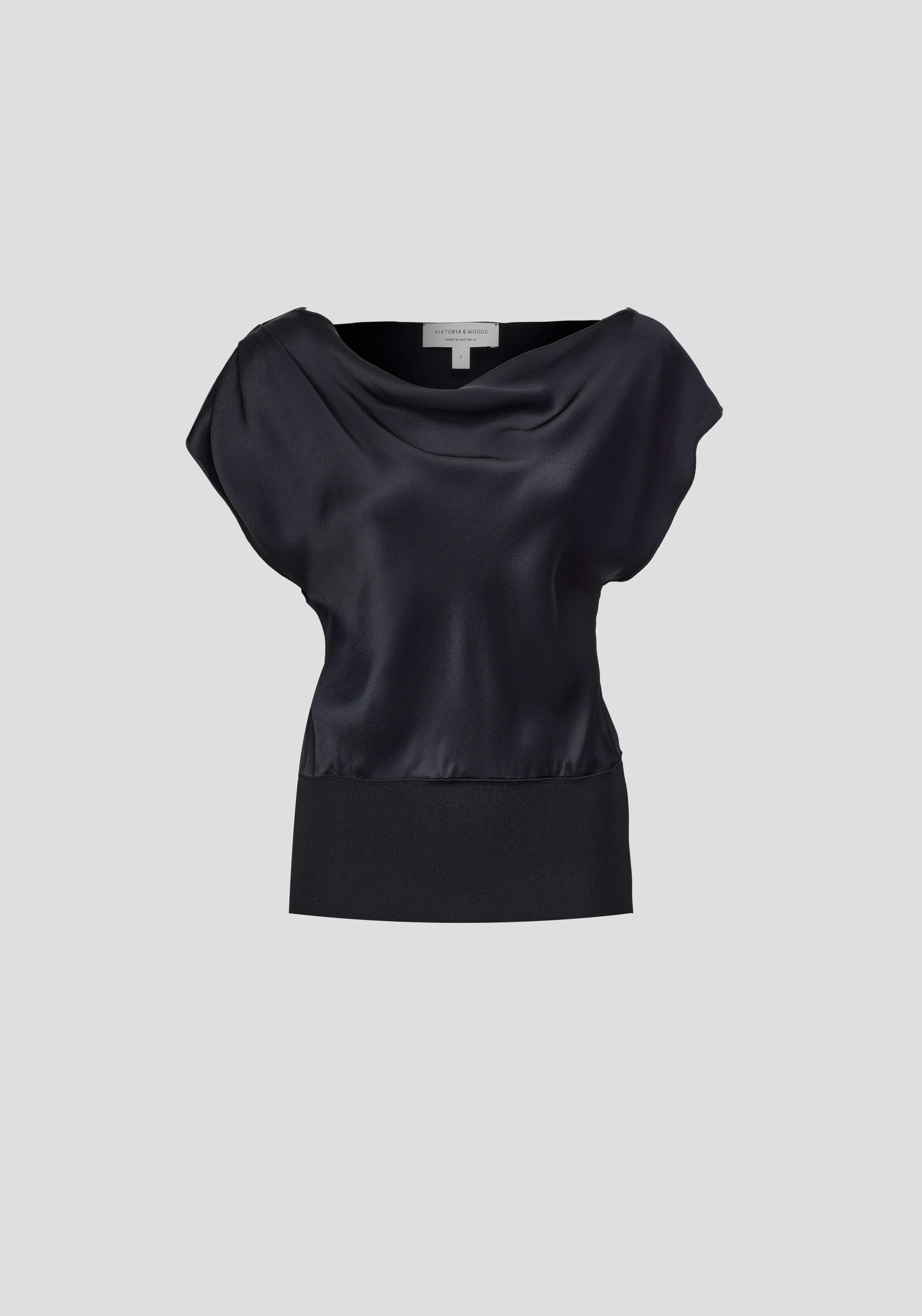 Embrace effortless femininity with the Mabel Top, crafted in classic black. Designed with a soft boatneck neckline, extended shoulders, and subtle tucks for natural drape, it’s finished with a knitted hem panel for a softly sculpted silhouette. Pair with the Javier Skirt for a complete look, perfect for the eventing season.