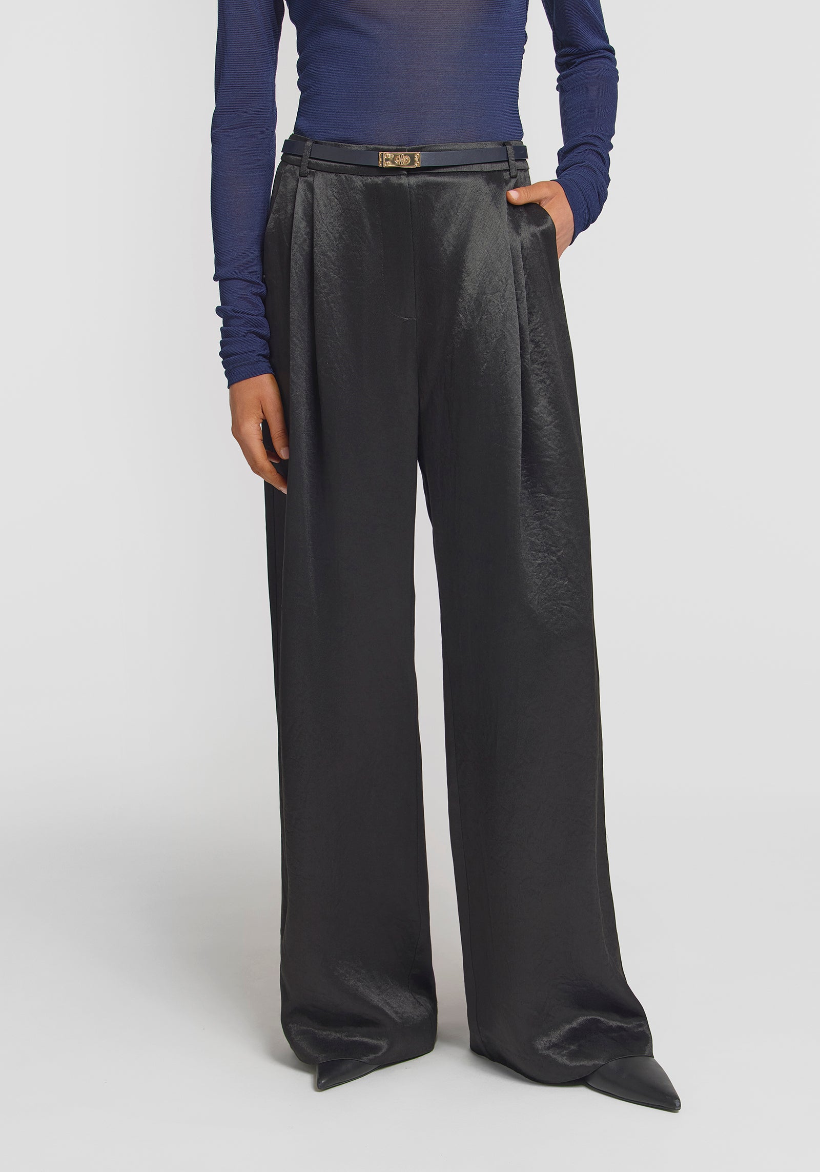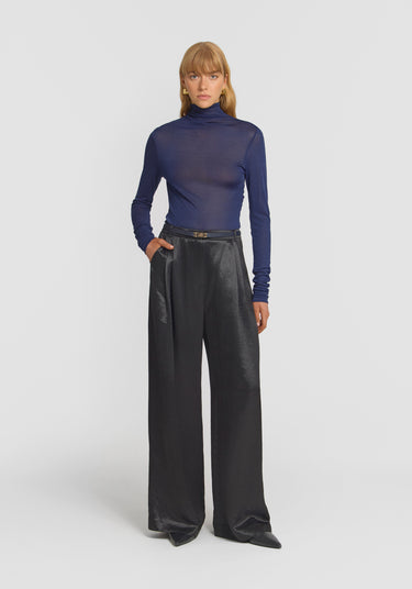 The Malone Pant reimagines the refined essence of our iconic Pilot Pants, tailored in classic black naia acetate with a vintage-inspired patina, offering a subtle crinkle effect. Featuring a palazzo silhouette, double pleats, and a traditional waistband with belt loops, this pant effortlessly fuses sophistication with comfort. Complete the look with the Hampshire Shirt for a signature set dressing moment, or pair with your everyday essentials for versatile styling.