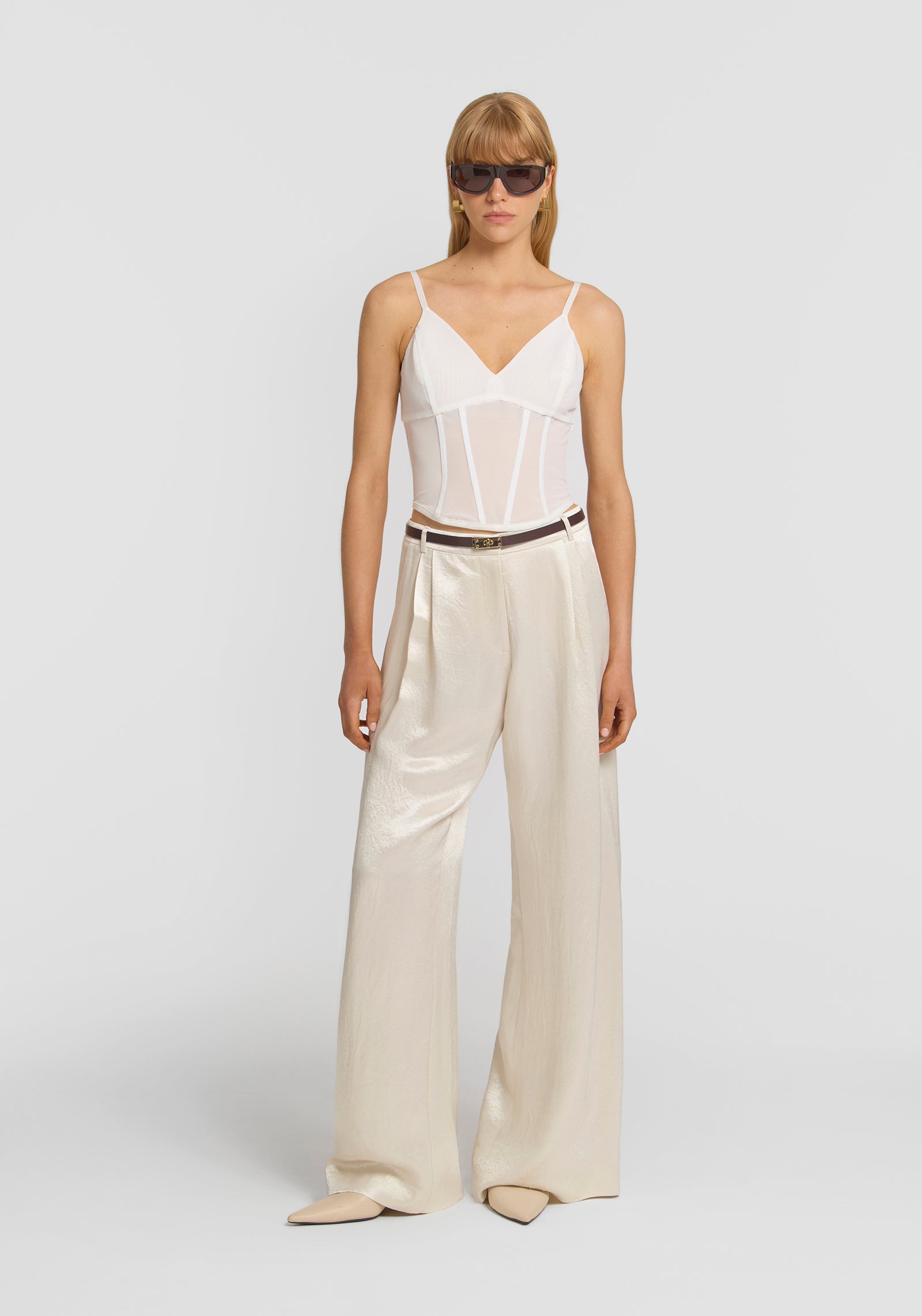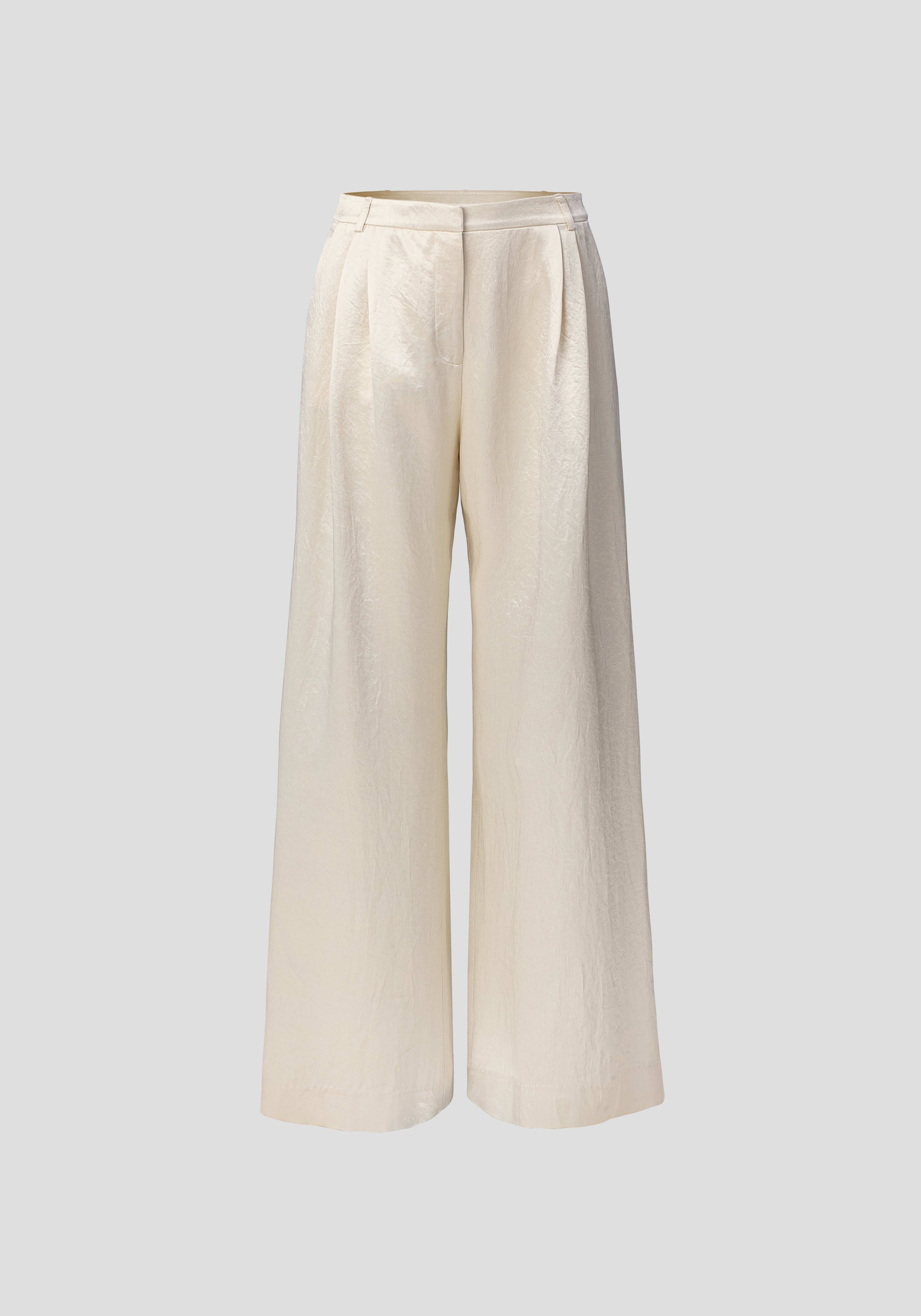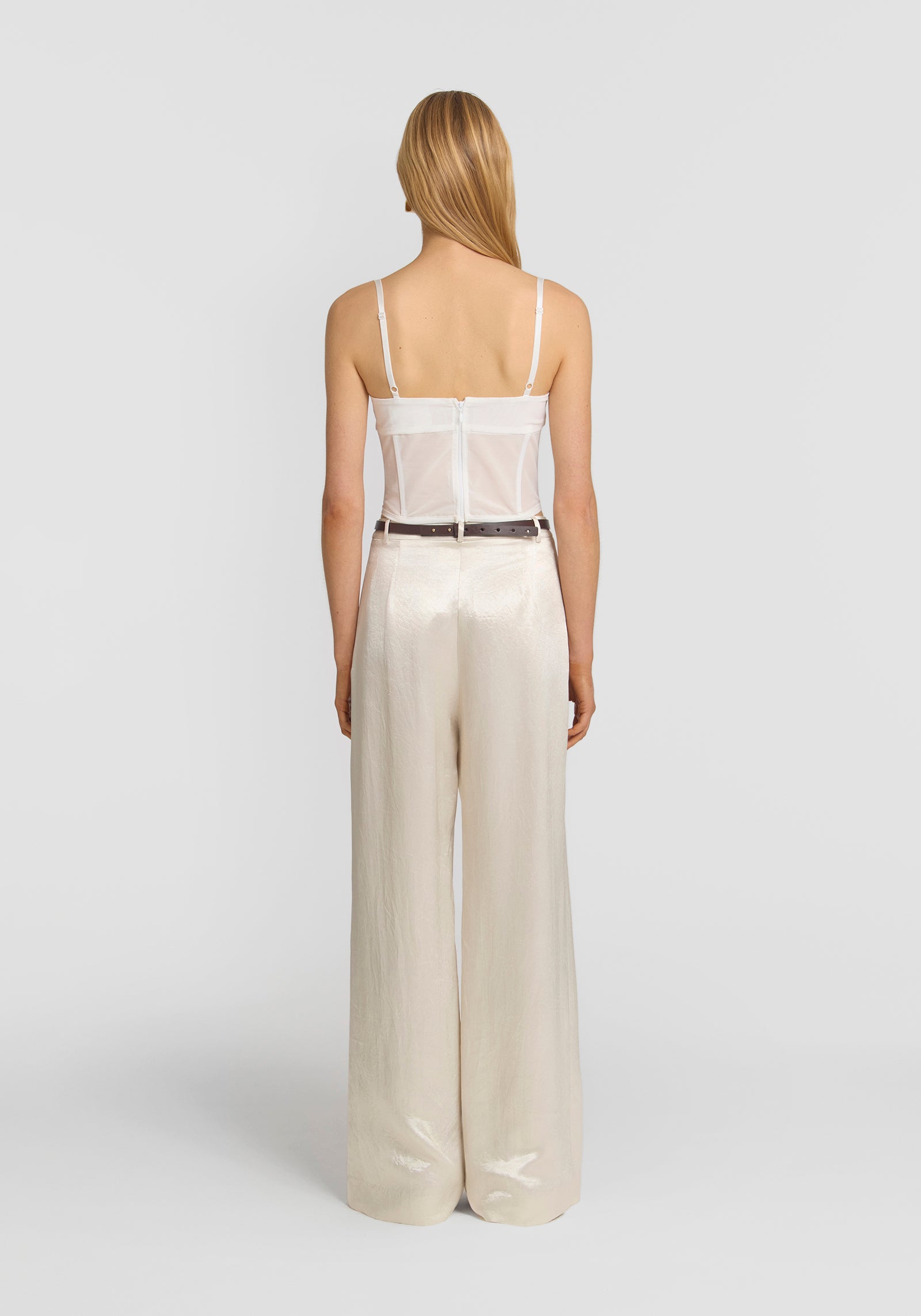 The Malone Pant reimagines the refined essence of our iconic Pilot Pants, tailored in a versatile champagne naia acetate with a vintage-inspired patina, offering a subtle crinkle effect. Featuring a palazzo silhouette, double pleats, and a traditional waistband with belt loops, this pant effortlessly fuses sophistication with comfort. Complete the look with the Hampshire Shirt for a signature set dressing moment, or pair with your everyday essentials for versatile styling.