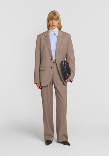 Add dimension to your outfitting with the Marmaduke Unisex Blazer, crafted from a wool blend in a timeless brown pinstripe. Featuring a single breasted, relaxed silhouette, it’s detailed with pocket accents, a centre back vent, and V&W logo buttons. Fusing masculine and feminine elements, it pairs back with the Archibold Unisex Trouser for an effortlessly considered suiting moment.