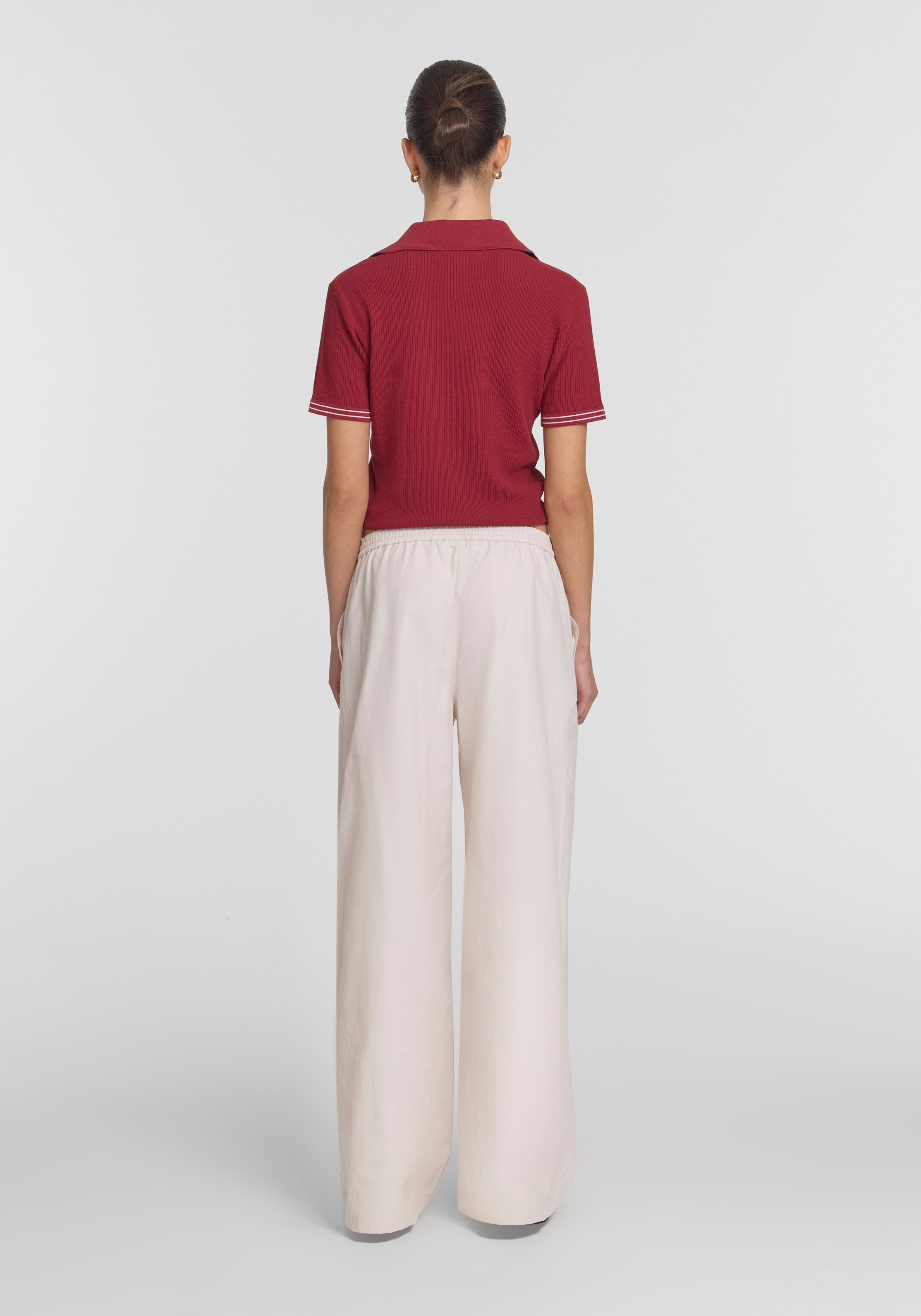 Exuding effortless ease, the Masquerade Polo is crafted from a luxurious cotton-silk blend in deep red. With contrast detailing and WOODS embroidery, this slim-fit polo offers a refined take on a preppy aesthetic. Pair with neutral tailoring for a sophisticated contrast or with the Showtime Skirt for a sporty matching set.