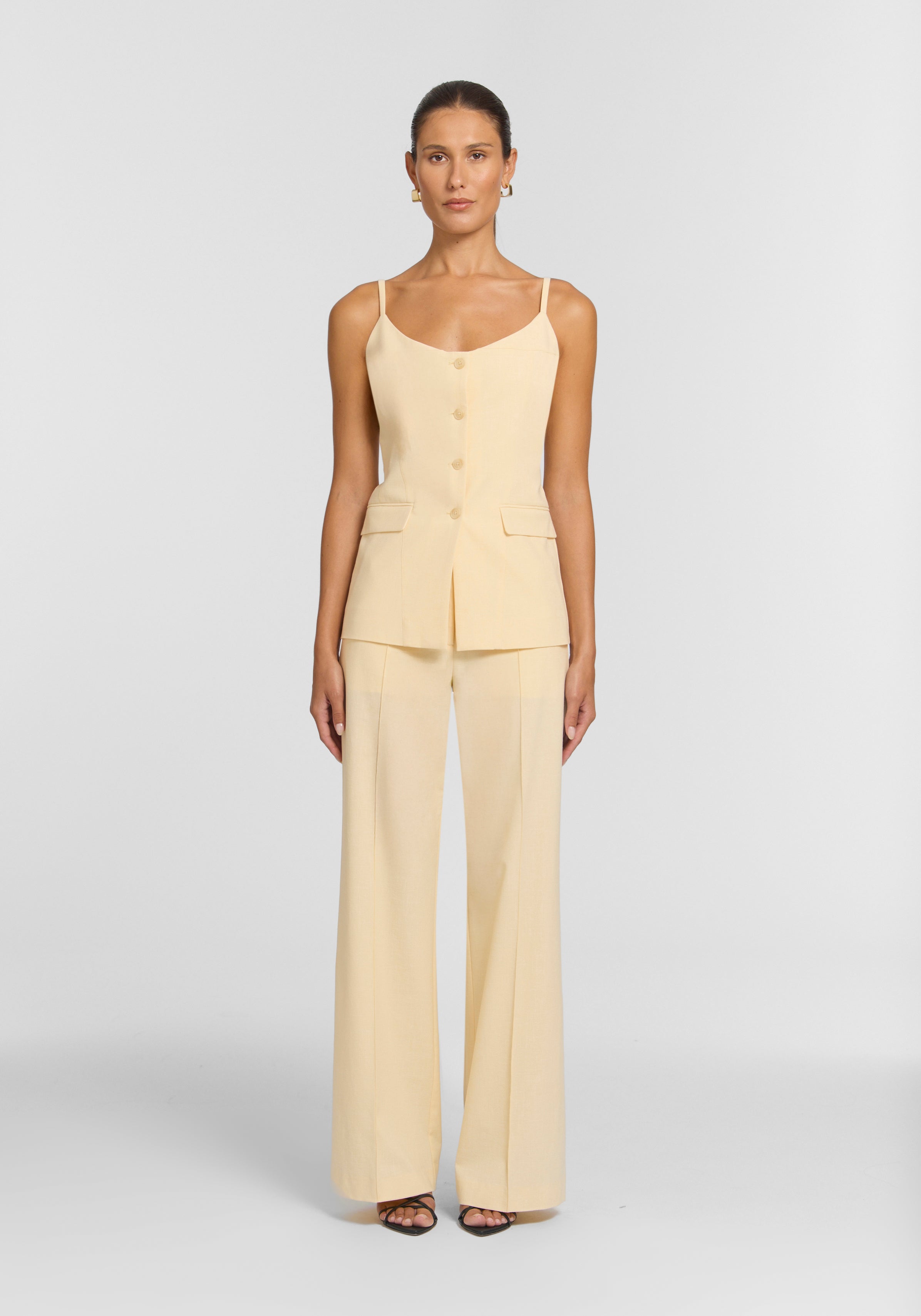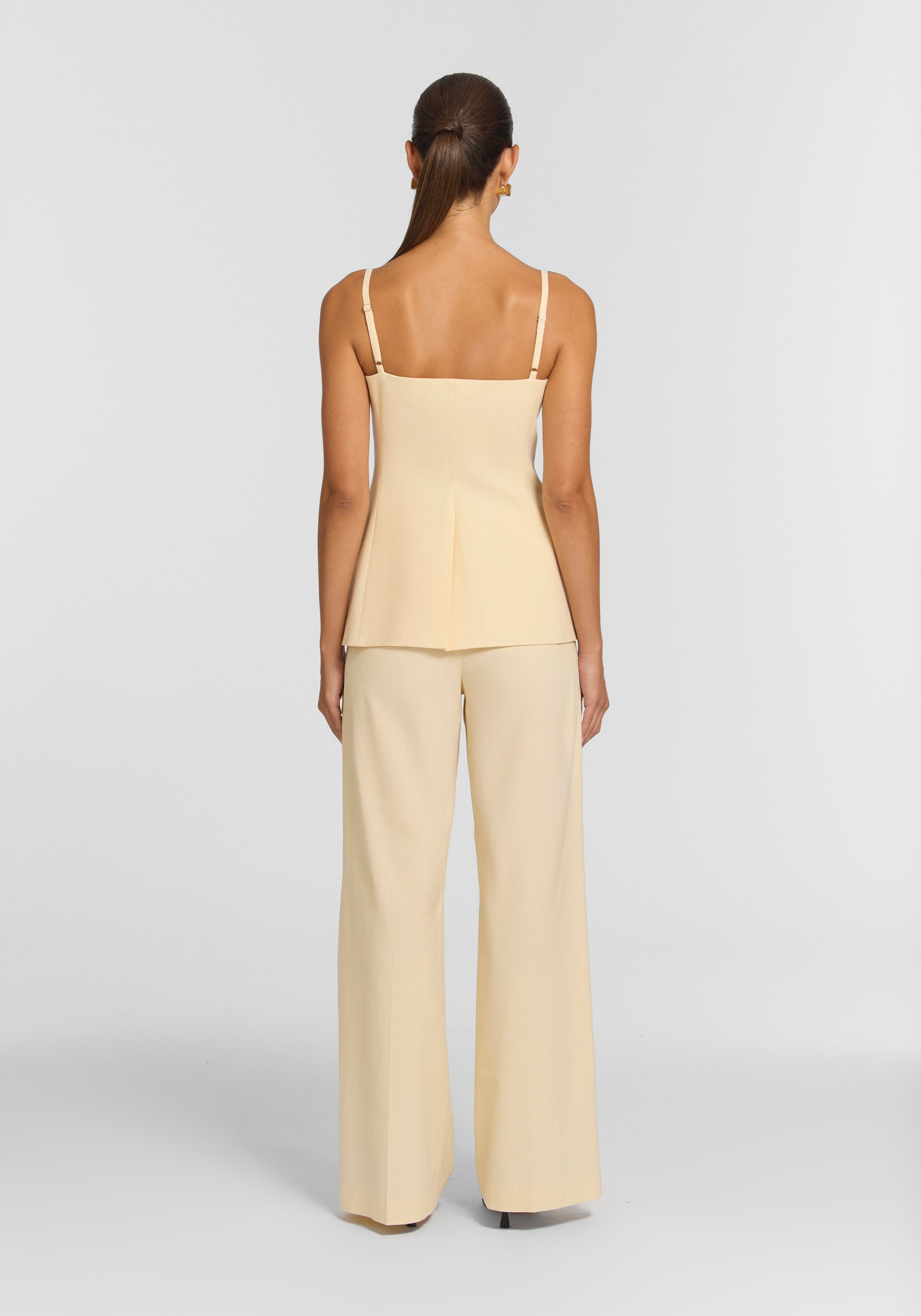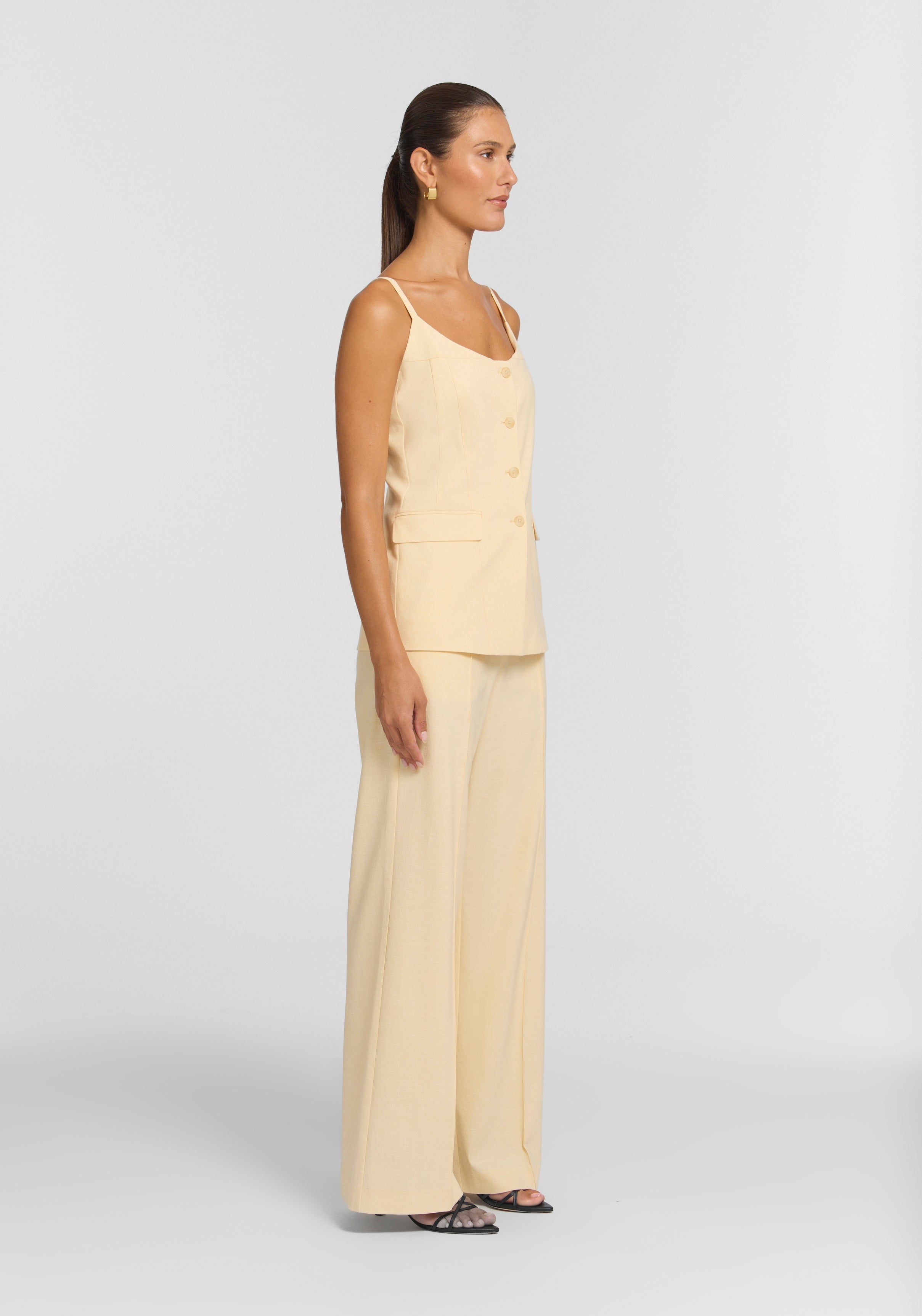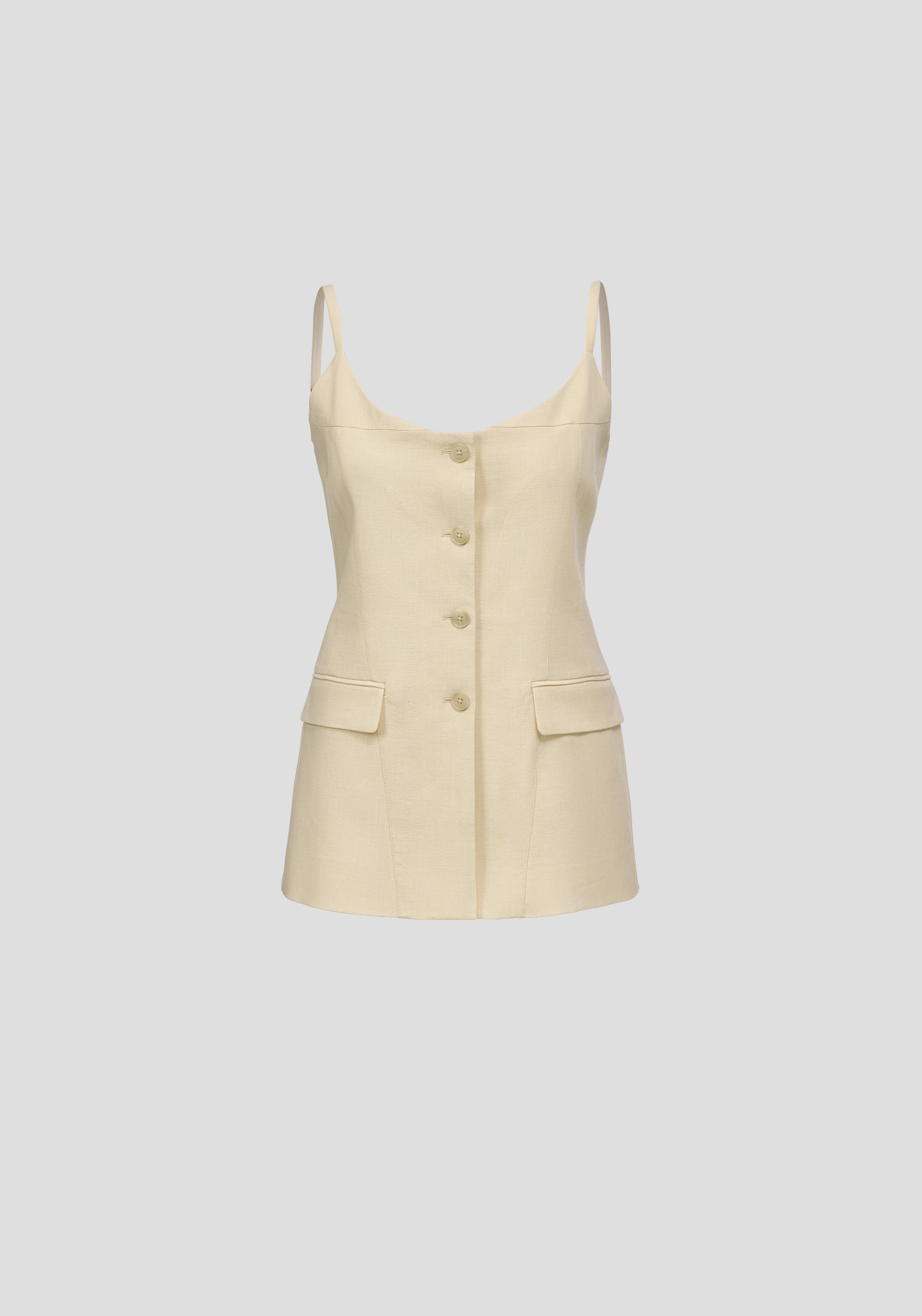 The Megawatt Top, precisely tailored in a confident sunflower-hued linen blend. Featuring a sharp, tapered silhouette, scooped neckline, and jetted pockets, it’s finished with adjustable straps and a centre back vent. Pair with the Barker Trouser or style with denim for versatile, elevated ease.