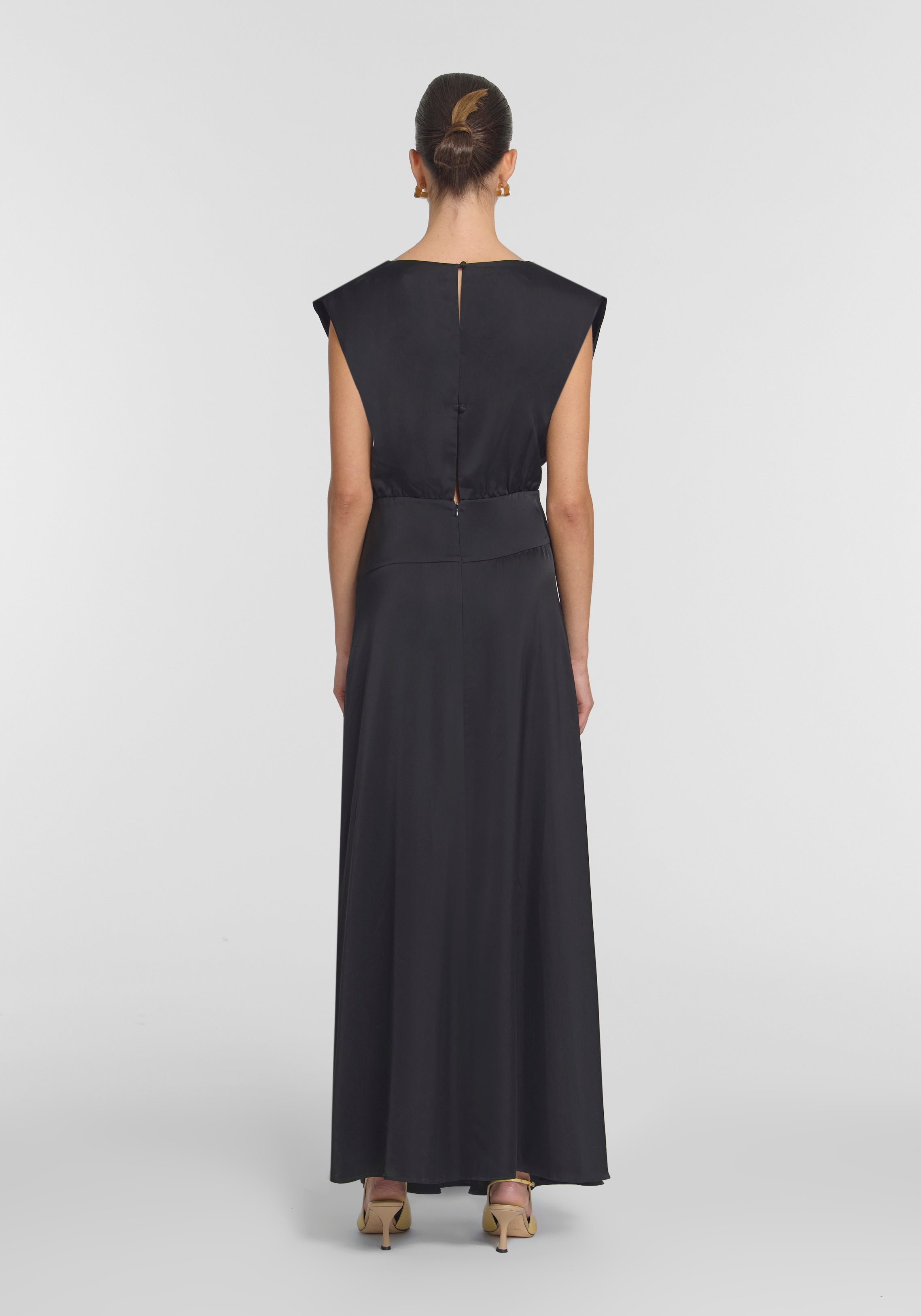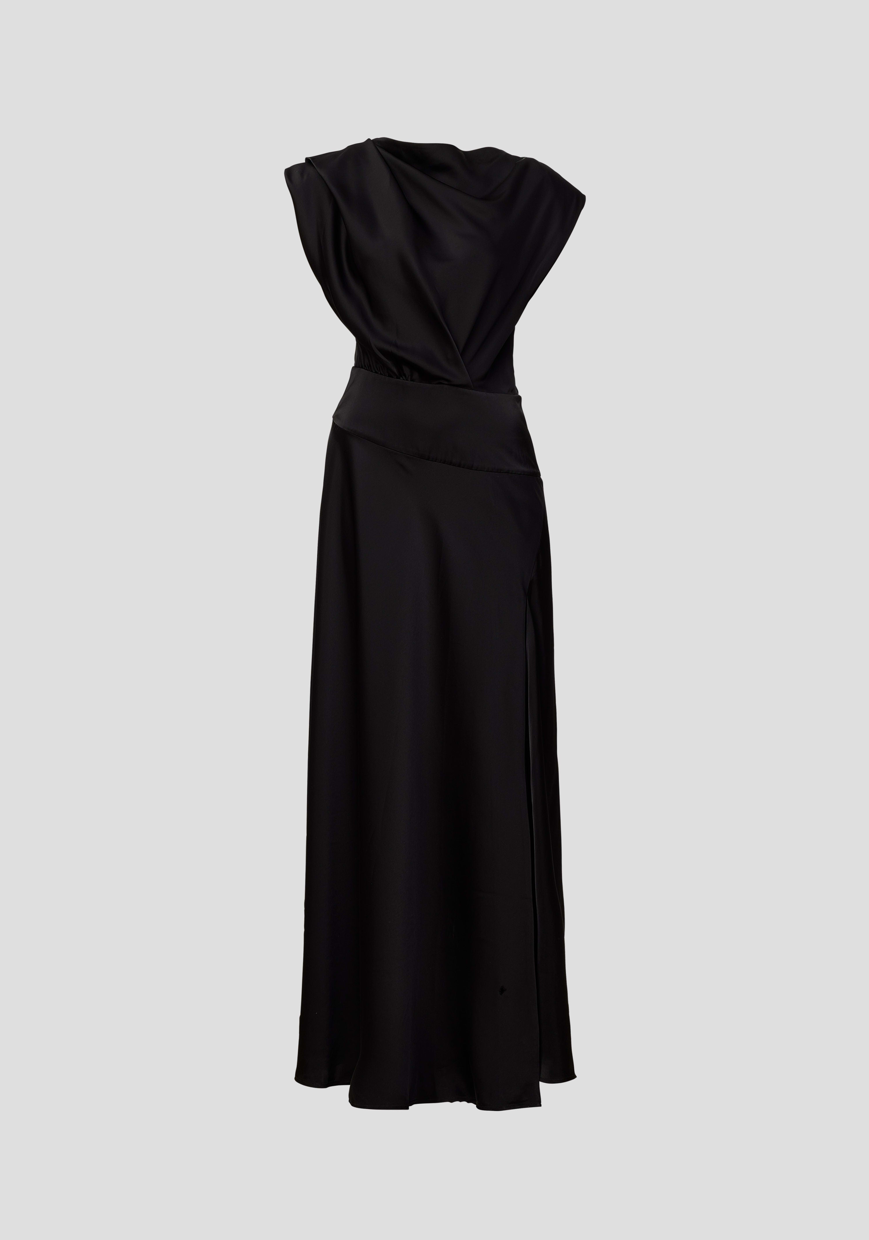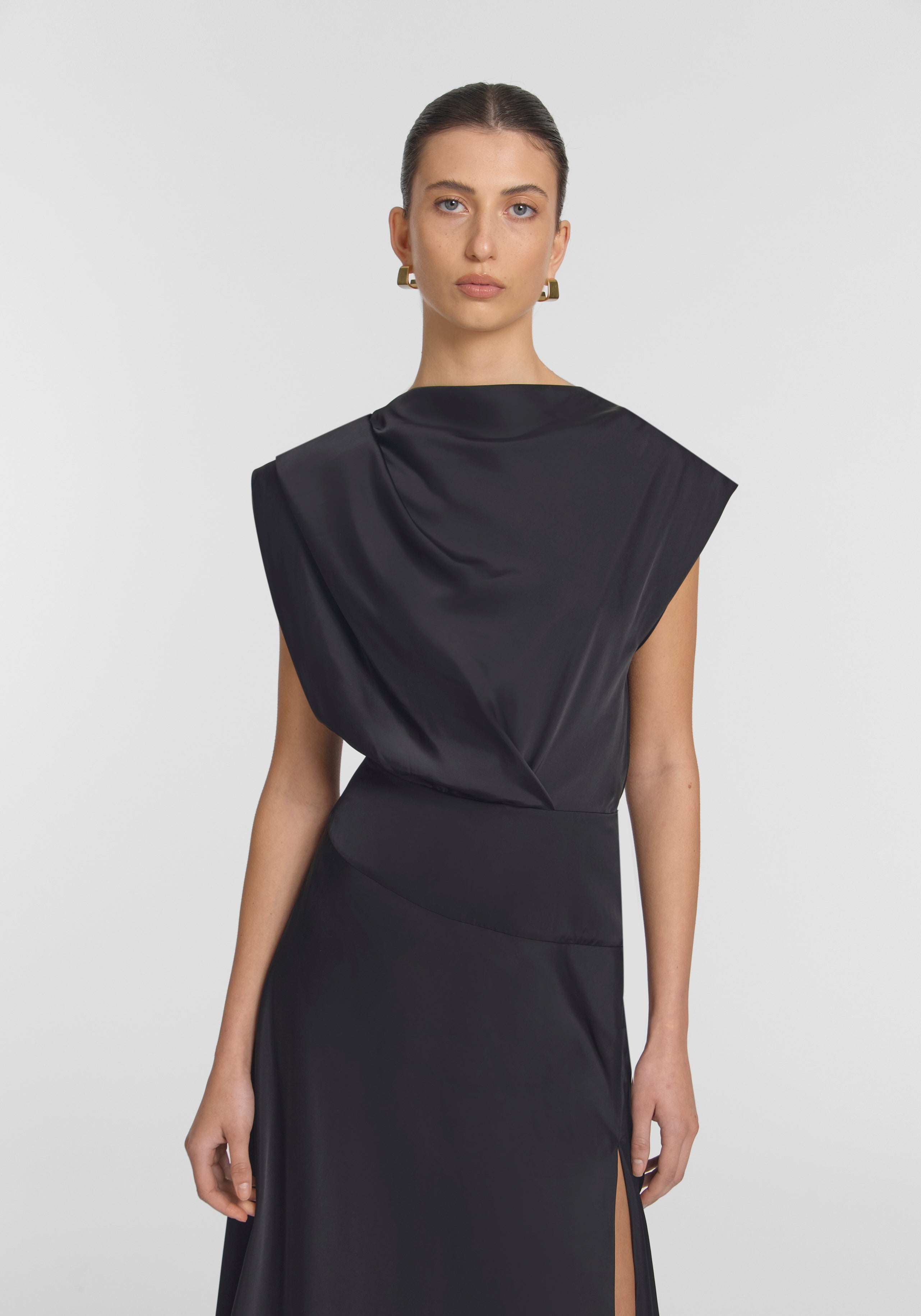 The Metropolitan Dress exudes sophisticated elegance, crafted from our signature cupro blend in classic black. Showcasing a bias-cut skirt, draped neckline, and fitted waist panel, it creates a flattering silhouette, adorned with removable shoulder pads for architectural allure. Finished with a keyhole back and front split, this dress offers modernity with a subtle hint of skin.