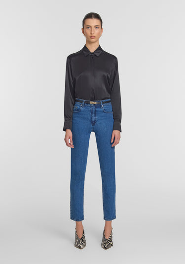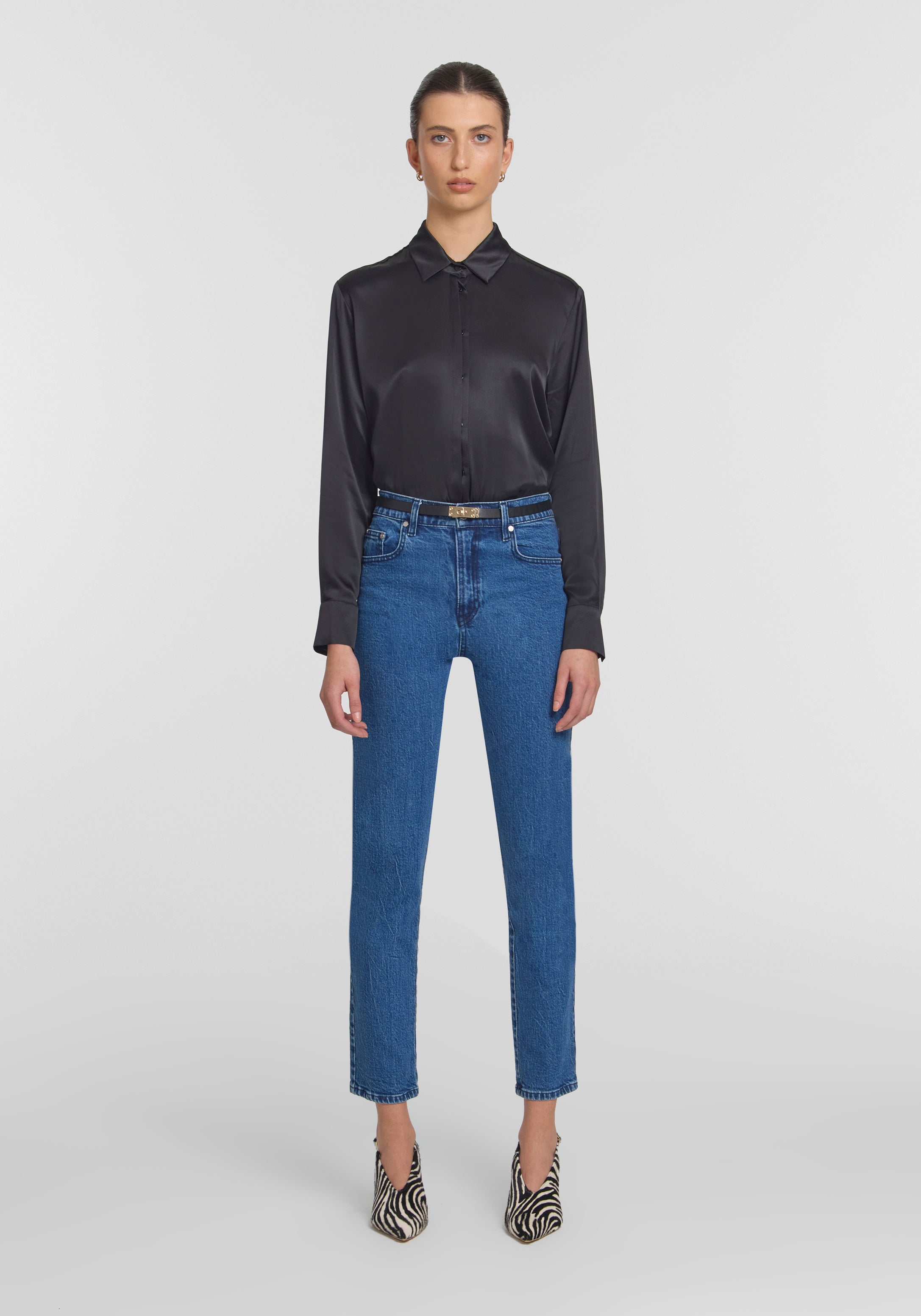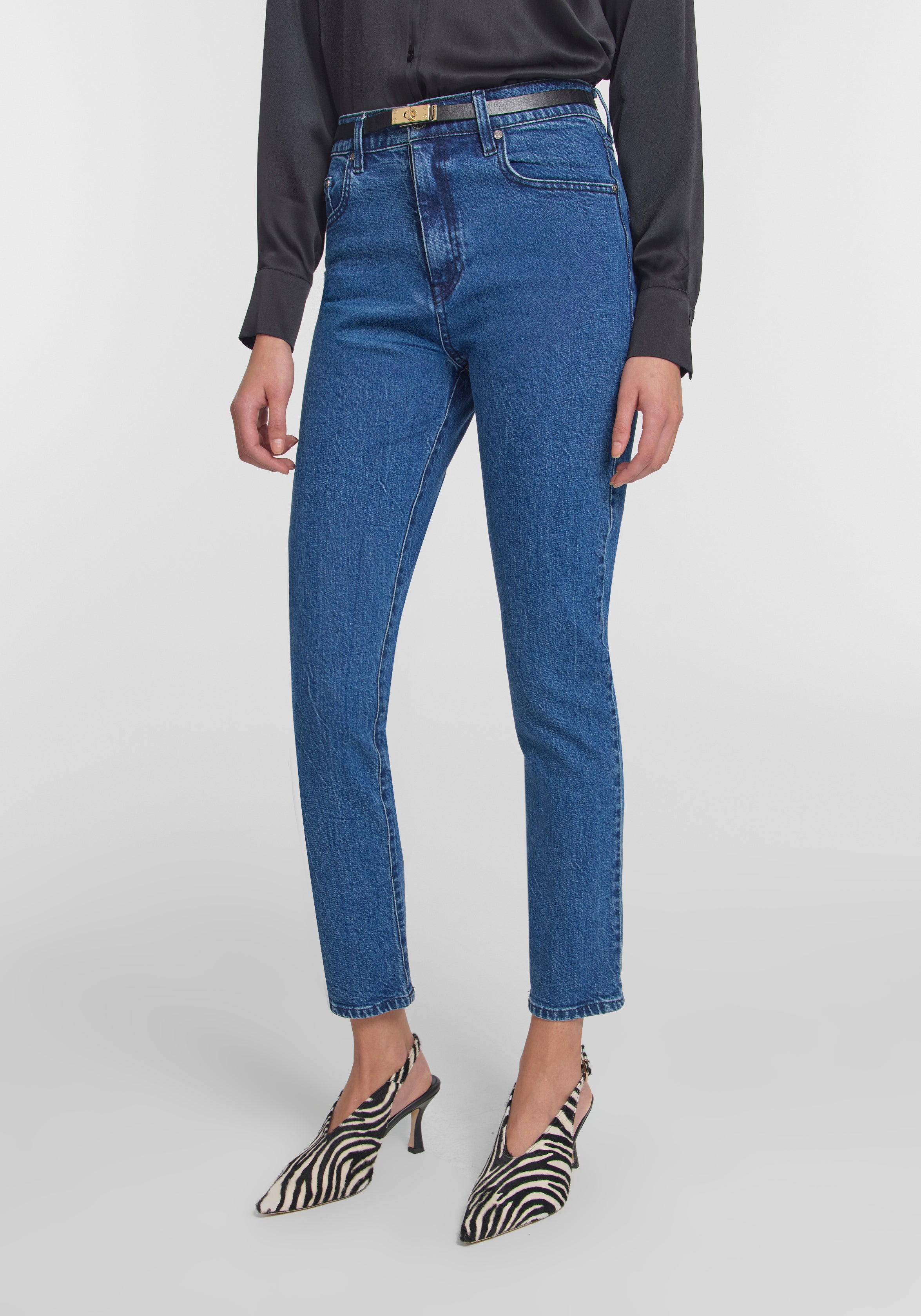 Introducing the Minogue Jean, crafted from classic indigo wash denim with a high-rise, slim-leg silhouette and 3/4 length. Designed with a slight stretch and finished with a signature black logo leather patch and hardware, this clean silhouette is a must-have for effortless, everyday style.