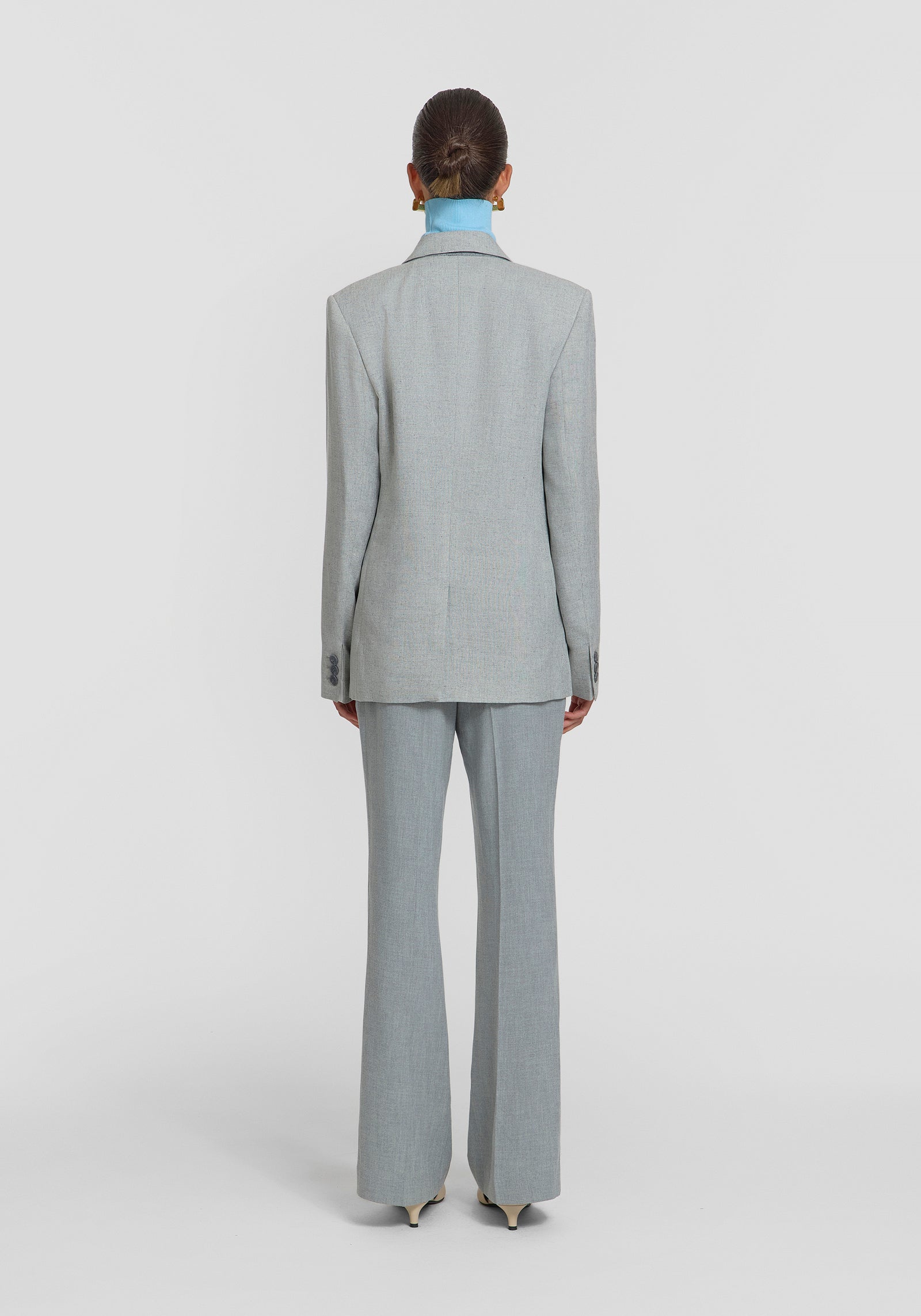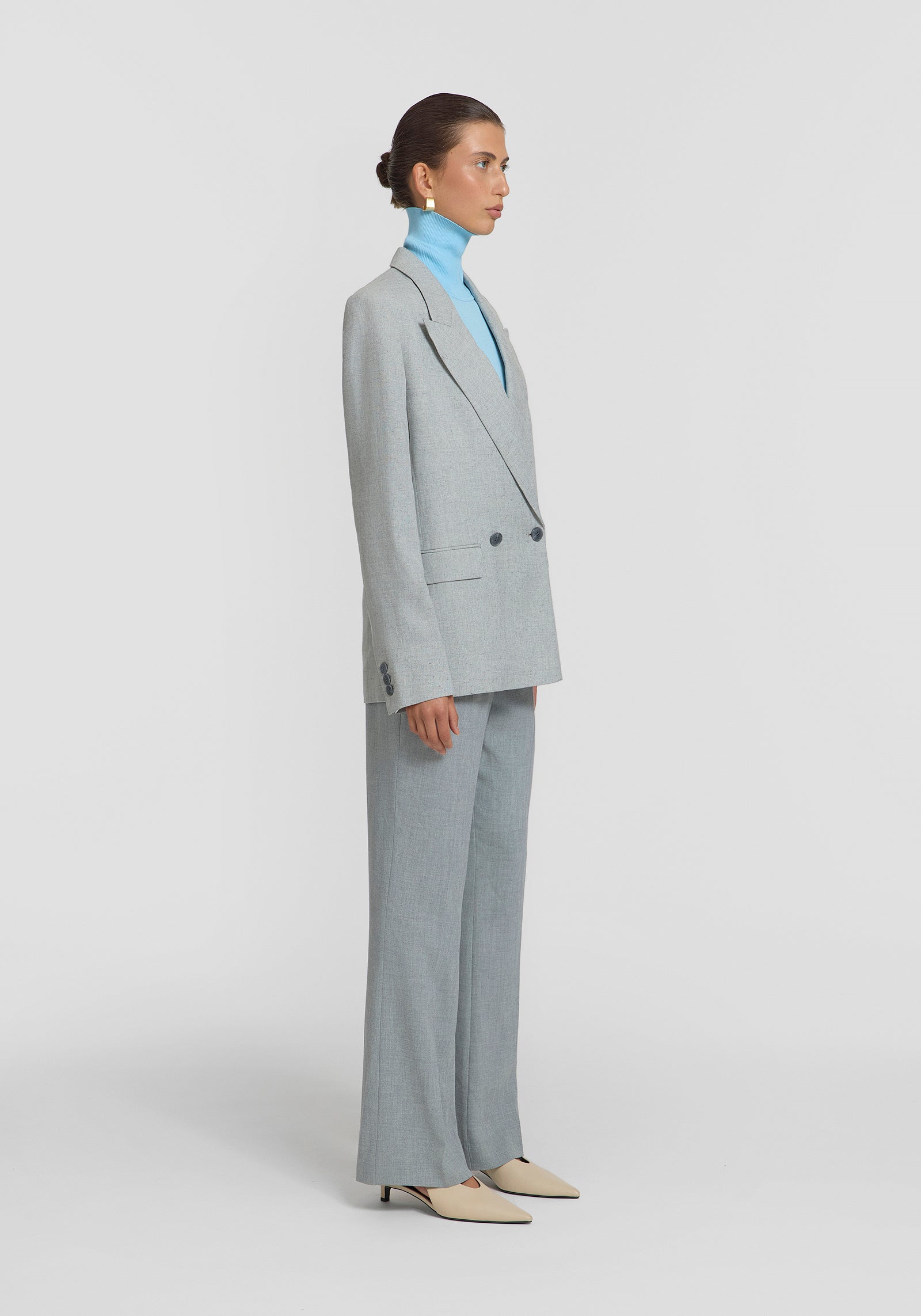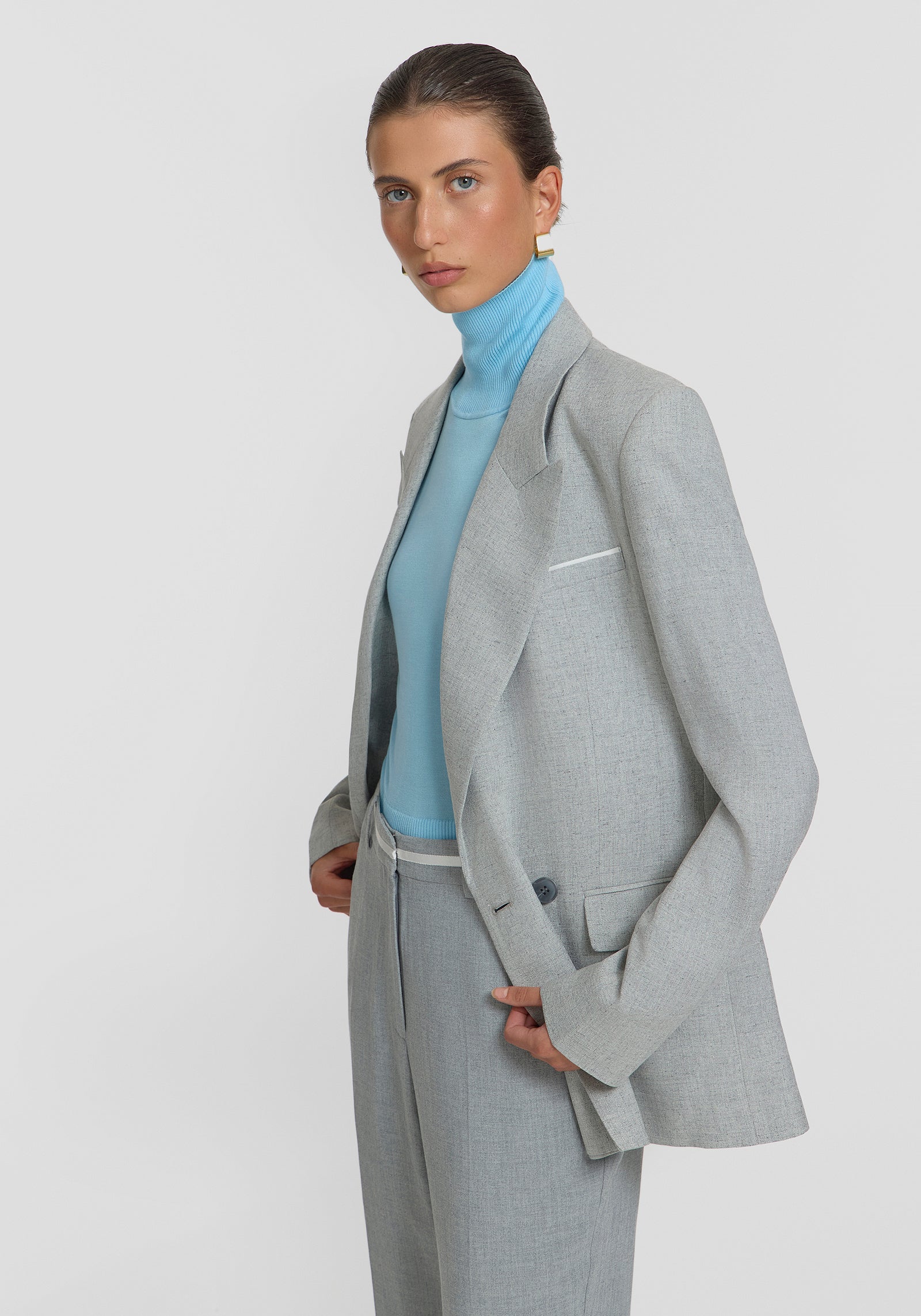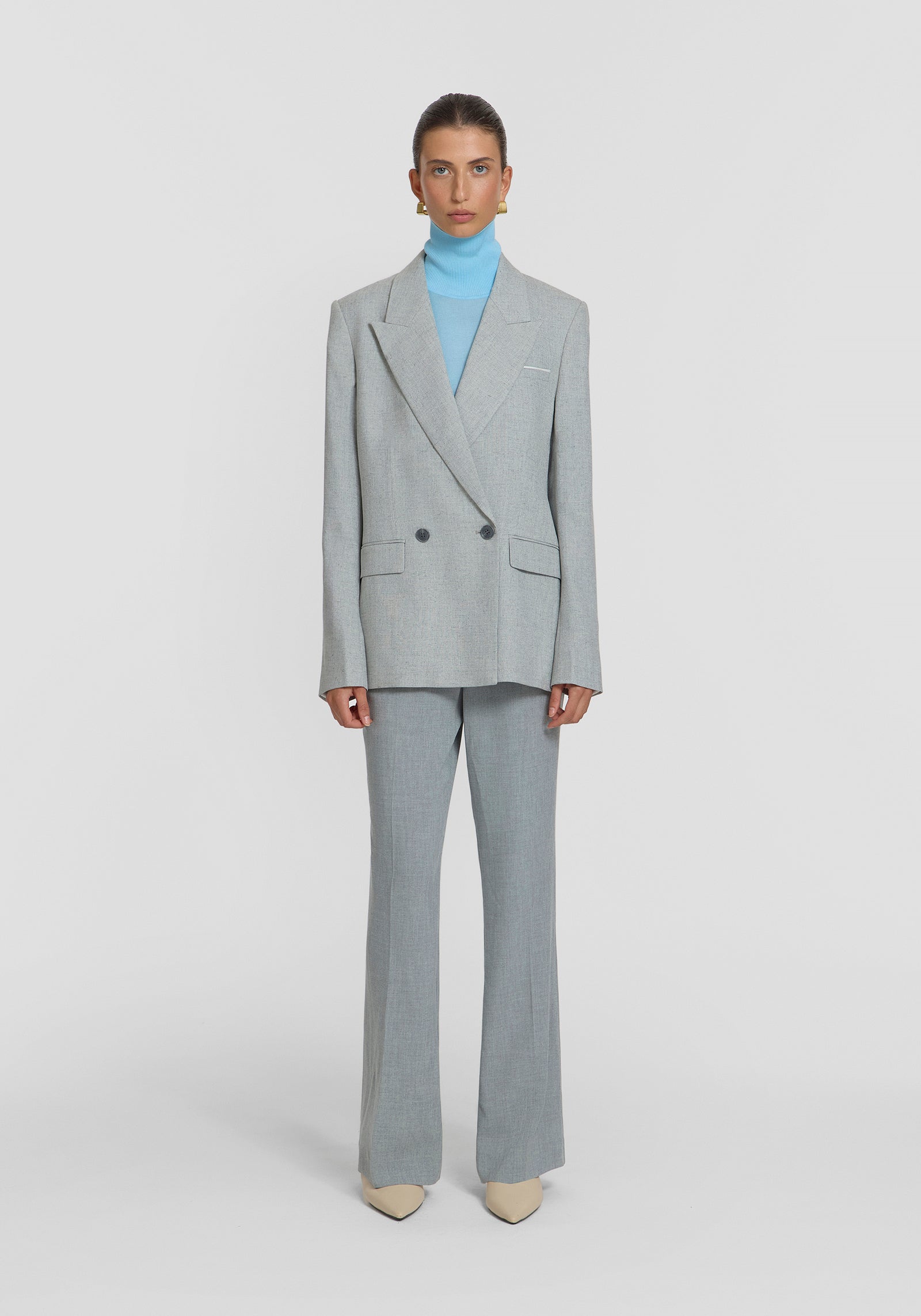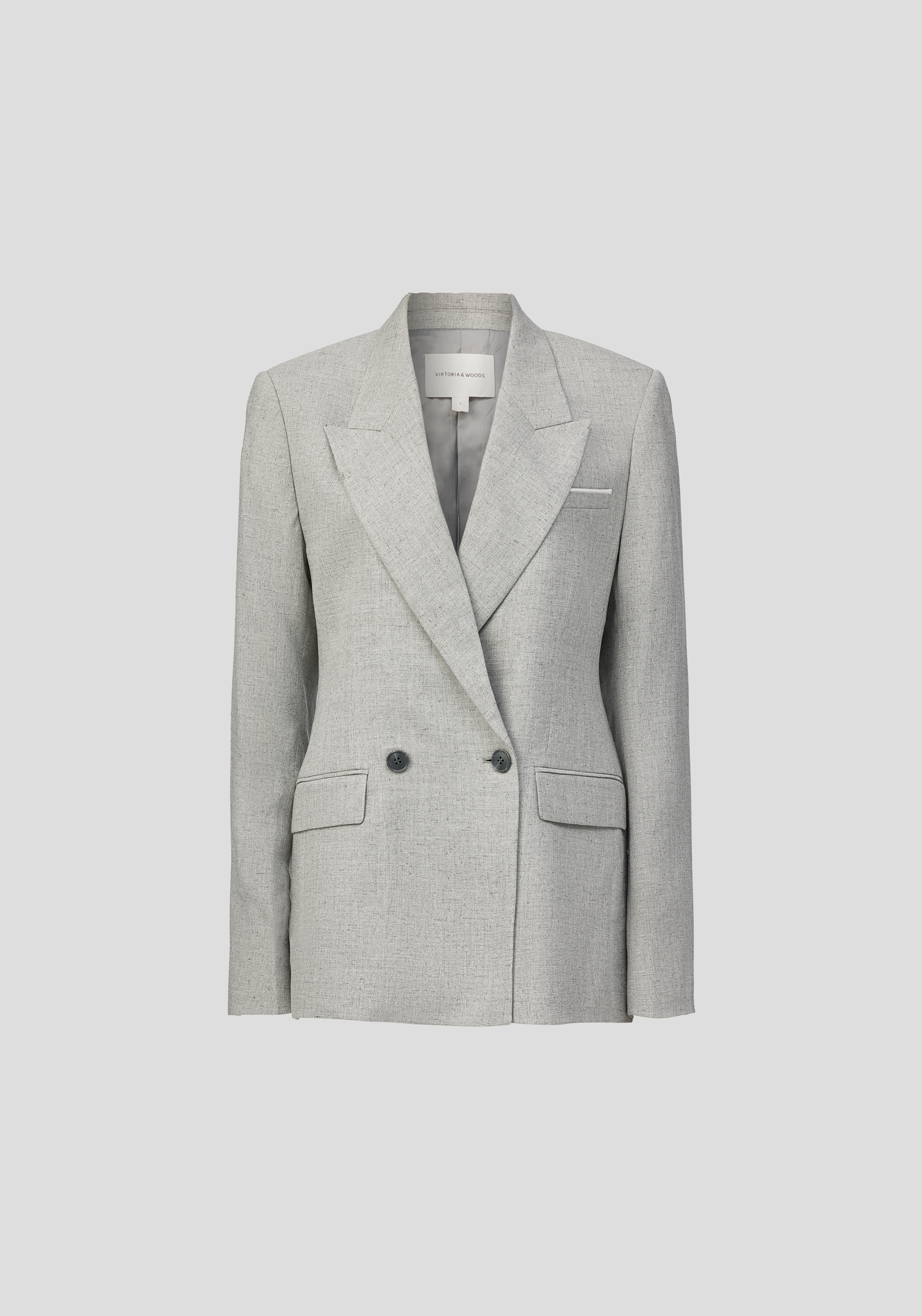 Ease into suiting this season with the Montlake Blazer, a tailored workwear staple in a timeless light grey hue. This double-breasted silhouette features a peaked collar, refined lapel, subtle shoulder pads, and a relaxed waist for effortless sophistication. Intricately detailed with a felt undercollar, jetted pockets, centre back vent, and logo buttons, it embodies polished appeal. Pair it with the Earle Trouser for a modern ensemble, accented by contrast white details.