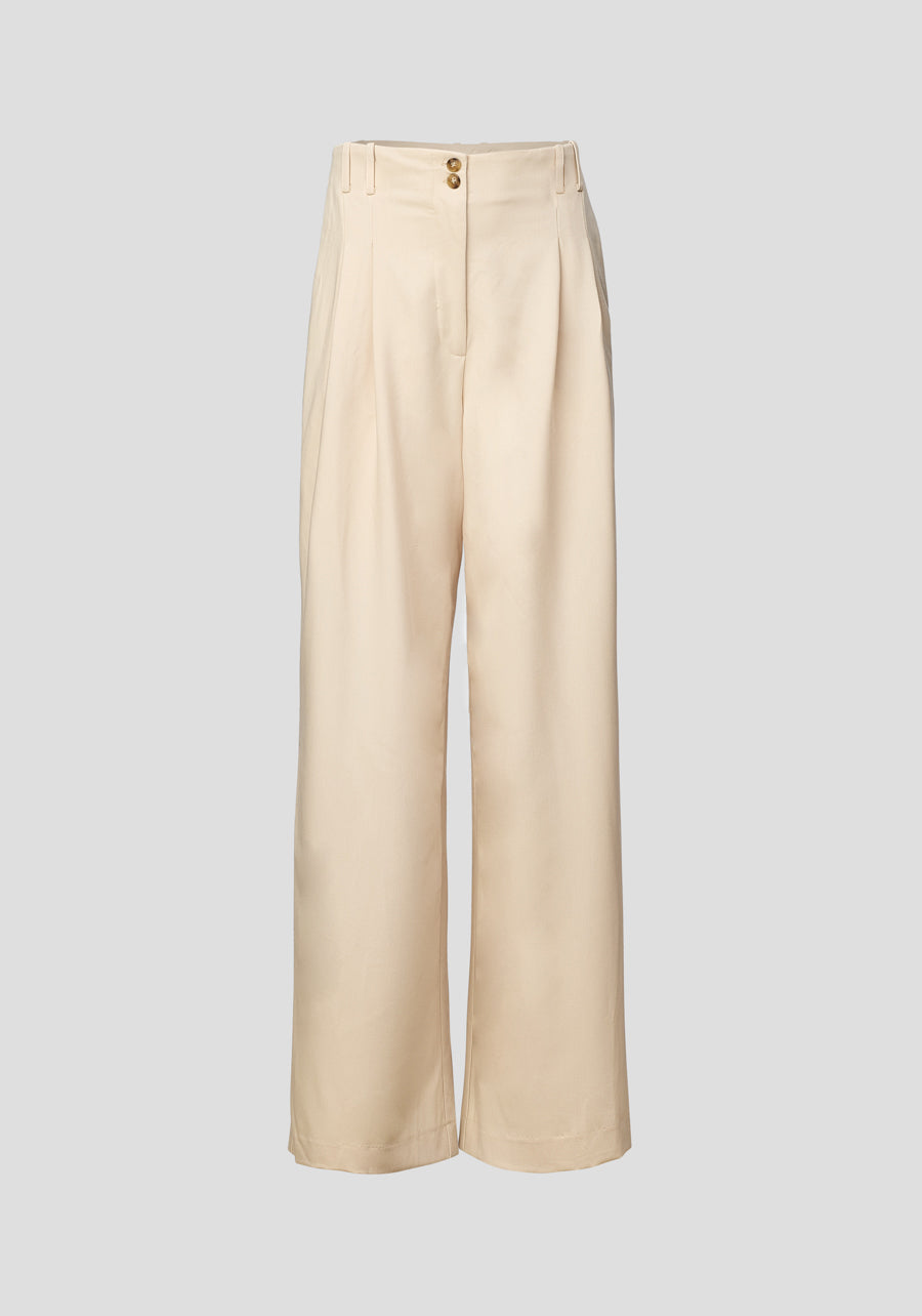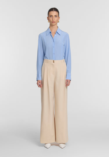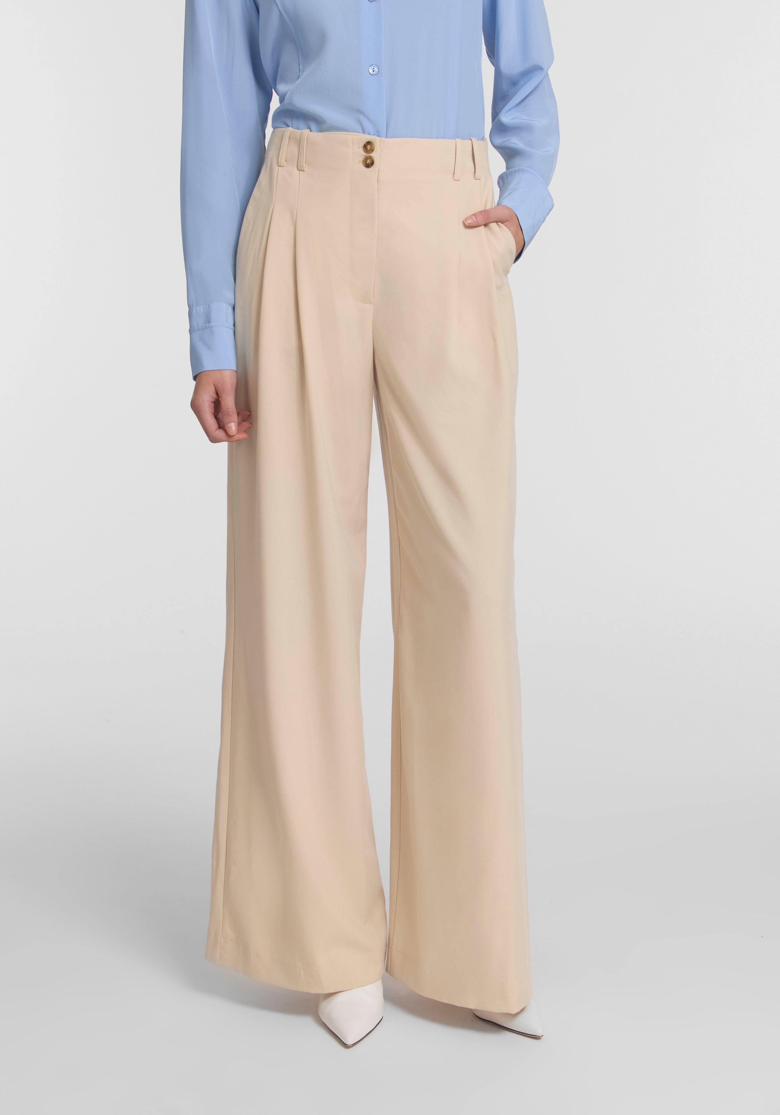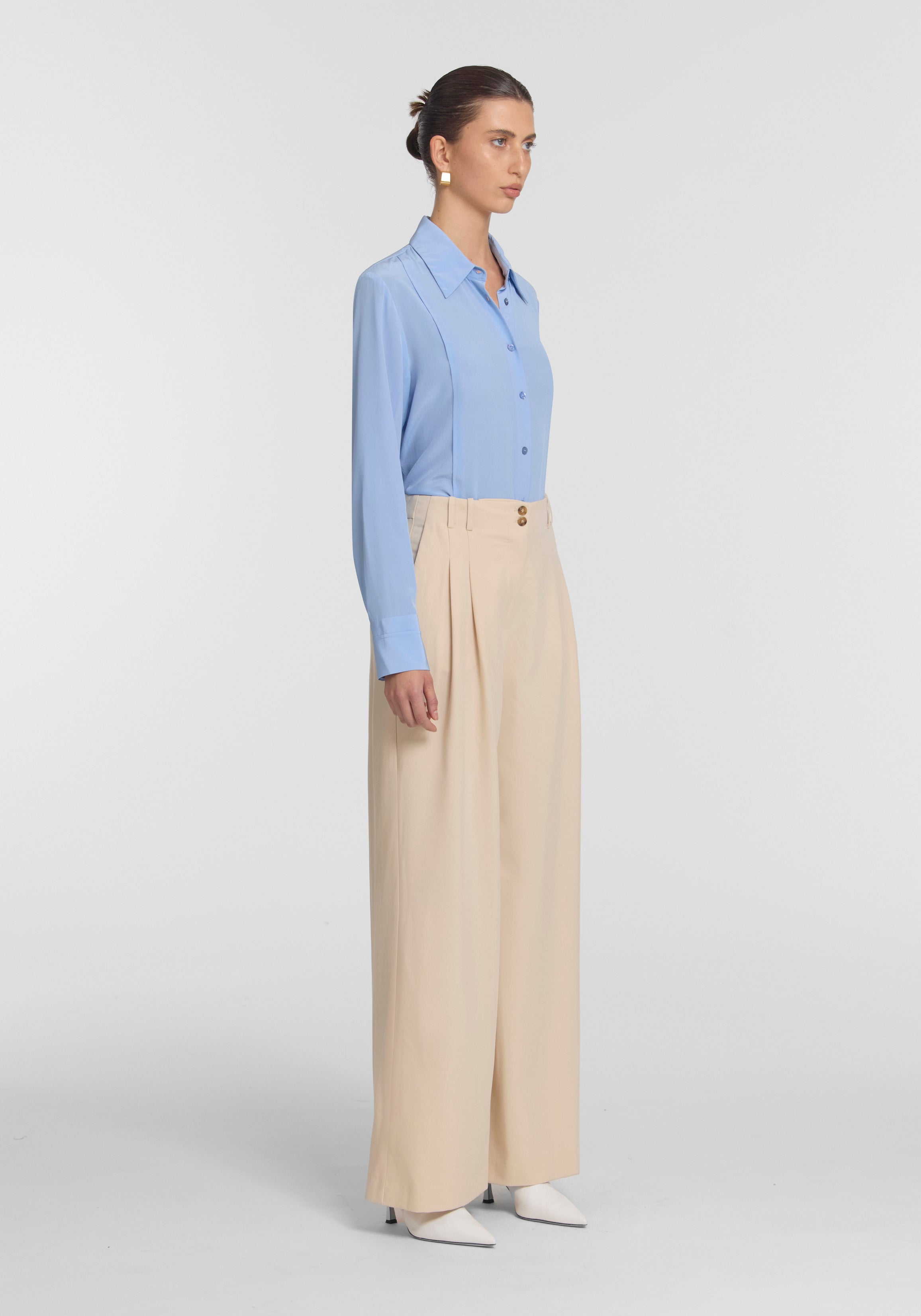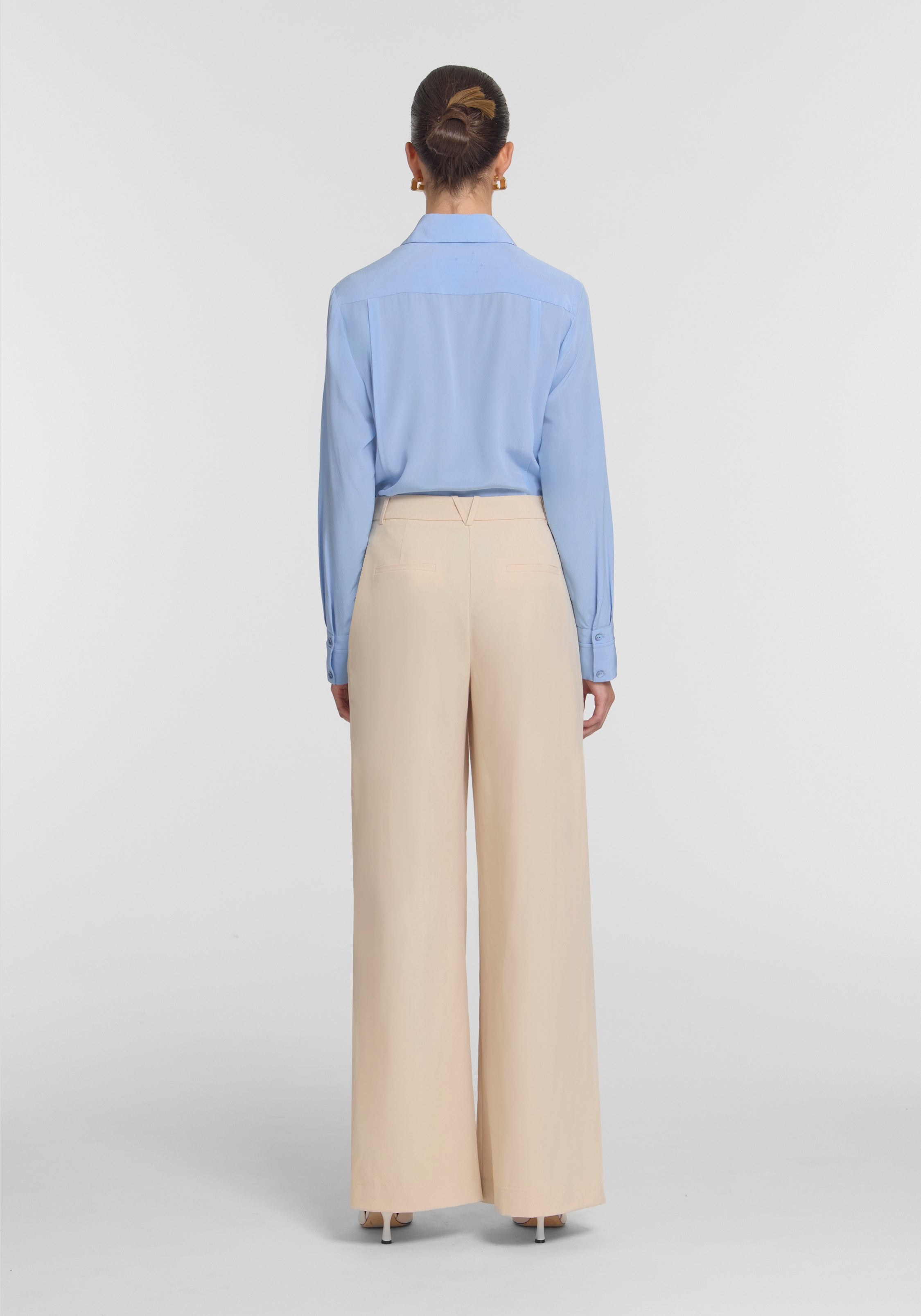 The Muse Pant offers foundational tailoring, crafted from our signature rayon/nylon blend in a neutral almond hue. With a high-rise silhouette and wide-leg profile, it features double pleats, belt loops, and pockets. Pair with the matching Acapella Vest for an effortlessly refined set or back with your essentials for chic everyday ease.