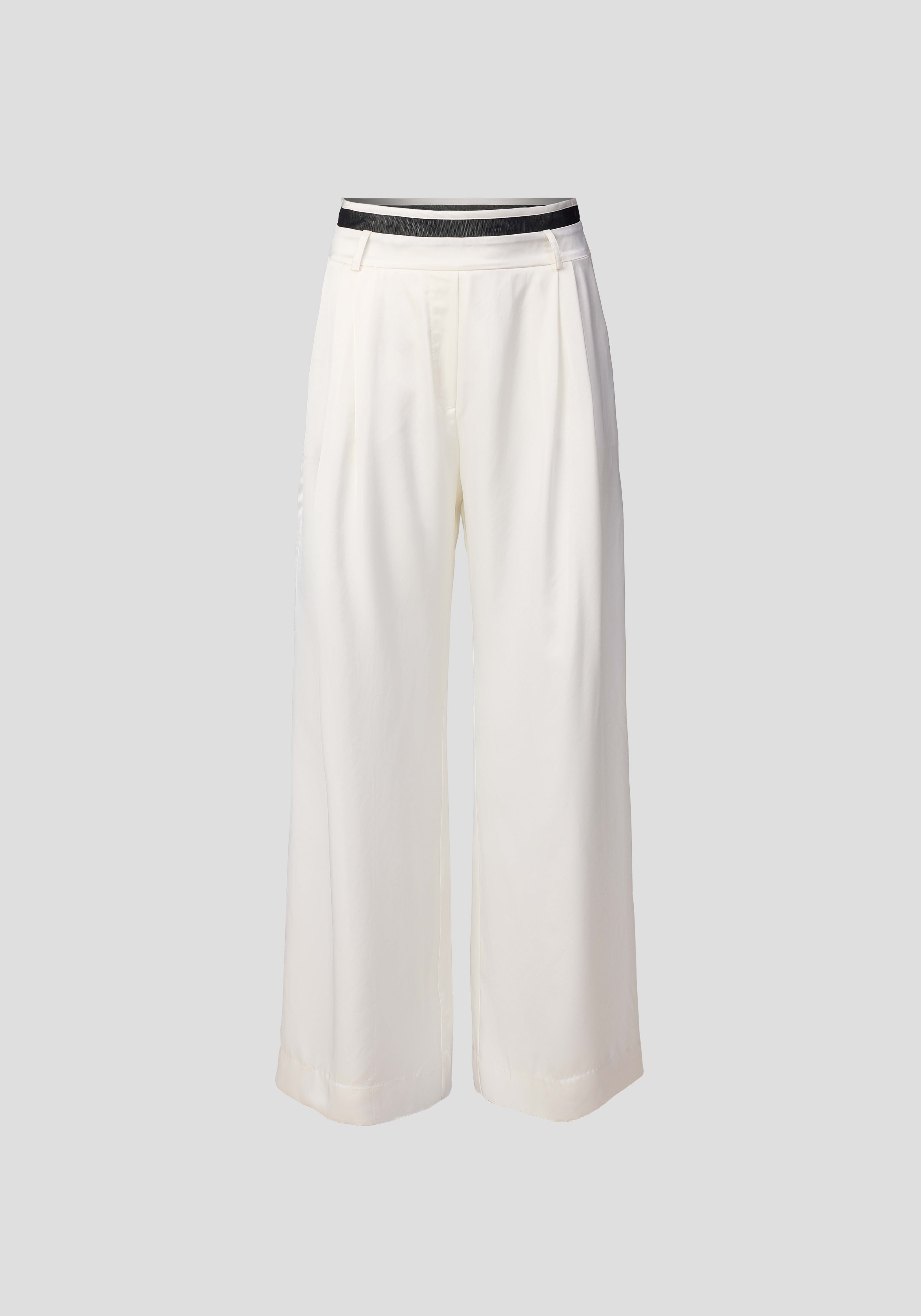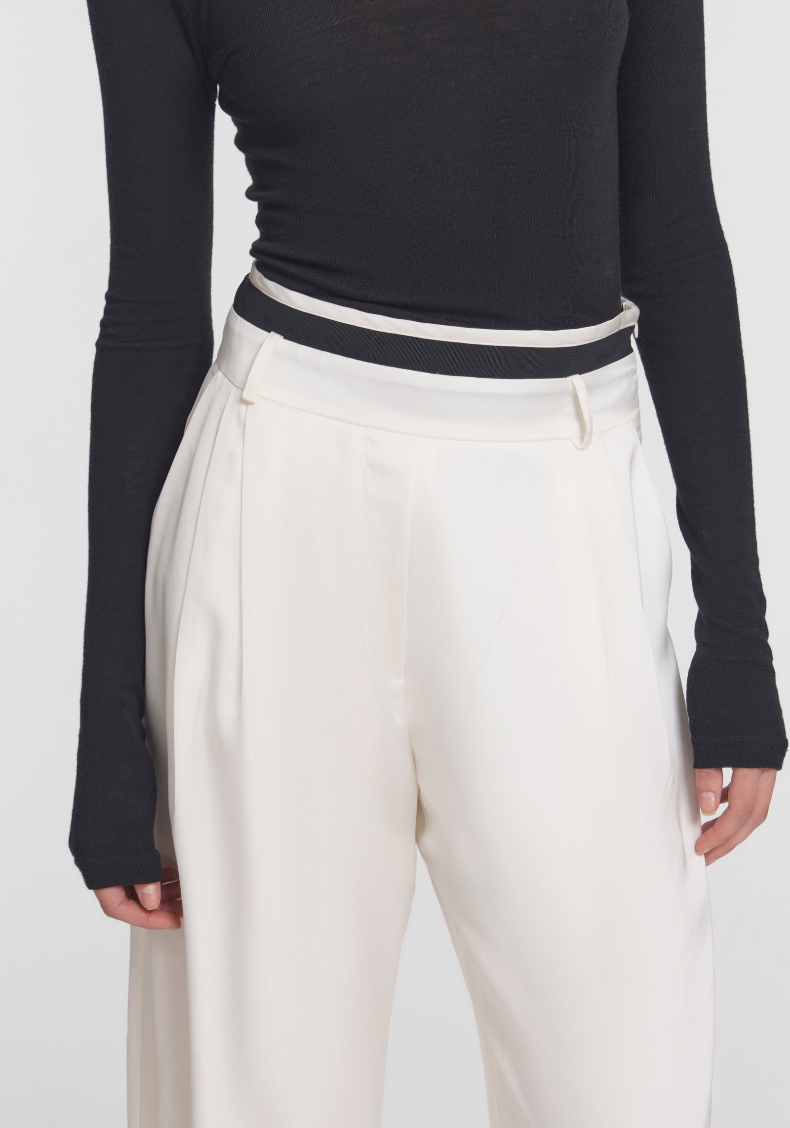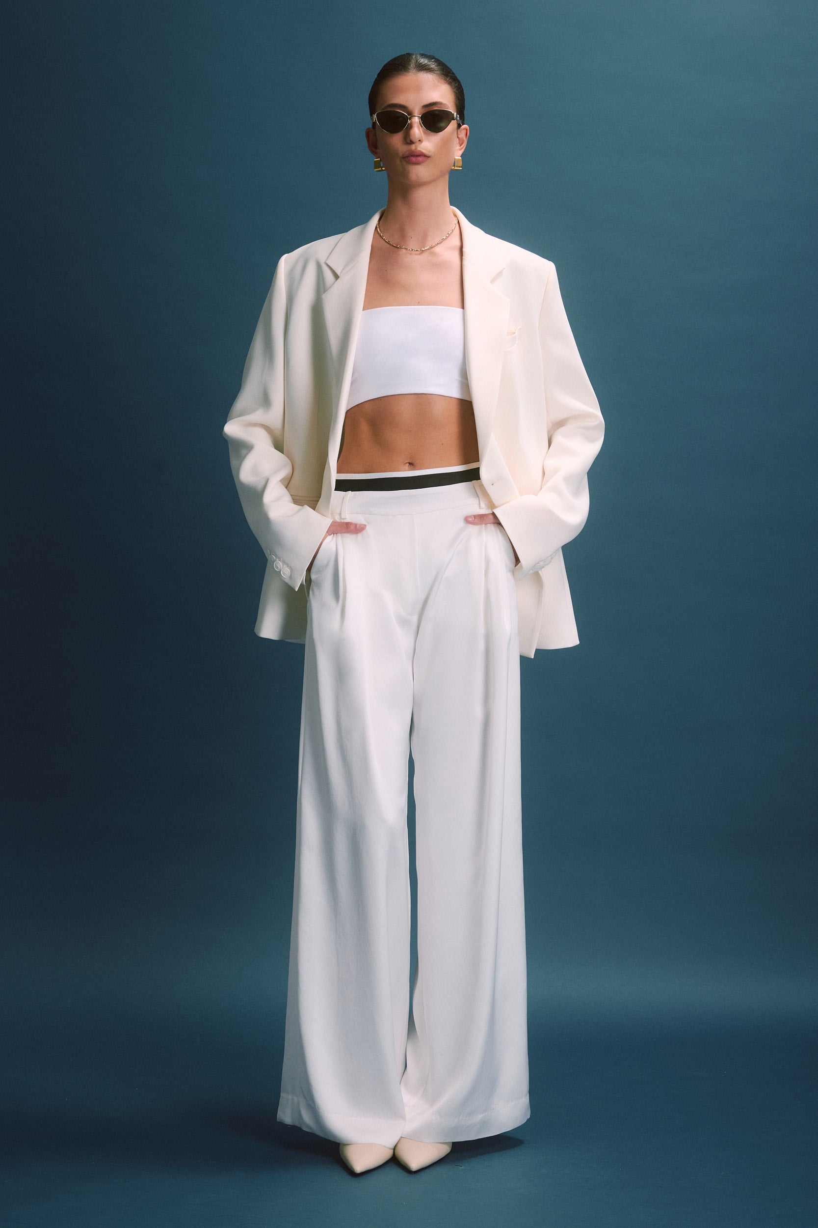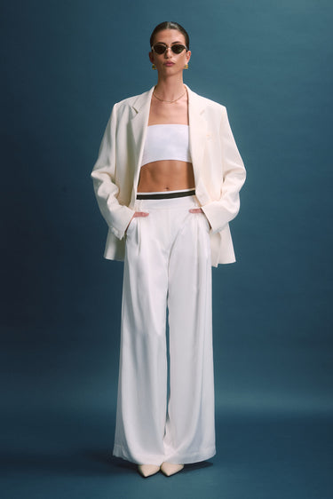 The Napier Pant, crafted from our signature cupro blend in classic ivory, offers a sophisticated palazzo silhouette. Adorned with a chic powermesh detailing at the waist, it features belt loops, double pleats, and pockets. Complete with back darts, these pants deliver an effortlessly refined look.