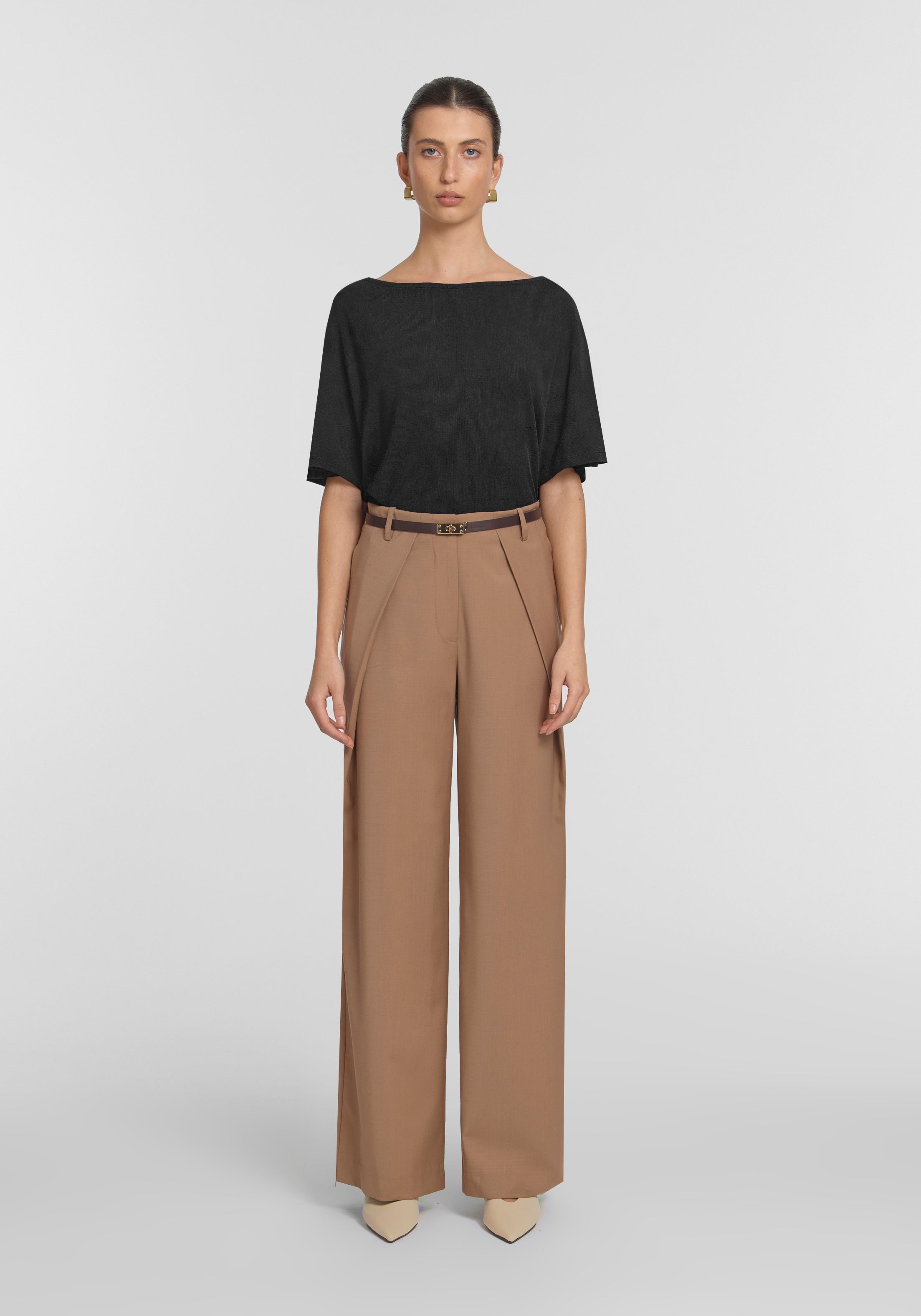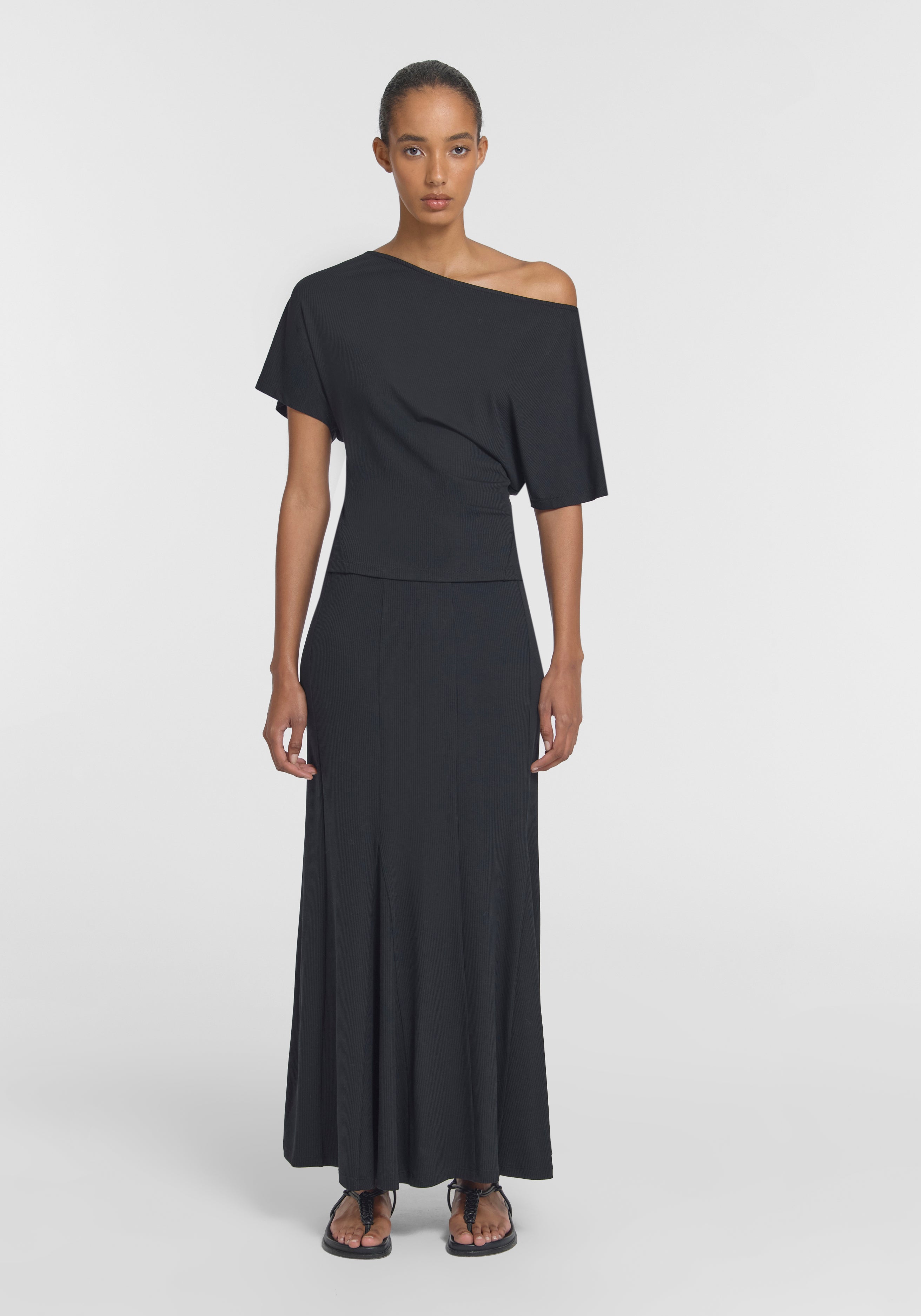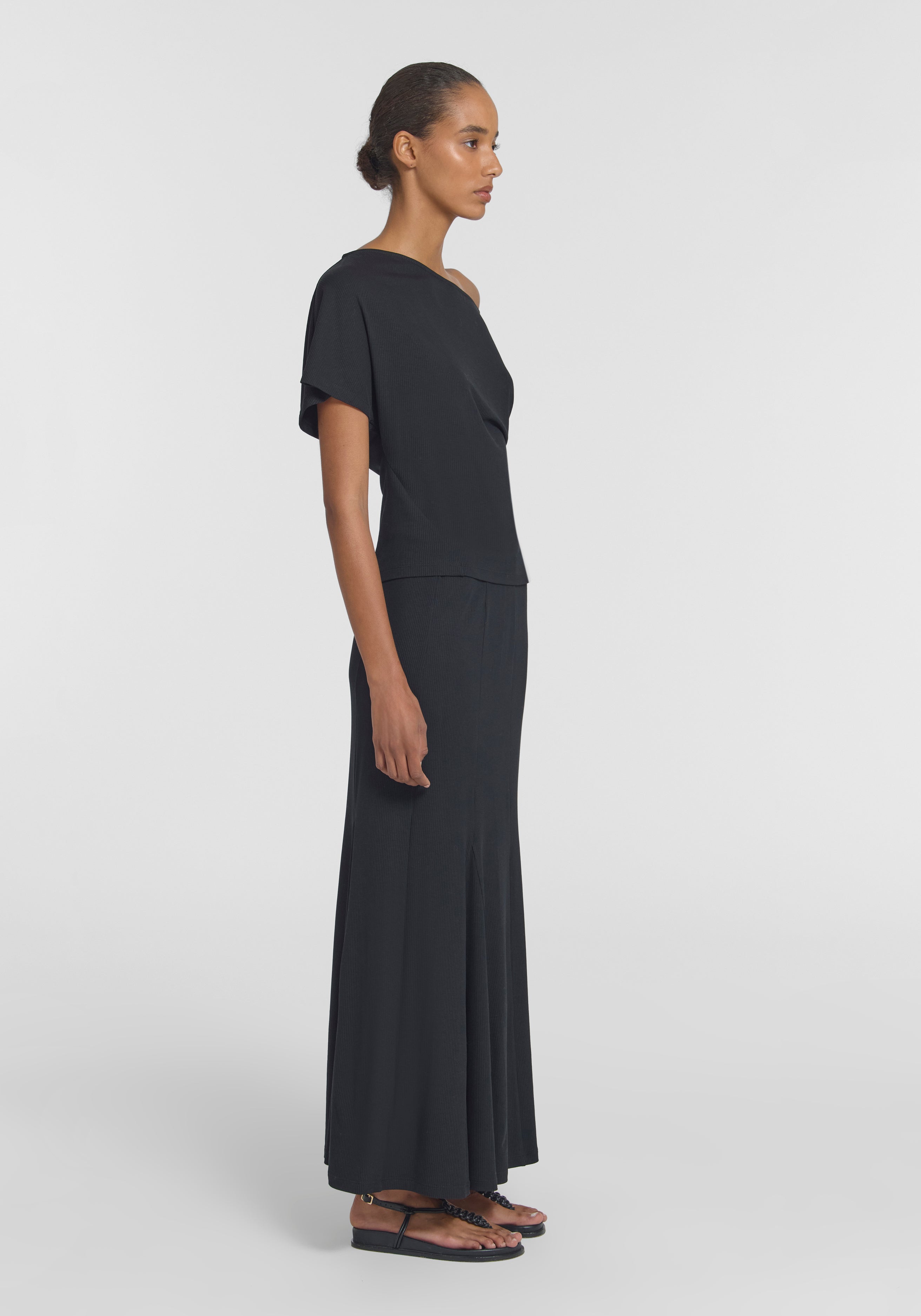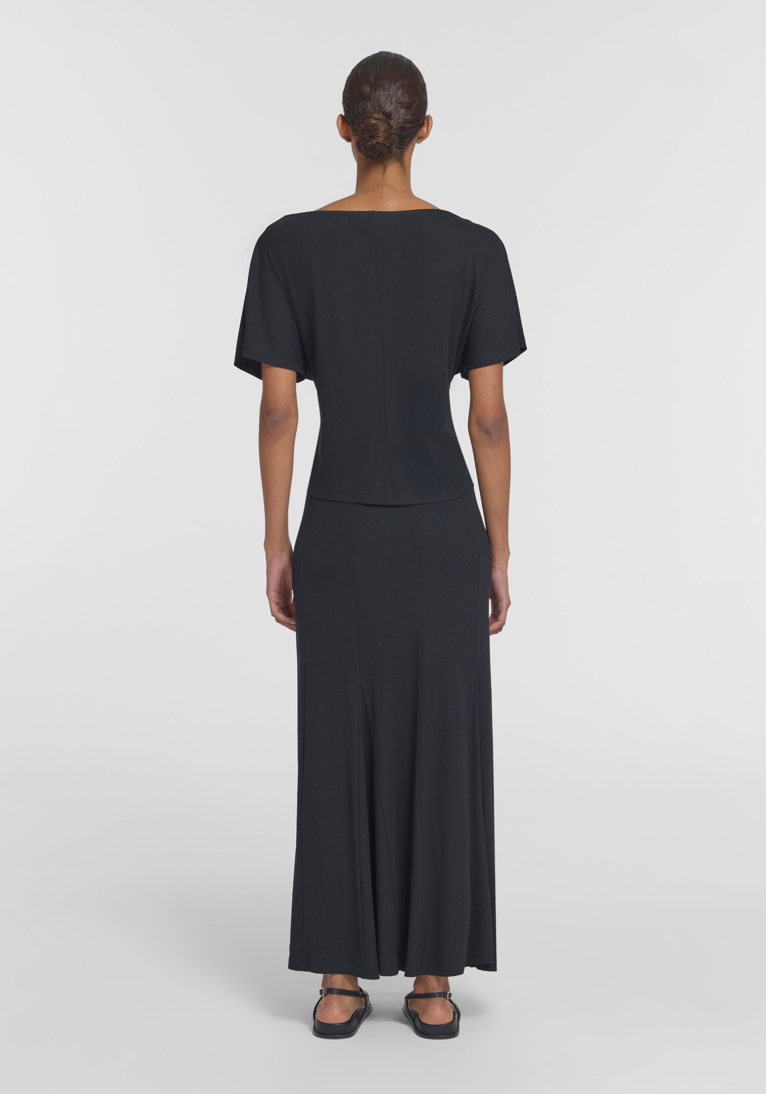 The Odette Top, crafted from ribbed black stretch knit, is an elevated essential, bringing refined ease to everyday dressing. Featuring a relaxed fit, short sleeves, and a subtle boat neckline, it pairs effortlessly with the matching Parade Skirt for a softly textured, all black look.