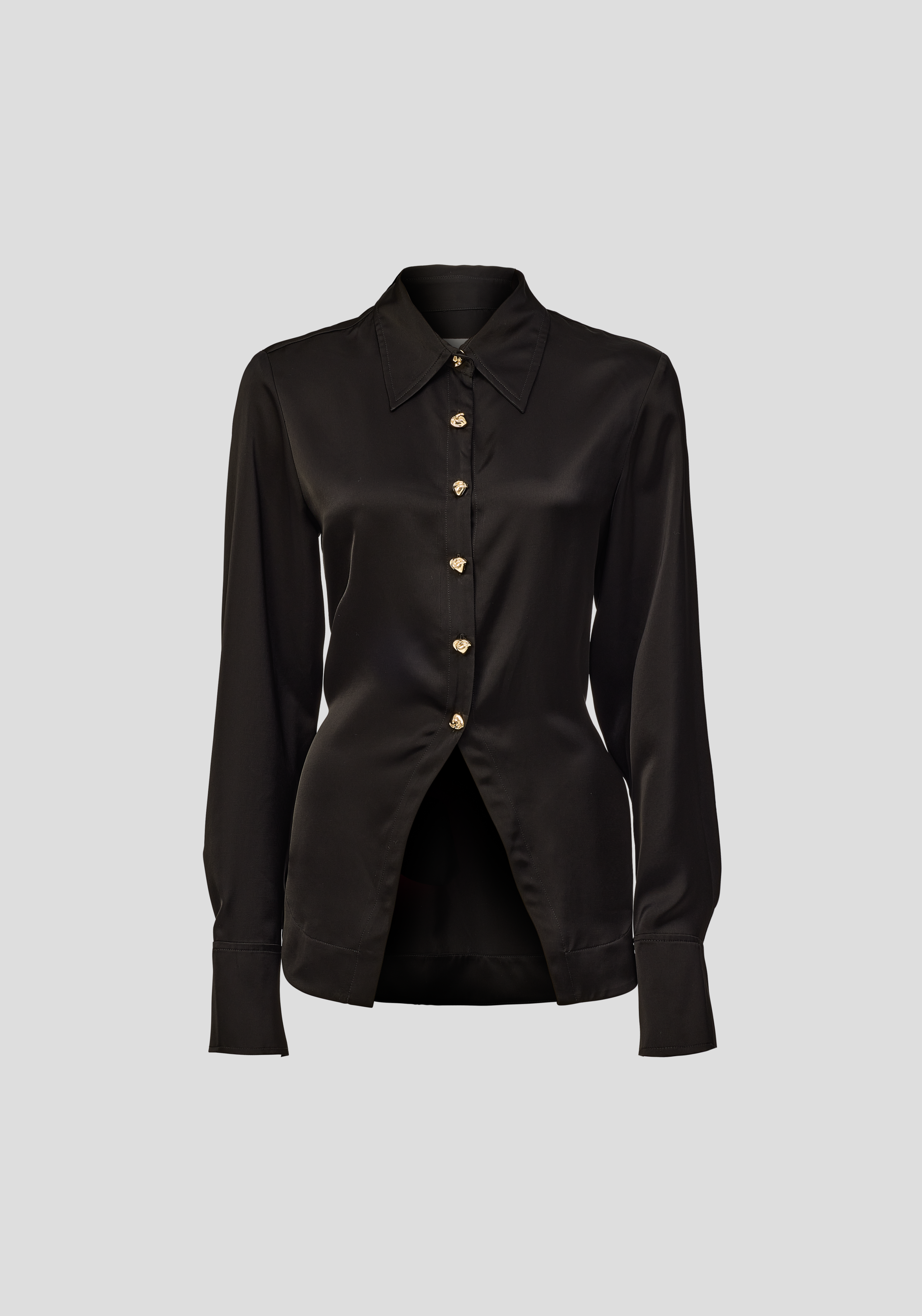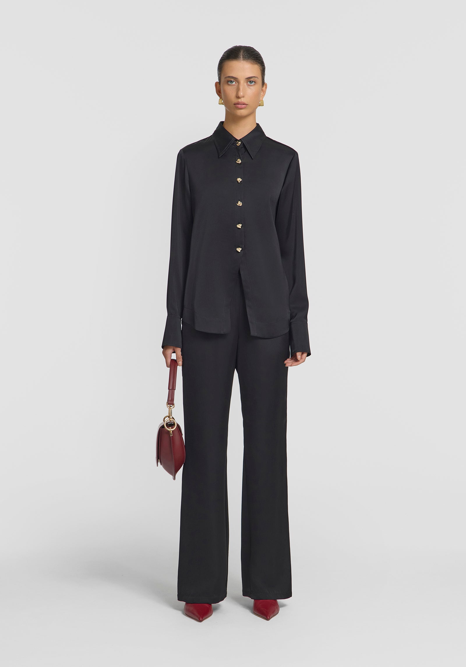 An elevated take on black shirting, the Oracle Shirt is crafted from a cupro blend in classic black. Femininely tailored with a cutaway hem, it features a sharp collar, subtle volume through the sleeves, and statement gold buttons. Complete the look with the Prologue Trouser for an effortlessly timeless set.