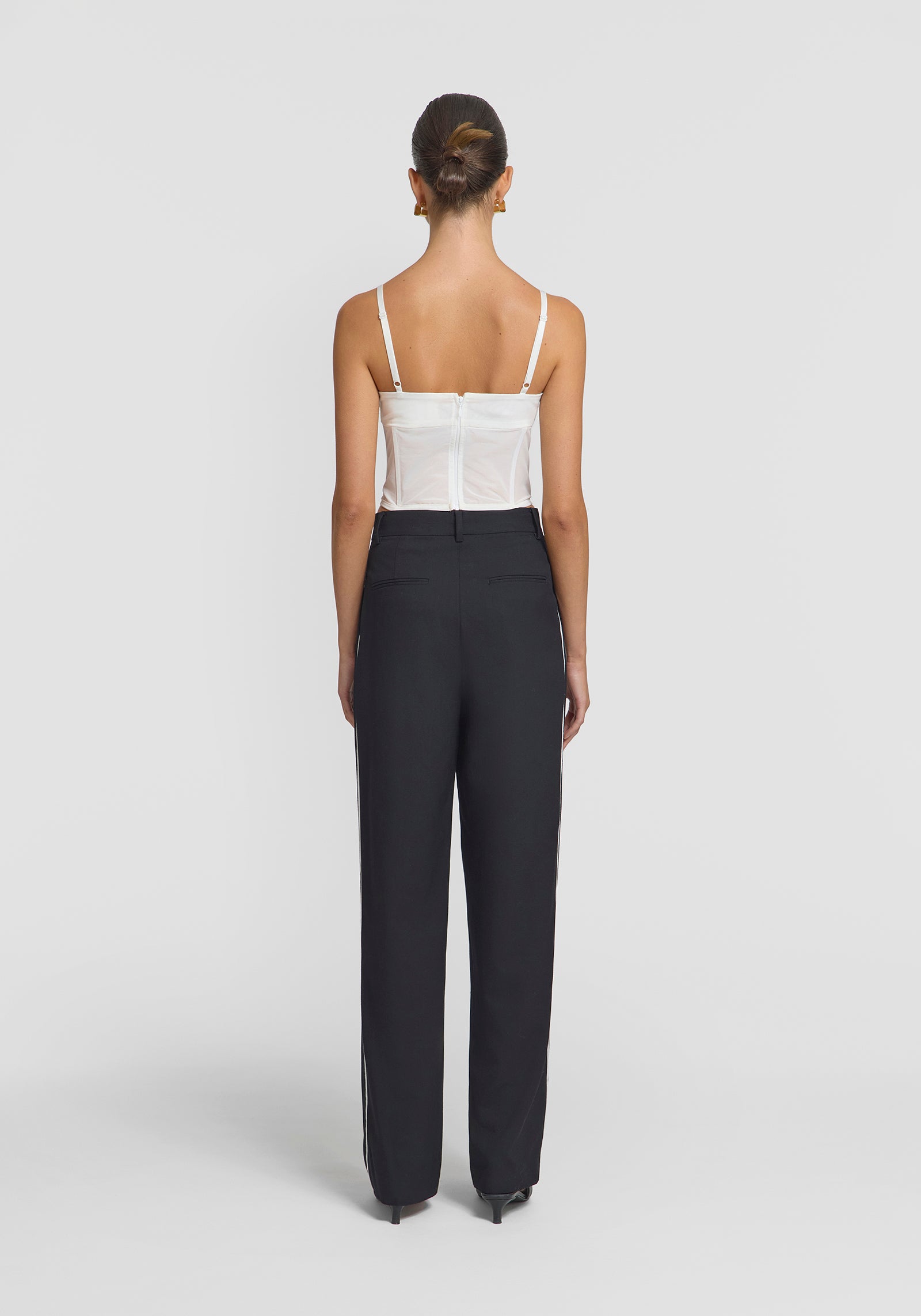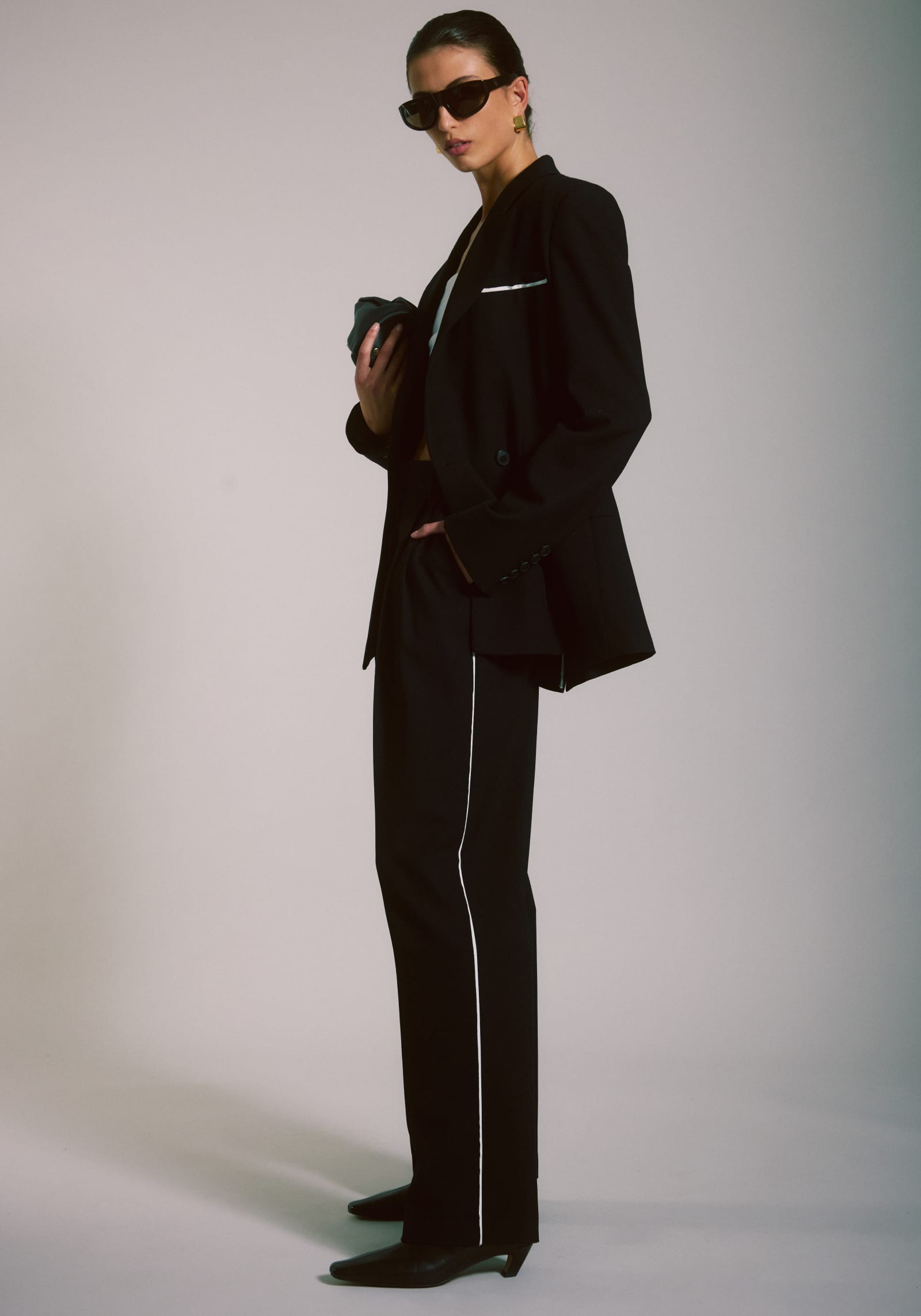 The Panther Trouser, crafted from a luxurious black wool blend, fuses traditional tailoring with modern detailing. With a high-rise, straight-leg silhouette, tailored waistband, front pleating, and contrast piping, it’s a timeless addition to your capsule wardrobe. Pair with the Billboard Blazer for a reimagined take on the classic black suit.