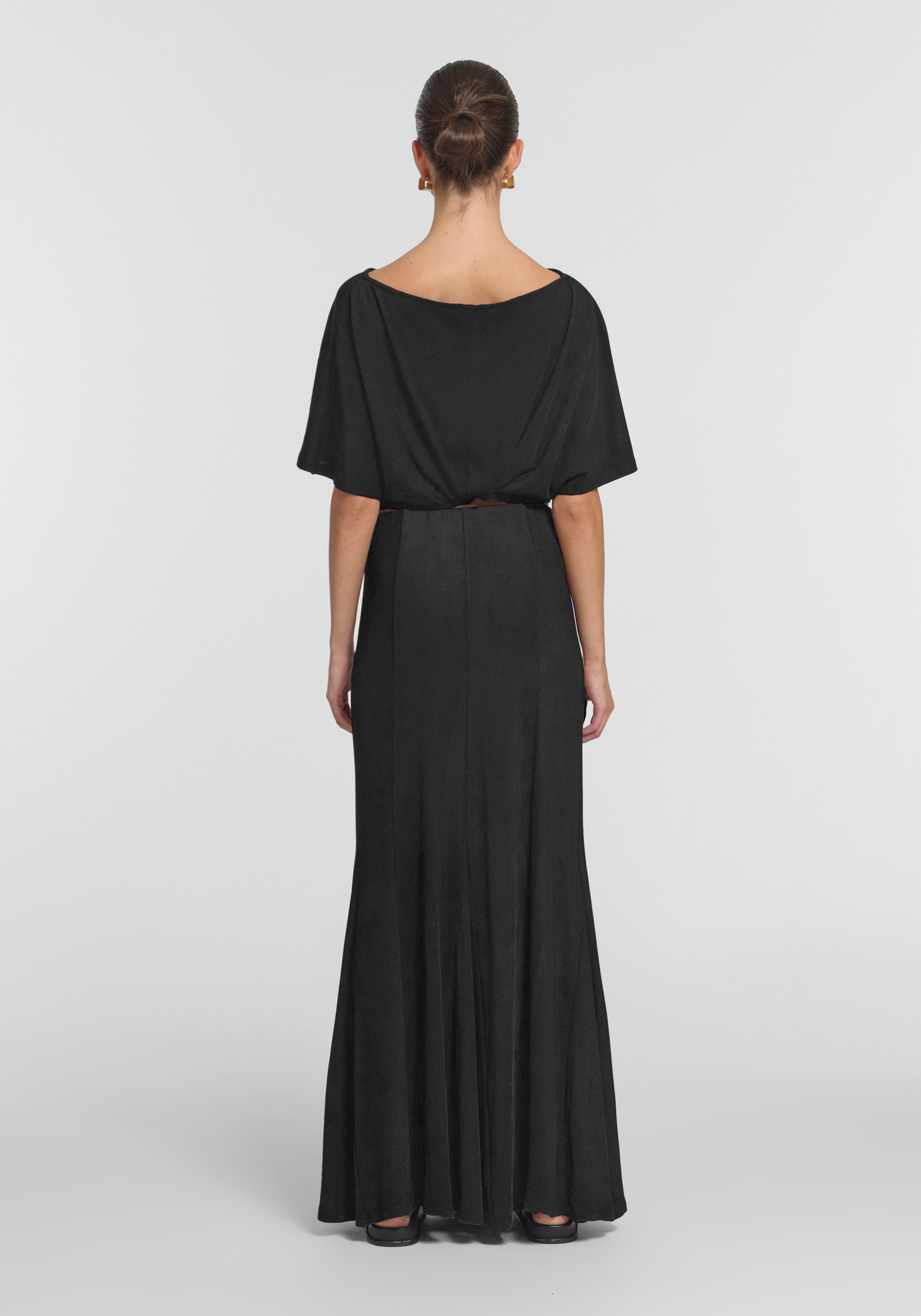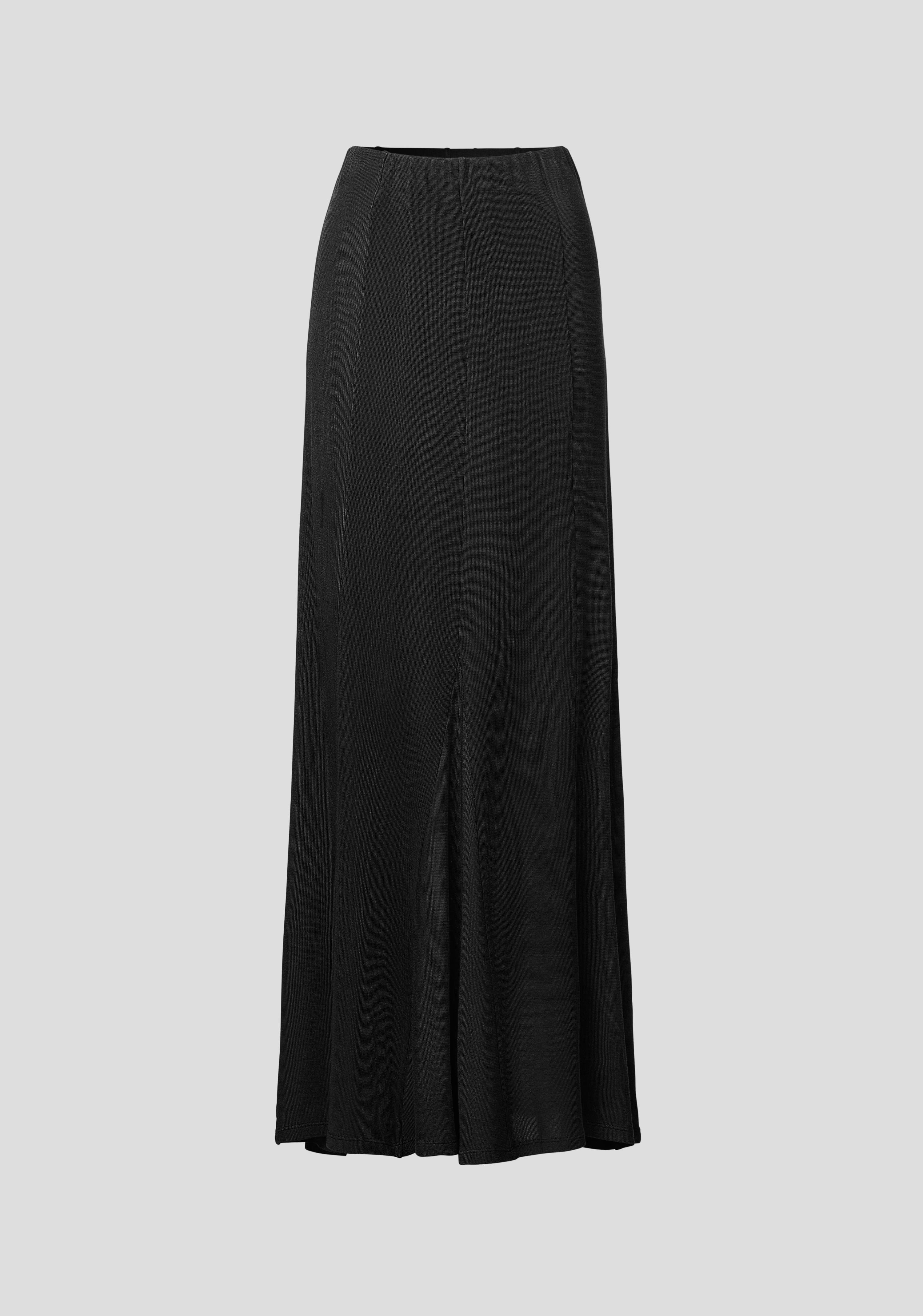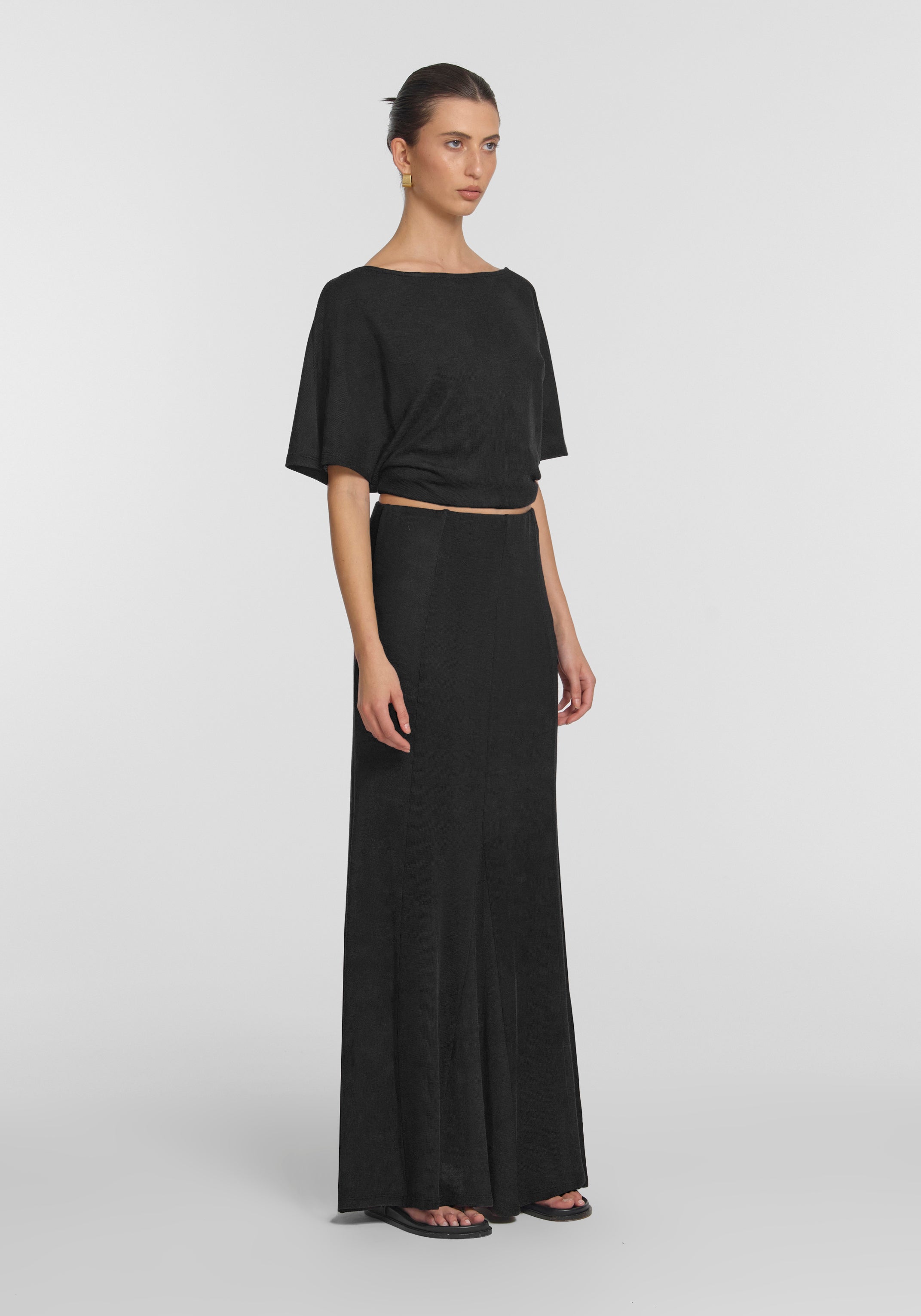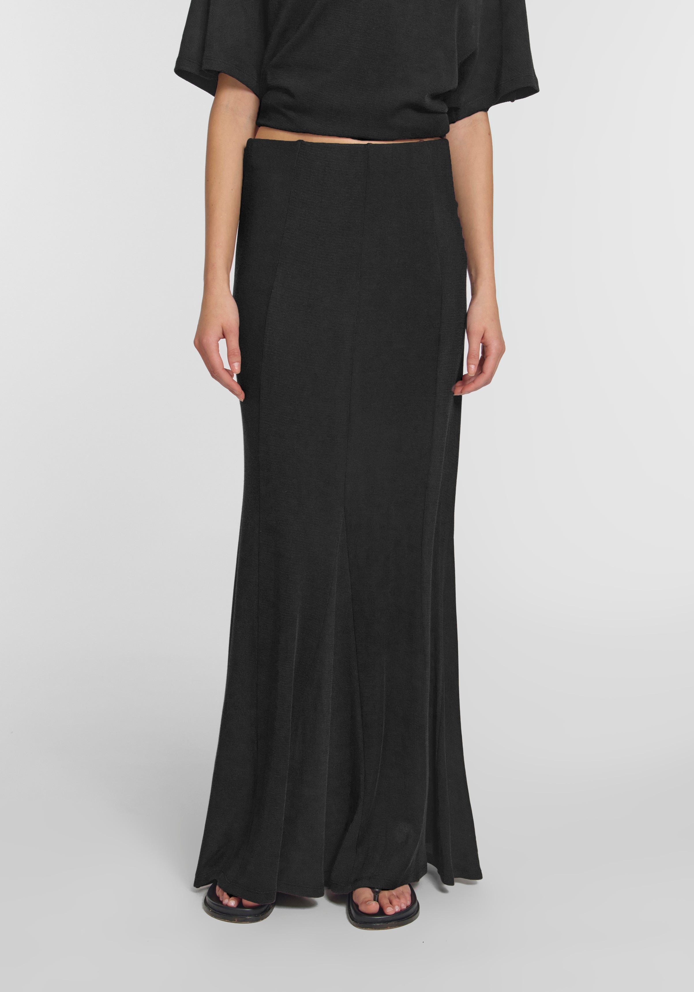 The Parade Skirt, crafted from ribbed black stretch knit, exudes quiet elevation and lasting versatility. Falling to a full length with a soft bell-shaped silhouette, it features exposed seam detailing and an elasticated waistband, bringing an ethereal fusion of texture and effortless ease. Pair with the Odette Top for an alluring, understated all black look.