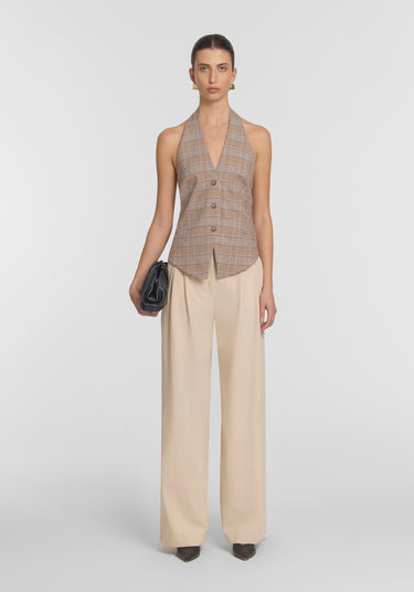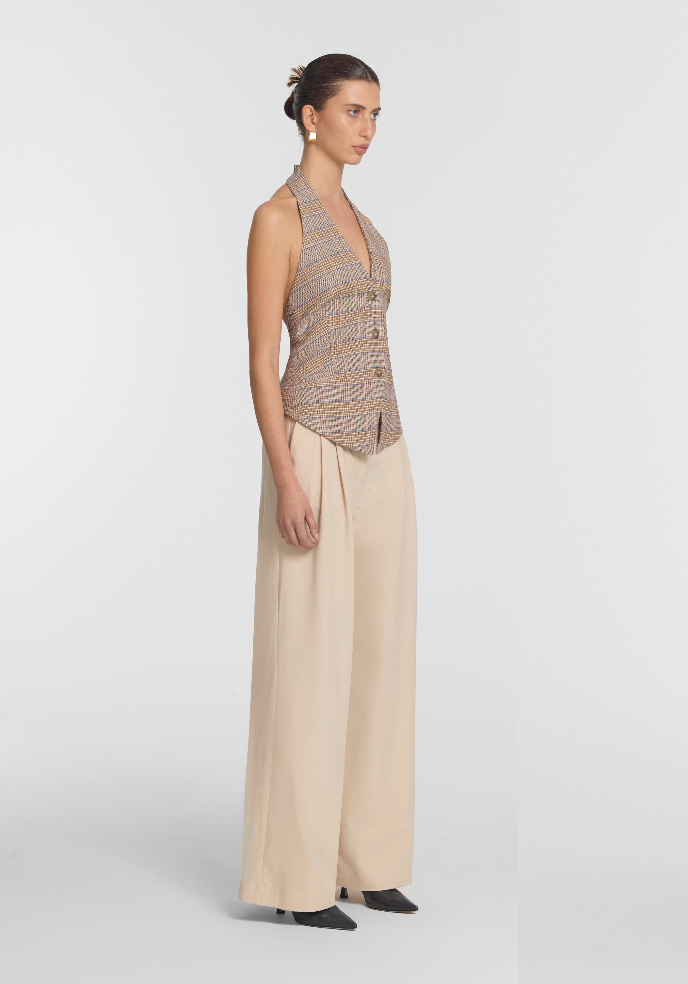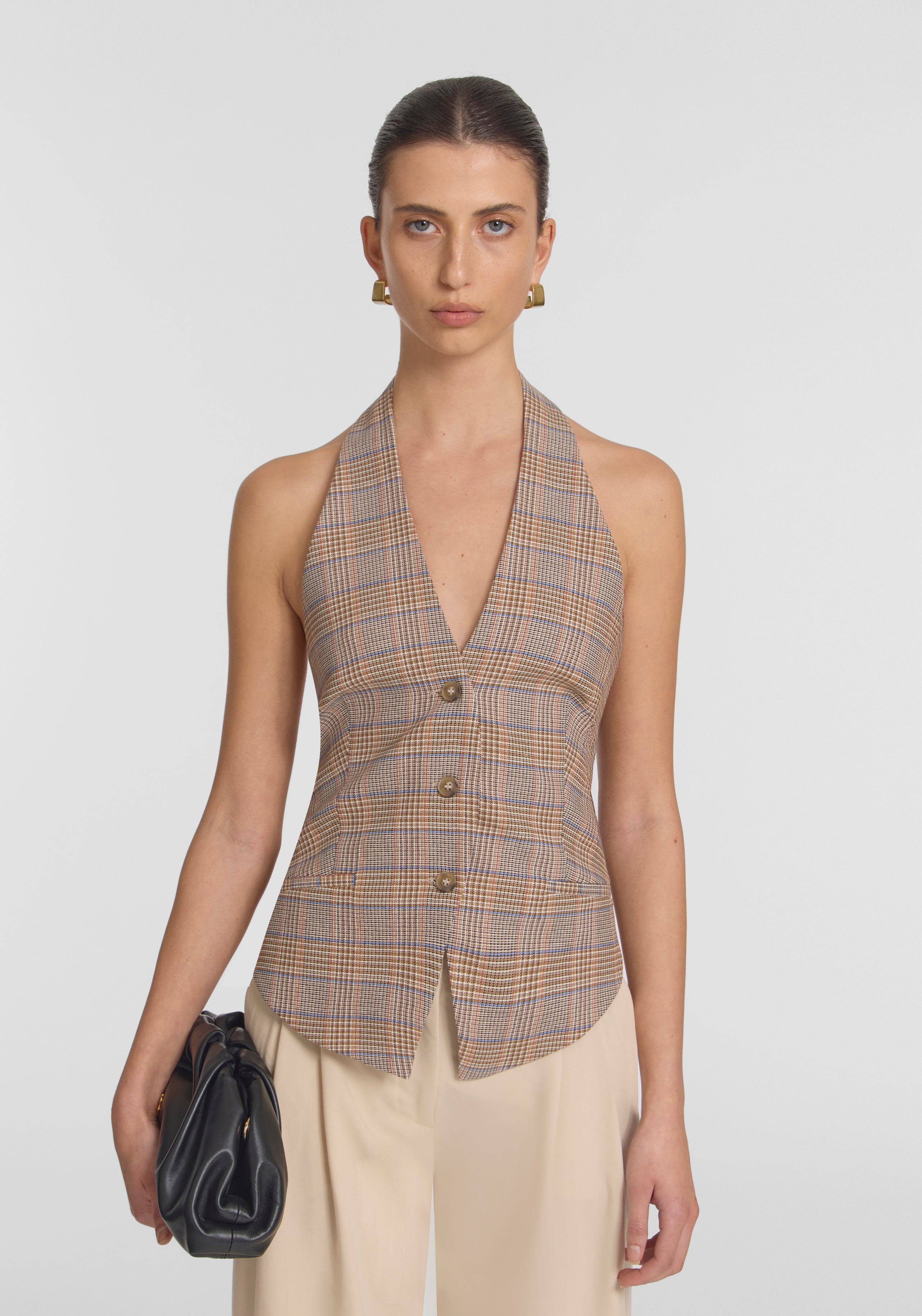 The Pitch Vest brings modern allure to classic tailoring, crafted in a captivating neutral check. Cut in a halter silhouette, it showcases a V-neckline, single-breasted front, and an open back that commands attention, finished with an adjustable belt and branded sliders. Style with everyday neutrals or pair with the Sunbeam Capri or Flint Short for a statement set.