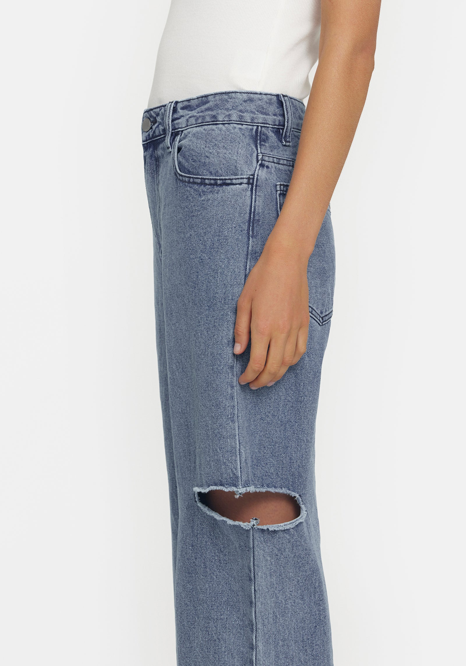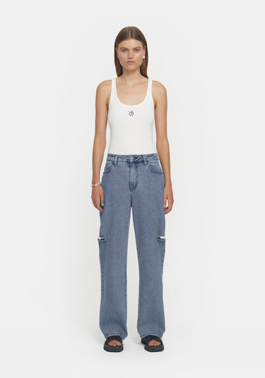 The Prince Jean is your new go-to for everyday denim with a chic edge. Crafted from rigid denim in a vintage wash, it features a flattering high-waisted profile with striking distressed cutouts above the knee, and a black branded leather patch. Whether styled with a ribbed tank for a casual vibe or dressed up with a blazer and heels for a polished look, the Prince Jean effortlessly elevates your wardrobe.