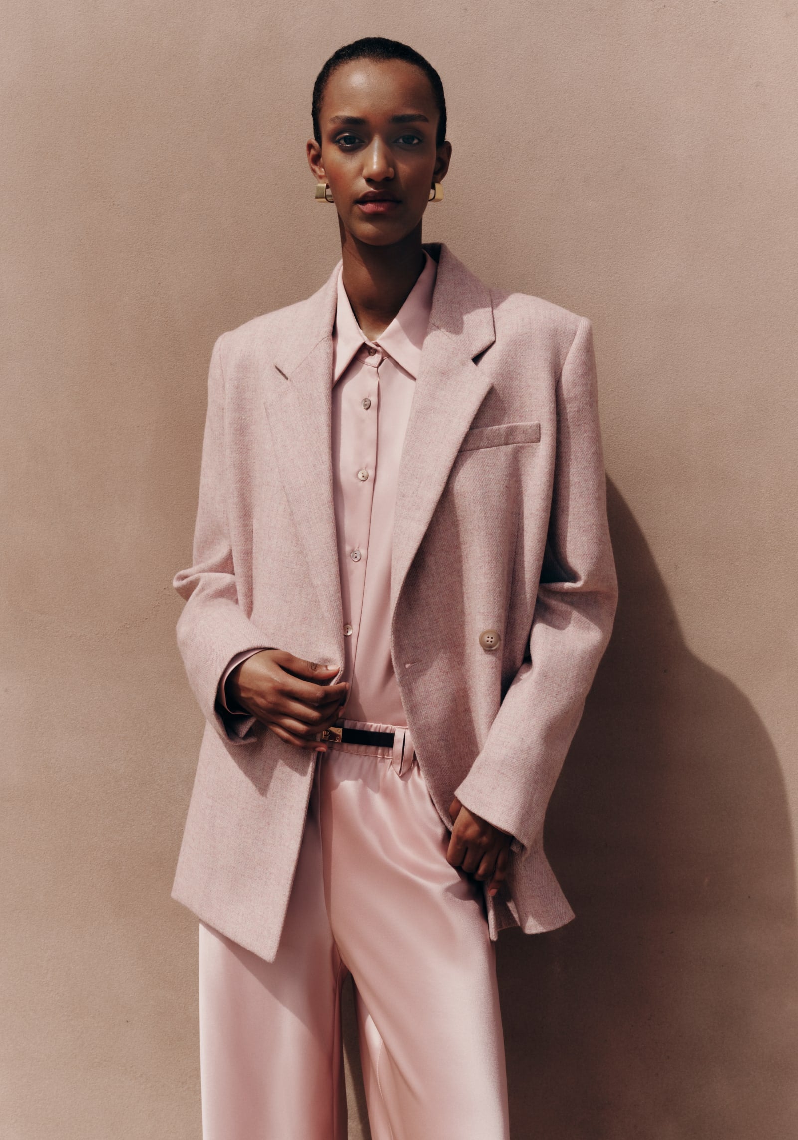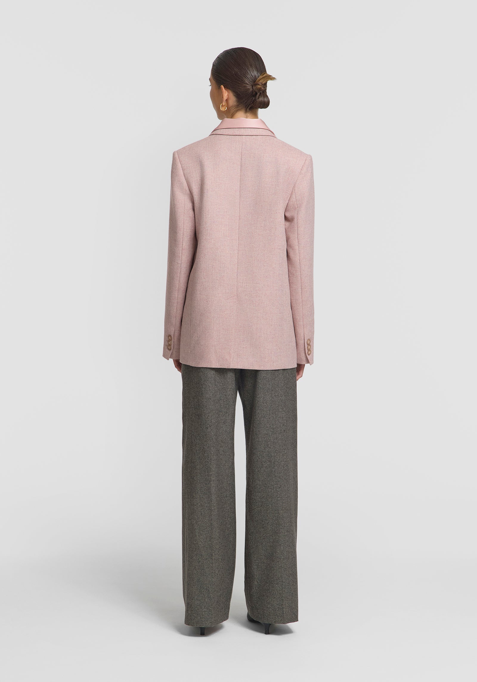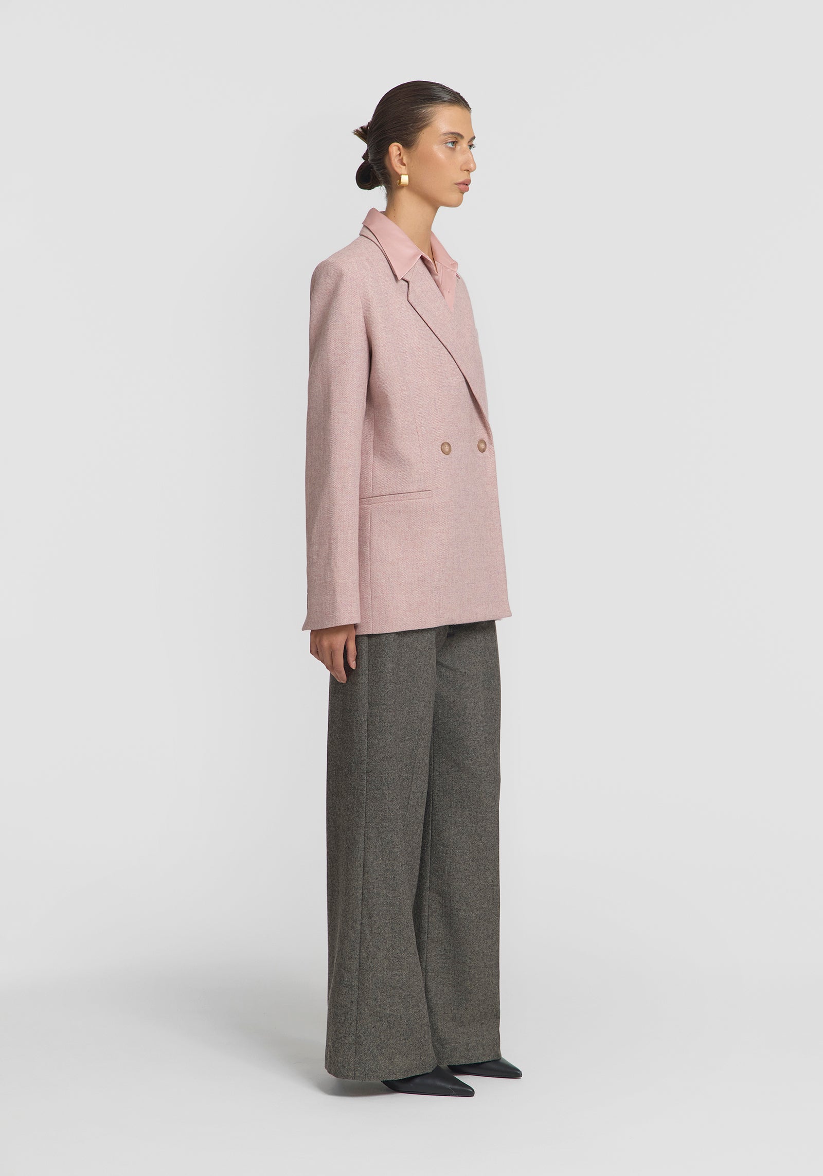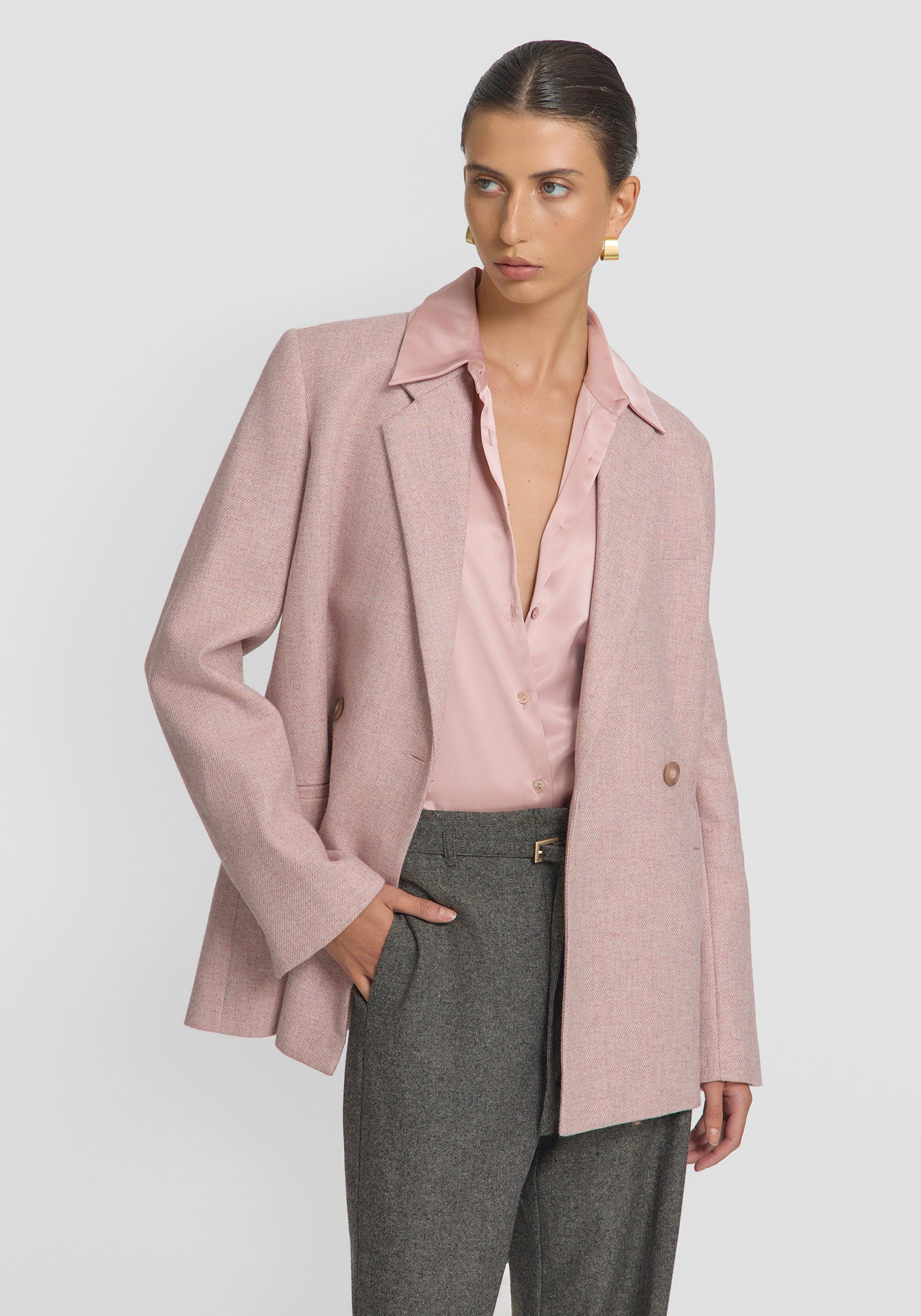 Crafted for life, the Prosperity Blazer in smokey rose pink exudes refined elegance. Made from a luxurious wool blend, this double-breasted blazer features a notched lapel and branded logo buttons. Pair with the Arcadia Pant and Solstice Shirt, blending textural richness with fluidity.
