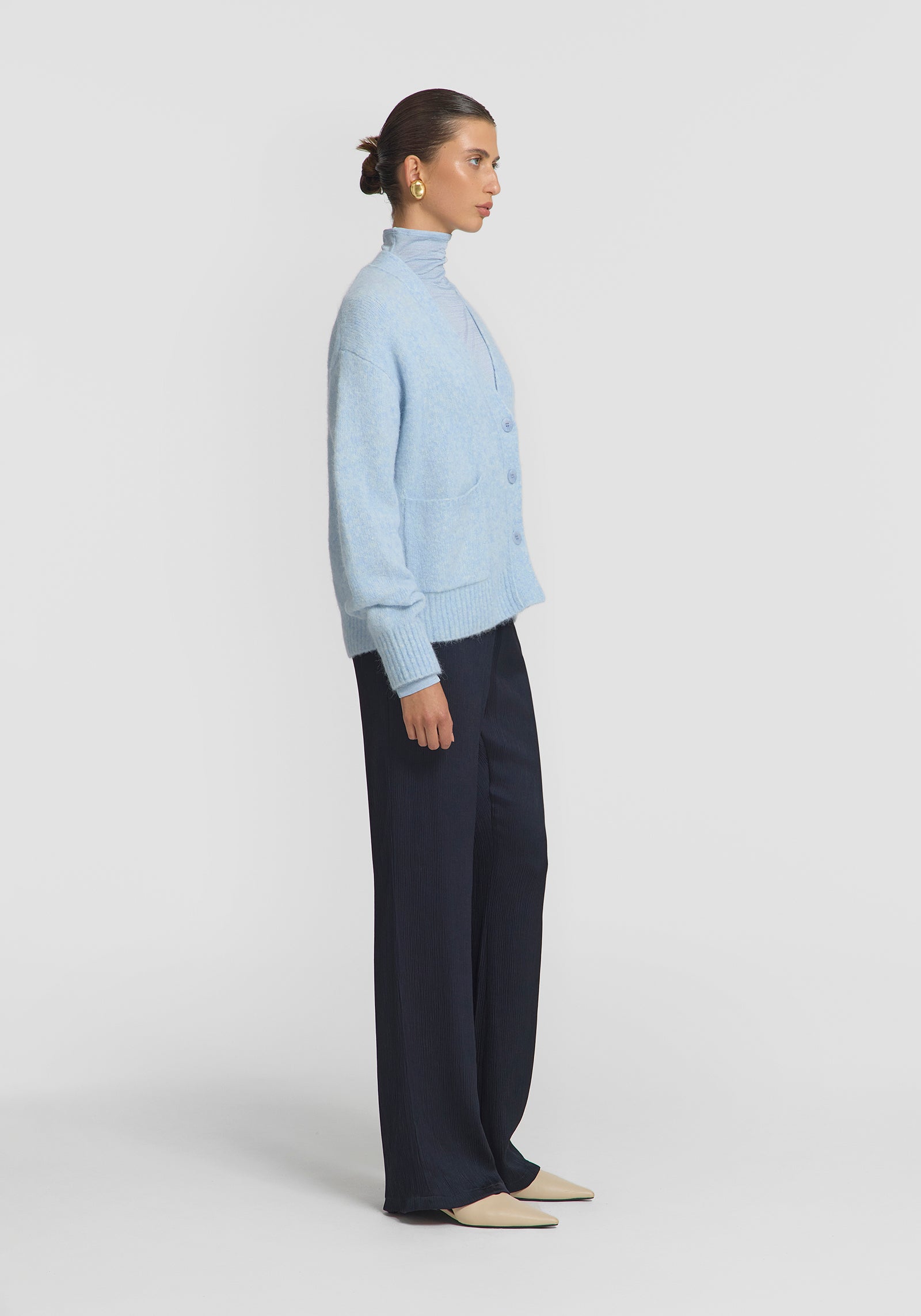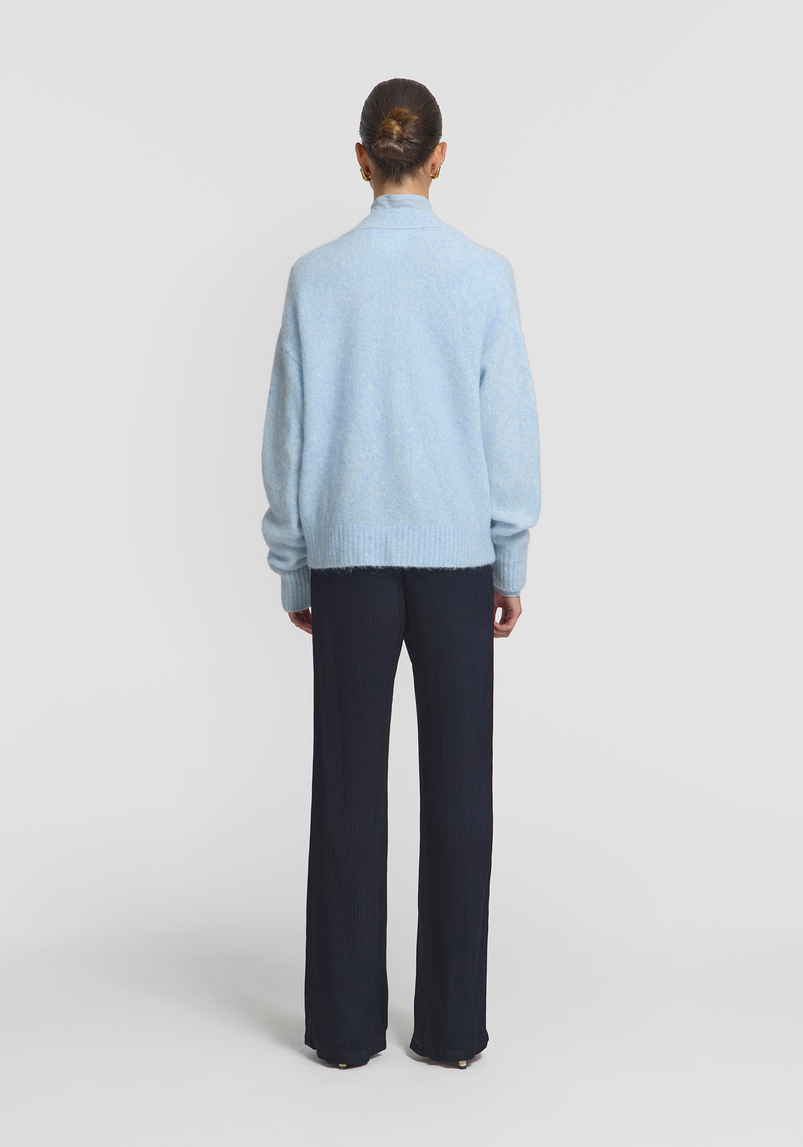 Offering luxurious warmth, the Quebec Cardi is crafted from a fluffy, textured alpaca wool blend in a rich light blue hue. With its relaxed V-neck silhouette, front pockets, ribbed cuffs and hem, it blends effortless style with cosy comfort. Pair with the Moonlight Skivvy for a tonal layered look, or denim for easy, everyday outfitting.