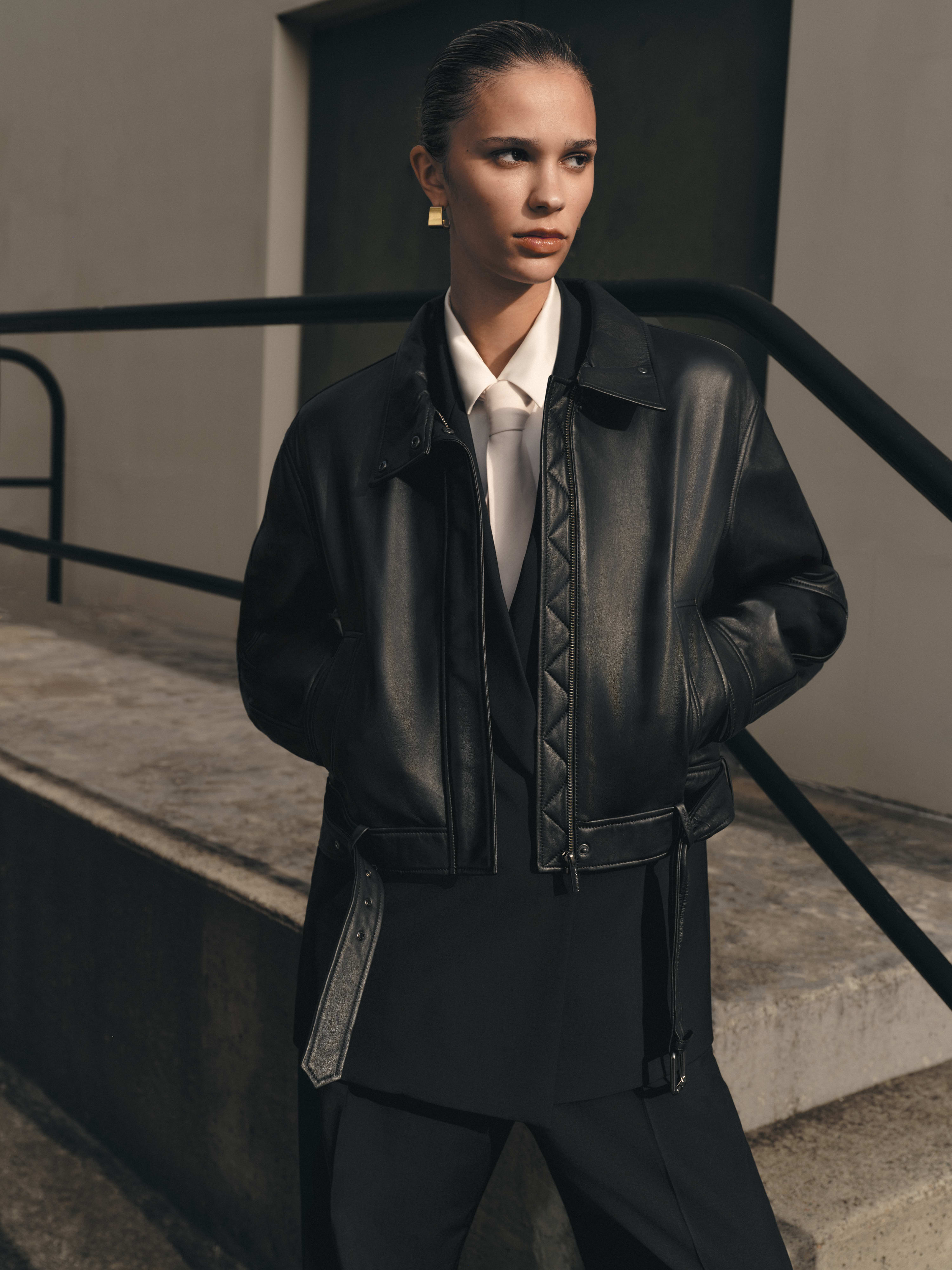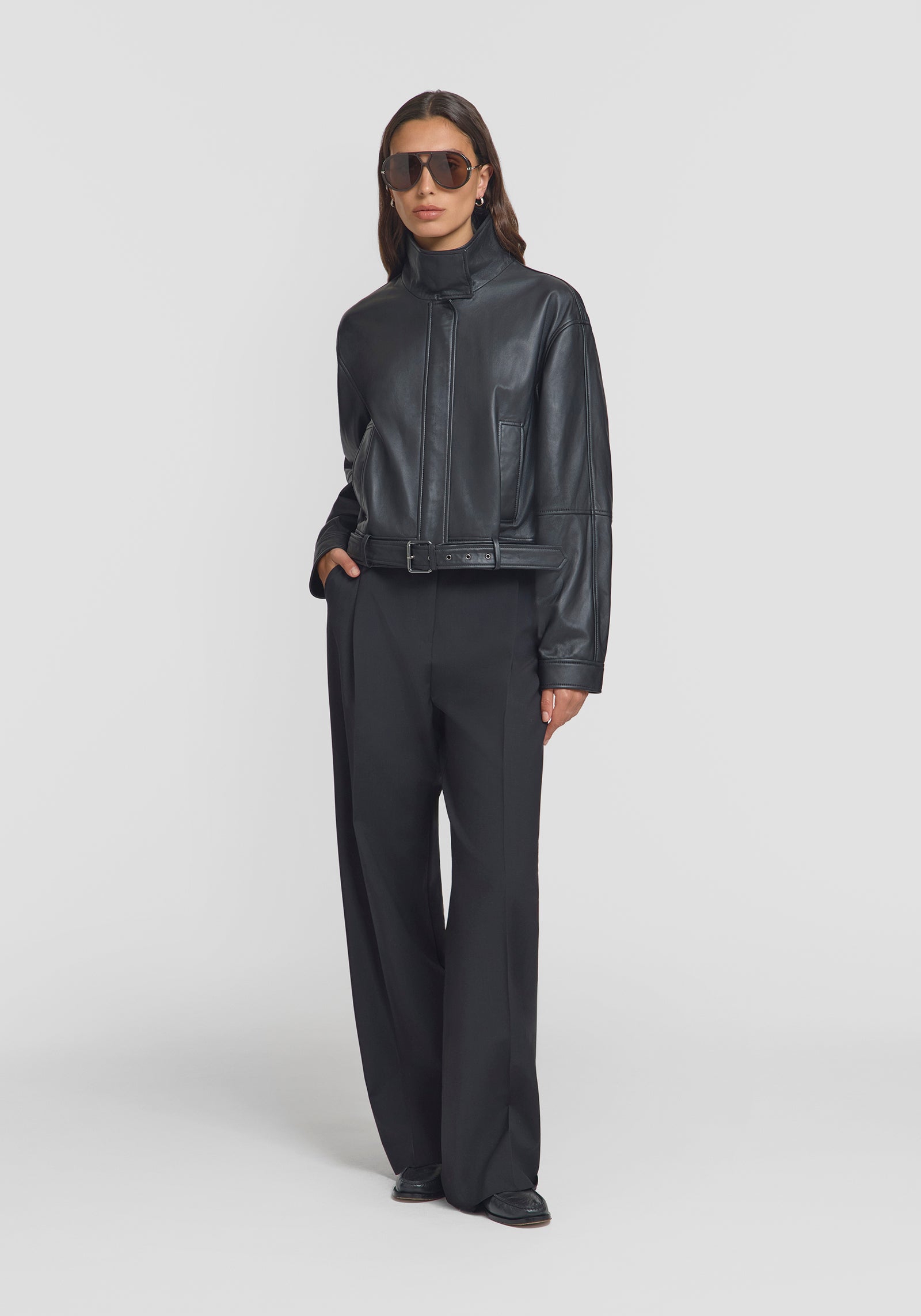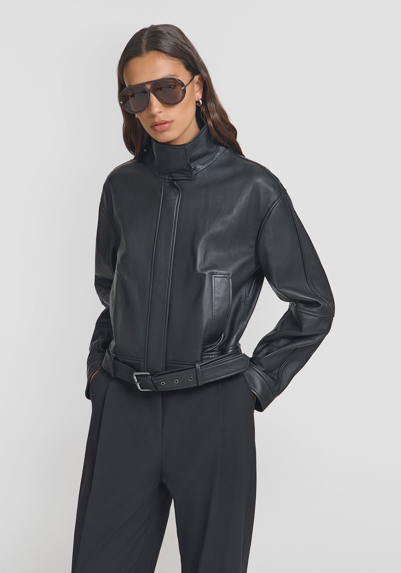 A season favourite, the Rampage Leather Bomber Jacket exudes modern sophistication. Crafted from matte black nappa leather, this limited edition piece features an exaggerated wide collar, concealed front zip, and debossed logo at the back neck. Finished with front pockets and a removable waist belt, it’s a timeless essential designed to be worn for seasons to come.
