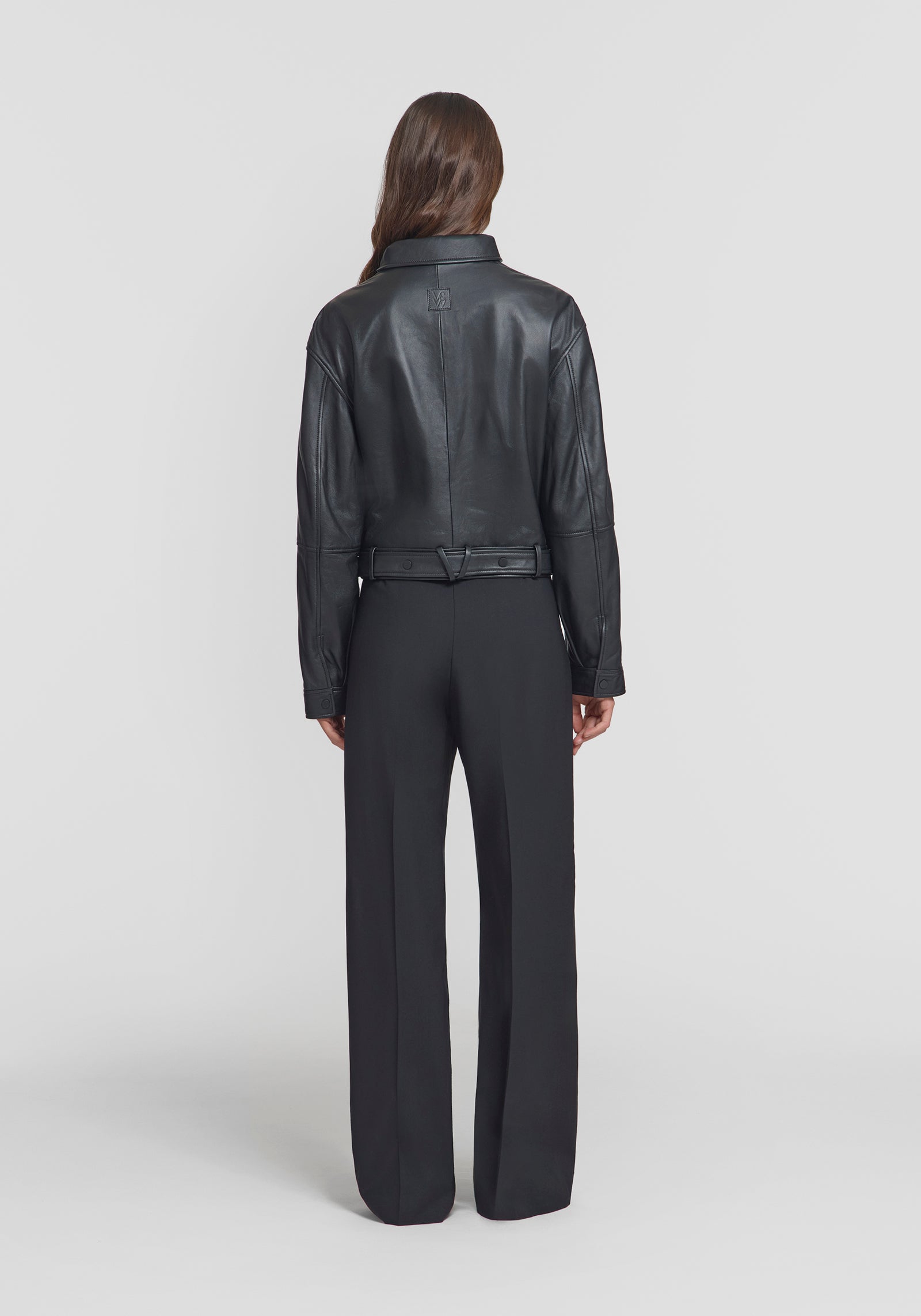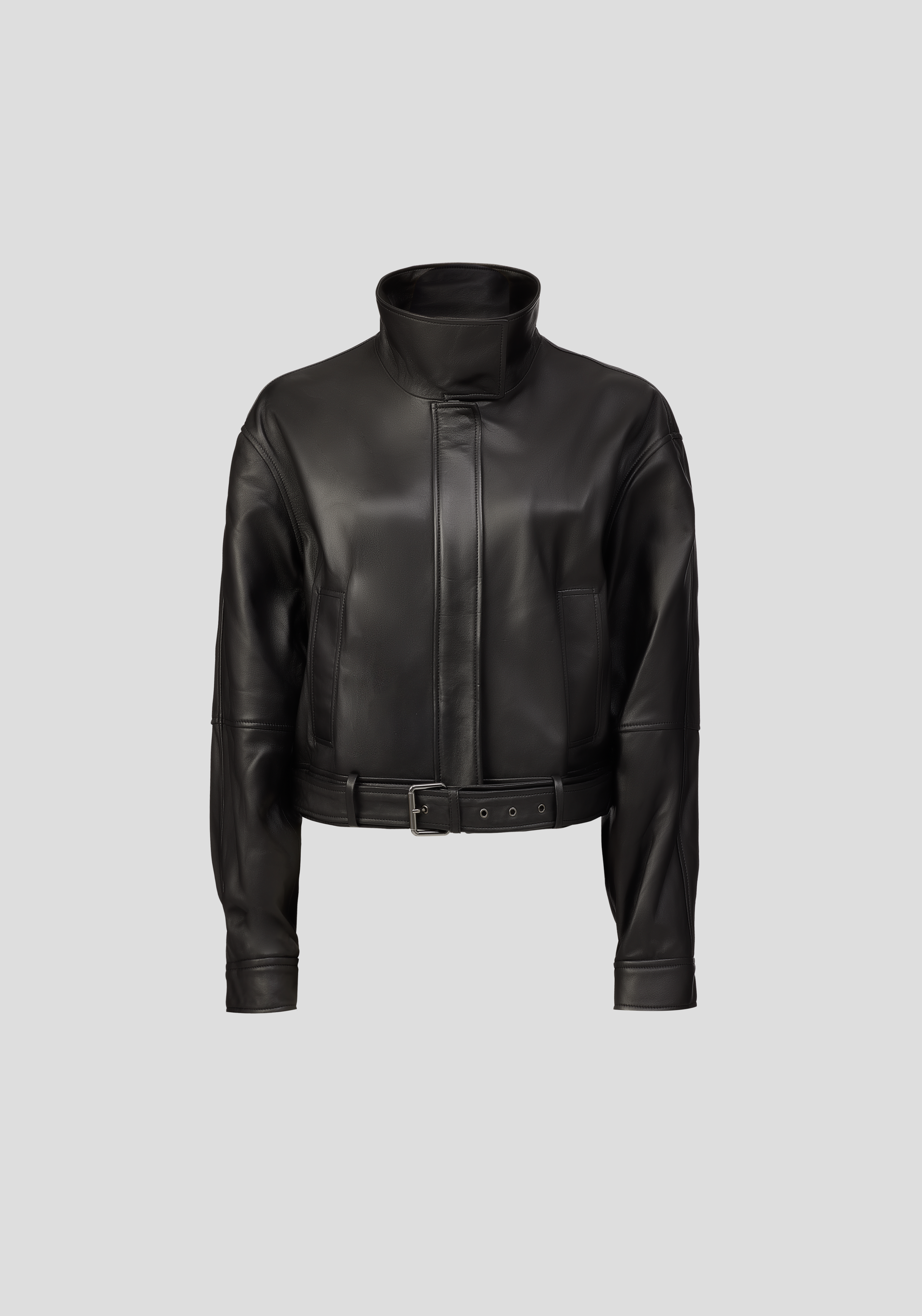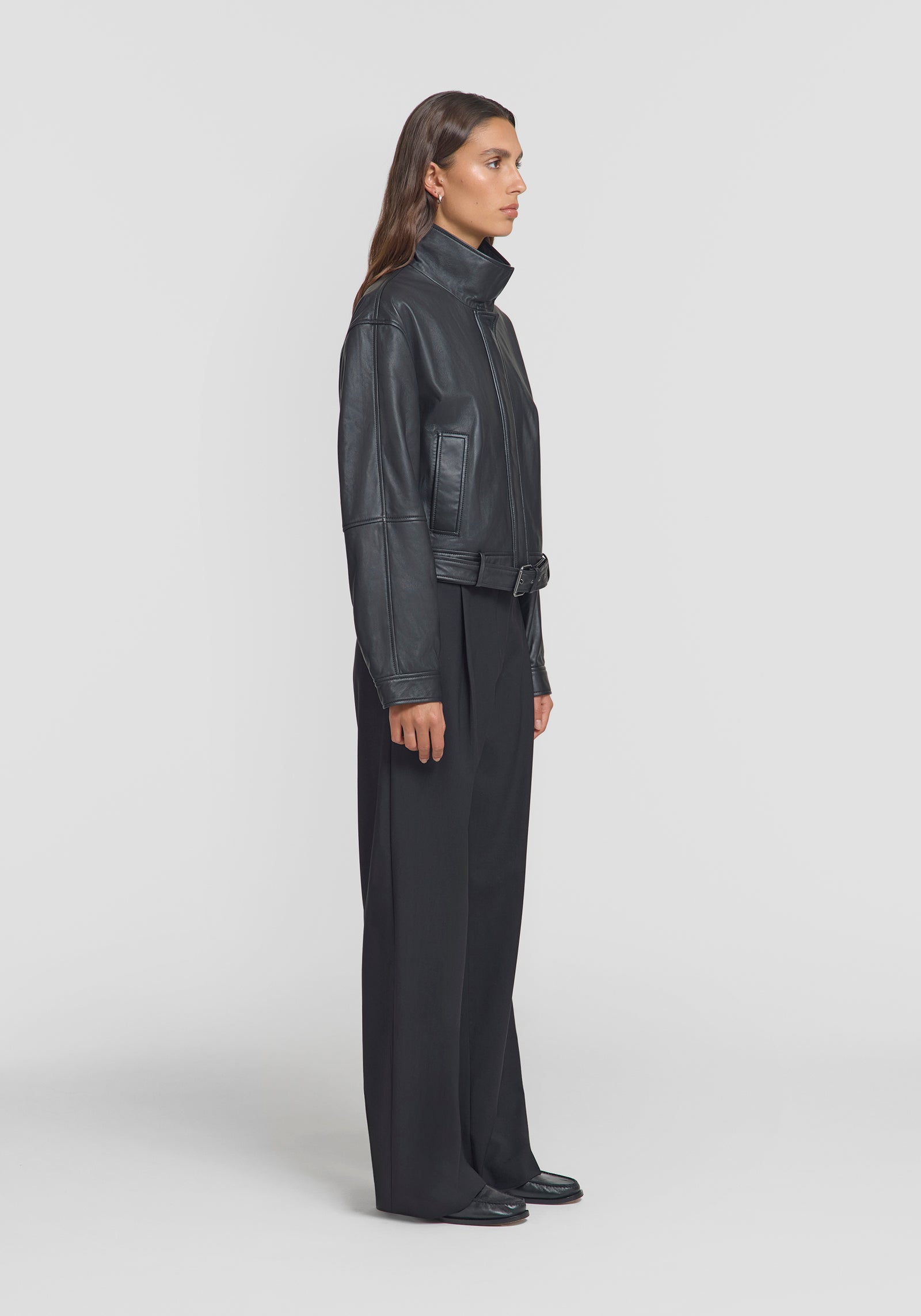 A season favourite, the Rampage Leather Bomber Jacket exudes modern sophistication. Crafted from matte black nappa leather, this limited edition piece features an exaggerated wide collar, concealed front zip, and debossed logo at the back neck. Finished with front pockets and a removable waist belt, it’s a timeless essential designed to be worn for seasons to come.