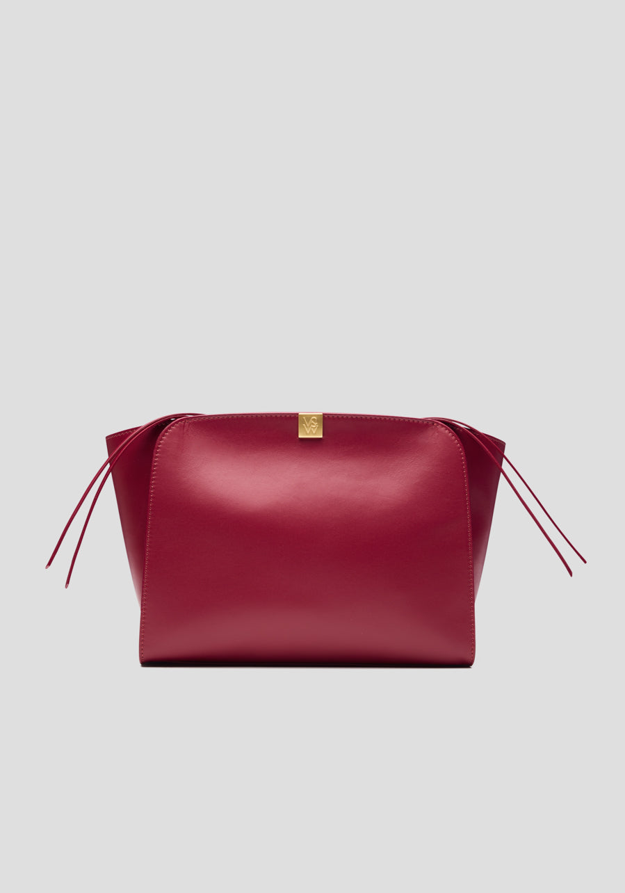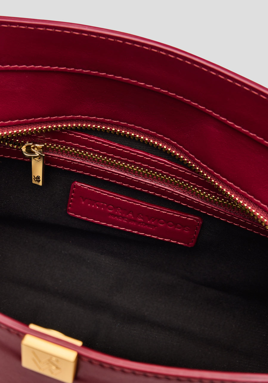 The Regan Bag, crafted from Italian nappa leather in a garnet hue, offers refined elegance. With gold V&W hardware, a zip closure, and internal pockets, it pairs effortlessly with the Damascus Heel in the same hue for occasion wear, or grounds neutral tailoring for elevated everyday dressing.