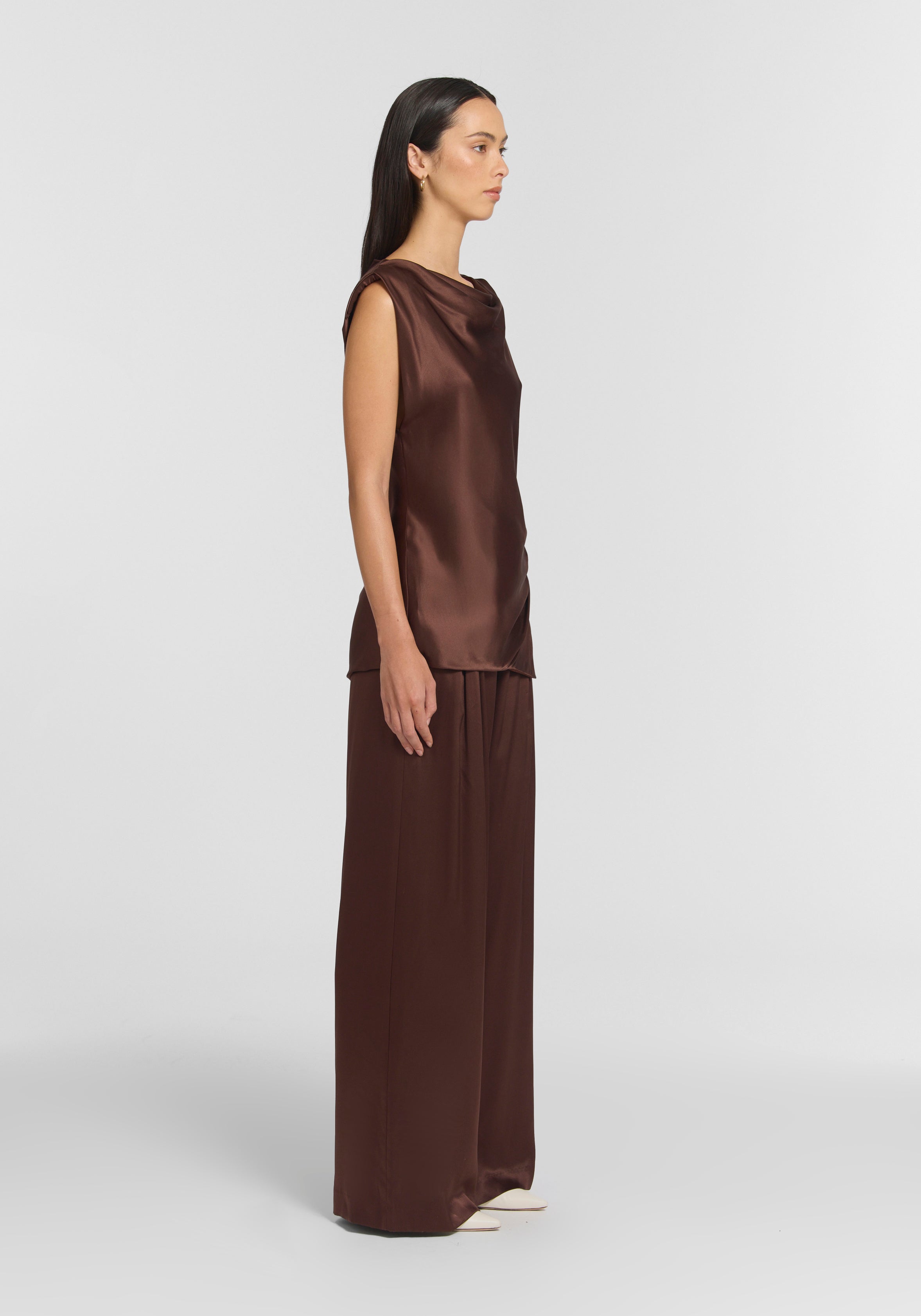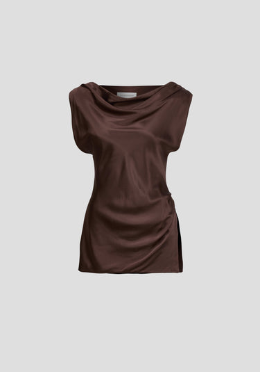 Radiating elegant simplicity, the Revere Top is crafted in a rich chocolate silk. Cut on the bias for a fluid drape, it features a cowl neckline, extended shoulders with removable pads, asymmetric seaming and a side split. Pair with the matching Whirlwind Pant for an effortless silky set that embodies fluid elegance and considered proportions.