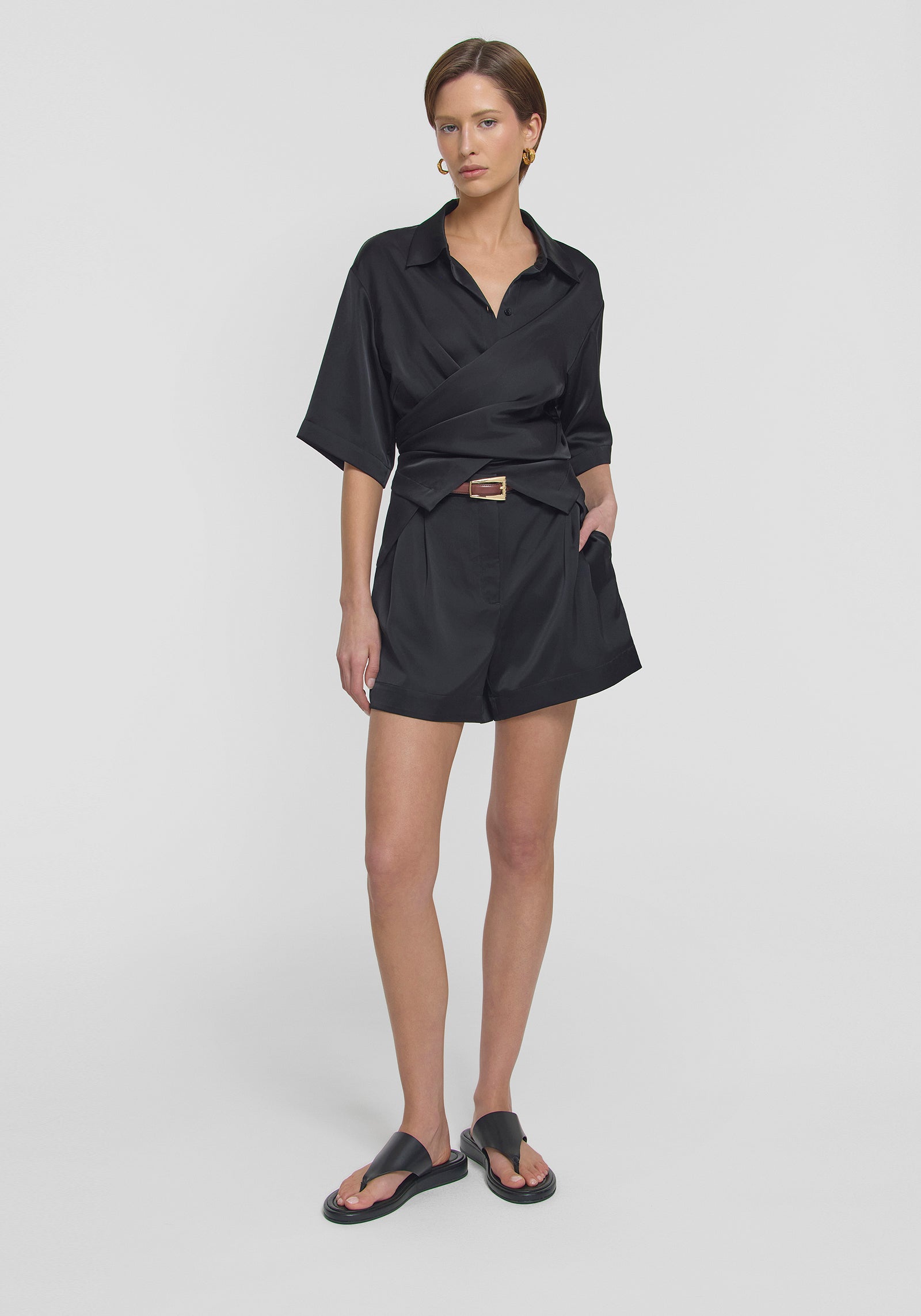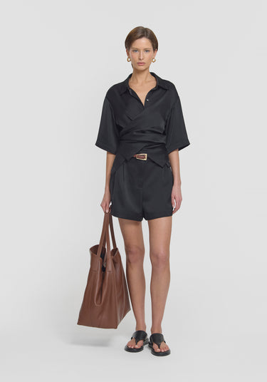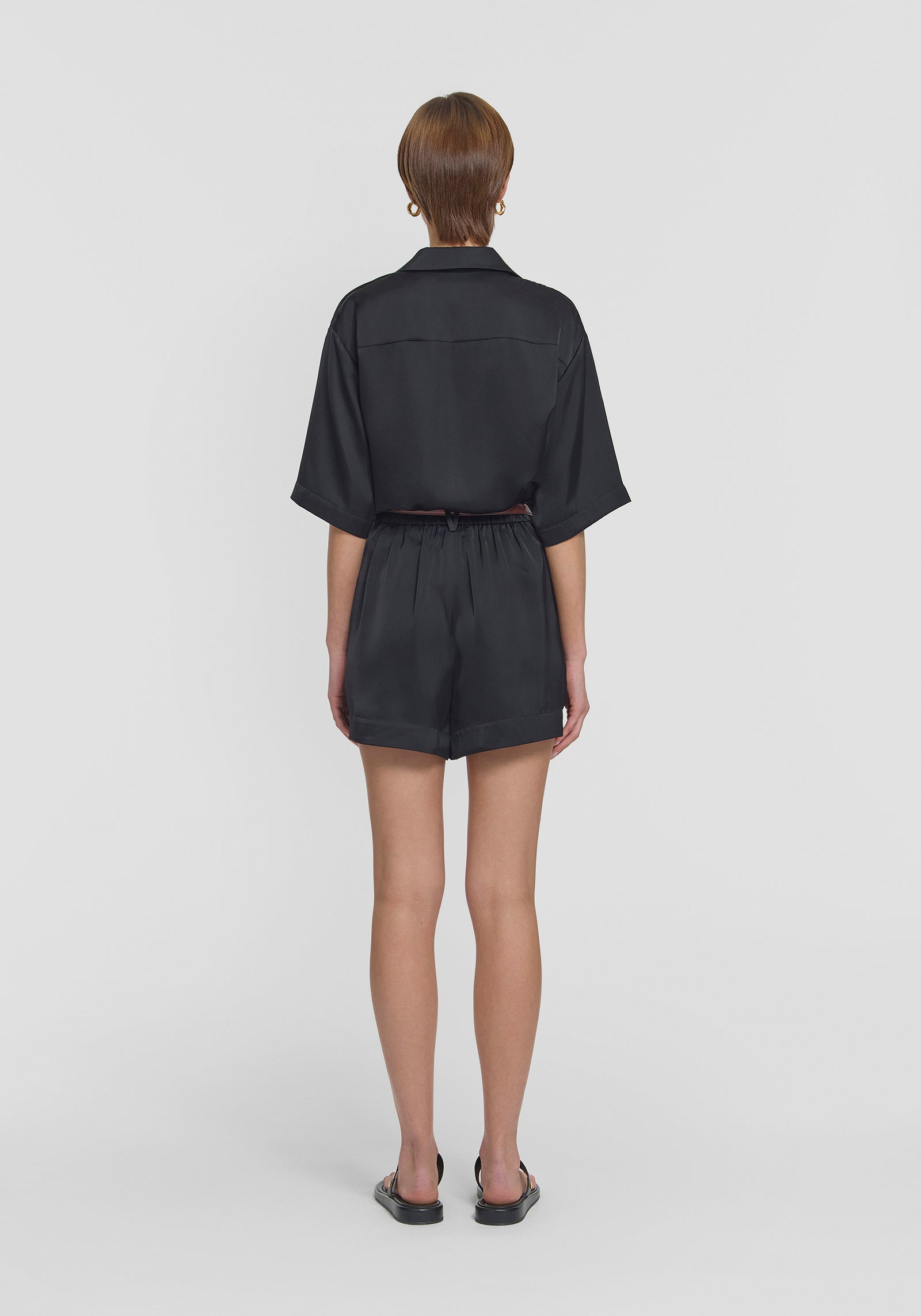 The Ritual Short, crafted from luxurious black cupro, offers everyday refinement and timeless style. Boasting a high-waisted silhouette, detailed with subtle front pleats, pockets, and belt loops. Pair with the Musical Shirt for a polished, enduring set that will carry you effortlessly through the warmer months.