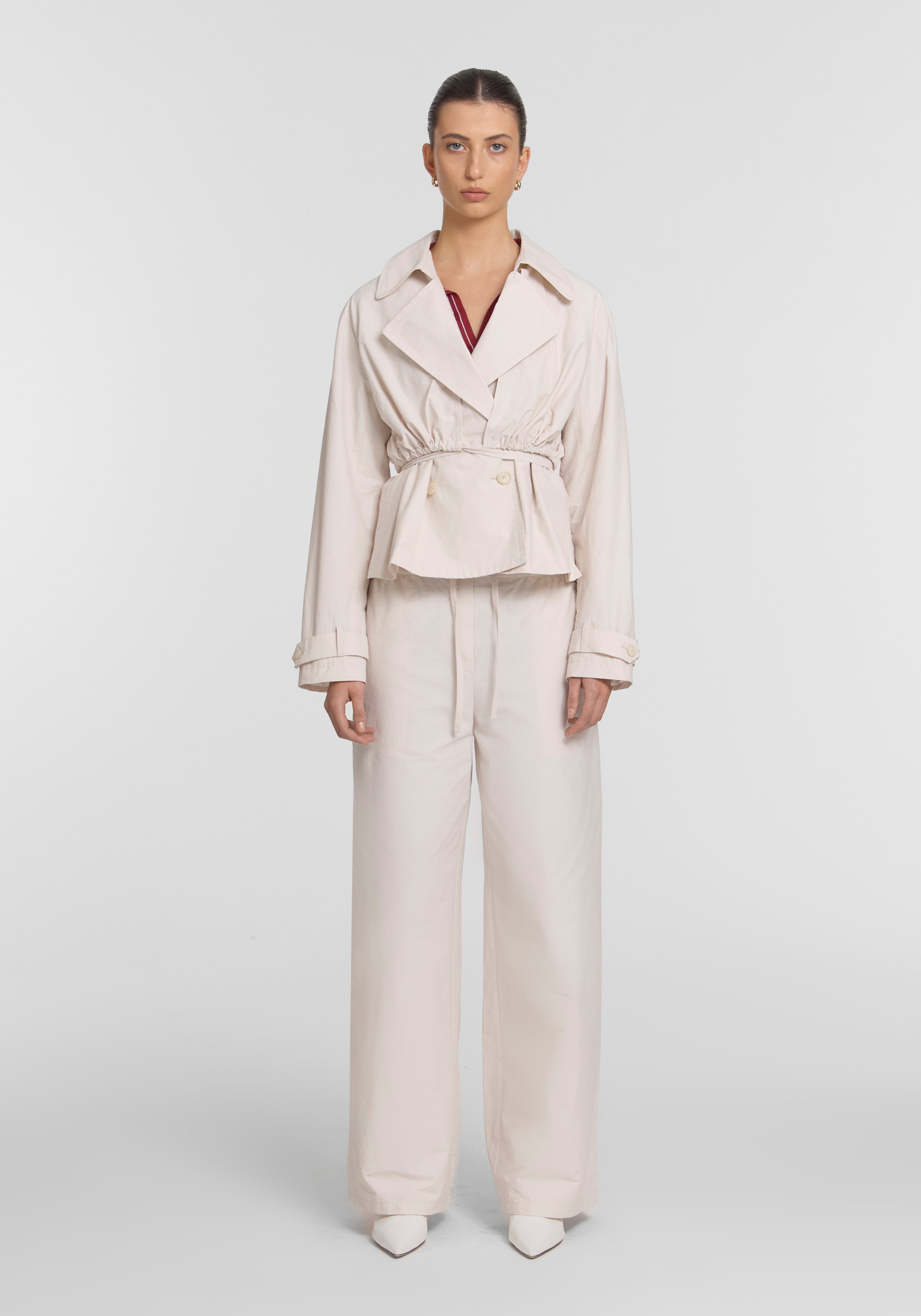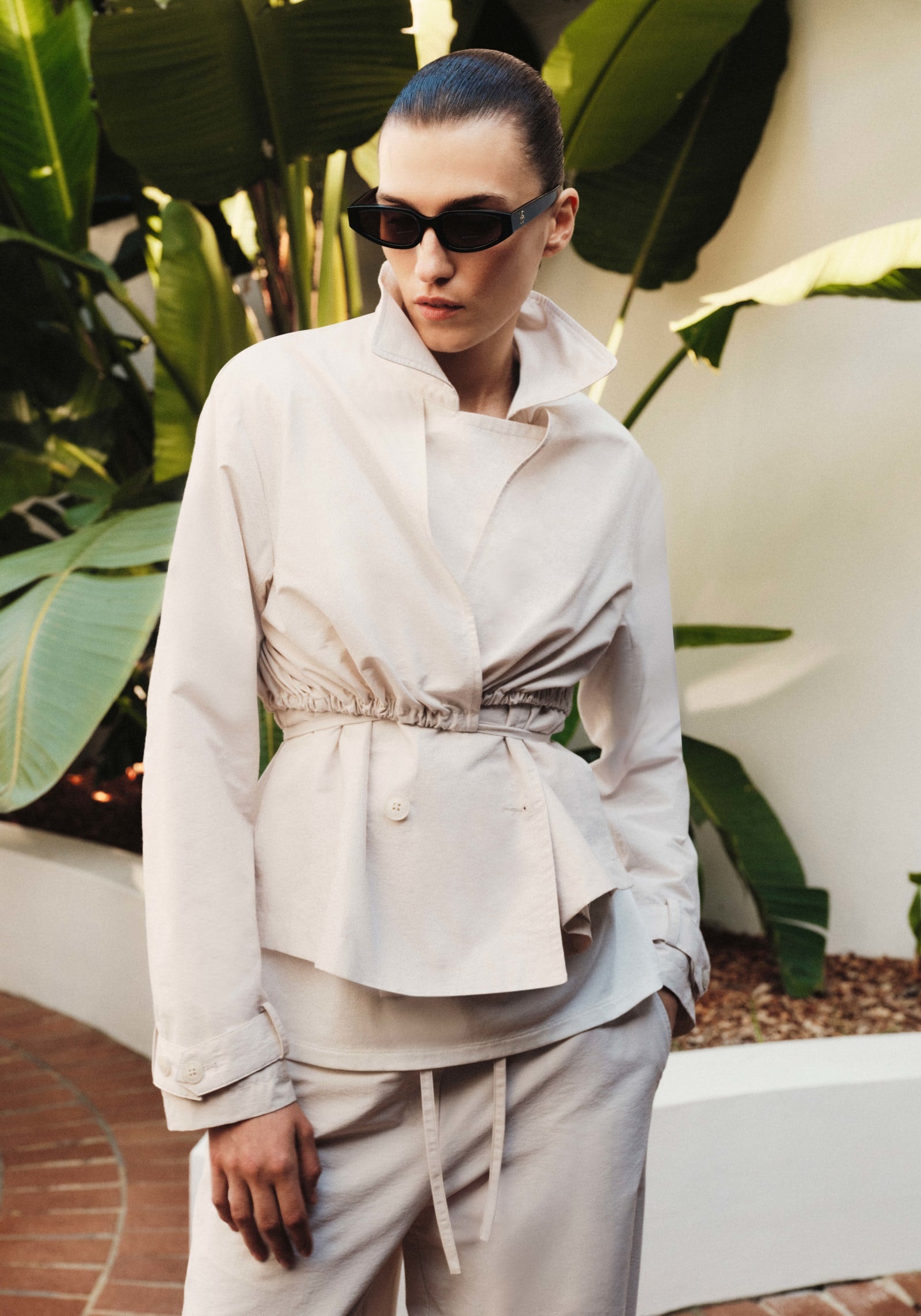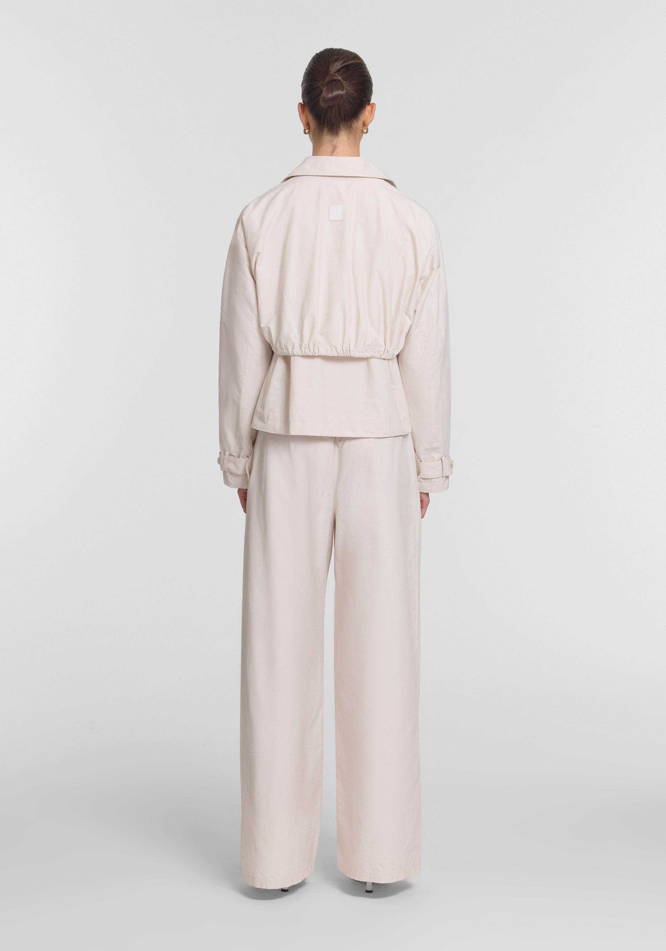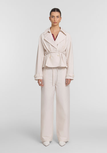 The Rocket Bomber Trench, a hybrid silhouette crafted from a cotton blend inspired by technical sportswear, comes in a fresh sea salt white hue. This double-breasted cropped trench features an oversized collar, relaxed shoulders, and stormflaps with a drawcord hem. Pair with the Maverick Pant for a chic sport-luxe moment or with a tailored pant for contrasting architectural elegance.