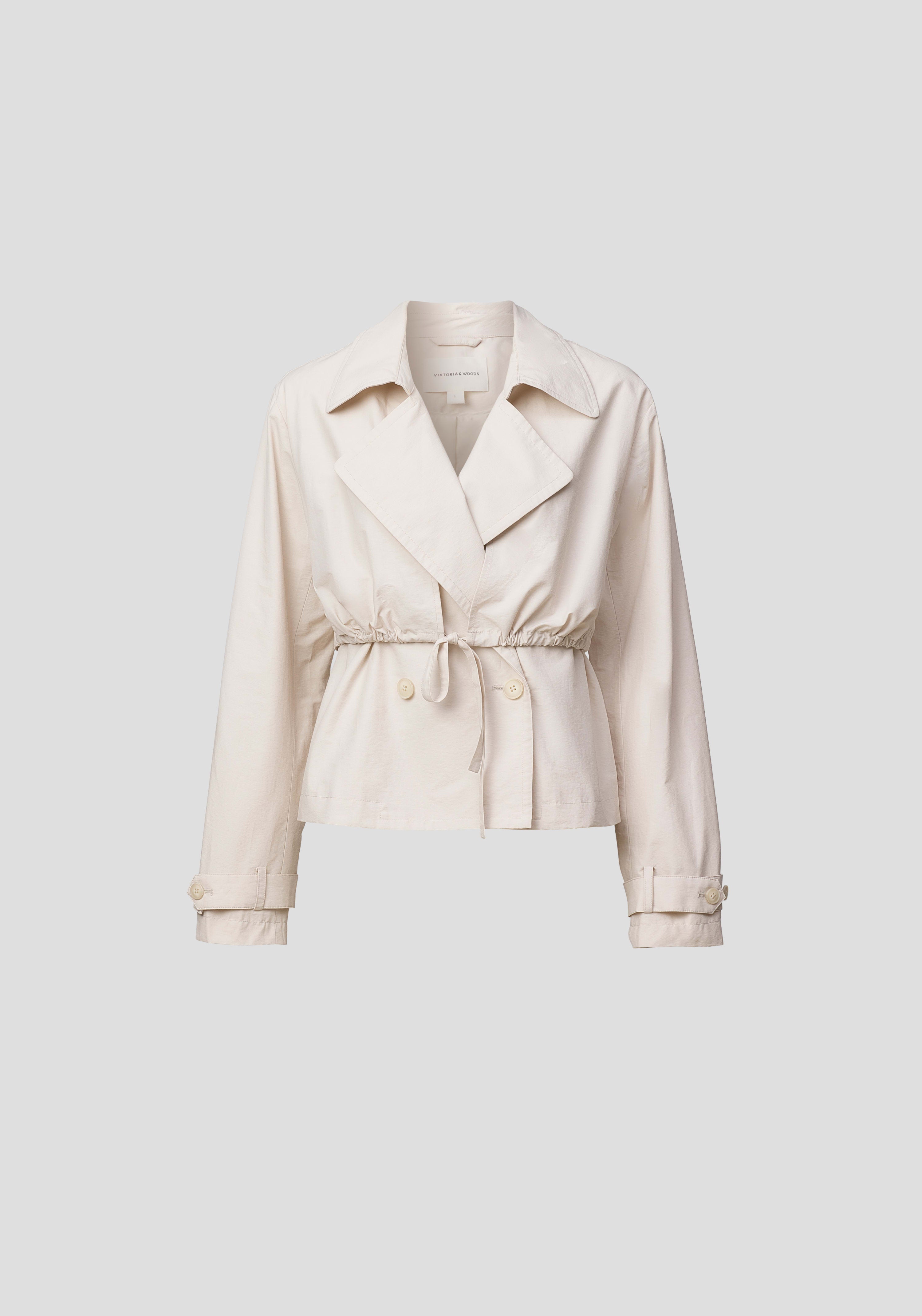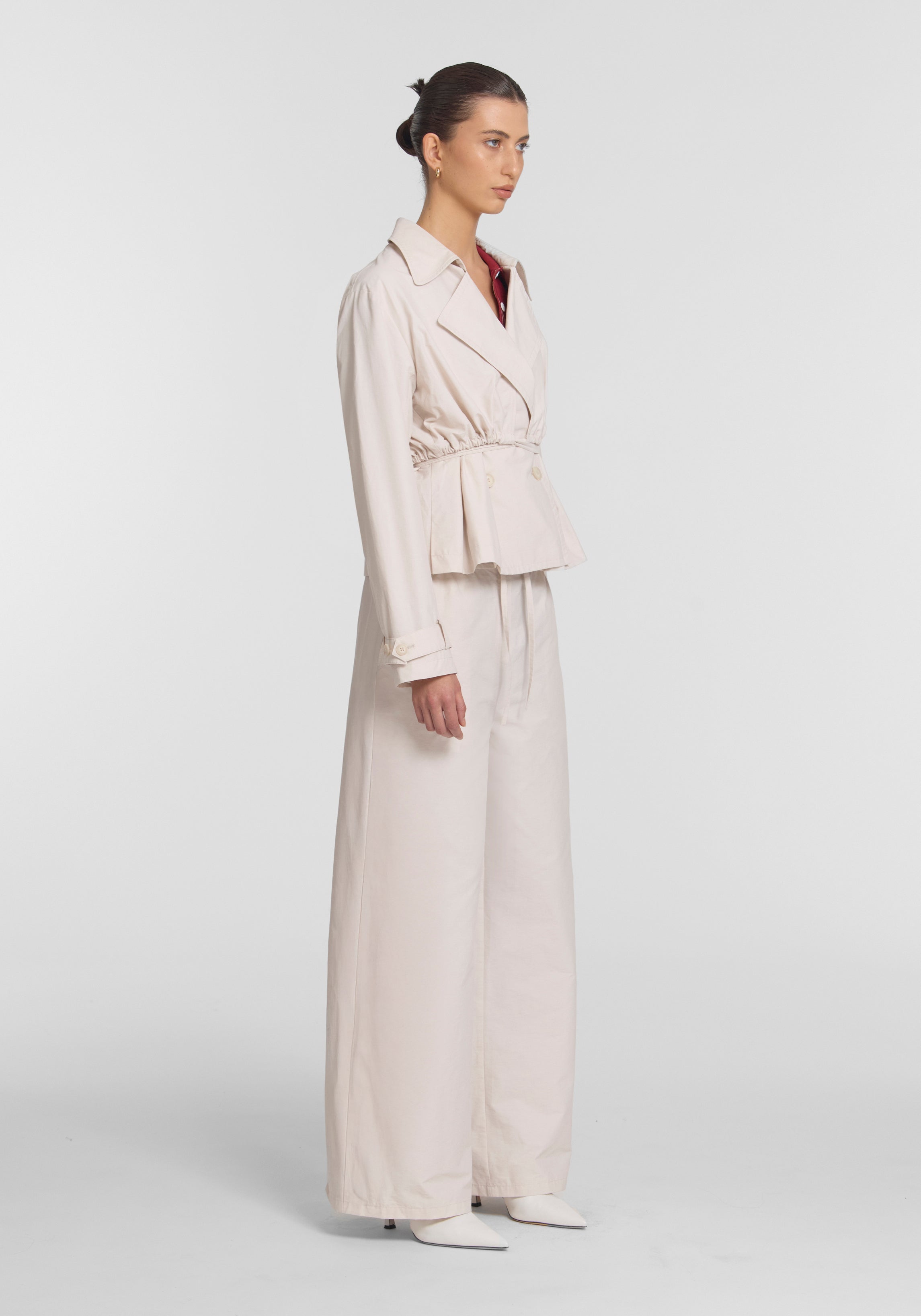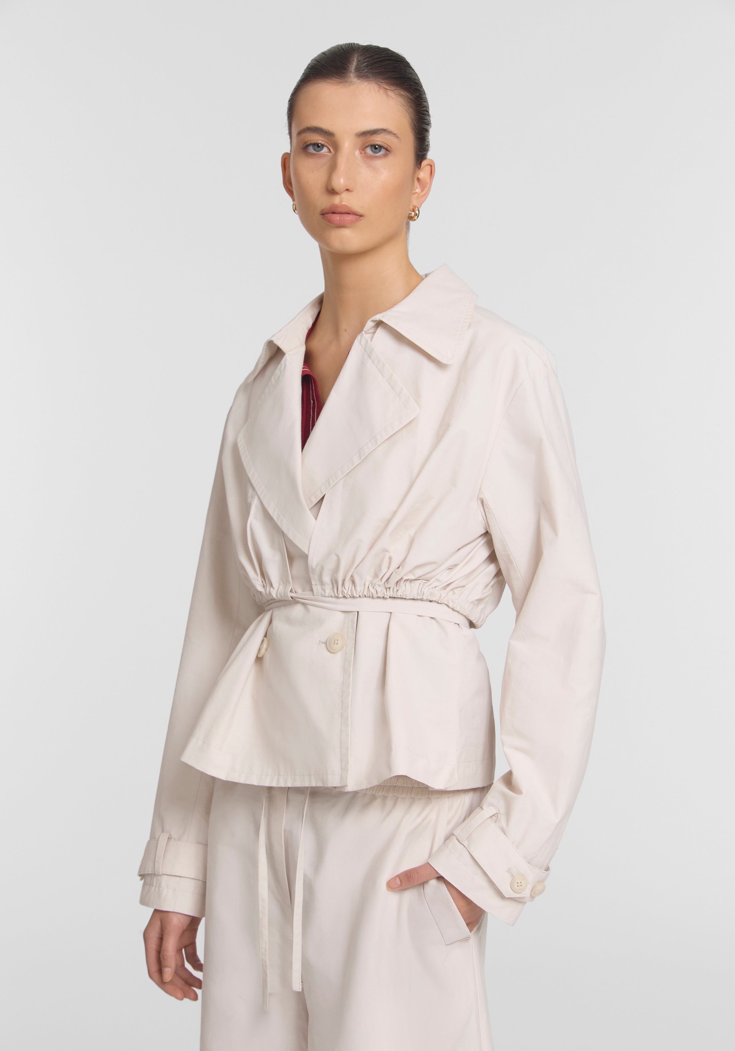 The Rocket Bomber Trench, a hybrid silhouette crafted from a cotton blend inspired by technical sportswear, comes in a fresh sea salt white hue. This double-breasted cropped trench features an oversized collar, relaxed shoulders, and stormflaps with a drawcord hem. Pair with the Maverick Pant for a chic sport-luxe moment or with a tailored pant for contrasting architectural elegance.