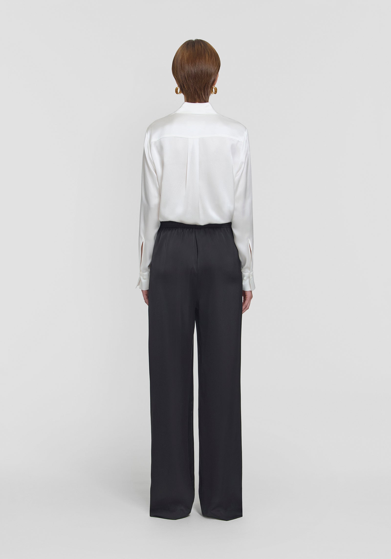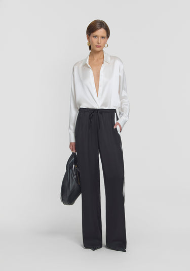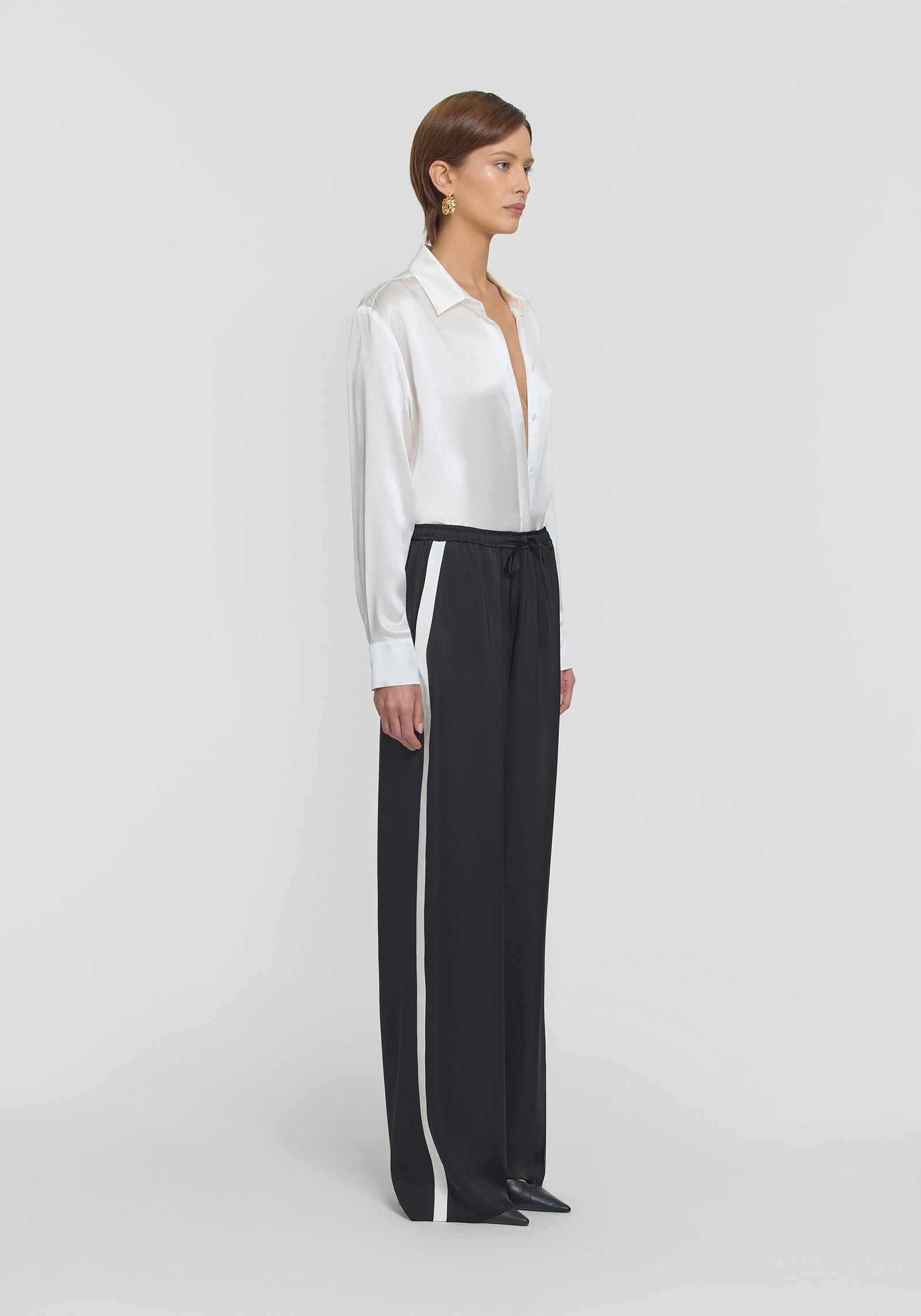 A modern take on cupro set dressing, the Rocky Pant makes a statement with an ivory panel down the side seam, adding depth to the lightweight black cupro. With a loosely tailored silhouette, wide leg, and an elasticated waistband with functional drawcord, it pairs perfectly with the Billy Top for effortlessly chic styling with an element of sportsluxe.