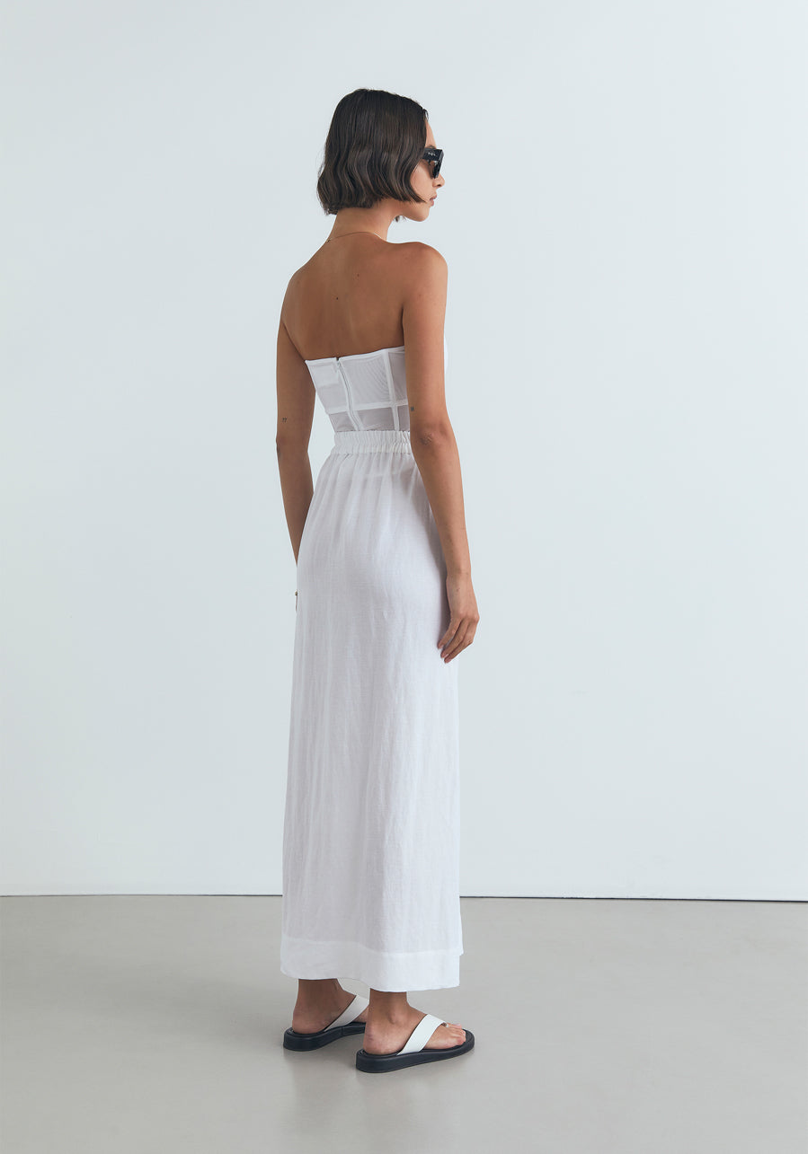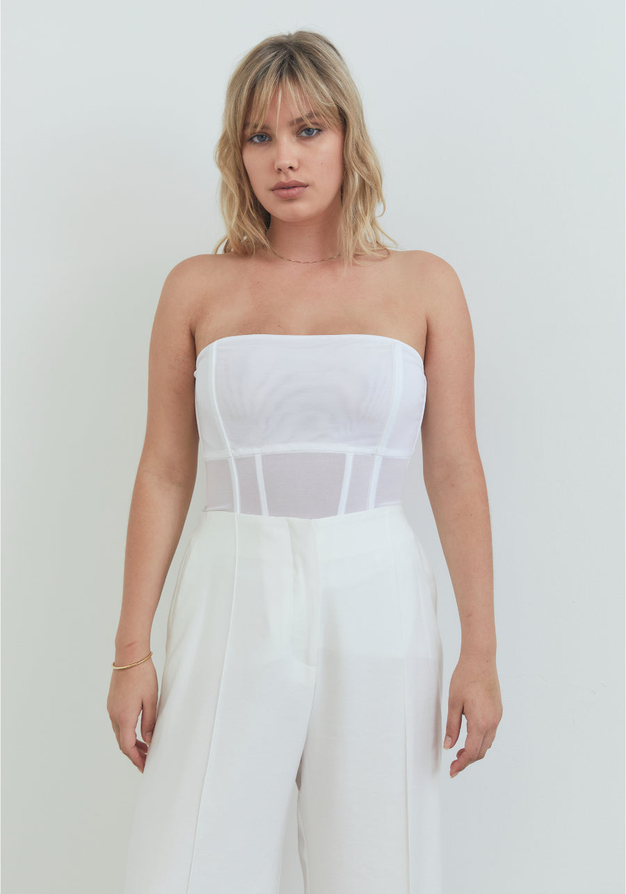 The Rome Bustier is the latest addition to the power mesh journey, in classic white. Showcasing a confident strapless neckline and boning detailing, this corset style top is finished with a back zipper and lined upper bust panel.