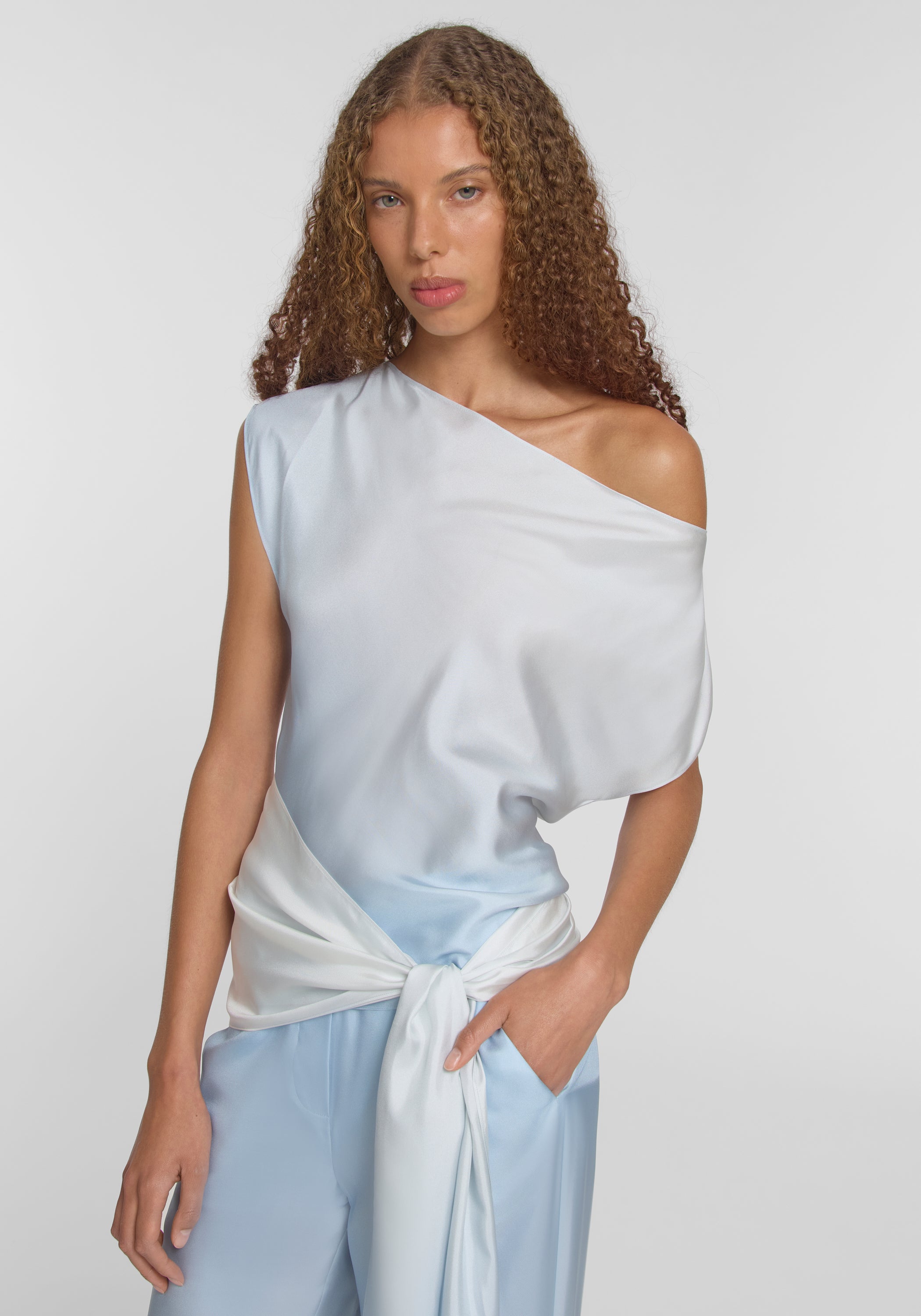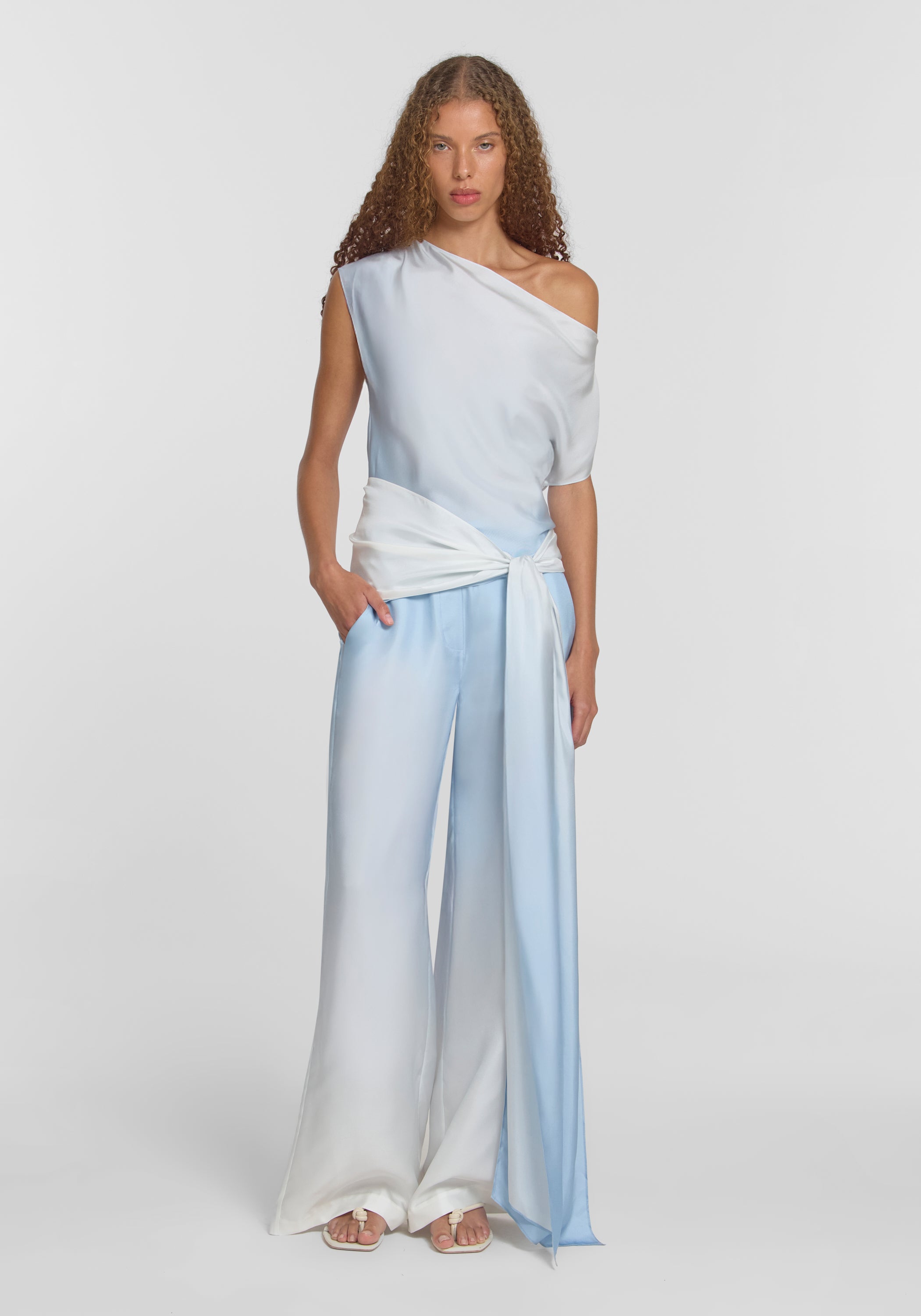 The Rosemary Top is crafted from luxurious, weightless silk and realised in a soft blue ombre print, echoing the waves of the sea. Bias-cut for a natural drape, it falls effortlessly through the body, showcasing a fluid cowl neckline and extended shoulders. Style with the Willow Pant to form a clean, expressive silhouette, an artful, wearable landscape.