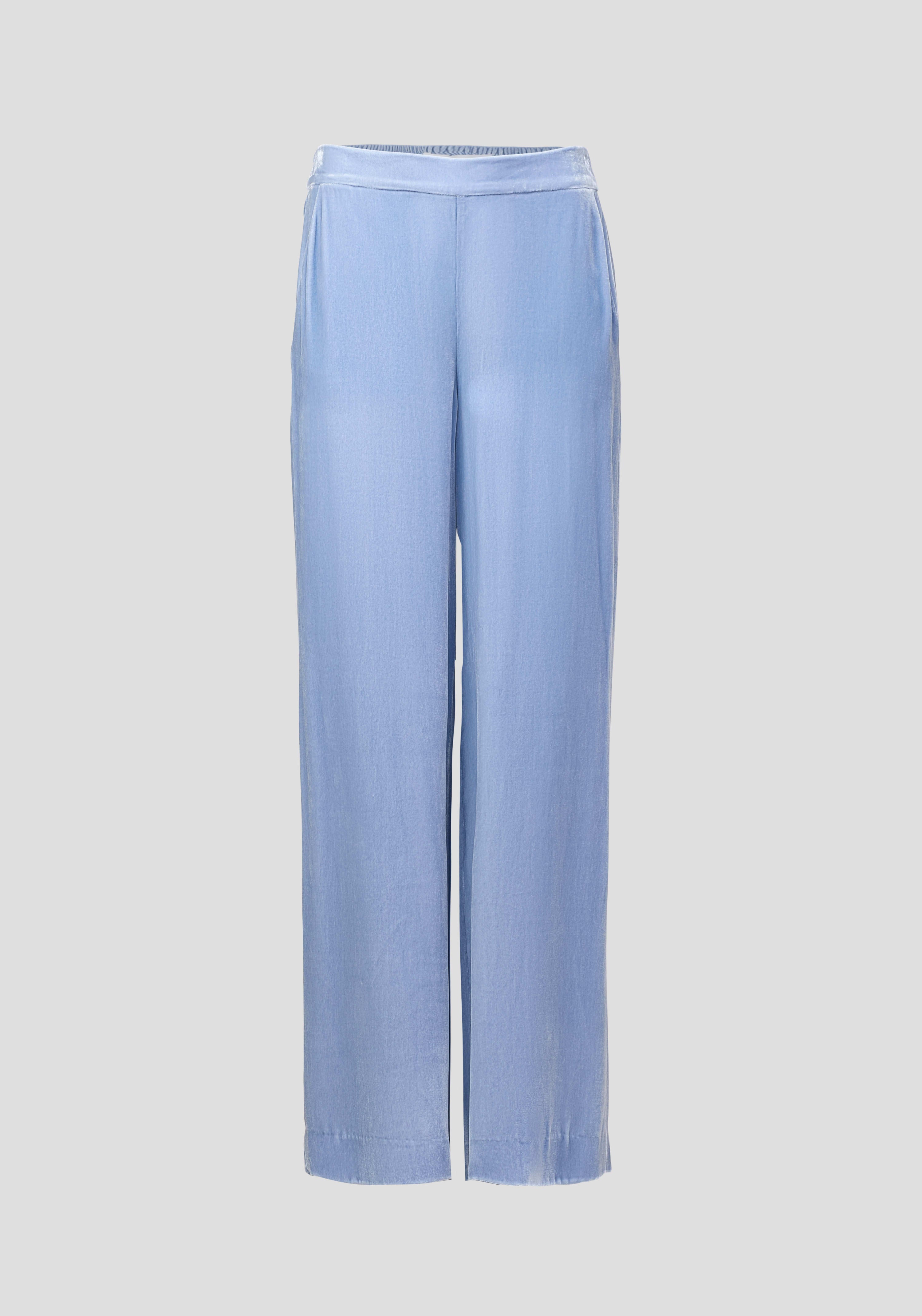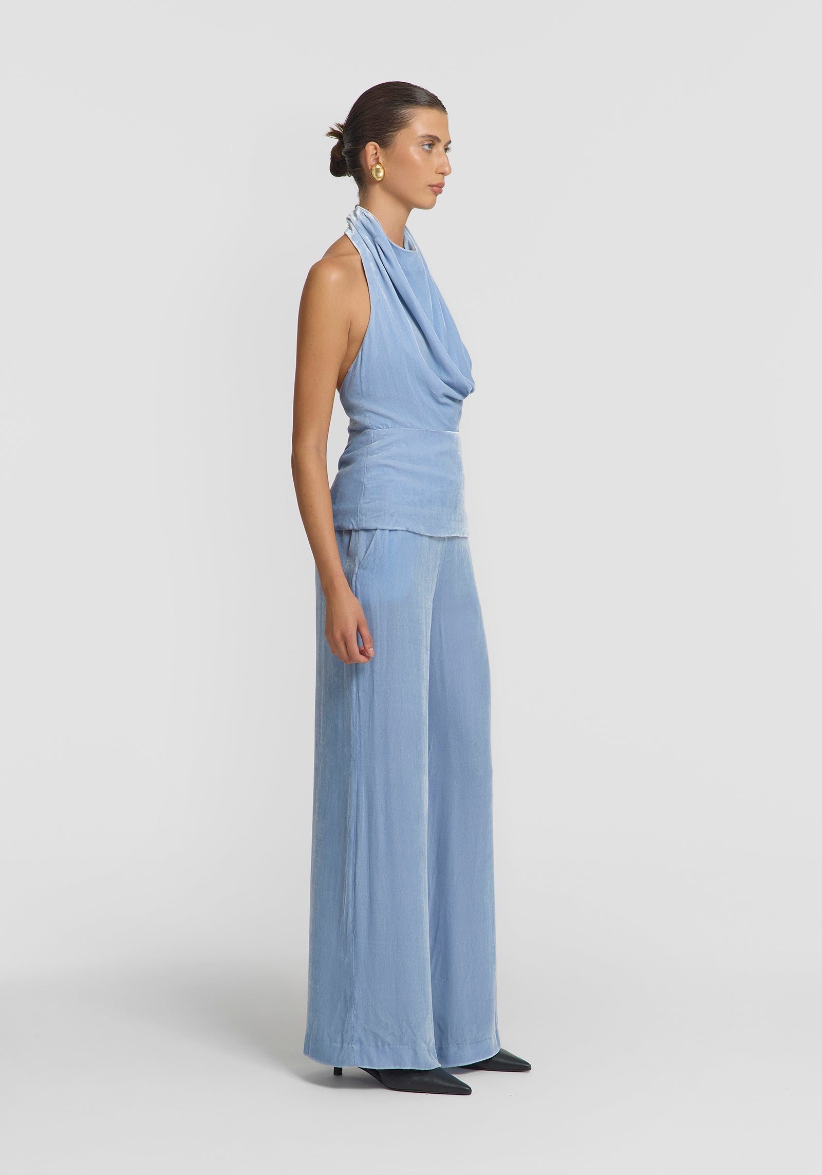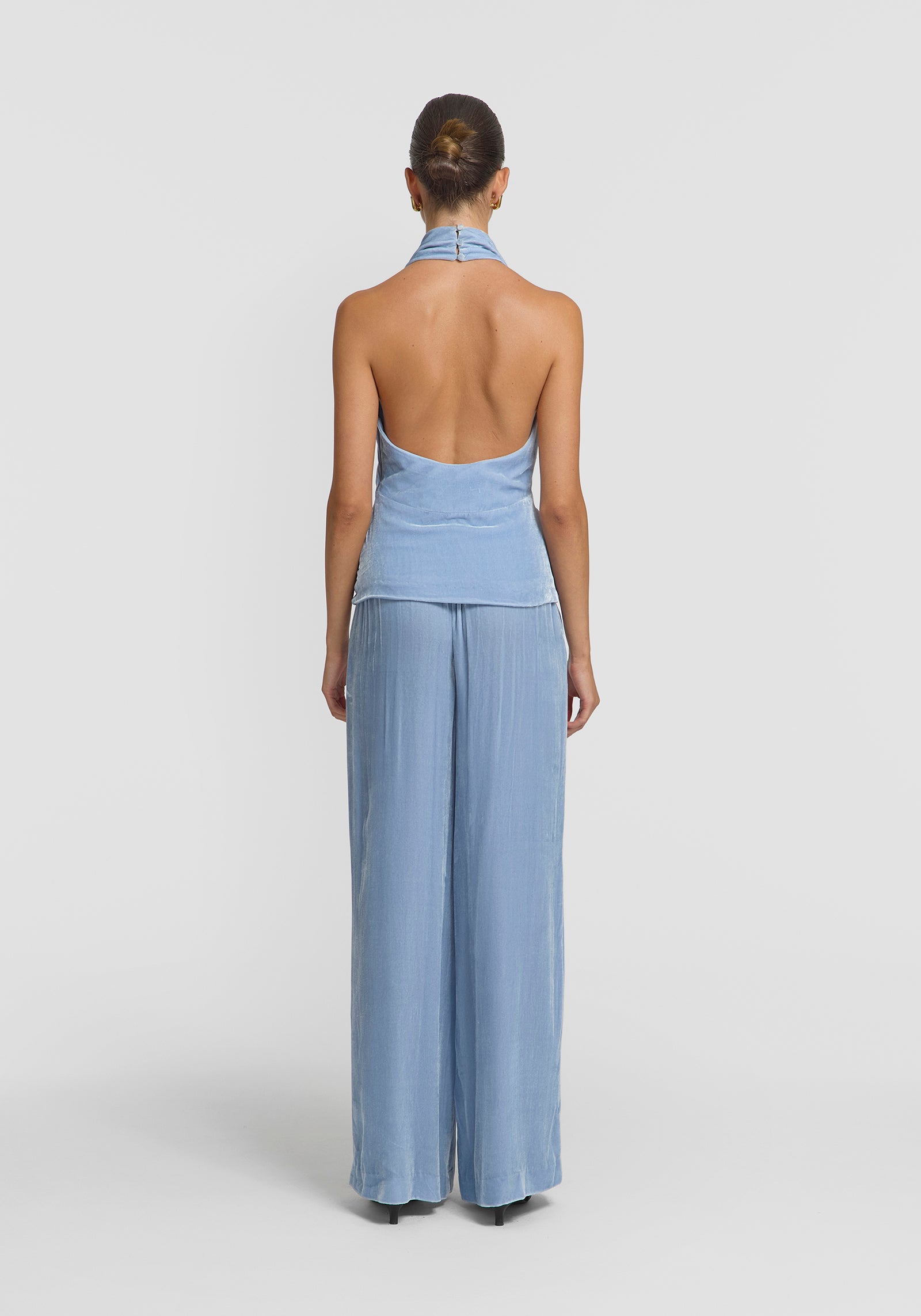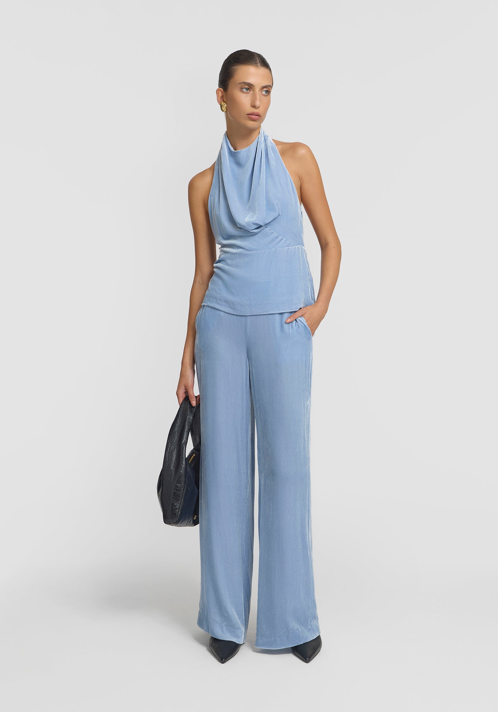 Embodying opulence and ease, the Rosen Pant is luxuriously crafted in rich light blue velvet. Featuring a mid-rise, straight-leg silhouette with a flattering flat front waistband and elasticated back, it offers effortless winter elegance. For a distinctively chic eventwear set, pair with the Fallen Top.