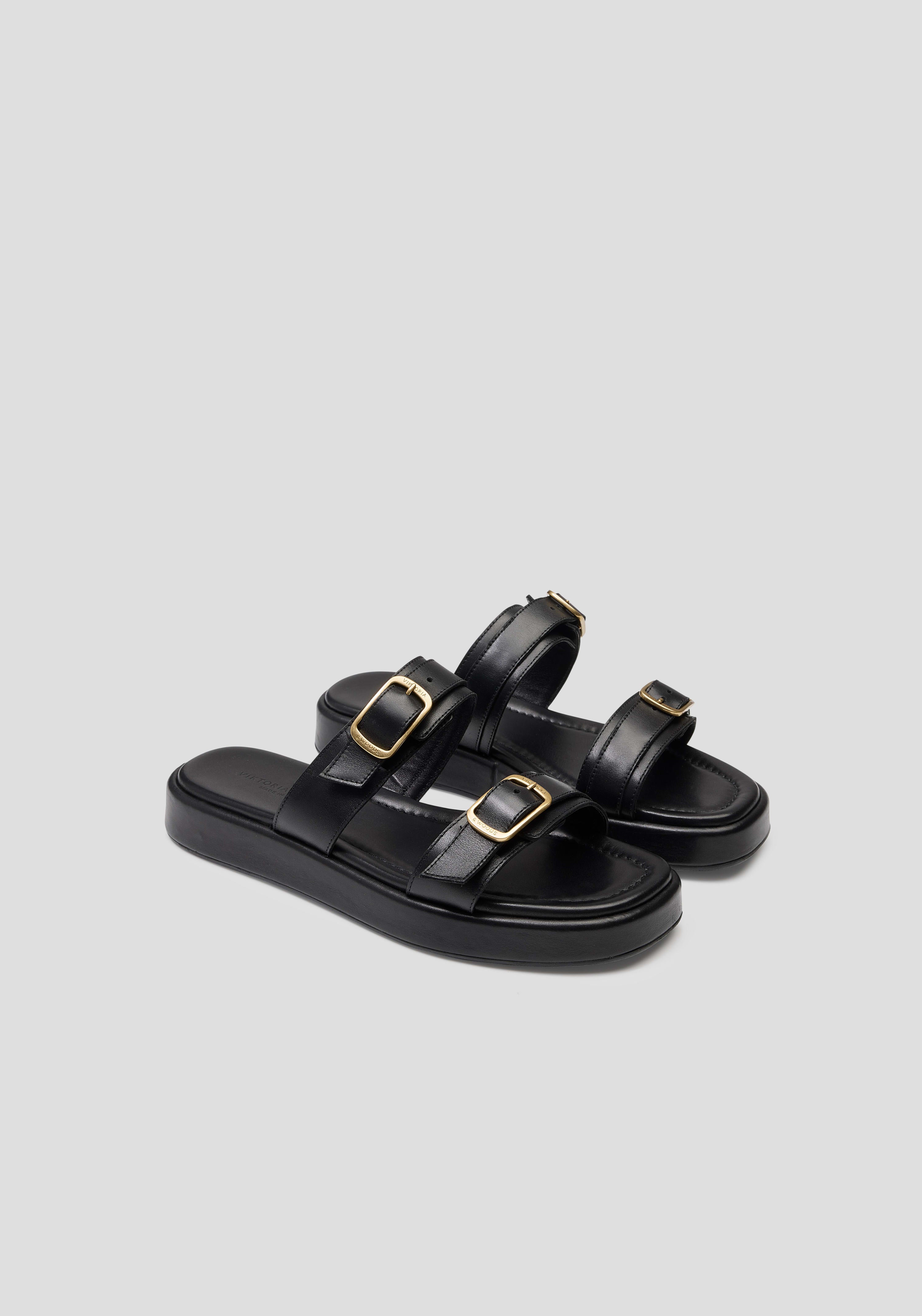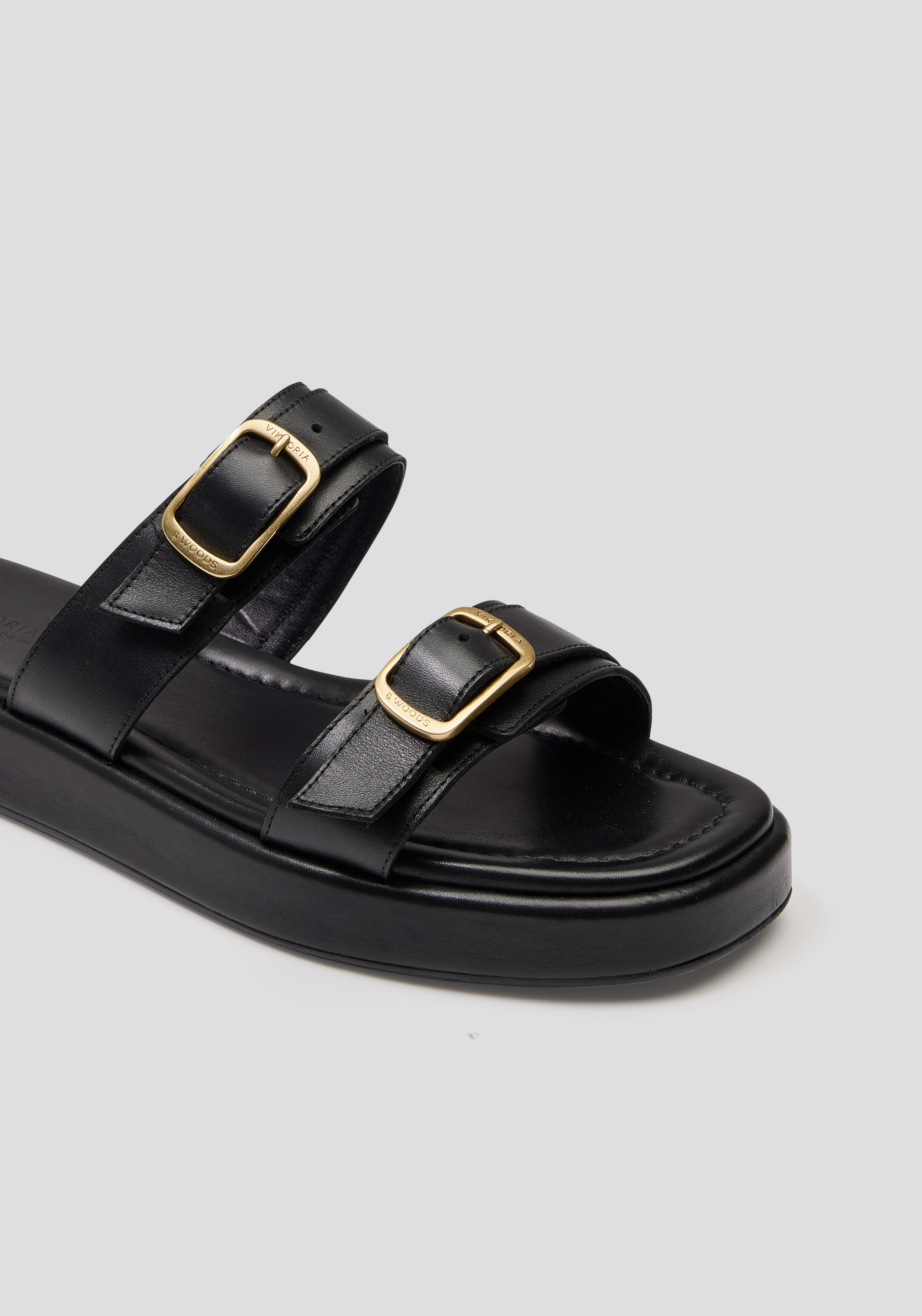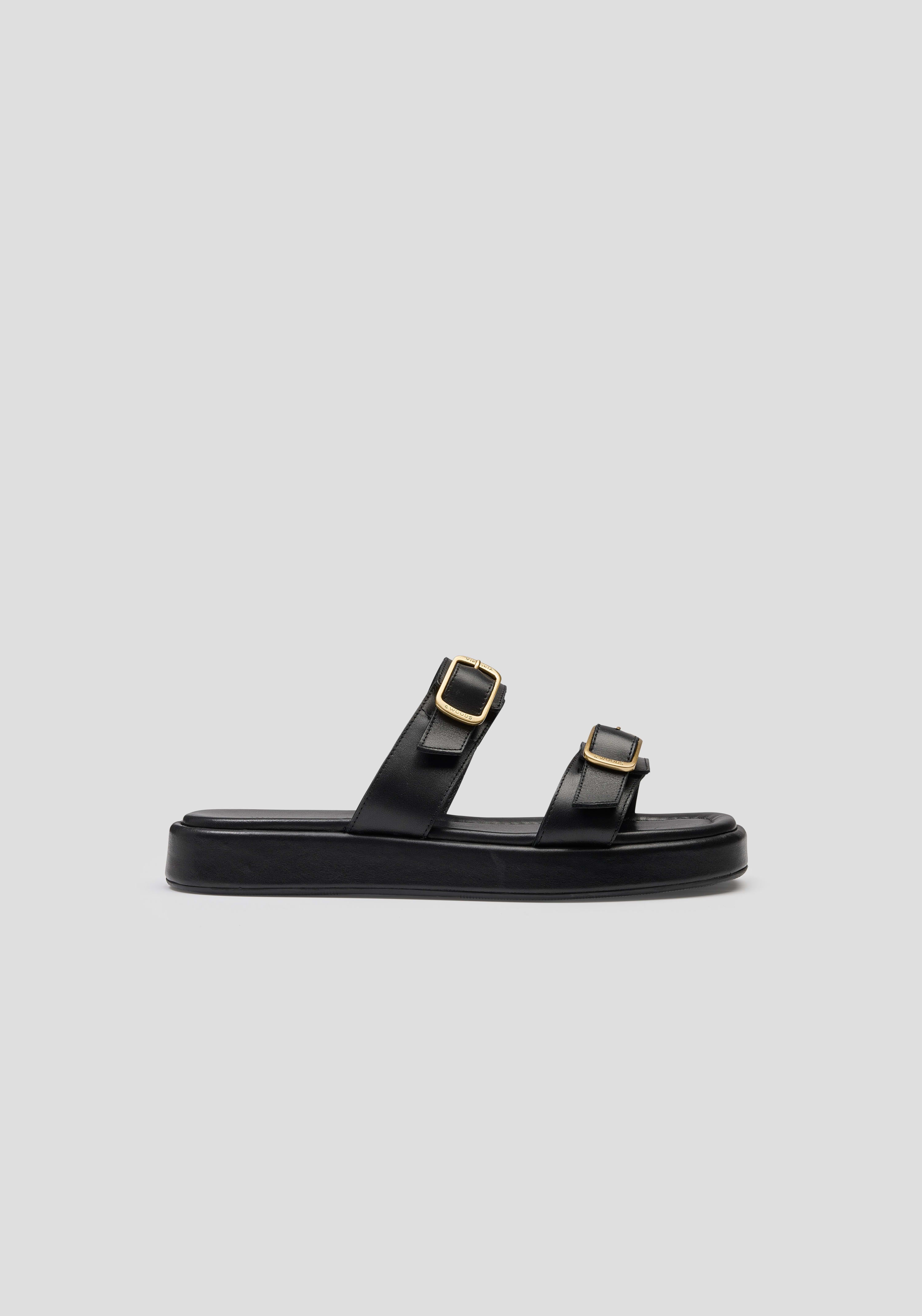 The Rowan Sandal is your new summer sandal, crafted in black leather for enduring style. Designed with a chunky platform sole and double adjustable straps with antique gold branded buckles, it’s made for effortless everyday wear and destination dressing.