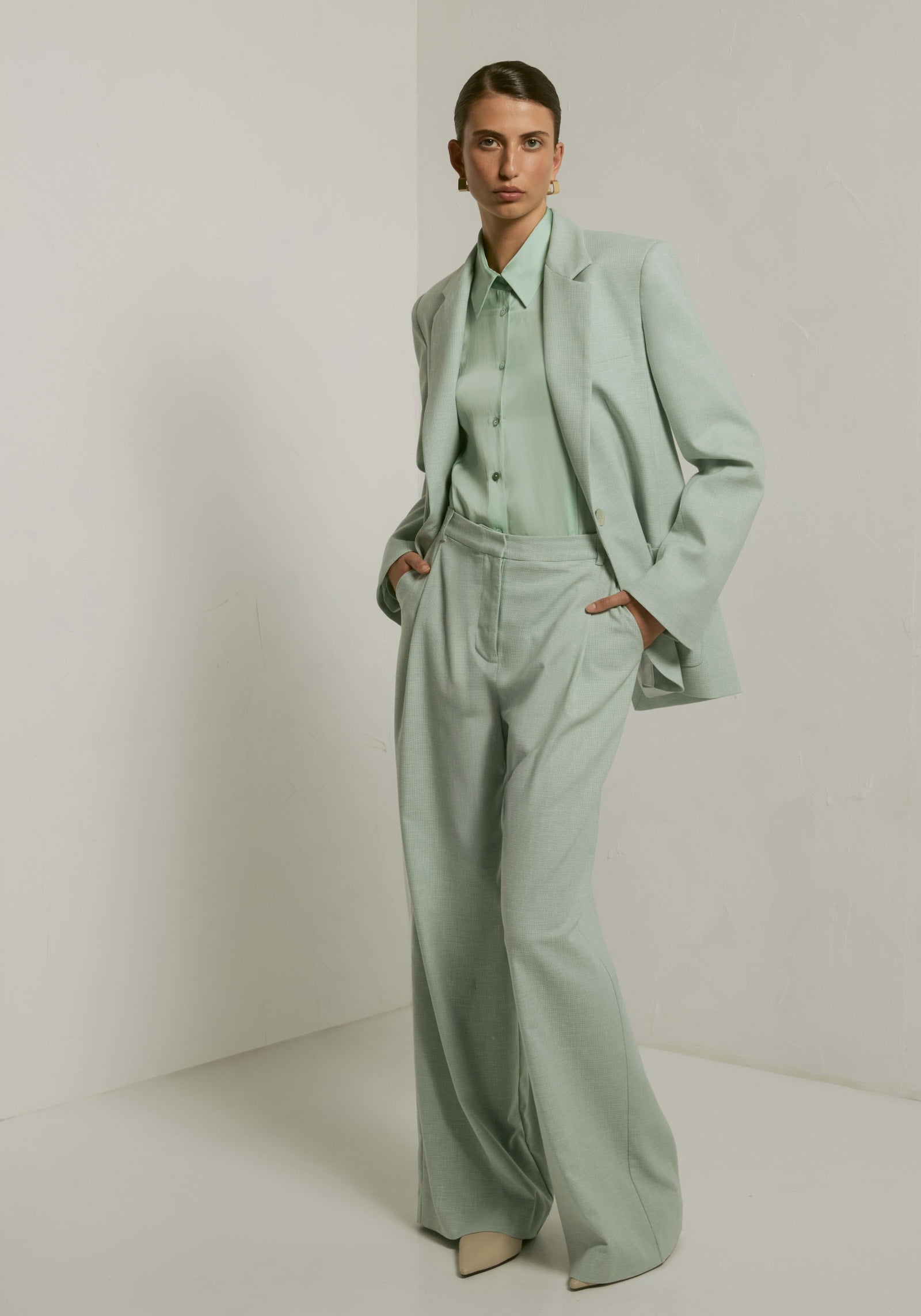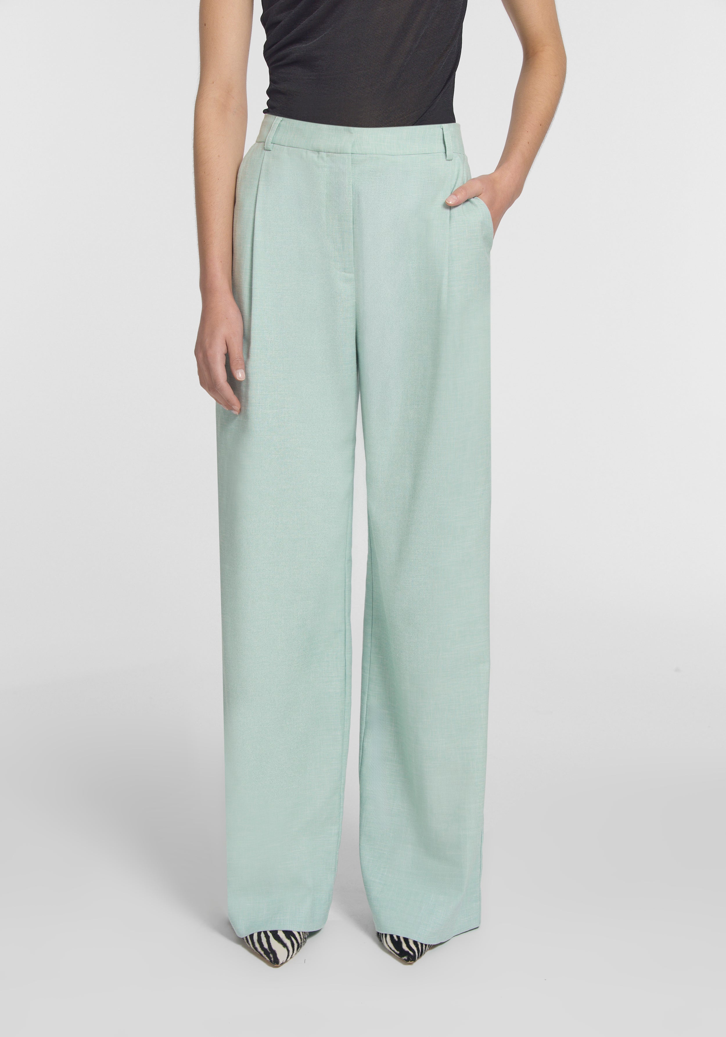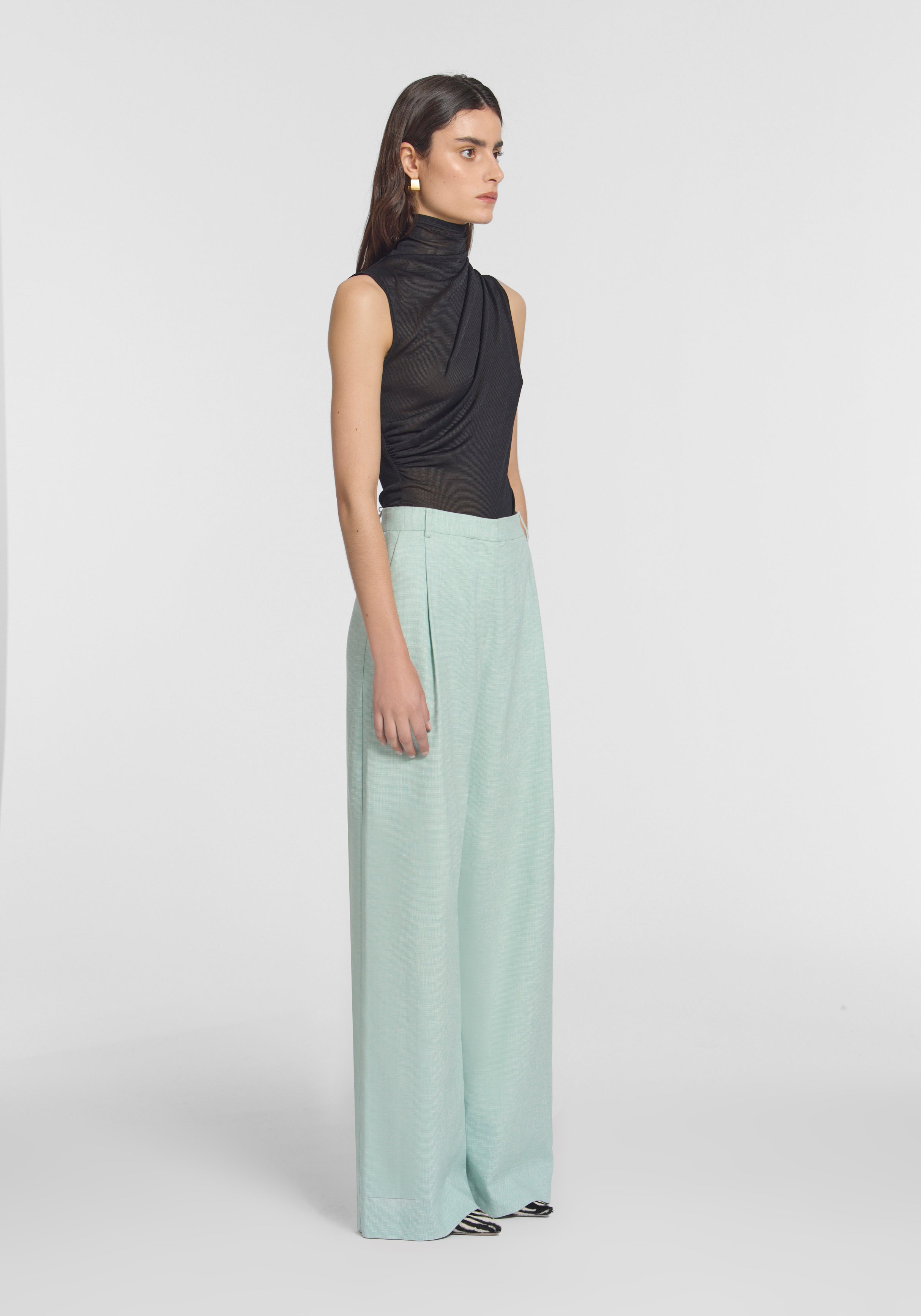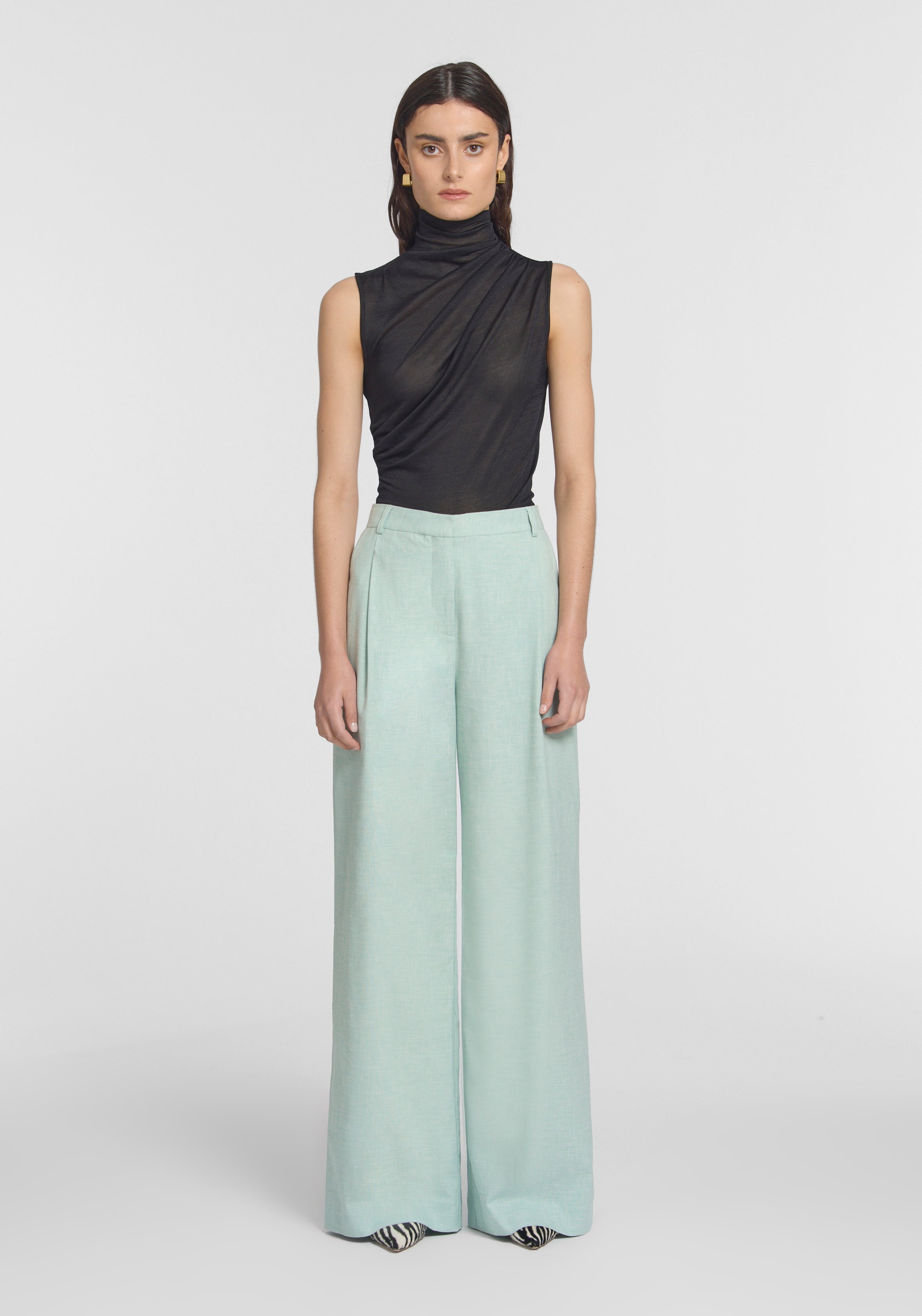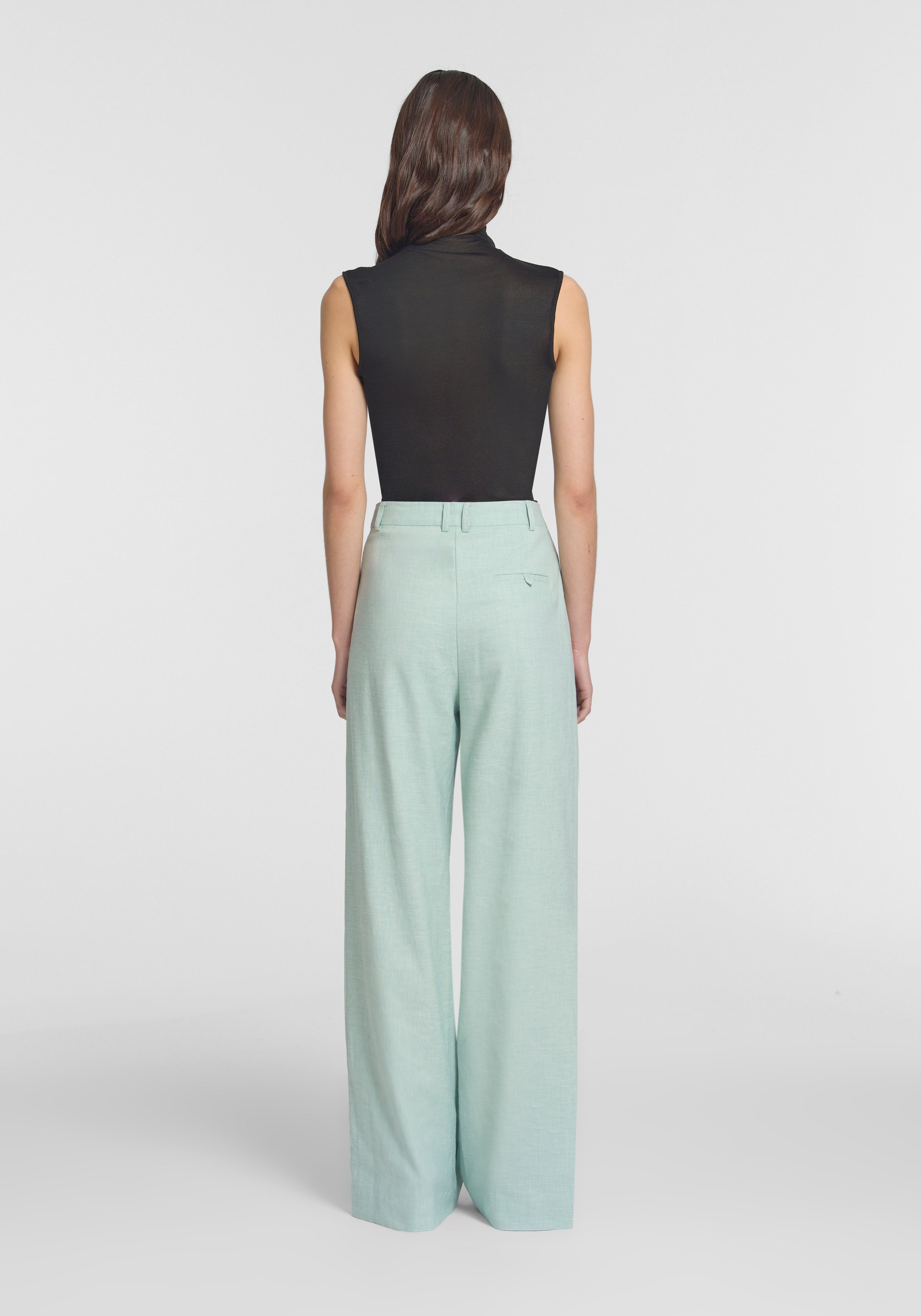 The Roxbury Trouser, crafted from a luxurious linen-cotton blend in a refreshing mint hue, brings a burst of vibrancy to any occasion. Designed with a mid-rise silhouette and straight leg, it features a tailored waistband, front pleats, belt loops, and pockets. Pair with the Solstice Shirt and Paradox Blazer for a coordinated tailoring moment, or with the Wanderlust Bustier for an effortlessly alluring look.