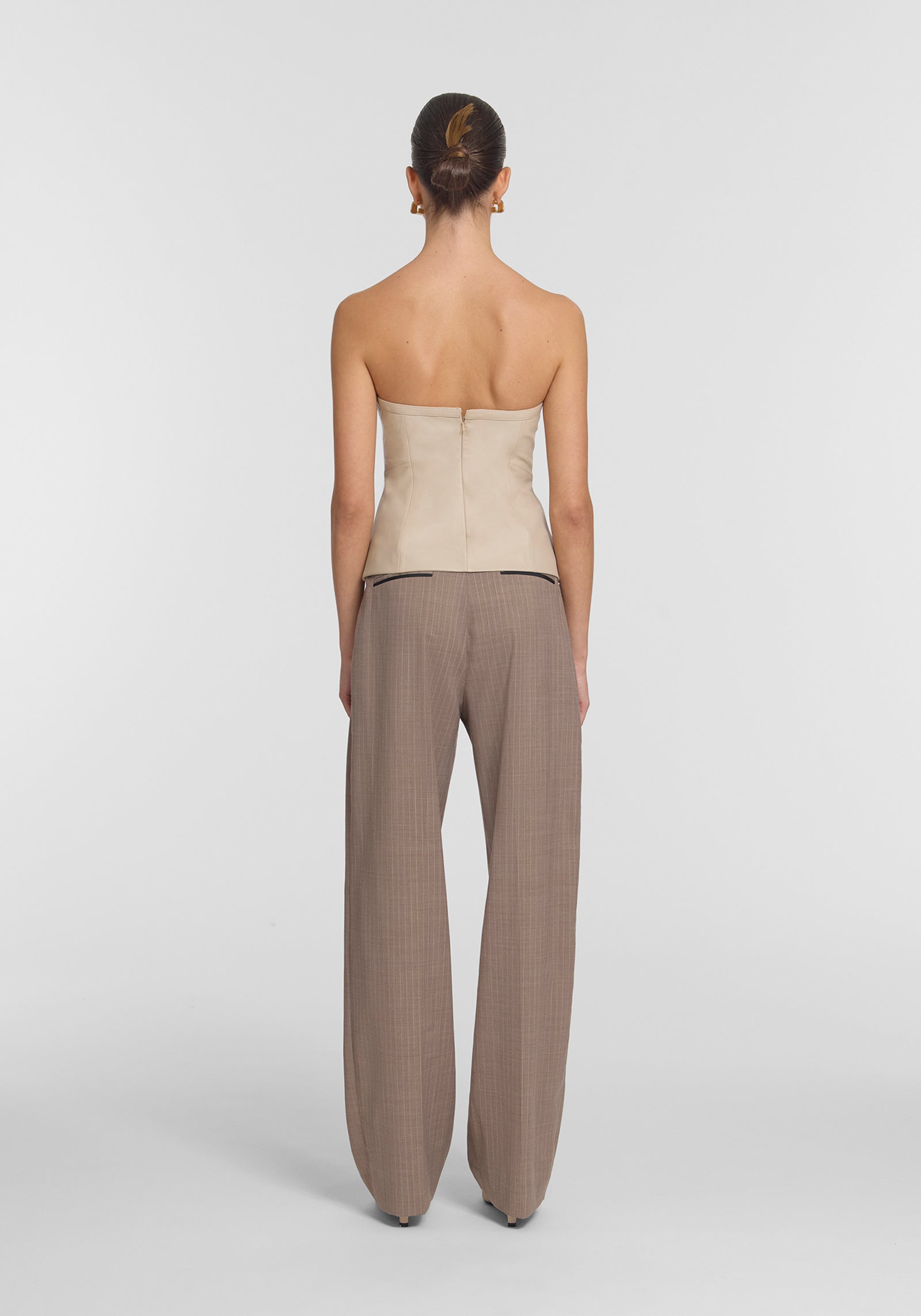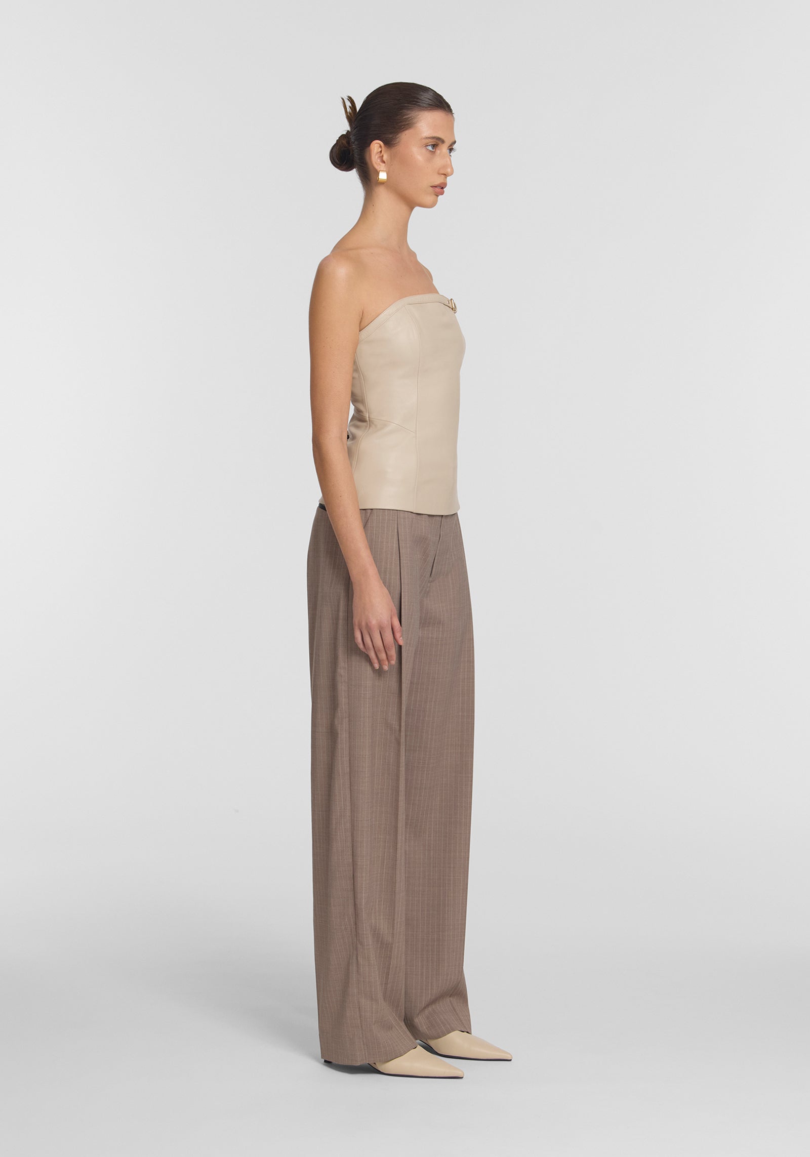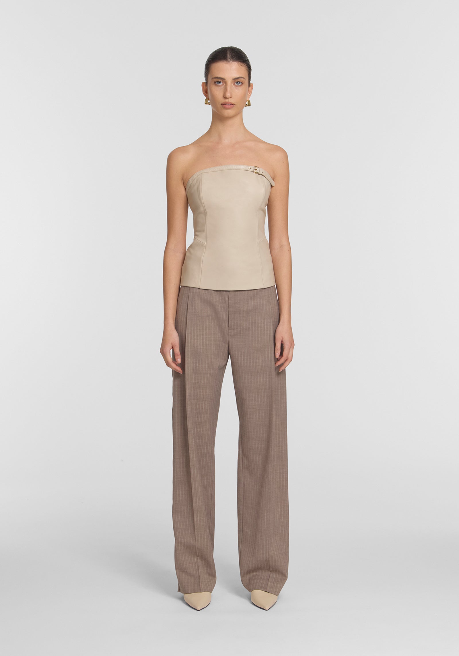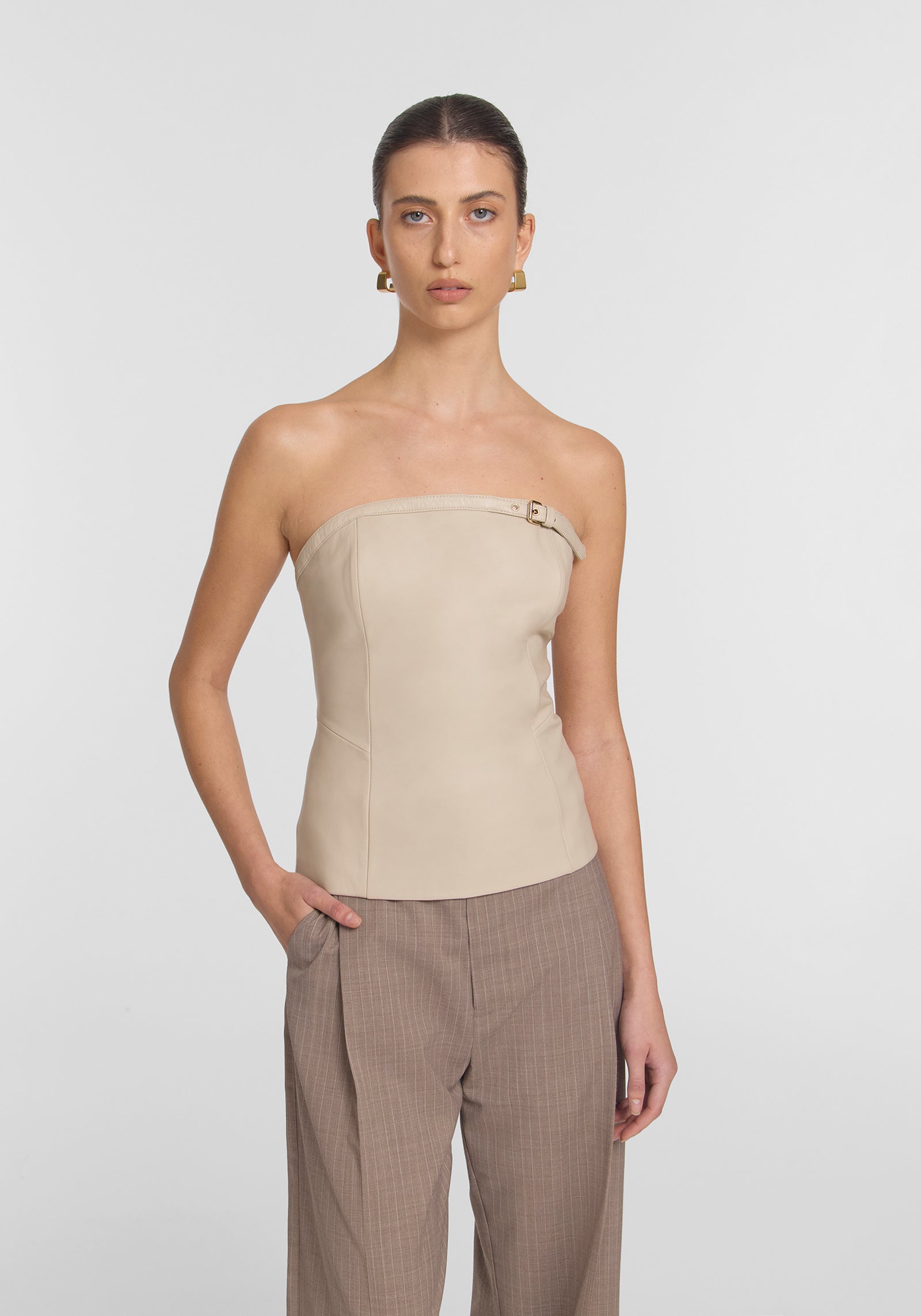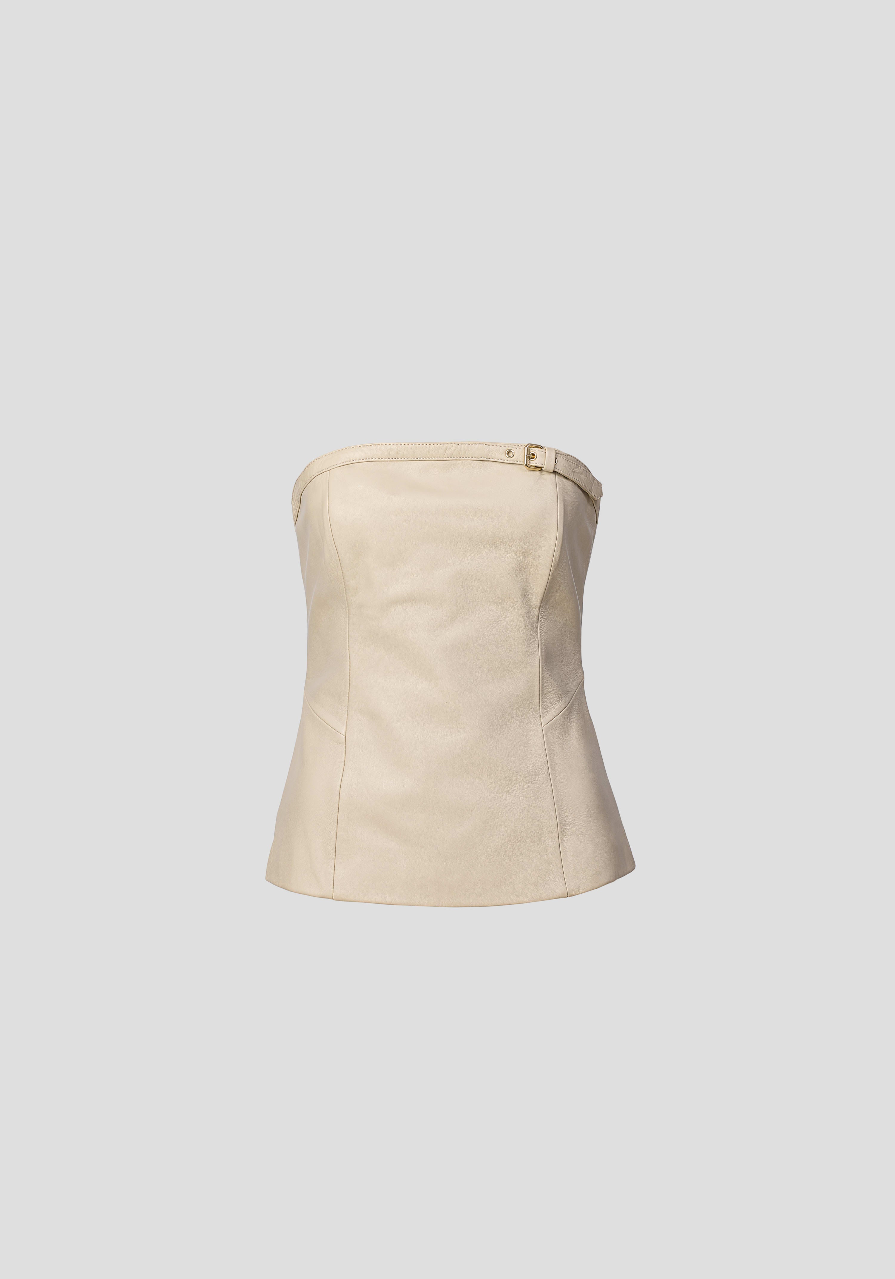Exude sophisticated edge in the Royale Leather Top, crafted from certified soft nappa leather in a timeless ivory hue. This strapless fitted bustier, shaped with internal boning and accented with strap and buckle details at the top edge, is defined by its refined structure.